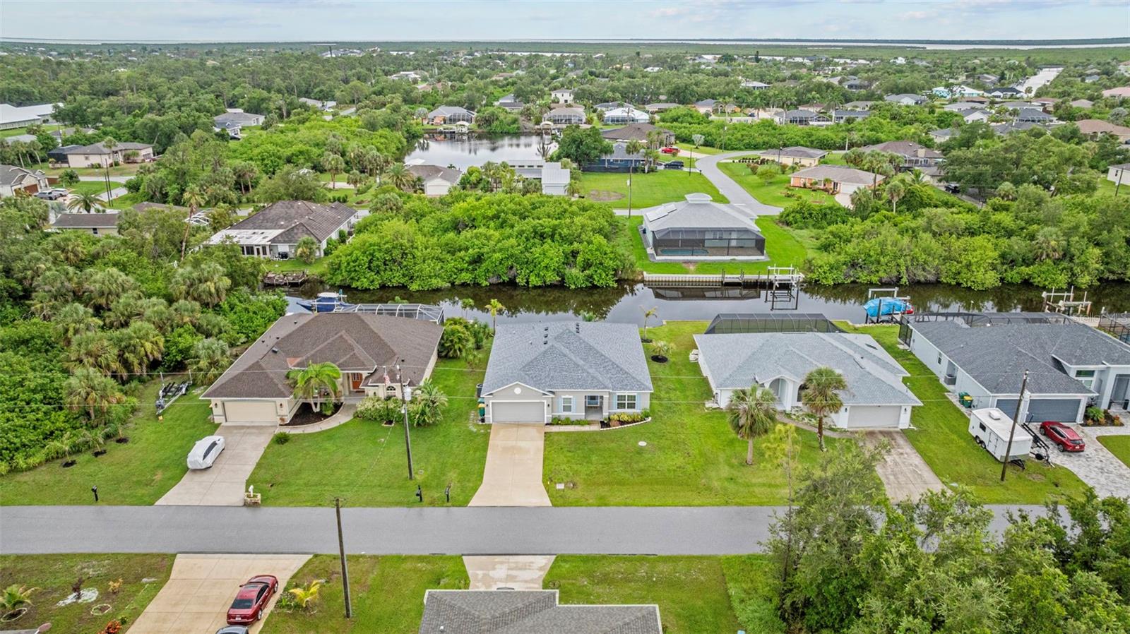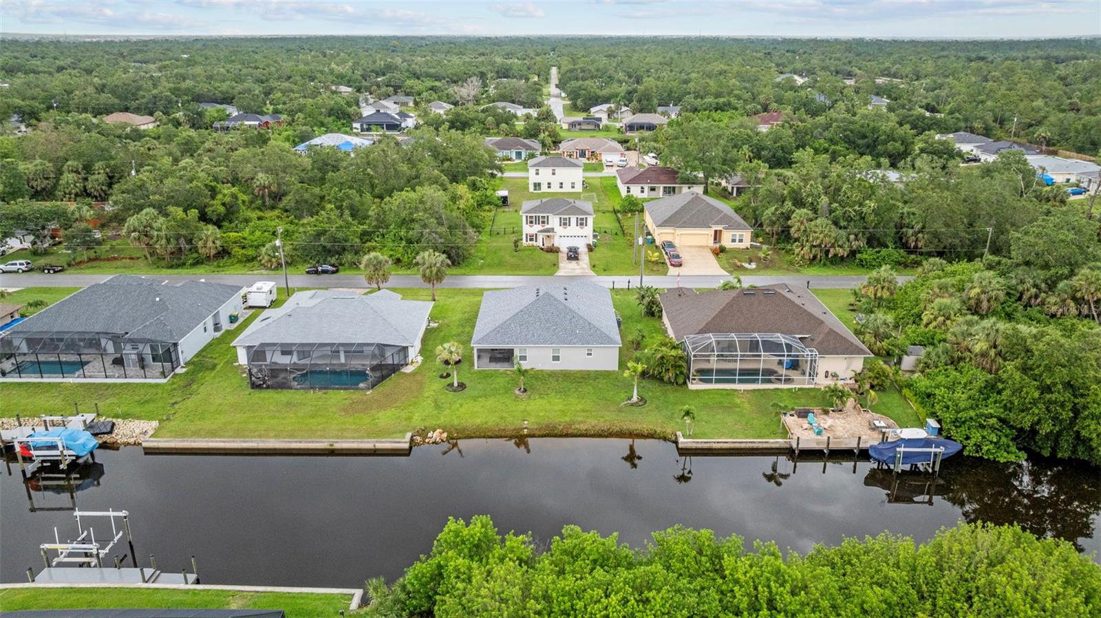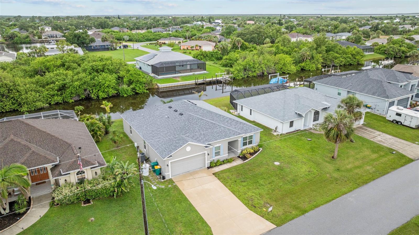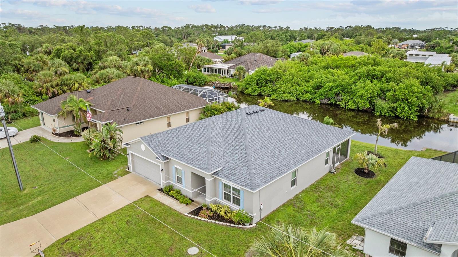 A beautiful newer waterfront home built in 2019 has a lovely open floor plan with access to a lanai and a wonderful view of the canal. This lovely home has an open-floor plan with high ceilings and crown molding. The Living room is located in the front and can be used as an office, a play room or whatever you want to use it for. The garage is oversized, allowing for tools and toys. Enjoy relaxing on the lanai watching the fish jump and the birds fly over. There is plenty of room for your custom pool and spa. You can build the dock and boat life to accommodate your boat, so size won’t matter. A new roof was installed in 2024. All you need to do is move in and decorate to your own standards and likes. (Please note, that the carpet in the bedrooms is a gray color not blue/green.)