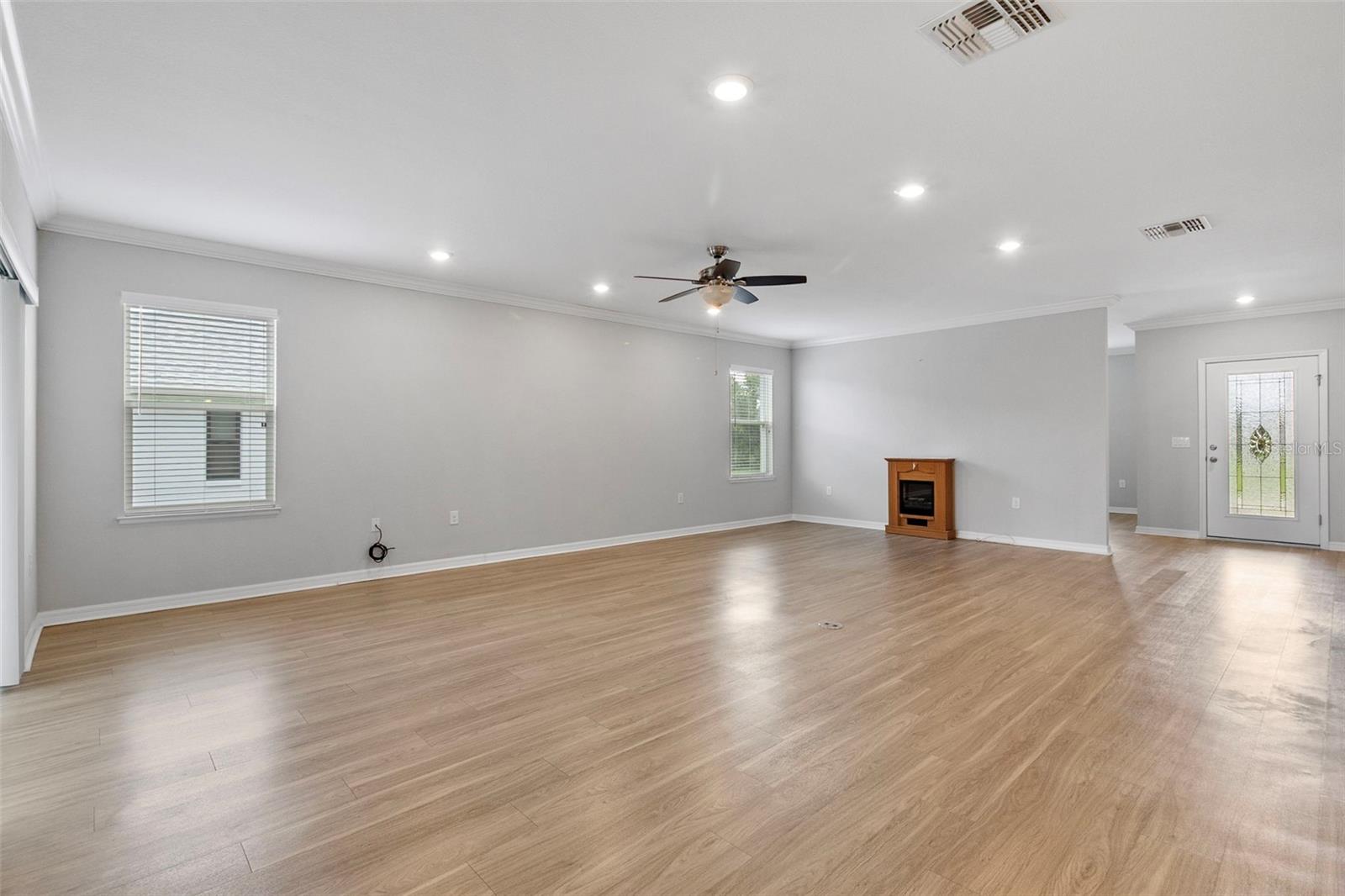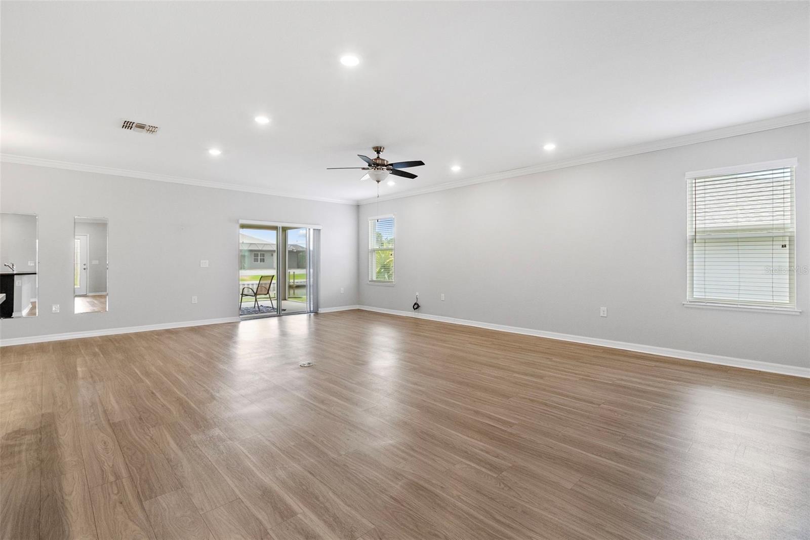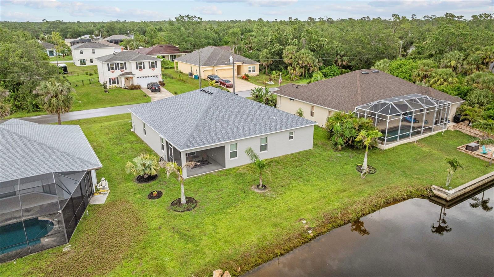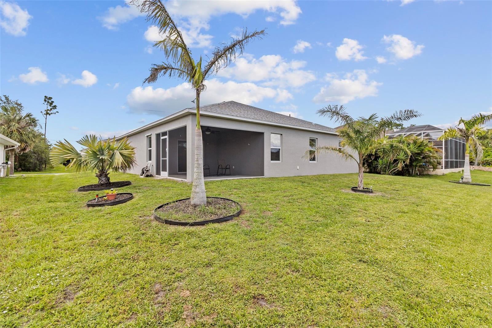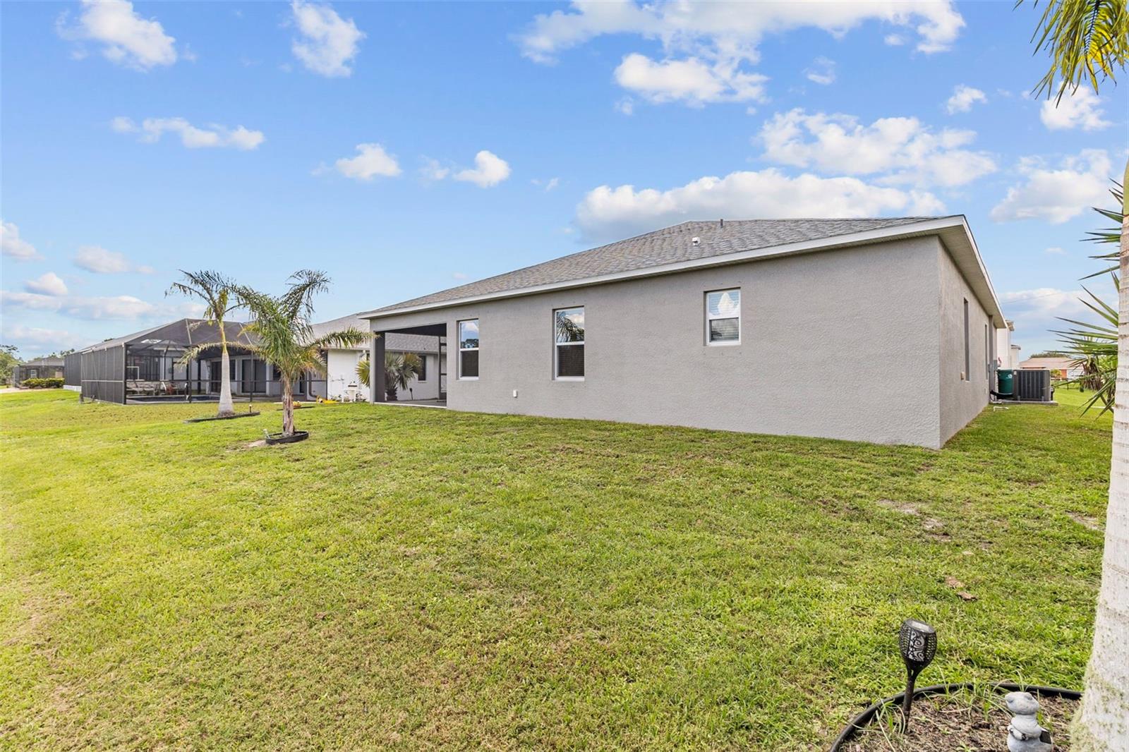 A beautiful newer waterfront home built in 2019 has a lovely open floor plan with access to a lanai and a wonderful view of the canal. This lovely home has an open-floor plan with high ceilings and crown molding. The Living room is located in the front and can be used as an office, a play room or whatever you want to use it for. The garage is oversized, allowing for tools and toys. Enjoy relaxing on the lanai watching the fish jump and the birds fly over. There is plenty of room for your custom pool and spa. You can build the dock and boat life to accommodate your boat, so size won’t matter. A new roof was installed in 2024. All you need to do is move in and decorate to your own standards and likes. (Please note, that the carpet in the bedrooms is a gray color not blue/green.)