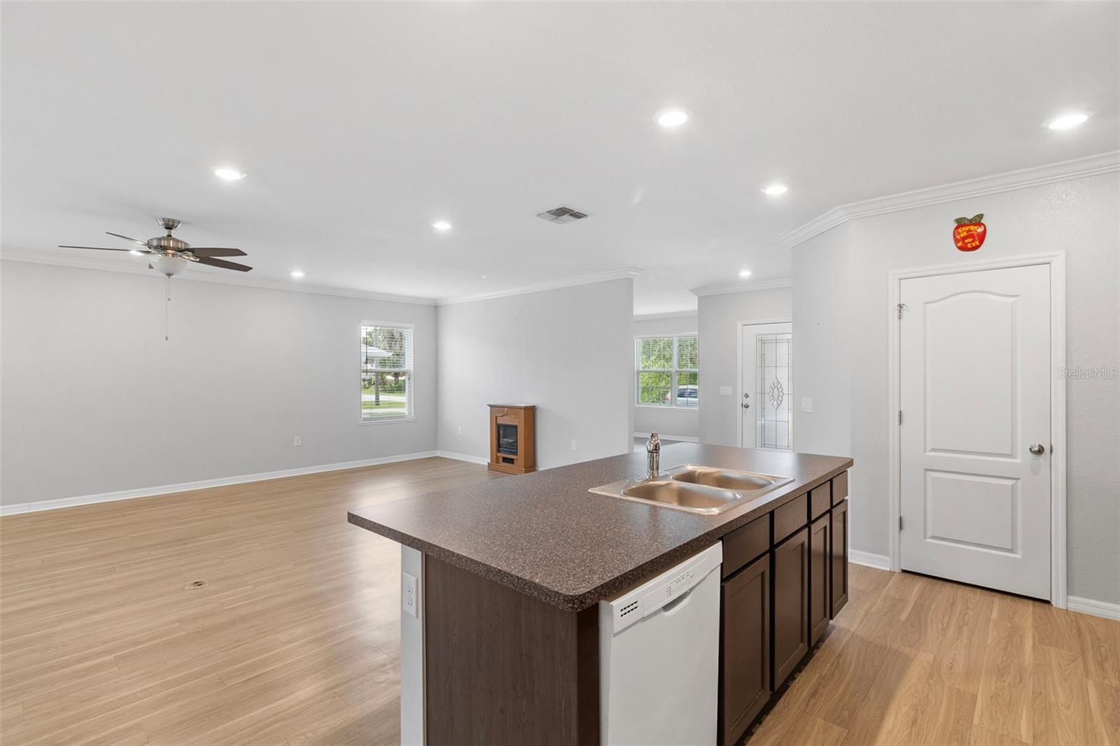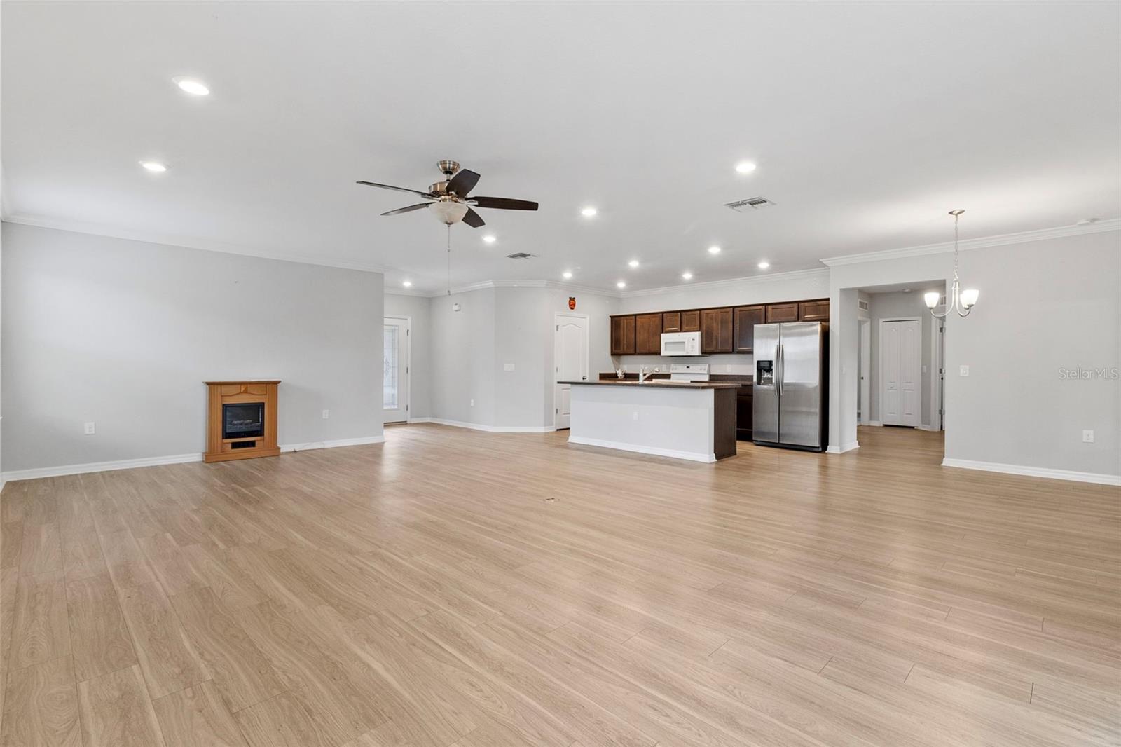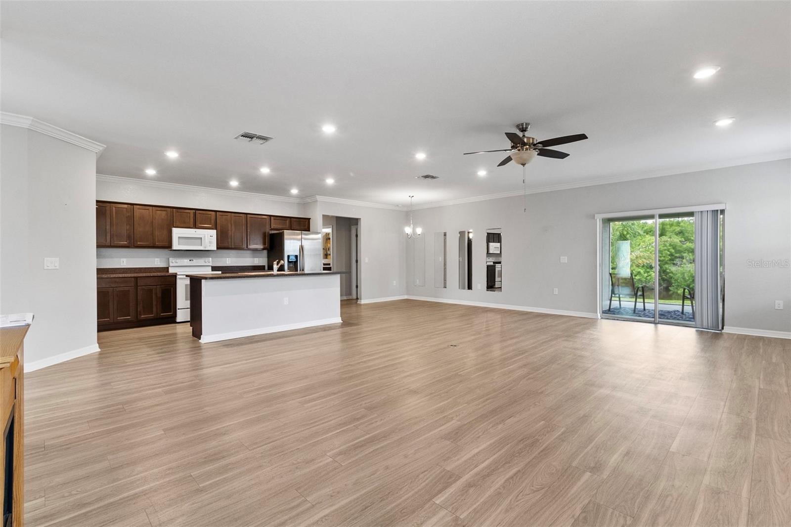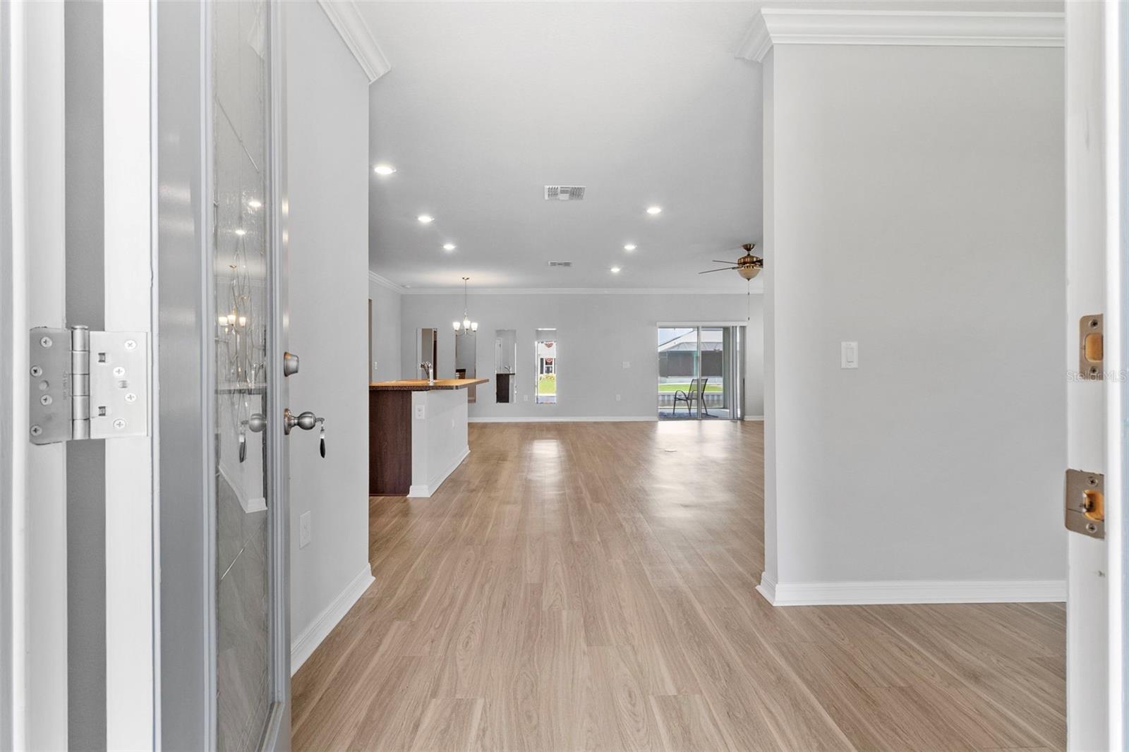 A beautiful newer waterfront home built in 2019 has a lovely open floor plan with access to a lanai and a wonderful view of the canal. This lovely home has an open-floor plan with high ceilings and crown molding. The Living room is located in the front and can be used as an office, a play room or whatever you want to use it for. The garage is oversized, allowing for tools and toys. Enjoy relaxing on the lanai watching the fish jump and the birds fly over. There is plenty of room for your custom pool and spa. You can build the dock and boat life to accommodate your boat, so size won’t matter. A new roof was installed in 2024. All you need to do is move in and decorate to your own standards and likes. (Please note, that the carpet in the bedrooms is a gray color not blue/green.)