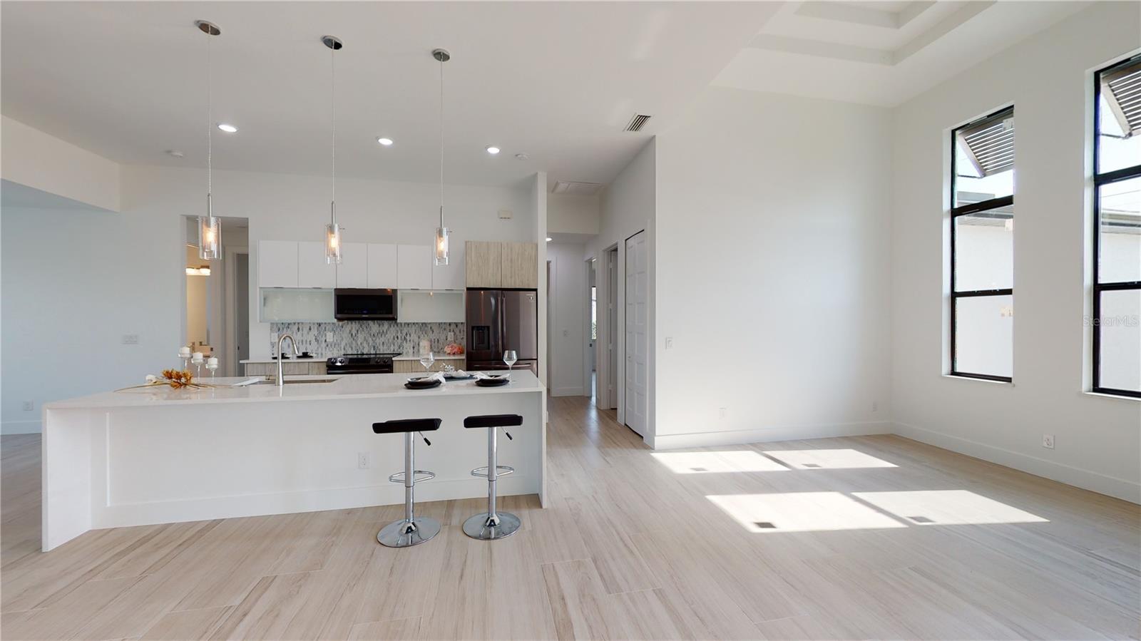 Under Construction. This home is partially completed, and the seller needs to sell. The cost to complete this project is $375,000, which includes the pool, and it will take 6 months to finish. IMPORTANT TO NOTE IS THAT THE BUYER CAN OWN THE LLC AND THEREFORE USE THE FUNDING TO COMPLETE THE PROJECT WITH ONLY $65,000 DOWN. Photos are what home looks like now and what it will look like when completed. **Stunning Waterfront Contemporary Home with Direct Gulf Access** Introducing a remarkable opportunity to own a waterfront contemporary home in the highly sought-after Taurus Canal. This exquisite property features 4 bedrooms, 3 bathrooms, a luxurious Jacuzzi spa, and a swimming pool, complemented by a spacious 3-car garage. Ideal for boating enthusiasts and individuals who appreciate the Southwest Florida paradise lifestyle, this home offers an unparalleled retreat. Situated in a prime location near the future Seven Islands Waterfront Community, homeowners can look forward to nearby planned marinas, parks, dining options, and resort-style amenities. This property presents incredible potential, with rising values. Additionally, adjacent land is available for sale, further enhancing the possibilities for expansion. With a prime position on the Taurus Canal, access to the Gulf is seamless via Lamark Canal into Laguna Lake and then into the North Spread Waterway—free from bridge restrictions. Key features of the property include a seawall and ample space to design your own captain's walk, boat lift, kayak launch, or tiki hut layout. The outdoor entertainment area is both generous and inviting, featuring a screened lanai that is perfect for relaxation and hosting gatherings. The interior boasts a bright, open floor plan, allowing natural light to enhance the modern design. With western rear exposure, the home captures breathtaking sunsets and provides easy access to vista views of the pool, spa, and saltwater waterfront—an ideal setting for outdoor meals, swimming, and leisure activities. The expansive living room, featuring a striking 14-foot cove ceiling, offers seamless views of the lanai and canal. Designed for both comfort and style, the interior includes tile flooring throughout, impact-resistant doors and windows, and a modern kitchen equipped with stainless steel appliances, including a refrigerator/freezer, microwave, range, and dishwasher. The kitchen showcases elegant Italian cabinets and a spacious quartz waterfall island with a breakfast bar. The primary suite is generously sized, featuring private sliding doors to the lanai and large walk-in closets with custom wood shelving. The luxurious spa-like primary bathroom includes a separate tub and shower, dual sinks, and quartz countertops—creating the ultimate sanctuary for relaxation. The thoughtfully designed split floor plan ensures privacy for both residents and guests, with three additional guest bedrooms catering perfectly to family and friends. Step outside to enjoy the picturesque Southwest Florida weather in your backyard oasis, complete with a jacuzzi spa and pool for relaxation and recreation. The spacious garage offers ample room for vehicles, storage, and hobbies, merging convenience with versatility. Explore this beautifully designed home that incorporates direct Gulf access and abundant outdoor entertainment space, offering an exceptional blend of style, comfort, and location. Don’t miss the chance to call this waterfront paradise your own!