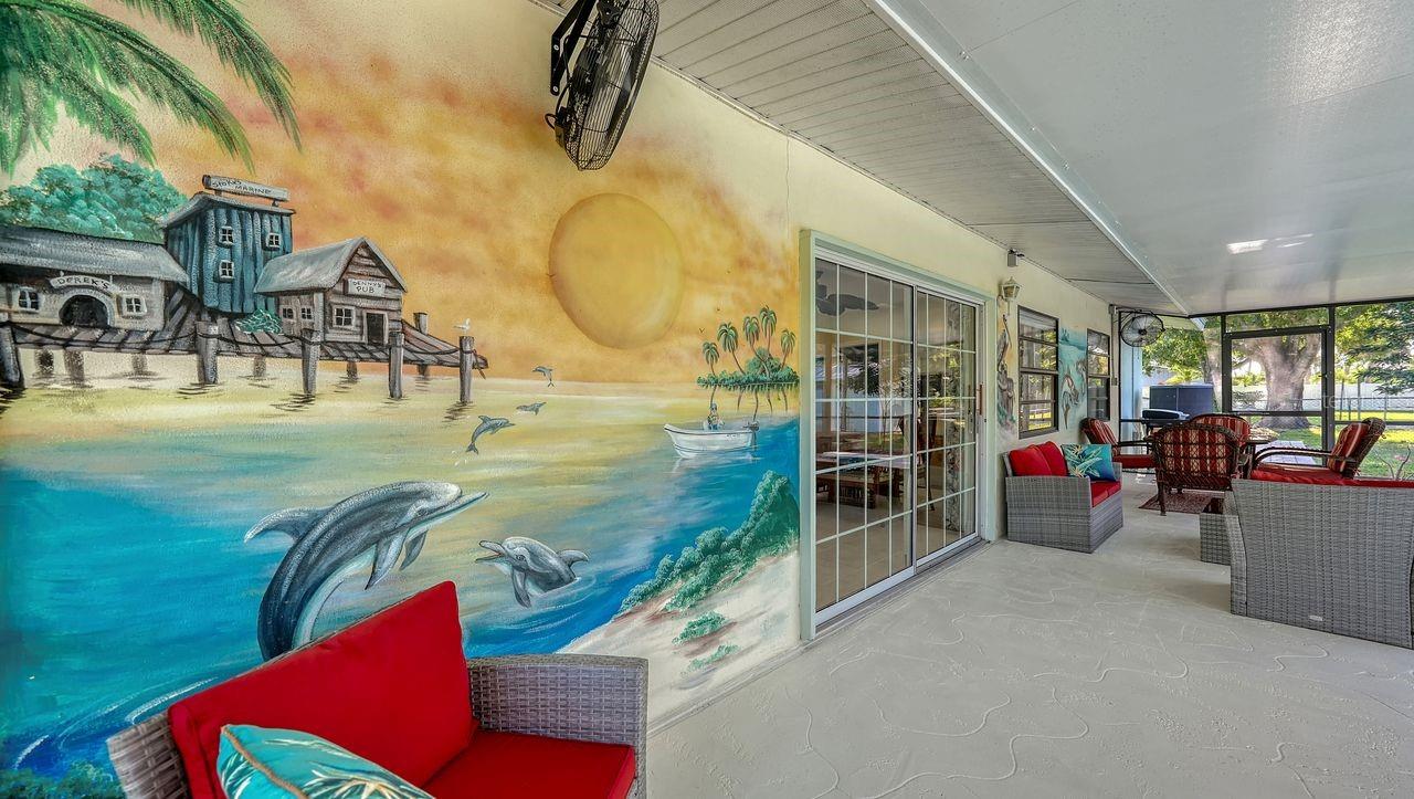 Beautiful & Charming this Immaculate, Turnkey Furnished, concrete block home sits on a park like setting with almost 1/2 acre of manicured land. The sparkling 14x27 electric heated pool has relaxing jets on the long steps & tile snook swimming on the pool wall. There is Kool Decking in the pool area & custom painted scenes of life in olde Florida on the walls of the 09x35 covered lanai, which blends perfectly with the surroundings. Seller rented the home out last season for $5000 monthly. This lovely Home has been renovated so all of the work has been done for you. The living room has an electric fireplace that is set into the wall of stacked stone & a Roku 55" Smart TV located above the electric fireplace. Kitchen has 42" wood cabinets with crown molding; soft close drawers; tile & stacked stone backsplash; one-of-a-kind, hand picked, granite countertops/breakfast bar; pendant lighting over the breakfast bar & new stainless steel appliances. Coffee Bar area, which is 8'x9' is located between the kitchen & the separate dining room. The ceiling in the dining room & 3rd bedroom has been raised to 9'. Primary suite has Tommy Bahama style furniture & two large closets & is located at the back of the home. Primary bath has a large tiled shower, tall wood vanity & granite countertop. Guest suite is off of the living room at the front of the home & has a 42" Roku TV & the guest bath is a tub/shower combination with tall wood vanity & granite countertop. There are tile floors throughout with 5" baseboards & the Primary Bedroom & 2nd bedroom have luxury vinyl flooring. Home has a metal roof, which was done to Miami Dade standards having a screw every 6 inches & a 3rd nail on the roof trusses; 12'x22' pavered carport attached to the home has 1/2" plywood & hurricane straps; 10'x14' shed has electric & a loft; 20'x20' detached carport is on a 30'x30' asphalt pad & is located on the 2nd lot for your boat & extra vehicles. The detached carport also has outlets at the back & a sensor light on a telephone pole to light up that area. There is an outside plug for a generator. Electric panel is 200 amp. The a/c condenser, pool pump & pool heater are all elevated. The lot that the home sits on is fenced in the back yard for your four legged friends. There is a horseshoe pit on the 2nd lot & lots of space for other activities. There is a park with a playground nearby & a boat & kayak launch 5 minutes away. One year home warranty will be paid for at closing for the buyer. Home warranty includes: A/C, Heat, Electrical, Plumbing & Appliances. If anything goes wrong with any of these systems or appliances, the home warranty will either repair or replace the system or appliance. Everything in this cozy & comfortable home has been well thought out when it comes to enhancing your lifestyle in Florida.
