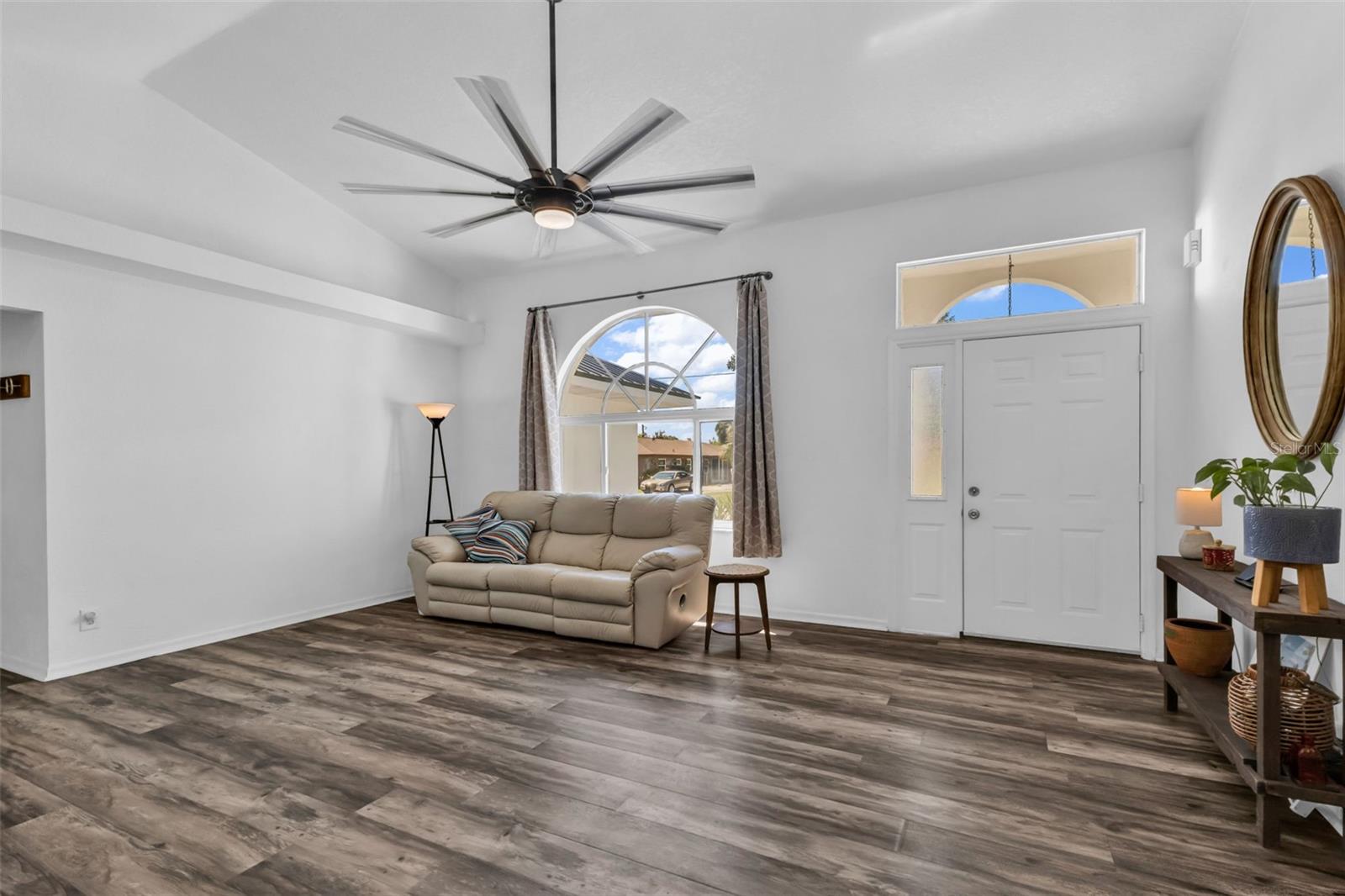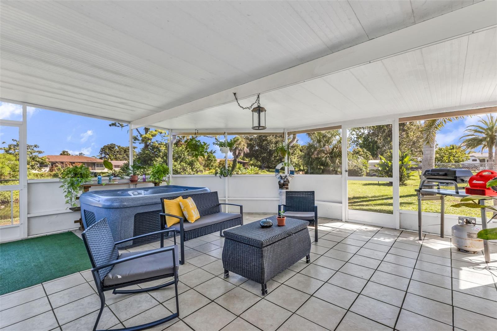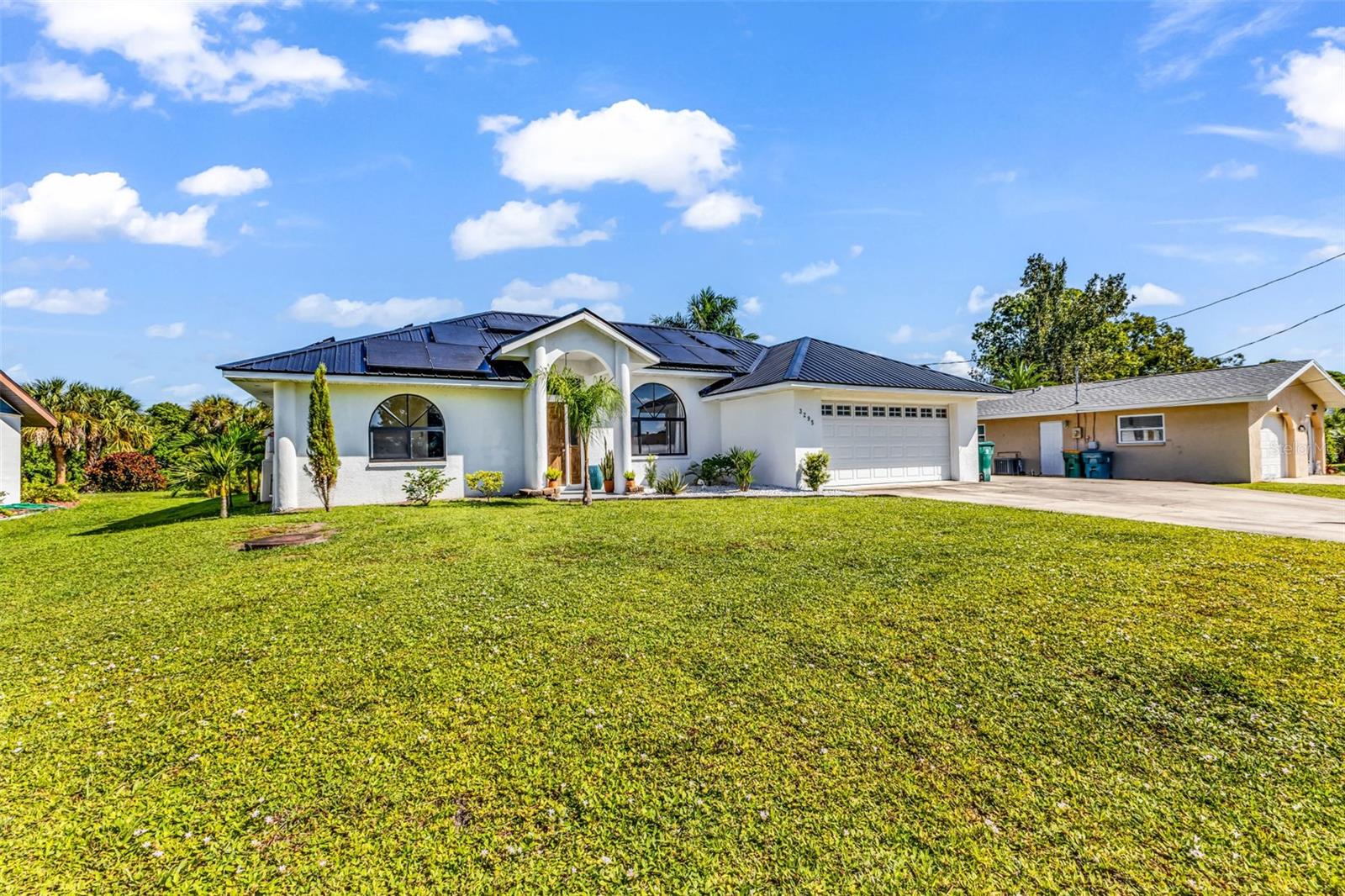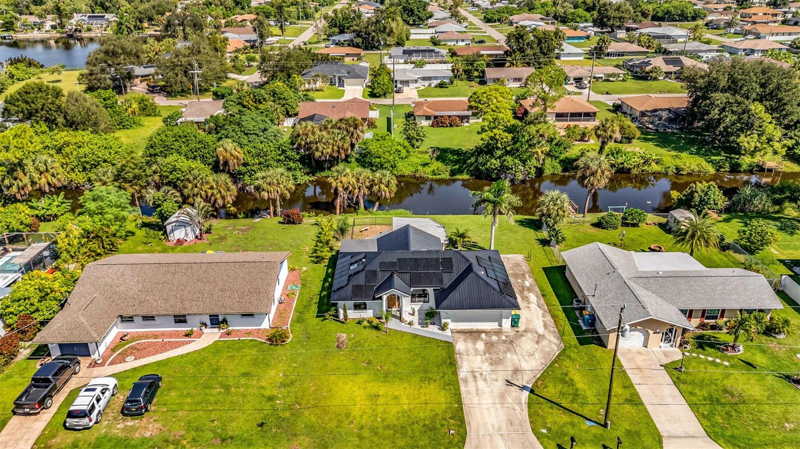 Welcome to this light, bright, and spacious waterfront home that instantly makes you feel at home. Filled with custom updates throughout, this property offers the perfect balance of comfort, style, and functionality. Enjoy peace of mind with a durable metal roof and fully paid solar panels, which keep the FPL bill to only $30 a month. The home is also equipped with a whole-home Culligan water filtration system and an additional double-filtered drinking station at the kitchen sink. The beautifully updated kitchen is designed with modern convenience in mind, featuring Samsung SmartThings appliances, a Bespoke Flex refrigerator with a convertible freezer/fridge compartment, a convection/standard oven, and eye-catching blue cabinets with shelving. A coffee bar and microwave will remain for the new owner’s enjoyment. The home offers spacious bedrooms that provide comfort and flexibility for family and guests. The master suite serves as a private retreat, complete with a generously sized bedroom and a beautifully designed bathroom featuring a relaxing soaking tub—the perfect place to unwind at the end of the day. Perfect for entertaining, the open living area features recessed lighting and Govee smart light strips above the living room and kitchen. Step outside to the large lanai, complete with a spa, hot tub, and mounted TV bracket, where you can relax while overlooking the water. This home also includes RV, boat, or toy parking with an electric hook-up for both an RV and generator, ample attic storage, and all new light fixtures and ceiling fans, including two impressive 72-inch fans. For added convenience, there is a dog yard, Starlink equipment ready for activation, and underground fiber optic connectivity. This welcoming home has been thoughtfully updated and offers an exceptional blend of efficiency, charm, and Florida waterfront living.