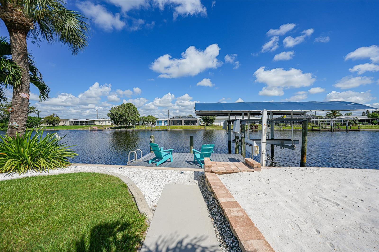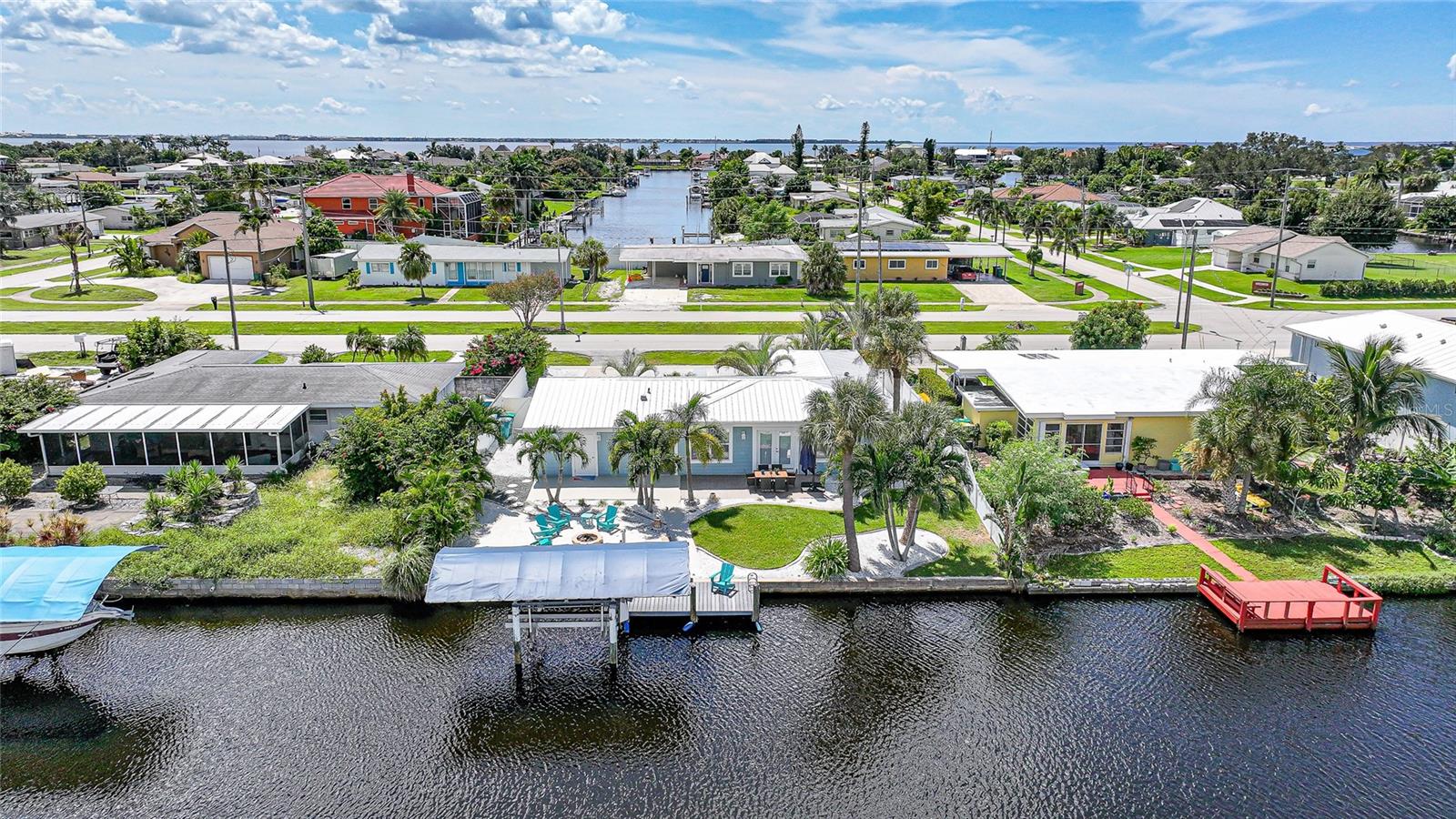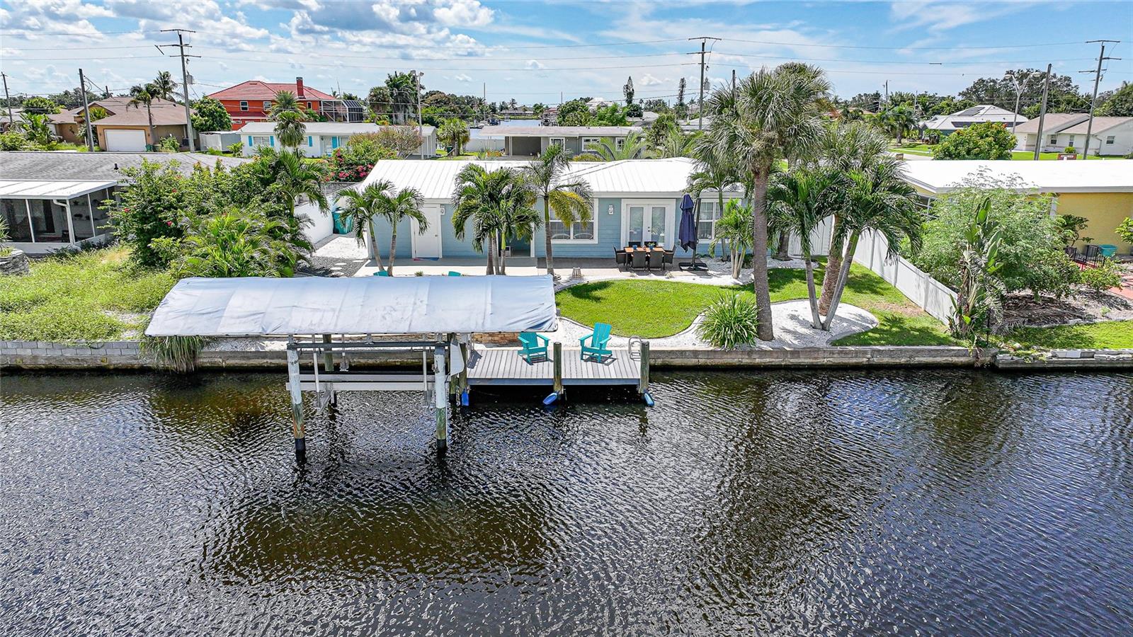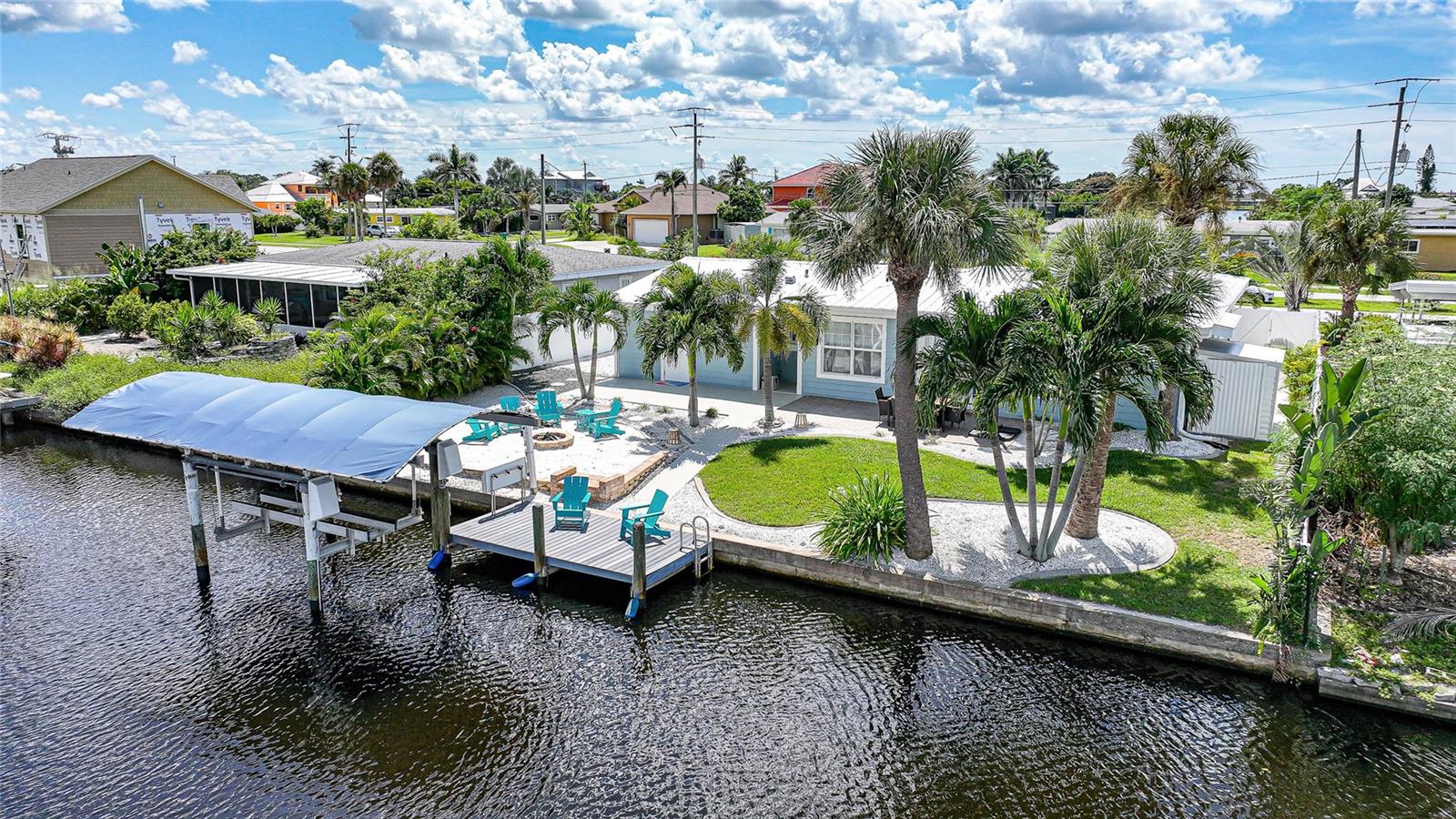 Welcome to your own slice of Florida paradise! This beautifully remodeled Key West–style, turnkey waterfront home offers 3 bedrooms, 2 bathrooms, and direct access to Charlotte Harbor—just minutes by boat to world-class fishing and boating, including Boca Grande Pass, famous for its tarpon fishing, and the Gulf of Mexico beyond. Step inside and immediately notice the pride of ownership. The spacious open living area showcases water views, while the master suite offers a roomy walk-in closet and all-new, tastefully updated bathroom. Both bathrooms shine with stylish finishes. The kitchen has been fully upgraded with shaker-style cabinets, soft-close doors and drawers, new granite countertops, tile backsplash, and stainless steel appliances. Fresh interior paint, new doors, baseboards, and case molding pair with tile flooring throughout the home to create a crisp, coastal feel. Updates give peace of mind, including a new electrical panel and power riser, upgraded windows, a durable metal roof, new soffit, fascia and gutters, and a new HVAC (2022). The dock features composite decking, new lift motors, aluminum lift cradles, and a new lift cover, making it ready for your boat and waterfront adventures. The property is wired for a generator and even includes a 30-amp RV hookup. The outdoor space was designed for true Florida living. The low-maintenance yard includes shell rock in front, while the private backyard oasis offers your own sandy beach with fire pit, tropical landscaping, privacy fencing, and a dock with underwater lighting to enjoy the snook at night. Perfectly located in the heart of Port Charlotte, you’ll have easy access to shopping, dining, beaches, golf, hospitals, and Sunseeker Resort—just 1.7 miles away. A quick trip over the Barron Collier Bridge takes you to downtown Punta Gorda and Fishermen’s Village for waterfront dining and entertainment. Whether it’s watching the sunset from your dock, relaxing with your toes in the sand, or exploring Charlotte Harbor by boat, this move-in ready home captures everything Florida living is all about. With countless upgrades including new lighting and fans (2025), new blinds (2025), shiplap-style stucco exterior (2023), and a transferable Sentricon termite protection guarantee, this property is a rare find. Call today for your private showing and start living the waterfront lifestyle you’ve been dreaming of.