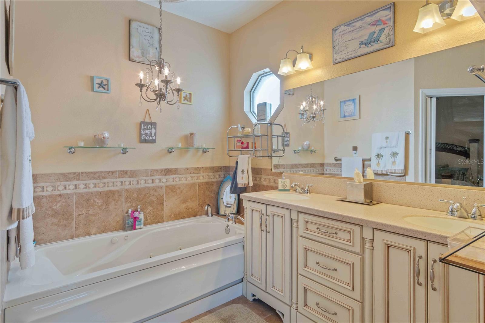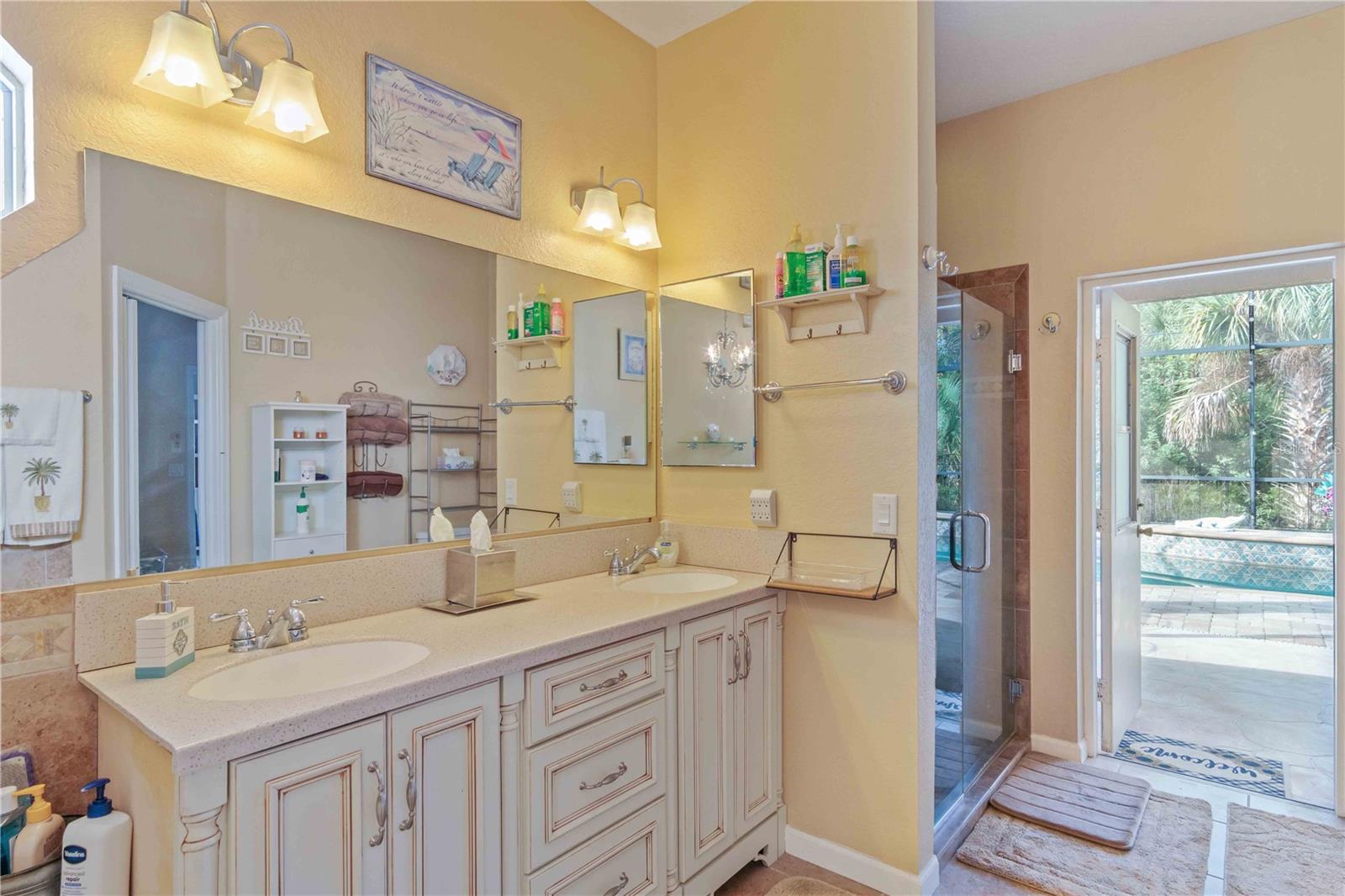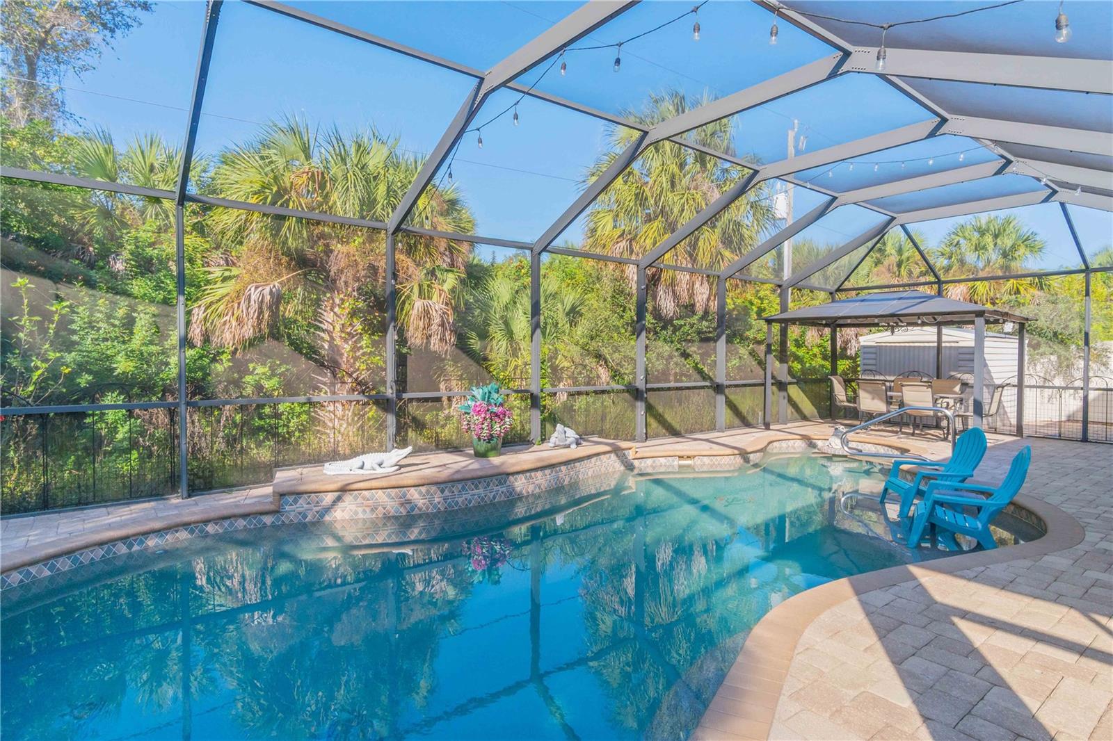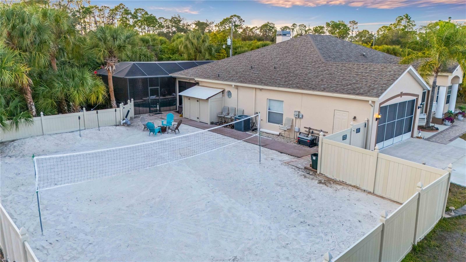 Located on a double lot, this stunning home has unique features that can’t be found anywhere else including its very own private volleyball court so you can relax with your feet in the sand (or perhaps convert it to a pickleball court), a fenced in yard, and a 2022 built 40x18x12 metal RV/boat carport with RV/Generator hookup. The home has a NEW ROOF with new gutters from 2023 and in 2014 a vastly oversized *saltwater heated AND cooled Sports Pool*, that is deeper than others. Once inside the home you will be captivated by the open floorplan, attractive archways, and tall ceilings. The front of the home has two large flex rooms that could be used in endless ways. The kitchen features a large pantry and an oversized island/bartop while the living room is also larger than most and has a beautiful wood burning fireplace. Once in the master suite, you will appreciate how spacious it is, with a large walk-in closet, jetted tub, walk in shower, and access to the pool! On the opposite side of the home, you will find the guest bathroom and 3 guest bedrooms, one of which is as large as most master bedrooms and gives direct access to the lanai. The lanai is among the largest you will see in this price range with plenty of room to relax. There is even an outdoor shower and outdoor bathroom as well giving you 3 bathrooms in total! Contact your agent for a private showing today, no other home around has the unique combination of features that this property provides!
