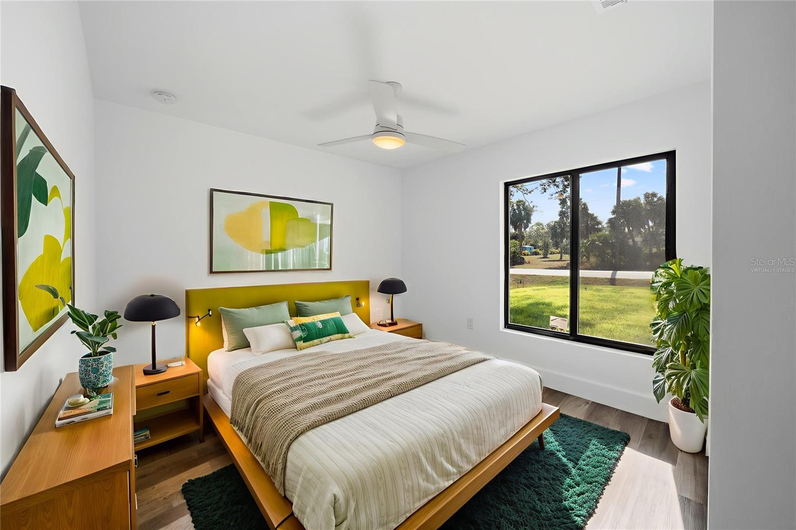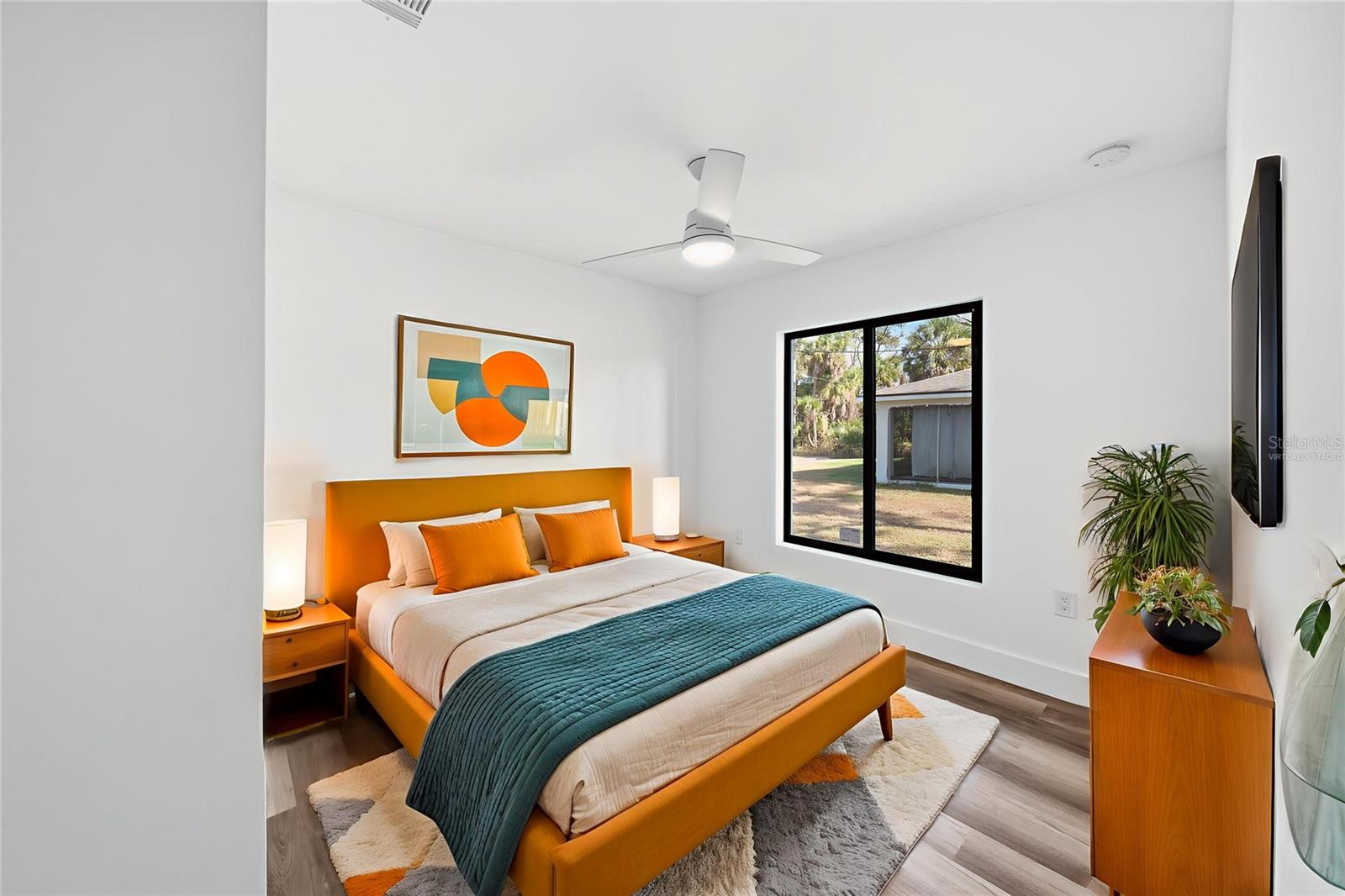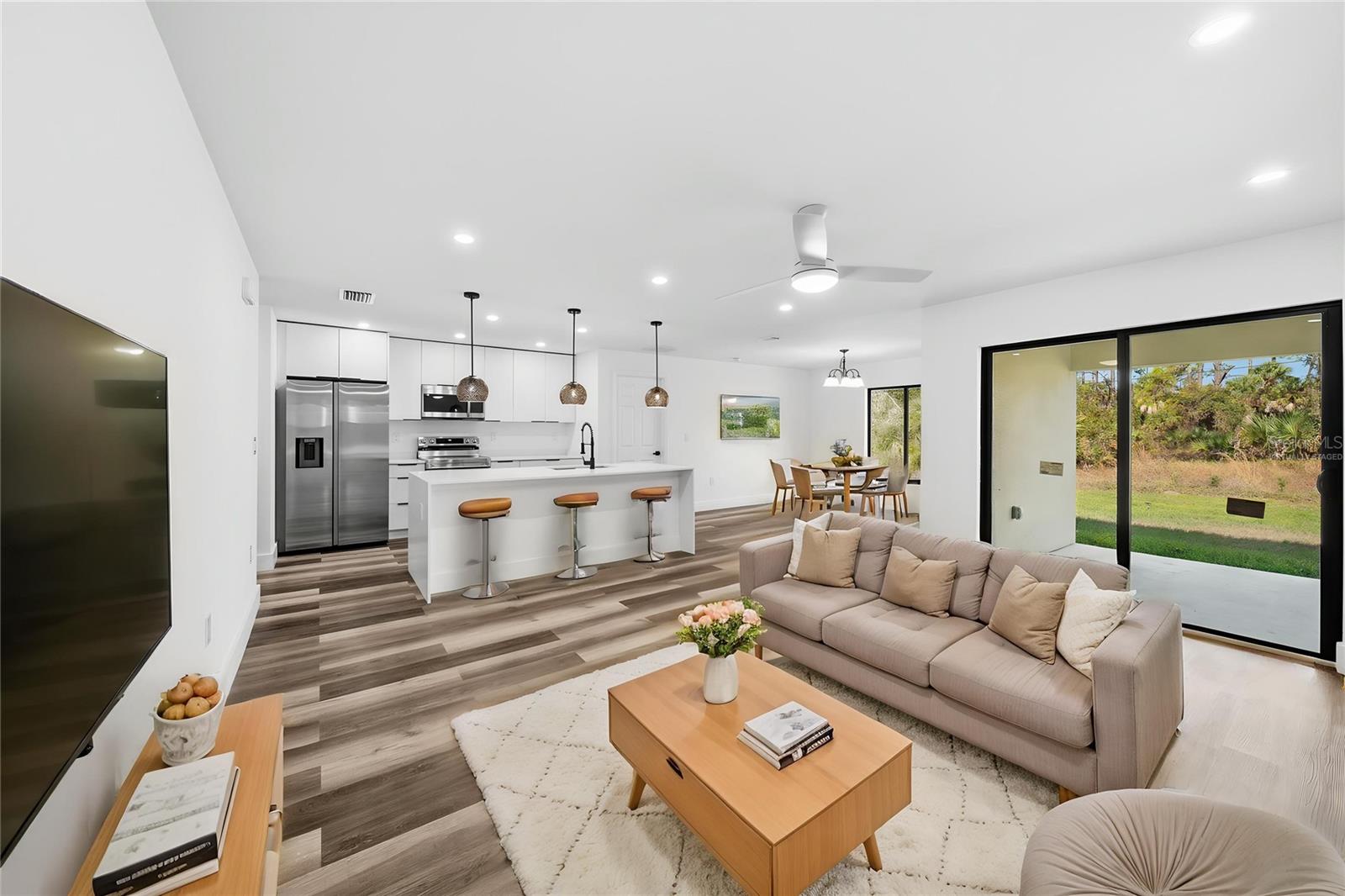 One or more photo(s) has been virtually staged. Stunning custom-built home featuring high-end finishes and thoughtful design throughout. This property offers storm/hurricane IMPACT-resistant windows and doors, designer lighting, and floor-to-ceiling tile in both bathrooms. The modern kitchen includes stainless steel appliances, custom cabinetry, two pantries, and a striking stone waterfall island. The primary suite provides a spa-like experience with a 15x4 walk-in closet, dual sinks, and an oversized tiled shower with stationary glass. The open floor plan lives larger than its 1,521 sq ft and includes 3 bedrooms plus a DEN/OFFICE, offering flexible use for work or guests. A beautifully finished, move-in-ready home with durable construction and contemporary style.