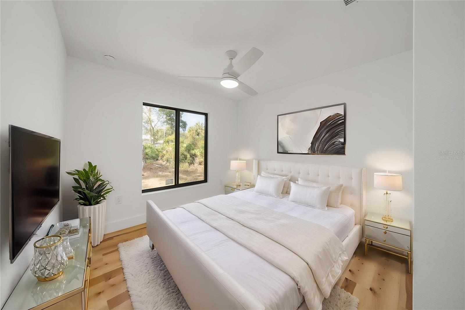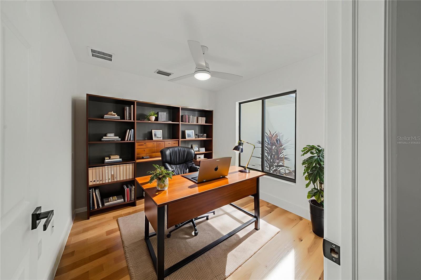 One or more photo(s) has been virtually staged. Stunning custom-built home featuring high-end finishes and thoughtful design throughout. This property offers storm/hurricane IMPACT-resistant windows and doors, designer lighting, and floor-to-ceiling tile in both bathrooms. The modern kitchen includes stainless steel appliances, custom cabinetry, two pantries, and a striking stone waterfall island. The primary suite provides a spa-like experience with a 15x4 walk-in closet, dual sinks, and an oversized tiled shower with stationary glass. The open floor plan lives larger than its 1,521 sq ft and includes 3 bedrooms plus a DEN/OFFICE, offering flexible use for work or guests. A beautifully finished, move-in-ready home with durable construction and contemporary style.