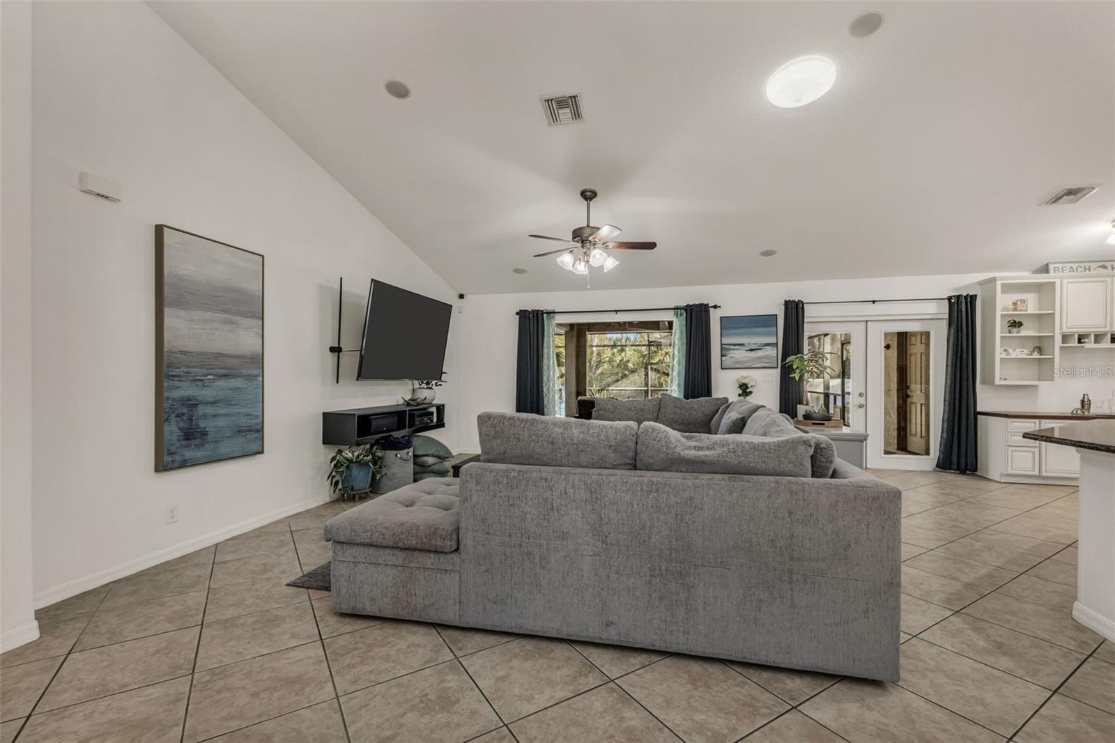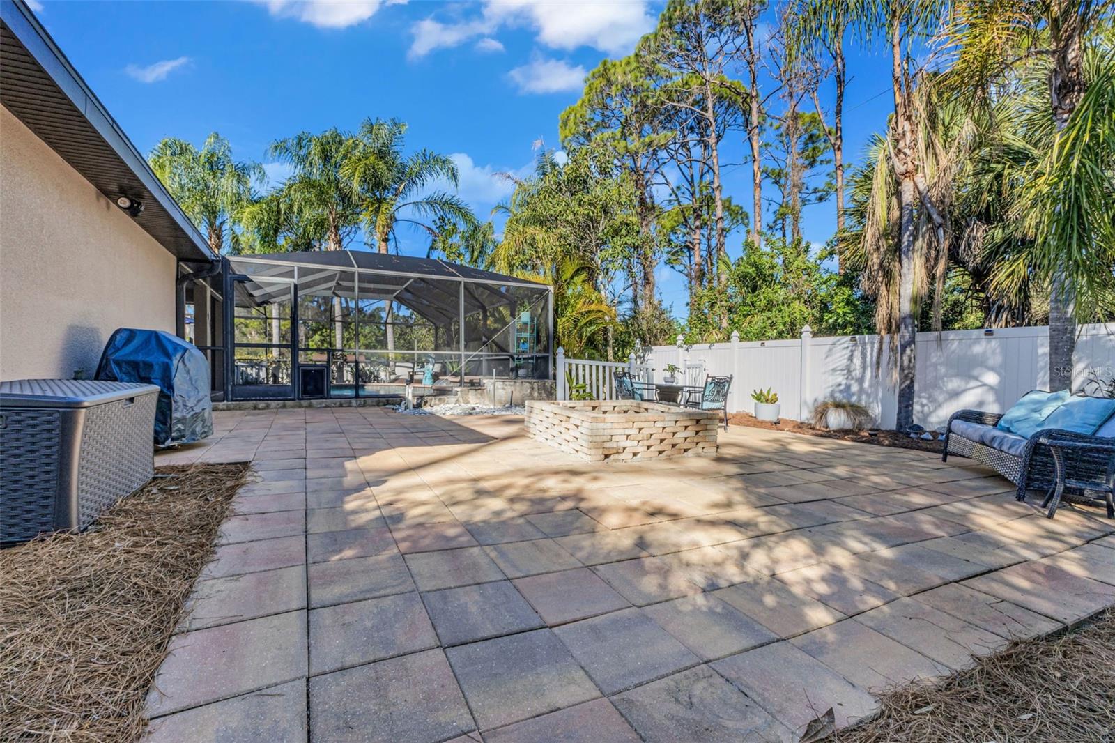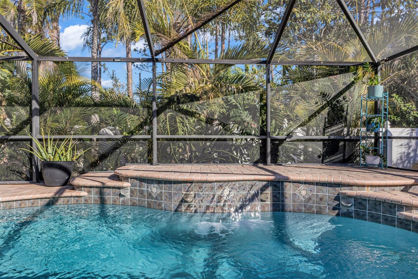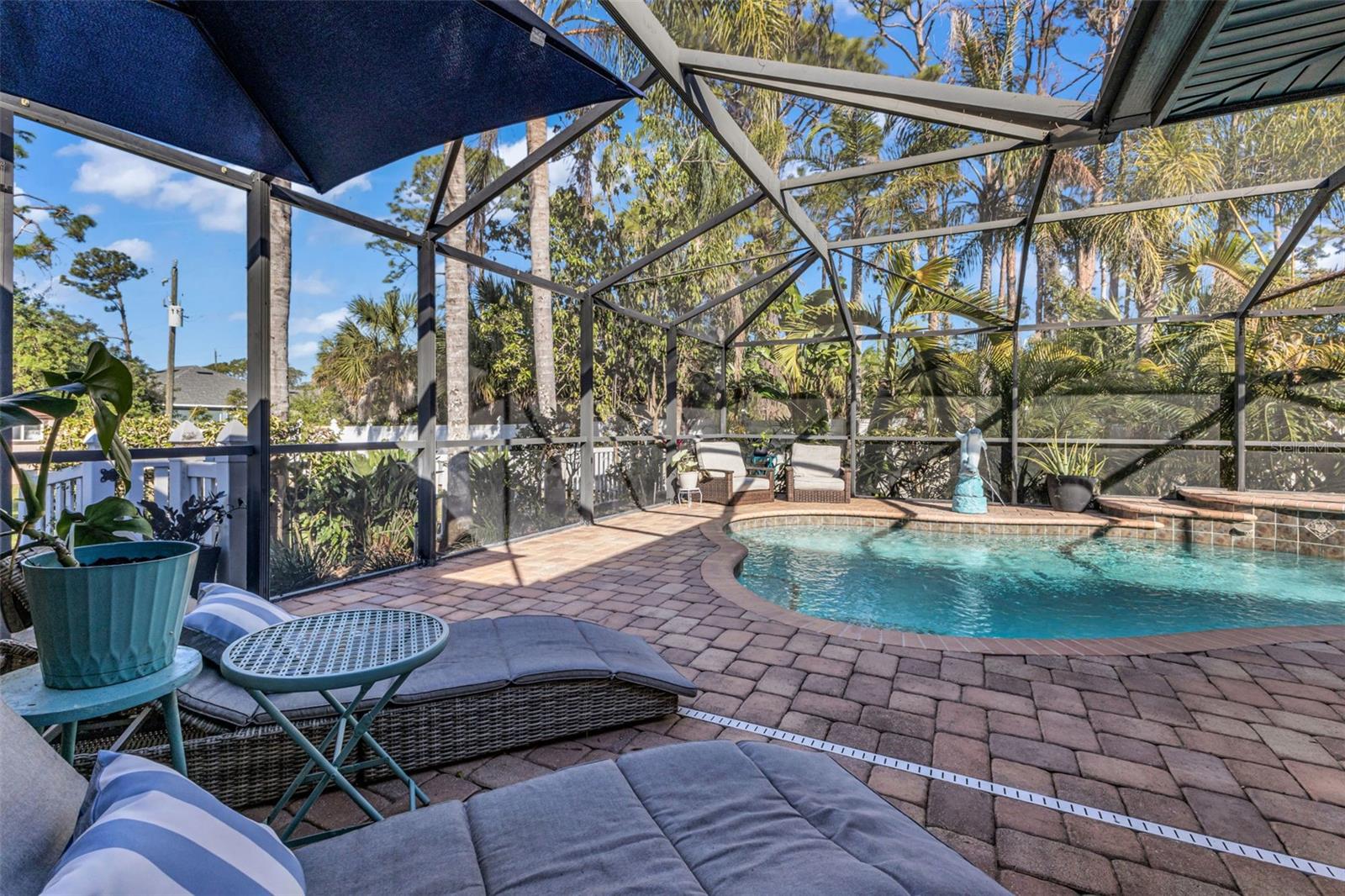 Welcome to Your Private Tropical Oasis! Perfectly situated on a rare double lot, this beautifully maintained 3-bedroom, 2-bath, 2-car garage HEATED pool home is surrounded by lush, mature landscaping that offers exceptional privacy and curb appeal. From the moment you arrive, you’ll be impressed by the stamped concrete driveway and walkway and the inviting screened entryway. Inside, the home opens to soaring cathedral ceilings, porcelain and ceramic tile flooring throughout, plantation shutters, and tasteful architectural details including decorative planter shelves. With 2,276 sq ft under air, the layout offers both elegance and functionality, featuring a formal living and dining room plus a spacious family room with Bluetooth surround sound and French doors that seamlessly connect indoor and outdoor living. The kitchen is designed to impress, offering granite countertops, stylish backsplash, stainless steel appliances, a breakfast bar, pantry closet, and an abundance of cabinetry and counter space—perfect for entertaining or everyday living. The laundry room is thoughtfully designed with a washer and dryer, and cabinetry for everyday convenience. The primary suite is a true retreat with tray ceilings, a walk-in closet, and sliding glass doors leading to the lanai. The en-suite bathroom features dual sinks, a walk-in shower, jetted garden tub, and a linen closet. A desirable split-floor plan provides privacy for guests and includes two guest bedrooms, a bonus room perfect for an office/or den, and a guest bath with pool access. Step outside to your resort-style backyard featuring a sparkling heated pool with a tranquil waterfall and a screened brick-paver lanai—ideal for both relaxing and entertaining. An additional brick-paver patio beyond the lanai is ideal for grilling or gathering around a fire pit. The fully fenced backyard and tropical landscaping complete this serene outdoor oasis. Bonus SHED for extra storage. Updates include: Hot Water Heater & Pool Filter 2025, Roof 2024, Pool Heater & Leach Field replaced 2022, Shed 2019, and AC 2017. NO HOA or DEED RESTRICTIONS! This home is conveniently located in a nice neighborhood but close to restaurants, shopping, beaches and much more, this home is a must-see! Schedule your appointment today and make it yours!
