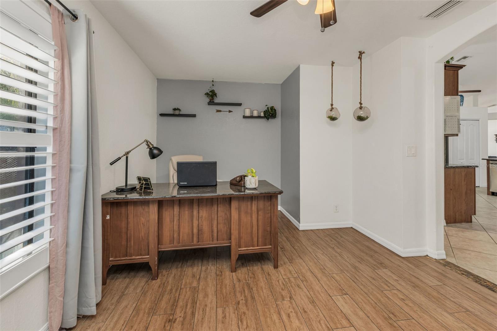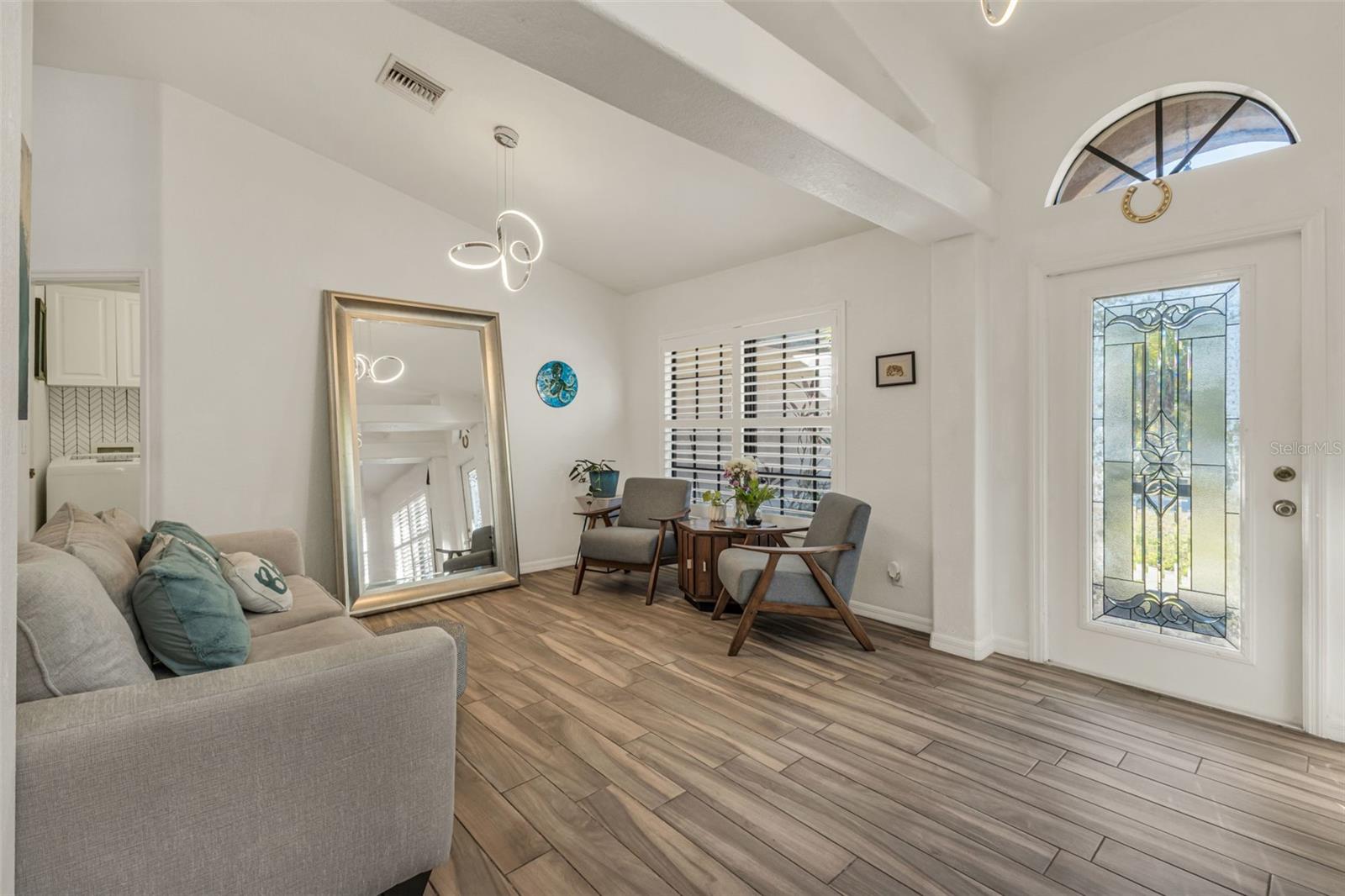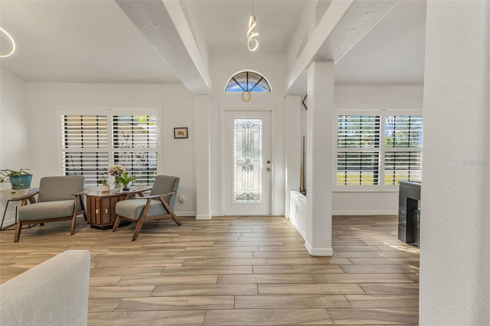 Welcome to Your Private Tropical Oasis! Perfectly situated on a rare double lot, this beautifully maintained 3-bedroom, 2-bath, 2-car garage HEATED pool home is surrounded by lush, mature landscaping that offers exceptional privacy and curb appeal. From the moment you arrive, you’ll be impressed by the stamped concrete driveway and walkway and the inviting screened entryway. Inside, the home opens to soaring cathedral ceilings, porcelain and ceramic tile flooring throughout, plantation shutters, and tasteful architectural details including decorative planter shelves. With 2,276 sq ft under air, the layout offers both elegance and functionality, featuring a formal living and dining room plus a spacious family room with Bluetooth surround sound and French doors that seamlessly connect indoor and outdoor living. The kitchen is designed to impress, offering granite countertops, stylish backsplash, stainless steel appliances, a breakfast bar, pantry closet, and an abundance of cabinetry and counter space—perfect for entertaining or everyday living. The laundry room is thoughtfully designed with a washer and dryer, and cabinetry for everyday convenience. The primary suite is a true retreat with tray ceilings, a walk-in closet, and sliding glass doors leading to the lanai. The en-suite bathroom features dual sinks, a walk-in shower, jetted garden tub, and a linen closet. A desirable split-floor plan provides privacy for guests and includes two guest bedrooms, a bonus room perfect for an office/or den, and a guest bath with pool access. Step outside to your resort-style backyard featuring a sparkling heated pool with a tranquil waterfall and a screened brick-paver lanai—ideal for both relaxing and entertaining. An additional brick-paver patio beyond the lanai is ideal for grilling or gathering around a fire pit. The fully fenced backyard and tropical landscaping complete this serene outdoor oasis. Bonus SHED for extra storage. Updates include: Hot Water Heater & Pool Filter 2025, Roof 2024, Pool Heater & Leach Field replaced 2022, Shed 2019, and AC 2017. NO HOA or DEED RESTRICTIONS! This home is conveniently located in a nice neighborhood but close to restaurants, shopping, beaches and much more, this home is a must-see! Schedule your appointment today and make it yours!