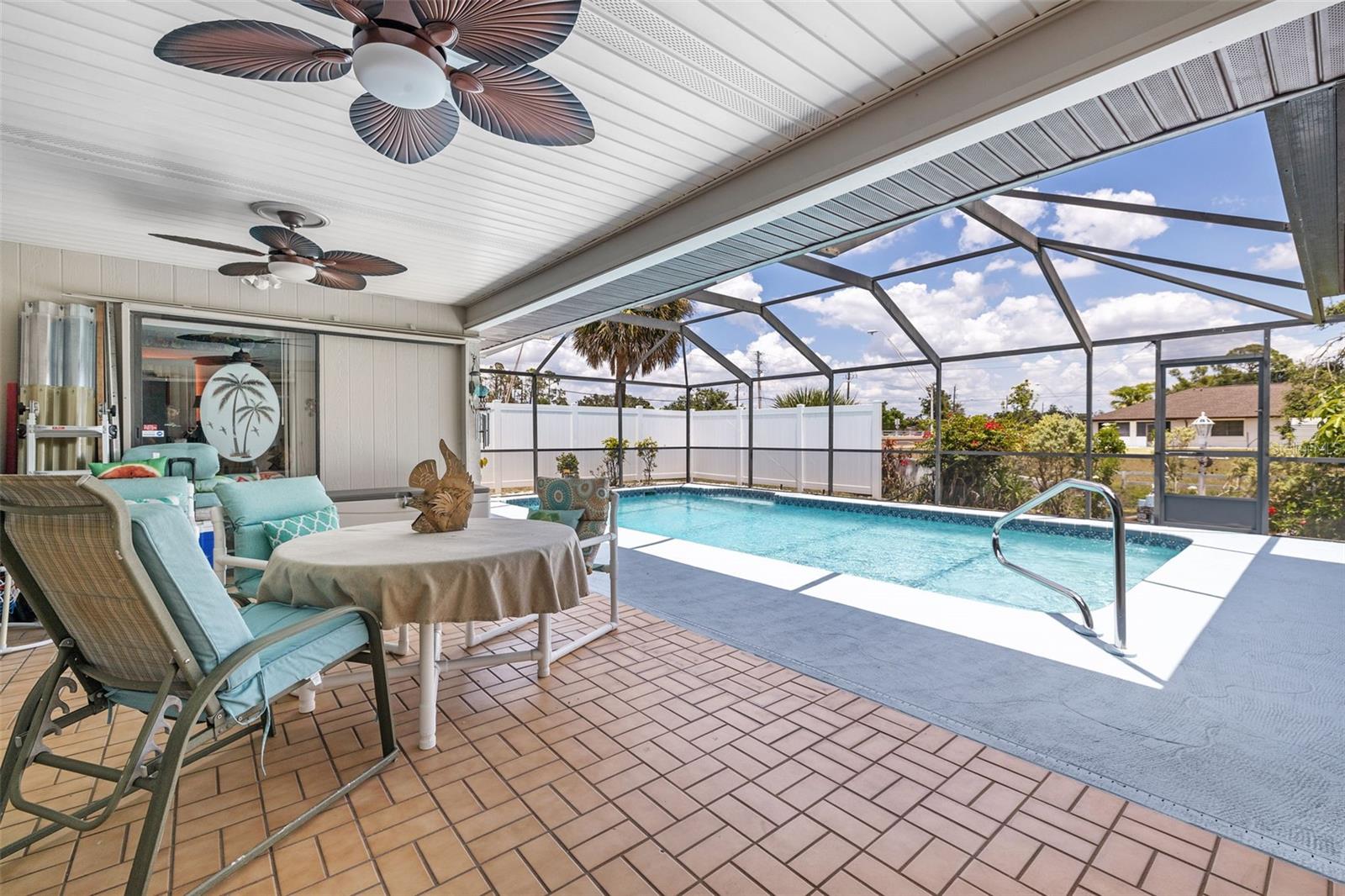 THIS WATERFRONT POOL HOME IS A MUST-SEE IN PORT CHARLOTTE! This charming waterfront pool home offers the perfect blend of comfort, style, and outdoor living. With over 2,120 sq. ft., this split floor plan features 3 bedrooms, 2 bathrooms, and a bonus room that could easily be converted into an additional bedroom if needed. Upon entering, you’ll find the home bright and airy. Numerous windows and a skylight enhance the beautiful parquet wood flooring, creating a warm and welcoming ambiance. The spacious living area flows seamlessly into the kitchen, which features granite countertops, newer state-of-the-art stainless steel appliances, an ice maker, and a water cooler. A convenient pass-through window to the pool and patio area makes entertaining friends and family effortless. Three separate sliding glass doors provide easy access to the pool area. The screened enclosure and vinyl fencing add extra privacy. The generously sized 14’ x 28’ swimming pool includes a newer screen enclosure, pool heater, timer, and pool pump, all replaced in 2022. Just outside the pool area is your private dock on the Niagara Waterway freshwater canal—perfect for fishing enthusiasts or simply lounging by the peaceful water. The primary suite offers a spacious retreat with a large walk-in closet and a bonus room (currently used as a music studio) that could serve as an office, library, or den. The two guest bedrooms are located on the opposite side of the home, ensuring privacy for family and visitors, with convenient access to the second full bathroom. Additional updates include a new shingle roof in 2022 and fresh interior and exterior paint, providing peace of mind for years to come. The circular driveway adds convenience, and the oversized 2-car garage includes steel overhead storage racks and two separate workshop areas. This home is centrally located in Port Charlotte with easy access to I-75, hospitals, restaurants, shopping, and recreational amenities. Just 6 miles to Downtown Punta Gorda and Downtown Port Charlotte, and only 20 miles to Englewood Beach! This exceptional home offers the perfect combination of tranquility and convenience. Make it your dream home with your own personal updates. Don’t miss your chance to experience the best of Florida living—call today to schedule your private showing!