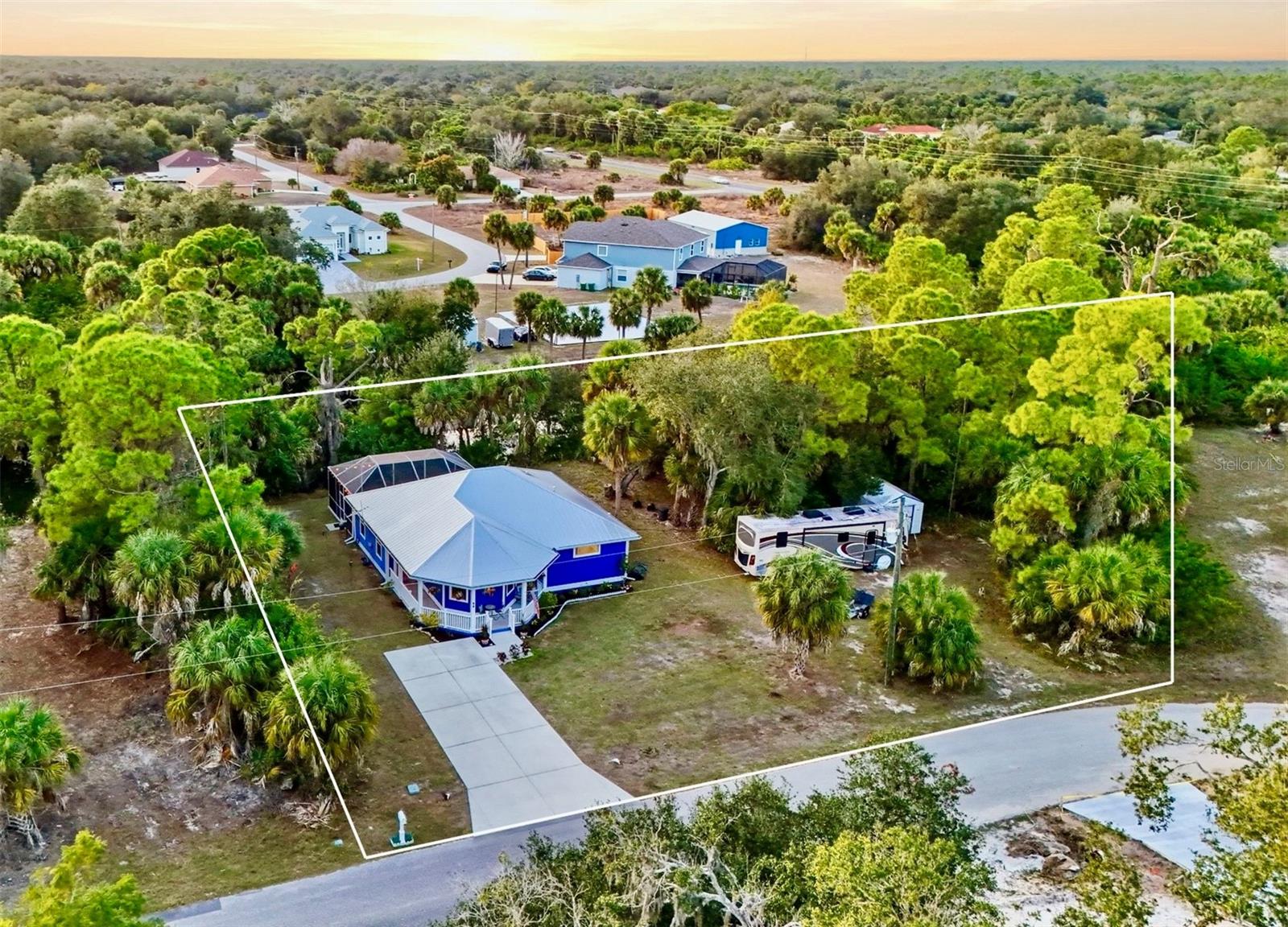 Welcome to Blueberry Bungalow, situated along 233ft+ waterfront and is a thoughtfully designed coastal retreat where craftsmanship, comfort and character come together beautifully. Your .58 acres are tucked away yet close to everything Port Charlotte has to offer, this canalfront home feels peaceful and private while still being minutes from shopping, dining, medical facilities and everyday conveniences. Custom built by the highly respected Thornberry Custom Builders, this home was designed with intention from the ground up. From the moment you step inside, natural light fills the open living space, highlighting soaring ceilings, quality finishes and a calming color palette inspired by the waters of Boca Grande. The signature wall color, Quietude, sets the tone for a home that instantly feels relaxed and welcoming. The family room is anchored by a cozy gas fireplace, creating a natural gathering space that feels warm and inviting. The kitchen is both functional and full of personality, featuring Cambria quartz countertops, shaker-style wood cabinetry with dovetail soft-close drawers, stainless steel appliances and gas cooking. A barn door adds character while providing discreet access to the pantry, and the large island offers plenty of space for casual meals, entertaining or everyday living. Plank tile flooring flows throughout the home, complemented by crown molding, 5¼-inch baseboards and tall interior doors that enhance the sense of openness. Built for efficiency, durability and peace of mind, the home includes a metal roof, impact windows, spray foam insulation, hurricane tie-downs, gas fireplace, gas water heater, gas dryer and an elevated stem wall for added height and protection. Additional features include an RV hookup and a 50-amp connection for a future shed, offering flexibility for storage, travel or hobbies. Outdoor living is just as special, with two distinct exterior spaces designed for different moments. The expansive screened birdcage offers the perfect place to gather, entertain or unwind while enjoying the outdoors. The private purple porch serves as its own spa-like retreat, complete with an infrared sauna that turns everyday living into a true self-care experience. The primary suite is spacious and serene, offering room for a king-size bed, a sitting or desk area, two closets including a walk-in, and a well-appointed ensuite with dual sinks, a makeup vanity, a walk-in shower and a linen closet. Doorways throughout the home are wheelchair accessible, reflecting the thoughtful design woven into every detail. Thoughtfully designed for easy Florida living, the home features front and rear covered porches, a spacious screened birdcage and peaceful canalfront views that invite you to slow down and enjoy the outdoors year round. With no immediate neighbors on either side and an optional adjacent parcel available, privacy and flexibility are rare bonuses that make this property feel even more special. Adding even more opportunity, the adjacent parcel to the right of the home is included with the purchase of your home, which includes a shed that's currently located on the lot and over 25,000sqft to roam! Whether used for added privacy, storage or future plans, it provides flexibility rarely found. Blueberry Bungalow is not just a home, it is a lifestyle. A place to slow down, gather, retreat and truly enjoy where you live!