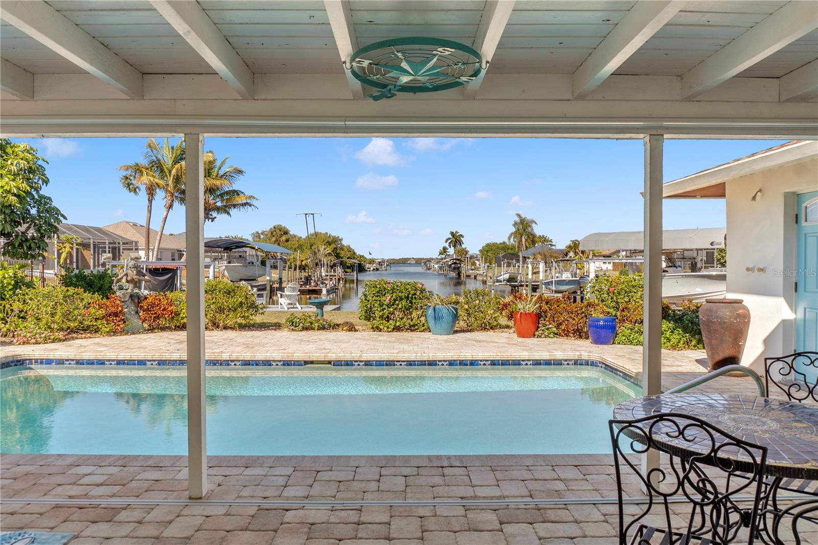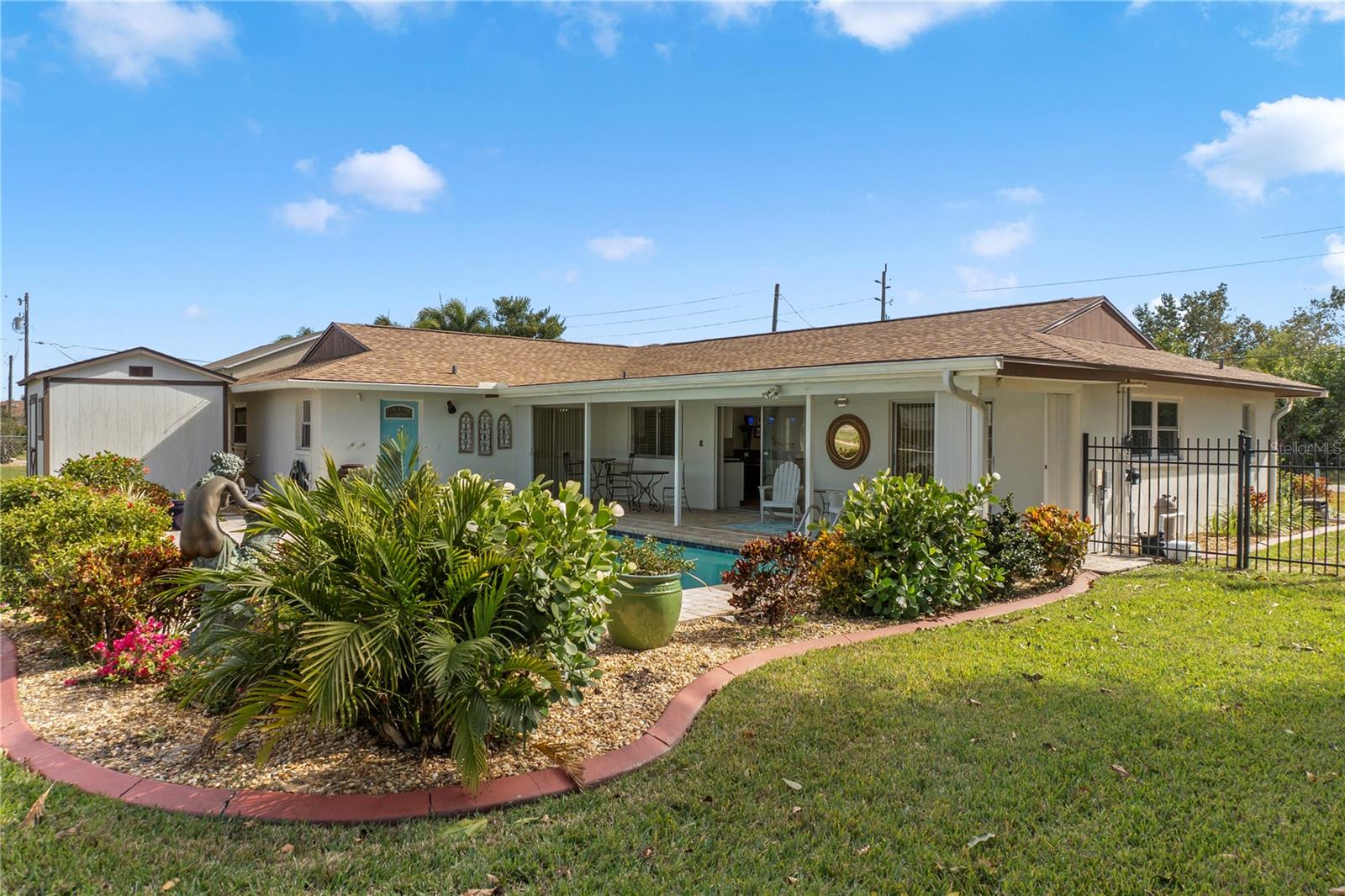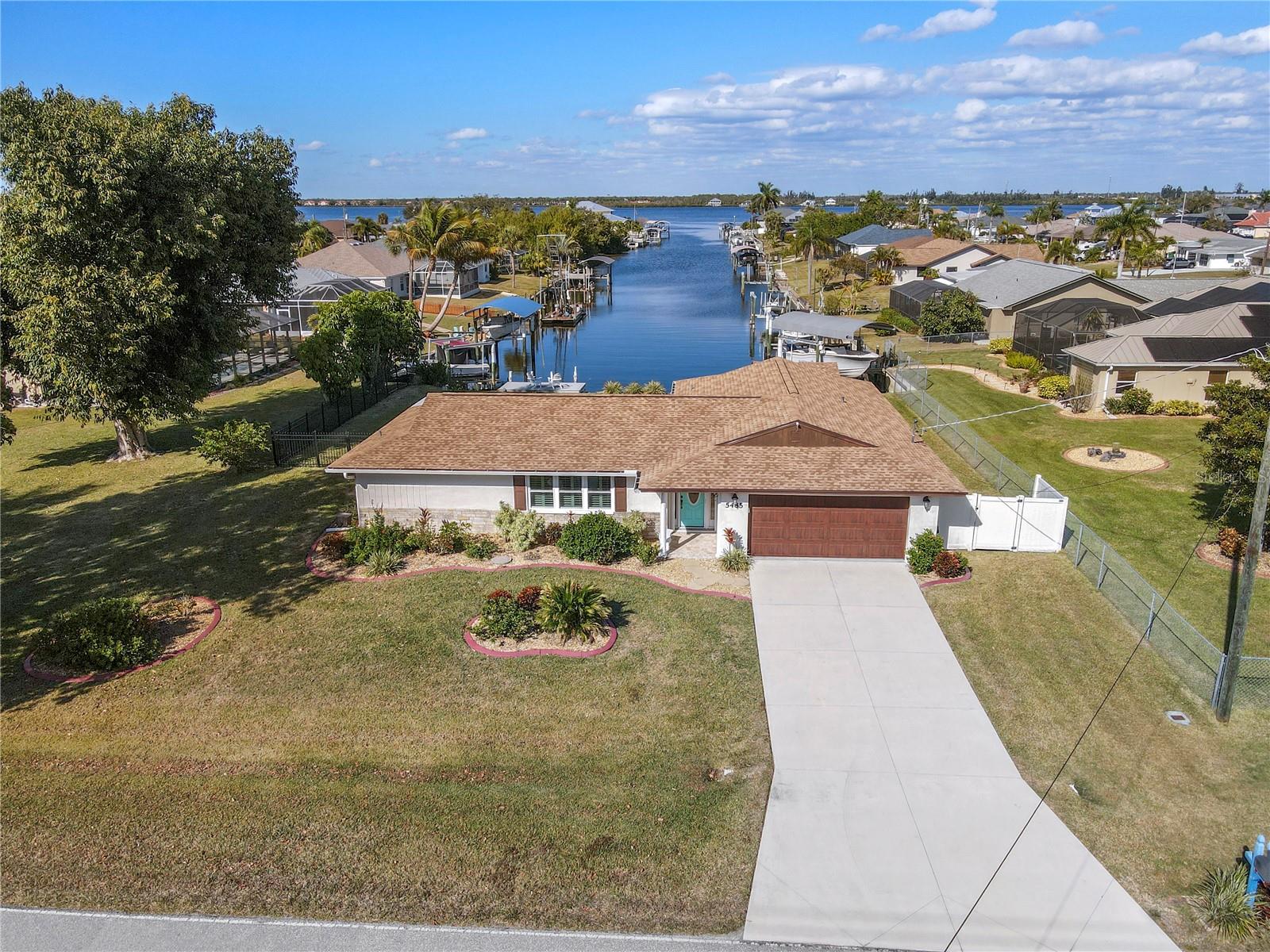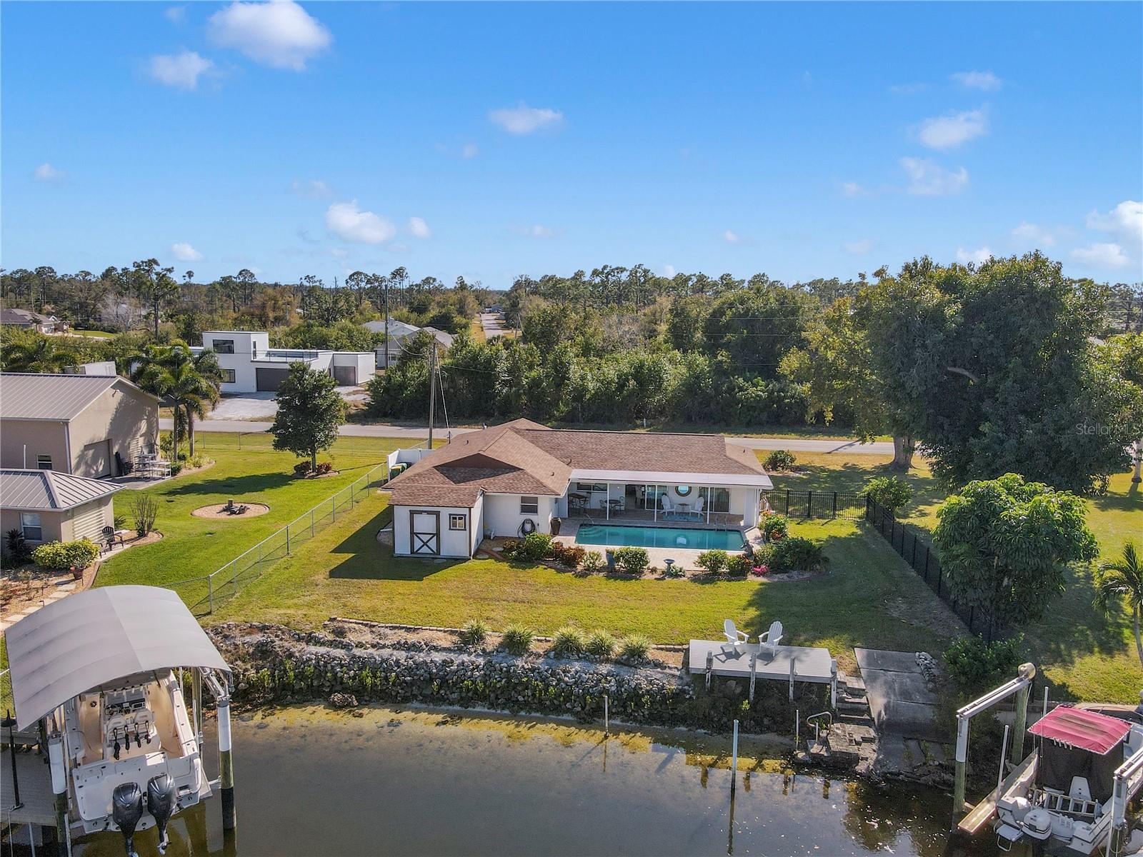 Get your bait & tackle ready! Waterfront living is here with quick and easy access to big water. This beautifully updated 3-bedroom, 2-bath pool home with a 2-car garage is located along the Myakka River, which flows directly into Charlotte Harbor and the Gulf of America. Positioned at the end of a canal on the Boyle Waterway just beyond the El Jobean Bridge, the property offers a beautifully unique water view that is rarely found directly on the river. Inside, the home features a split floor plan with 1,679 sq ft of living space, luxury vinyl flooring throughout, and an open, functional layout. The updated kitchen includes black granite countertops, shaker-style cabinetry, solid wood construction, and modern appliances, including a wine refrigerator. The primary suite offers a walk-in closet and an updated en-suite bathroom with a walk-in shower. Recent improvements provide peace of mind, including a new roof (2023), updated electrical panel and service, luxury vinyl flooring (2023), accordion hurricane shutters (2023), hurricane-rated windows (2020), retextured walls and ceilings (2022), a Tuff Shed (2023), and a replaced driveway (2019). The outdoor living space includes a private in-ground pool, covered and open patio areas, an outdoor shower, and a fenced yard. Relax poolside while enjoying the sights of mullet jumping in the water and scenic canal views looking straight down the waterway toward the Myakka River. Located in the Gulf Cove community with no mandatory HOA. Optional membership provides access to the community park and private boat ramp. Conveniently located near Boca Grande & Englewood beaches, marinas, golf courses, dining, and world-class fishing. Paradise is calling—welcome home.