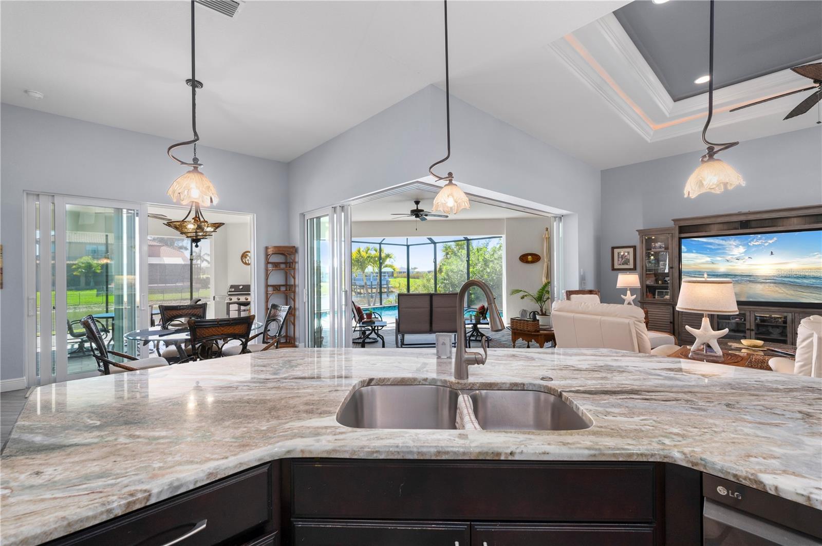 Open design. Intentional detail. Expansive water views. Built in 2017, designed with intention and priced to sell, this 3 bedroom, 2 bath waterfront pool home delivers over 1,900 square feet of open-concept living in the boating community of South Gulf Cove. With a concrete seawall and access to more than 55 miles of navigable canals leading toward Charlotte Harbor and the Gulf Islands, this is Florida waterfront living shaped around light, air, and connection. From the moment you step inside, porcelain driftwood-style plank flooring set on a diagonal guides your eye through the home, creating subtle movement and a cohesive, upscale finish throughout. Ceilings rise beyond 11 feet, amplifying the sense of space. In the living room, double tray ceilings with crown molding and ambient lighting add architectural dimension, while triple pocketing zero-edge sliders erase the wall between indoors and out. Push them open and the home expands. The pavered lanai area unfolds into multiple seating areas flanking a custom heated triangular pool, strategically designed to embrace long, tranquil water views. Custom "noseum" screen panels preserve the panorama while enhancing comfort. This is seamless indoor-outdoor entertaining, engineered for gatherings, quiet mornings, and sunset evenings alike. At the center of it all, the kitchen commands attention. Large granite countertops, an expansive island built for conversation, and staggered contrast wood cabinetry create depth and visual interest. Black stainless appliances complete the aesthetic. Whether hosting holidays or casual waterfront dinners, the flow between kitchen, dining, and living spaces makes entertaining effortless. The primary suite offers privacy and scale, with tray ceilings reaching 10 feet and direct slider access to the pool. The en-suite bath feels refined and spa-inspired, featuring a walk-around Roman-style shower with contrasting tile, dual vanities, and thoughtful finishes that echo the home’s attention to detail. Two additional bedrooms are positioned on the opposite side for privacy, sharing a well-appointed bath with convenient pool access. The laundry room includes cabinetry for organized storage. A 3-car garage provides ample space for vehicles, tools, or hobbies. Built with durability in mind, the home features impact windows, Storm Smart electric hurricane screens, and a concrete tile roof for layered storm protection. Additional updates include: newer HVAC, new pool heater control panel, upgraded electric panel for generator hook-up and Conserva Irrigation system. The concrete seawall enhances the waterfront setting while reinforcing long-term value and an optional HOA keeps flexibility on your side. Situated in one of the fastest-growing waterfront communities in Charlotte County, and within reach of Southwest Florida’s renowned beaches, boating routes, dining, and coastal destinations, this Gulf-access pool home combines modern construction, architectural detail, hurricane protection, and heated pool luxury into one cohesive Florida lifestyle opportunity. Clean sightlines. Water as your backdrop. A home that performs beautifully and lives even better.