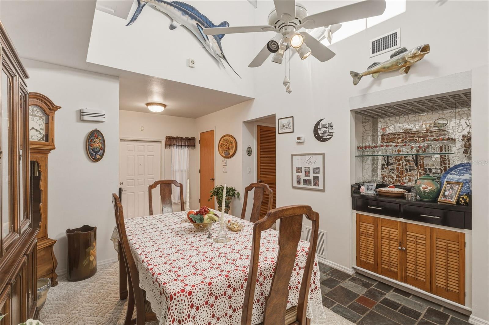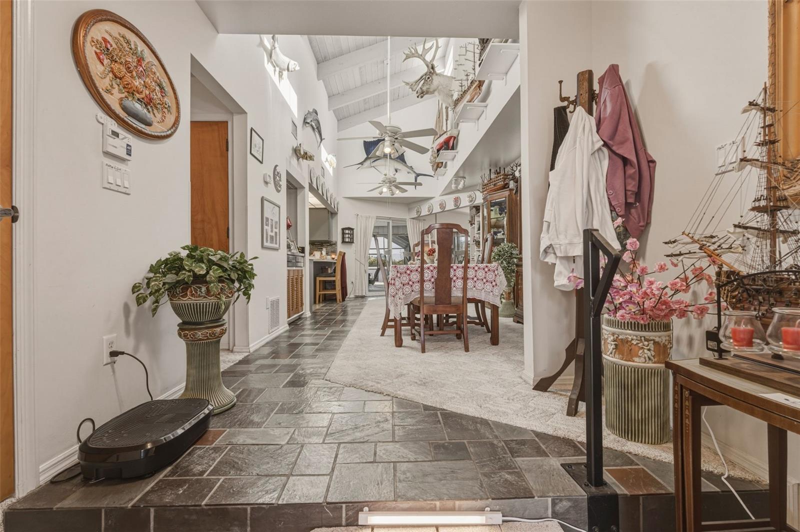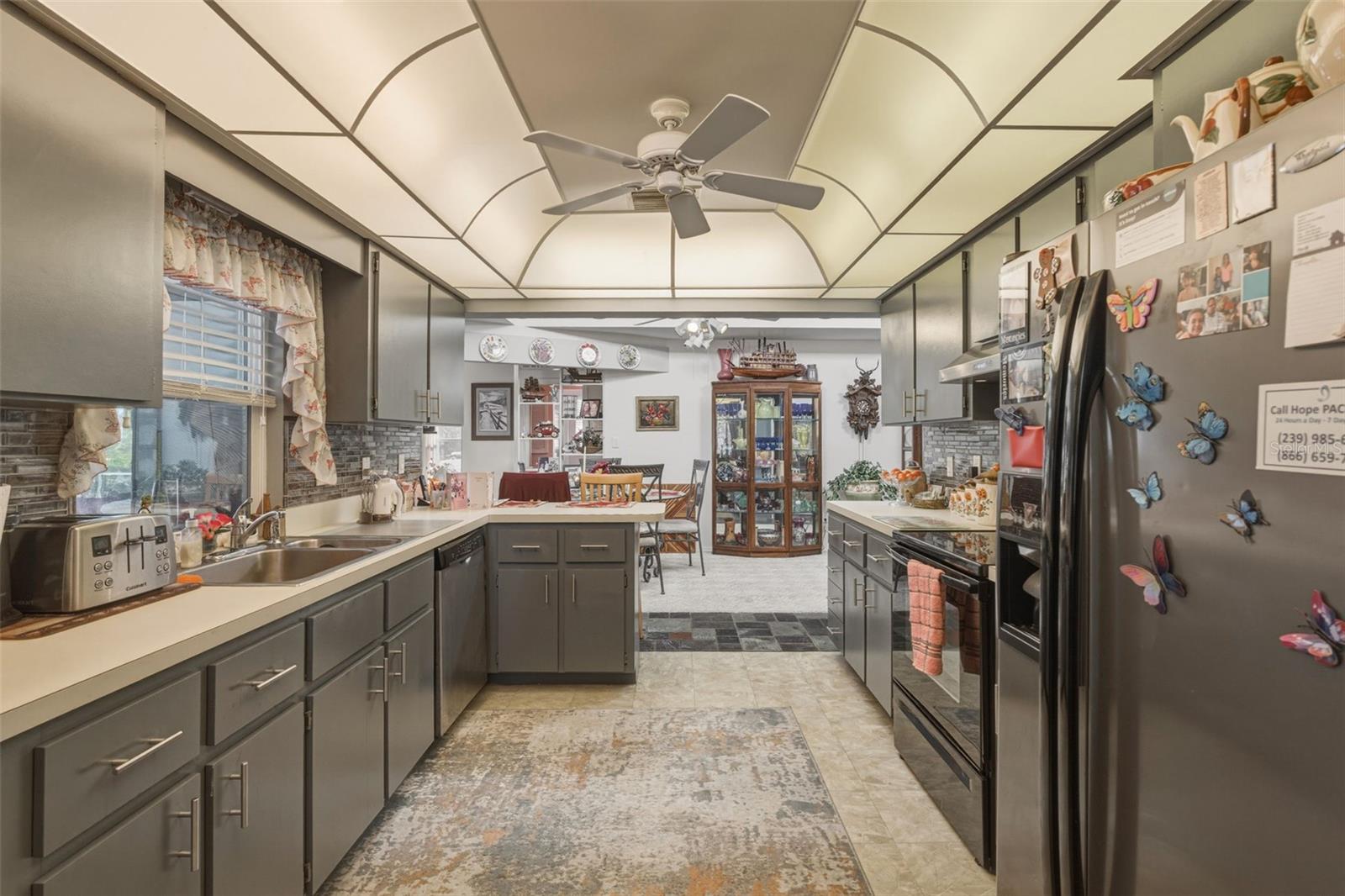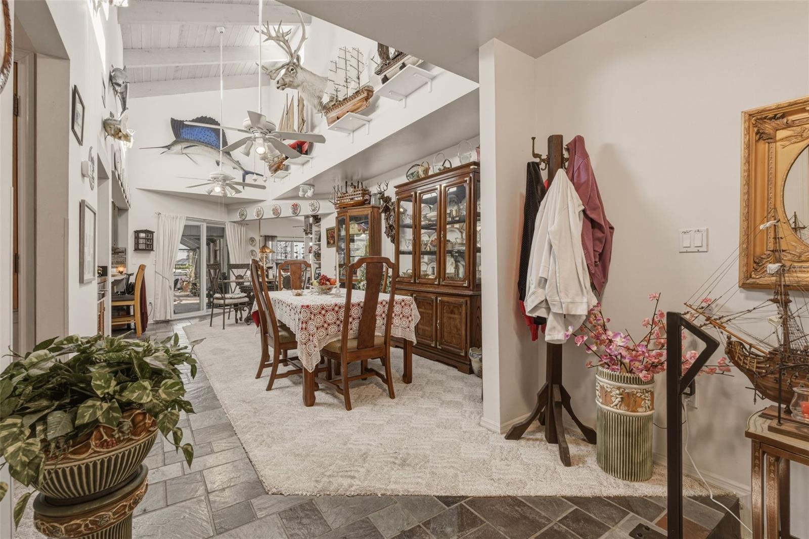 Dynamically different and designed for true Florida living, this exceptional Port Charlotte residence delivers space, style, and privacy on an oversized, beautifully landscaped corner lot. From the moment you step through the stone-accented entry porch through the foyer and into the raised main living space, the soaring vaulted and beamed wood ceiling creates an immediate sense of openness and character—far from the ordinary cookie-cutter home. The split floor plan features three well-appointed bedrooms, two baths, and a versatile bonus room off the primary bedroom that can serve as an office, sitting room, or expansive walk-in closet. The heart of the home is its inviting living and dining areas, complete with a built-in bar and a renovated kitchen enhanced by stainless steel appliances, glass tile accents, and an expanded workspace with a large laundry room & pantry nearby. Whether hosting family gatherings or quiet evenings at home, the layout offers comfort and flexibility. Outdoor living is the true showpiece. The rear of the home faces southeast, allowing the pool area to enjoy sunlight for most of the day—a highly desirable feature for year-round enjoyment. Over 1,500 square feet of luxurious outdoor living surrounds the heated pool and separate in-ground spa, all set on an elegant paver deck with a spacious covered lanai perfect for entertaining or relaxing in the Florida sun. A metal roof, impact windows, and a hurricane-rated garage door provide peace of mind, while the unique semi-enclosed carport and one-car garage offer creative parking options and the potential to convert to a full two-car garage if desired. A 12' x 8' shed adds valuable storage for tools, toys, or hobby equipment. Set in the desirable Spring Lake area, this home is just minutes from the Port Charlotte Beach Complex, Spring Lake Boat Ramp, shopping, dining, medical facilities, and the Peace River. Englewood’s pristine Gulf beaches are less than 30 minutes away. A rare blend of character, craftsmanship, and resort-style outdoor living—this home is truly one of a kind.