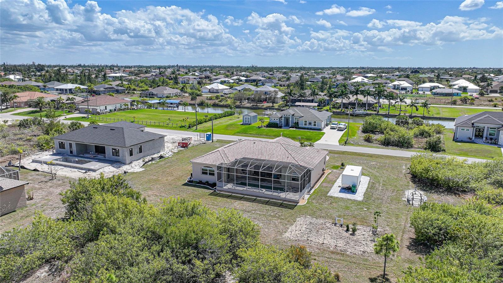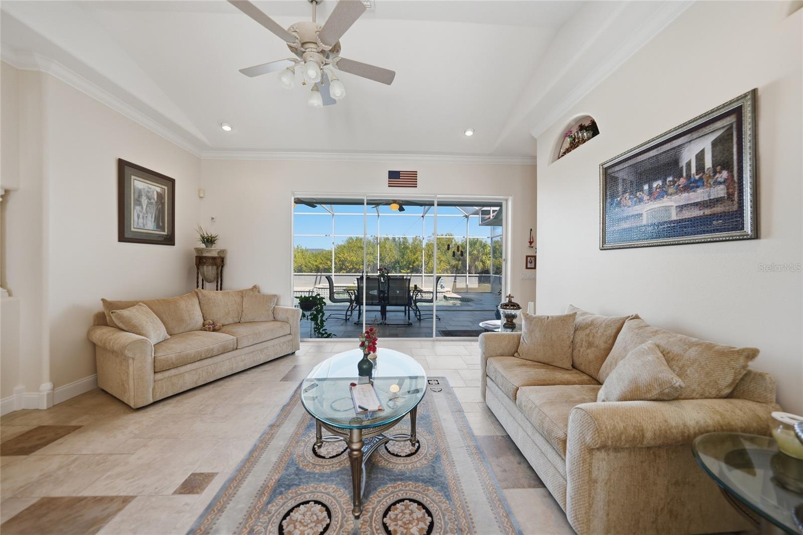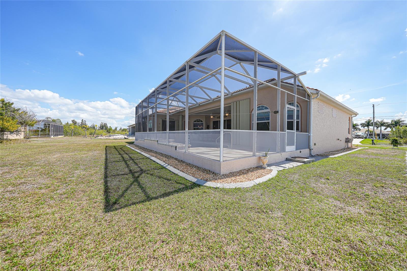 Welcome to this beautifully maintained Florida-style residence, featuring a grand circular paver driveway and striking curb appeal. Located in the desirable waterfront community of South Gulf Cove, this 3-bedroom, 2.5-bath, 2 car garage pool home offers 2,421 square feet of living space on an expansive four-lot property totaling 41,374 square feet, providing ample room and privacy. The Mediterranean-inspired exterior boasts a tile roof, arched windows, and refined architectural details that create a sophisticated first impression. A graceful walkway framed by decorative columns and charming stone accents leads to the covered entry. Mature landscaping and a central palm island enhancing the home’s welcoming approach. Step inside the foyer into the formal living room, where sliding glass doors open to the pool and lanai, creating a seamless indoor-outdoor lifestyle. To the right, the formal dining room features travertine flooring and mirrored ceiling accents, adding elegance and a touch of glamour. To the left, the den/office offers bamboo flooring, custom cabinetry, and wainscoting—a refined space for work or relaxation. Throughout the home, stately columns, graceful arches, detailed crown moldings, and beautifully designed ceiling treatments create a luxurious yet inviting atmosphere, perfect for entertaining or everyday living. The gourmet kitchen is the heart of the home, blending style, space, and functionality. Rich 44" solid wood cabinetry with detailed craftsmanship and glass-front uppers provides abundant storage, while granite countertops offer ample workspace. Stainless steel appliances—including a built-in microwave, smooth-top range, and dishwasher—bring modern convenience to the classic design. Under-cabinet lighting, crown molding, and recessed lights ensure the space is bright and welcoming. The kitchen flows seamlessly into the cozy dinette and spacious family room, creating an open-concept layout ideal for entertaining, relaxing, or staying connected while cooking. Large windows throughout enhance the warm, airy ambiance, while durable tile flooring and a thoughtful layout make this kitchen as practical as it is inviting. The huge owner’s suite is a private retreat with direct pool access, dual walk-in closets, and a spa-like ensuite bath featuring a jetted corner tub, large walk-in shower, double sinks with granite countertops, and custom cabinetry. On the opposite side of the home, two spacious guest bedrooms offer built-in closets and share a beautifully tiled bath with a walk-in shower, providing comfort and privacy for family or guests. Step outside to your private Florida oasis in the stunning screened-in pool area, designed for year-round enjoyment. The sparkling pool stretches the length of the lanai, featuring a raised spa for relaxation. A spacious covered lanai runs alongside the pool, complete with ceiling fans, tile flooring, and ample room for outdoor dining and lounging. The full enclosure allows for pest-free enjoyment while offering clear views of the natural surroundings, creating a private and inviting retreat. This great boating community offers an optional annual HOA and a community boat ramp with access to 55 miles of canals and Charlotte Harbor. The home is just minutes from Englewood and Boca Grande beaches, shopping, dining, entertainment, and golf—Rotonda’s five golf courses are only a short drive away. **PLEASE ENJOY THE 3D INTERACTIVE VIRTUAL TOUR ASSOCIATED WITH THIS LISTING**