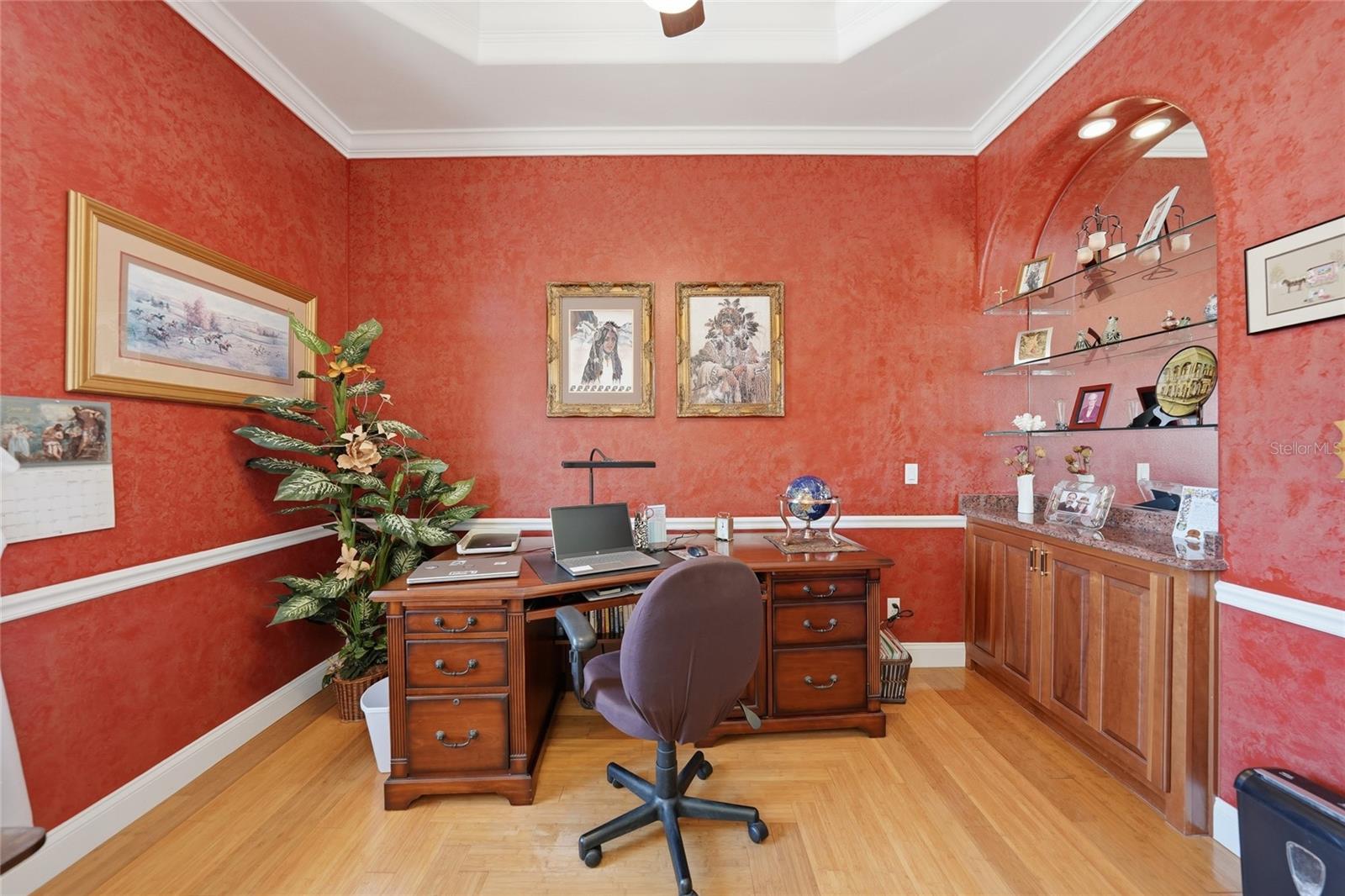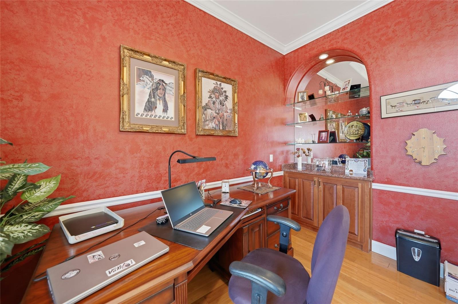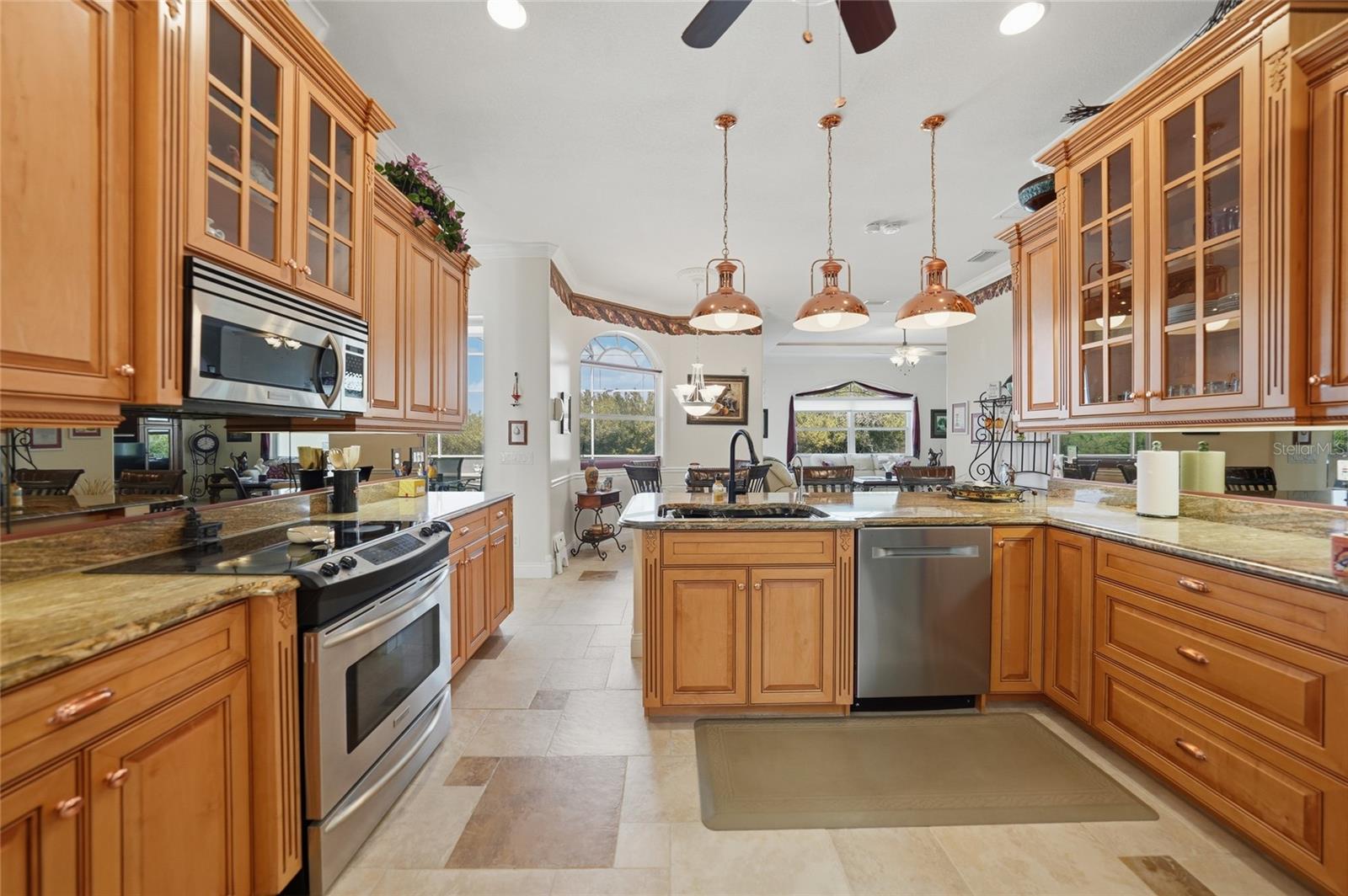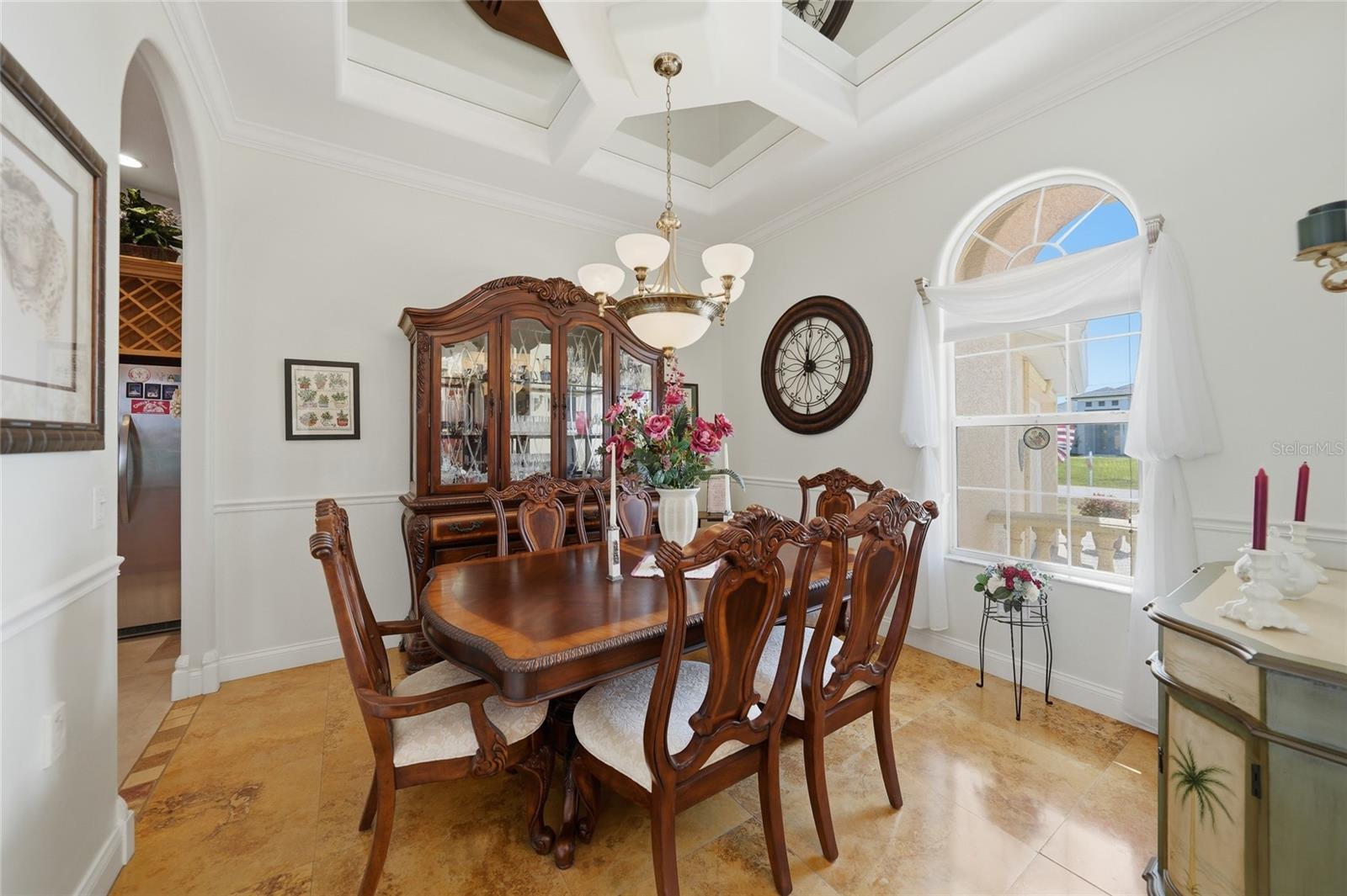 Welcome to this beautifully maintained Florida-style residence, featuring a grand circular paver driveway and striking curb appeal. Located in the desirable waterfront community of South Gulf Cove, this 3-bedroom, 2.5-bath, 2 car garage pool home offers 2,421 square feet of living space on an expansive four-lot property totaling 41,374 square feet, providing ample room and privacy. The Mediterranean-inspired exterior boasts a tile roof, arched windows, and refined architectural details that create a sophisticated first impression. A graceful walkway framed by decorative columns and charming stone accents leads to the covered entry. Mature landscaping and a central palm island enhancing the home’s welcoming approach. Step inside the foyer into the formal living room, where sliding glass doors open to the pool and lanai, creating a seamless indoor-outdoor lifestyle. To the right, the formal dining room features travertine flooring and mirrored ceiling accents, adding elegance and a touch of glamour. To the left, the den/office offers bamboo flooring, custom cabinetry, and wainscoting—a refined space for work or relaxation. Throughout the home, stately columns, graceful arches, detailed crown moldings, and beautifully designed ceiling treatments create a luxurious yet inviting atmosphere, perfect for entertaining or everyday living. The gourmet kitchen is the heart of the home, blending style, space, and functionality. Rich 44" solid wood cabinetry with detailed craftsmanship and glass-front uppers provides abundant storage, while granite countertops offer ample workspace. Stainless steel appliances—including a built-in microwave, smooth-top range, and dishwasher—bring modern convenience to the classic design. Under-cabinet lighting, crown molding, and recessed lights ensure the space is bright and welcoming. The kitchen flows seamlessly into the cozy dinette and spacious family room, creating an open-concept layout ideal for entertaining, relaxing, or staying connected while cooking. Large windows throughout enhance the warm, airy ambiance, while durable tile flooring and a thoughtful layout make this kitchen as practical as it is inviting. The huge owner’s suite is a private retreat with direct pool access, dual walk-in closets, and a spa-like ensuite bath featuring a jetted corner tub, large walk-in shower, double sinks with granite countertops, and custom cabinetry. On the opposite side of the home, two spacious guest bedrooms offer built-in closets and share a beautifully tiled bath with a walk-in shower, providing comfort and privacy for family or guests. Step outside to your private Florida oasis in the stunning screened-in pool area, designed for year-round enjoyment. The sparkling pool stretches the length of the lanai, featuring a raised spa for relaxation. A spacious covered lanai runs alongside the pool, complete with ceiling fans, tile flooring, and ample room for outdoor dining and lounging. The full enclosure allows for pest-free enjoyment while offering clear views of the natural surroundings, creating a private and inviting retreat. This great boating community offers an optional annual HOA and a community boat ramp with access to 55 miles of canals and Charlotte Harbor. The home is just minutes from Englewood and Boca Grande beaches, shopping, dining, entertainment, and golf—Rotonda’s five golf courses are only a short drive away. **PLEASE ENJOY THE 3D INTERACTIVE VIRTUAL TOUR ASSOCIATED WITH THIS LISTING**