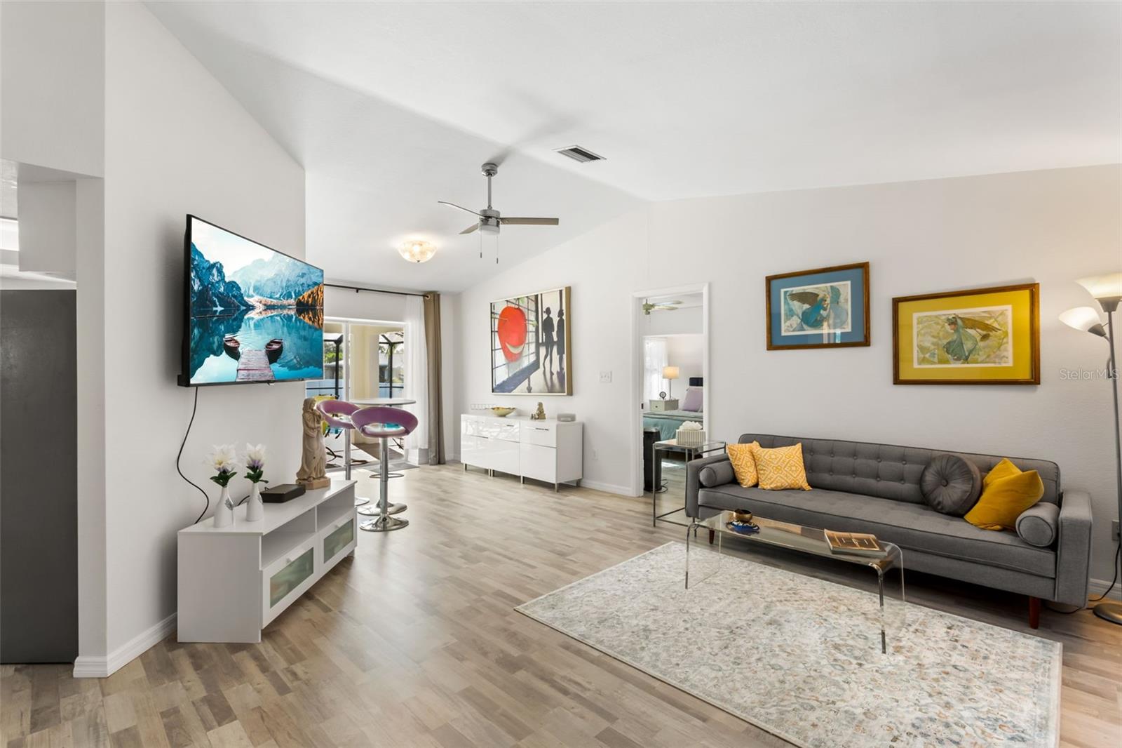 Welcome to this Beautiful 2 Bedroom, 2 Bathroom, 2 Car Garage home with an In-Ground Pool and Fully Fenced in Back Yard! This home features many high value upgrades such as remodeled Bathrooms, Newer Kitchen Appliances, Impact Windows, a Newer Roof (December 2023), Water Heater (2024) and Laminate Flooring throughout! This home offers a Hallway entrance with niche to accommodate an entrance table or Hall Bench along with a Coat Closet for additional storage! Once in the Living Room, enjoy the volume of the cathedral ceilings and a neutral color palate of the walls and flooring contrasted by colorful accents and elegant window coverings that create an inviting atmosphere! Wander into the spacious open concept dining area while enjoying views of the sparkling pool through the sliding glass door! In the Kitchen, you'll find newer Stainless-Steel appliances, brilliant white countertops offering plenty of space for food prep and cooking, overhead colorful ambient lighting and a great Pantry! Enjoy privacy and separation from your family and guests with a Split Bedroom Floorplan. The Primary Suite boasts ample space to accommodate large bedroom furniture and is filled with an abundance of natural light! The Primary En-Suite Bathroom is Fully Remodeled and is Stunning! Stylish finishes Adorn each space from carefully chosen penny tile for the shower floor to the gorgeous vessel sink atop shimmering tiled countertops! All finishes are neutral, light and bright! Additionally, the Primary Suite offers a spacious walk-in closet and a hall closet for additional storage! Across the home is a Fully Remodeled Guest Bathroom with Brilliant attractive finishes that will be appreciated! Neutral multicolor Hexagonal tiled flooring catches your attention as your eye pans to a gleaming New tub and tile surround and another vessel style sink to give a luxurious feel! In the Guest Bedroom, Neutral light flooring continues reflecting an abundance of natural light! This room also features a spacious Walk-in Closet! This home design was well planned with a sizable laundry room complete with an additional area for overflow pantry items or storage! The 2 Car Garage with Hurricane Rated Door offers an abundance of additional storage or plenty of room for vehicles and power toys! Step outside for the Show-Stopping lanai and In-Ground Pool (2021)! Surrounded by updated pavers, Enjoy the dazzling, sparkling water from your own Private swimming pool! Complete with a Full Screen Enclosure, this swimming pool is a Must Have! Also enjoy the Large Outdoor Covered Dining Area, also a Must Have for SWFL! Beyond the Pool, a Roomy, Fully Fenced-in Backyard helps to add privacy, security, and a great space for little ones (Furry or Not) to enjoy! This home is excellent for all types of buyers! This a great retirement home, family home or investment opportunity! Start living your Best SWFL lifestyle today!