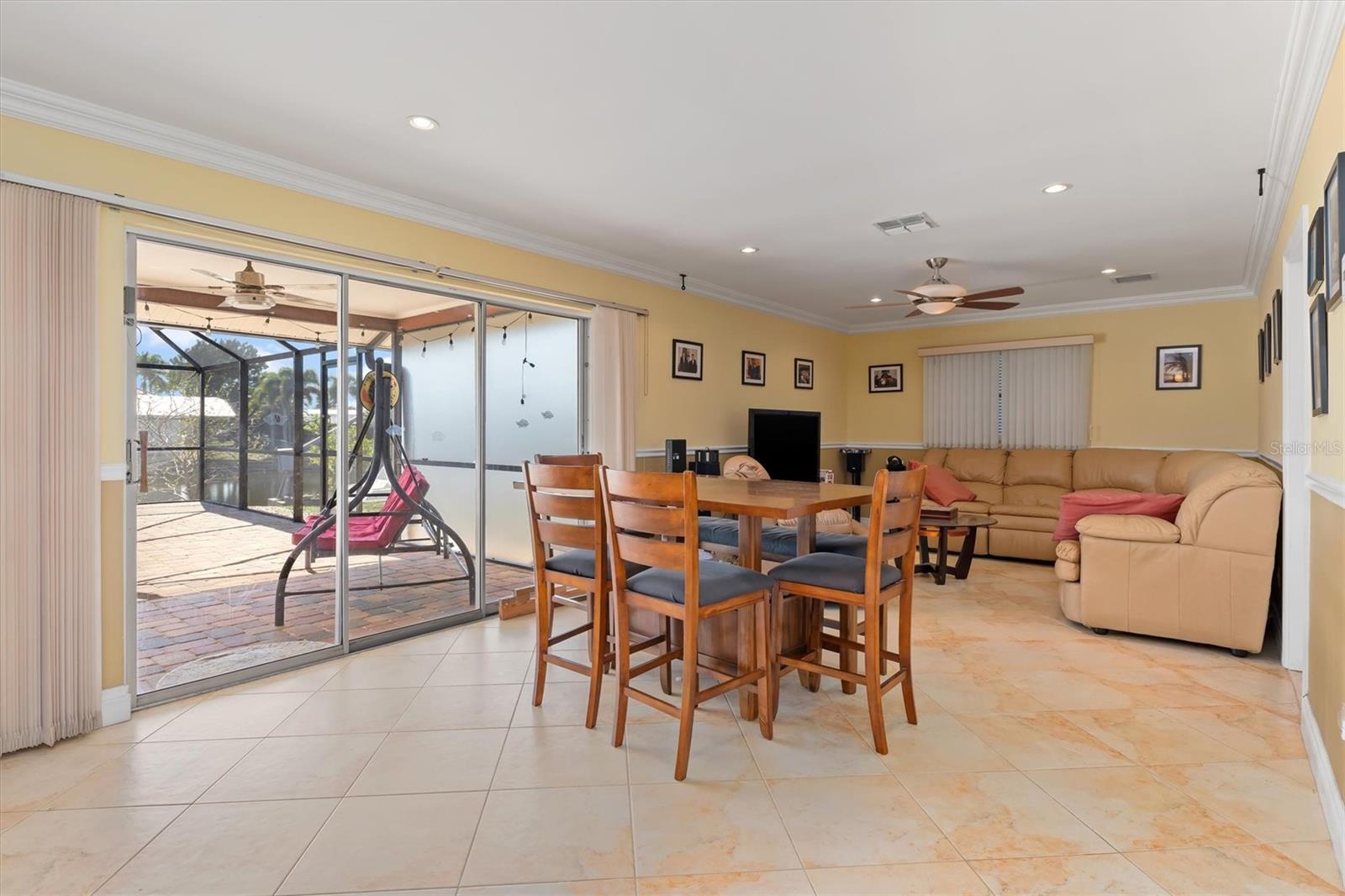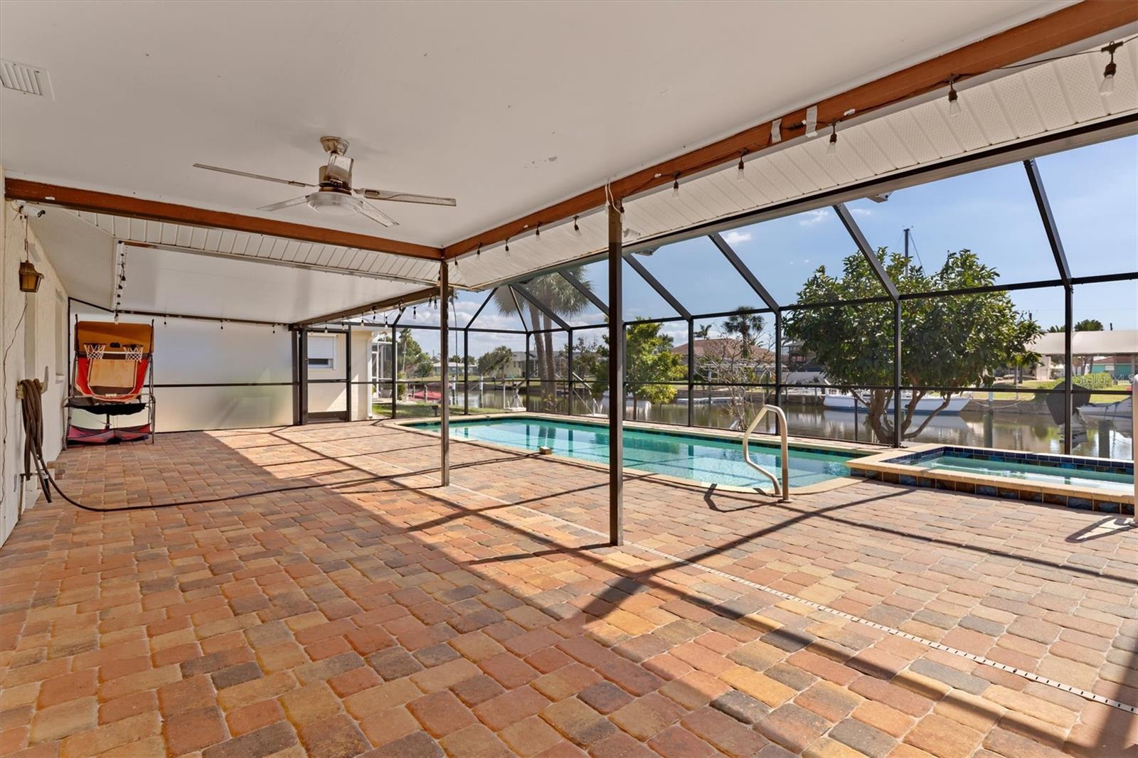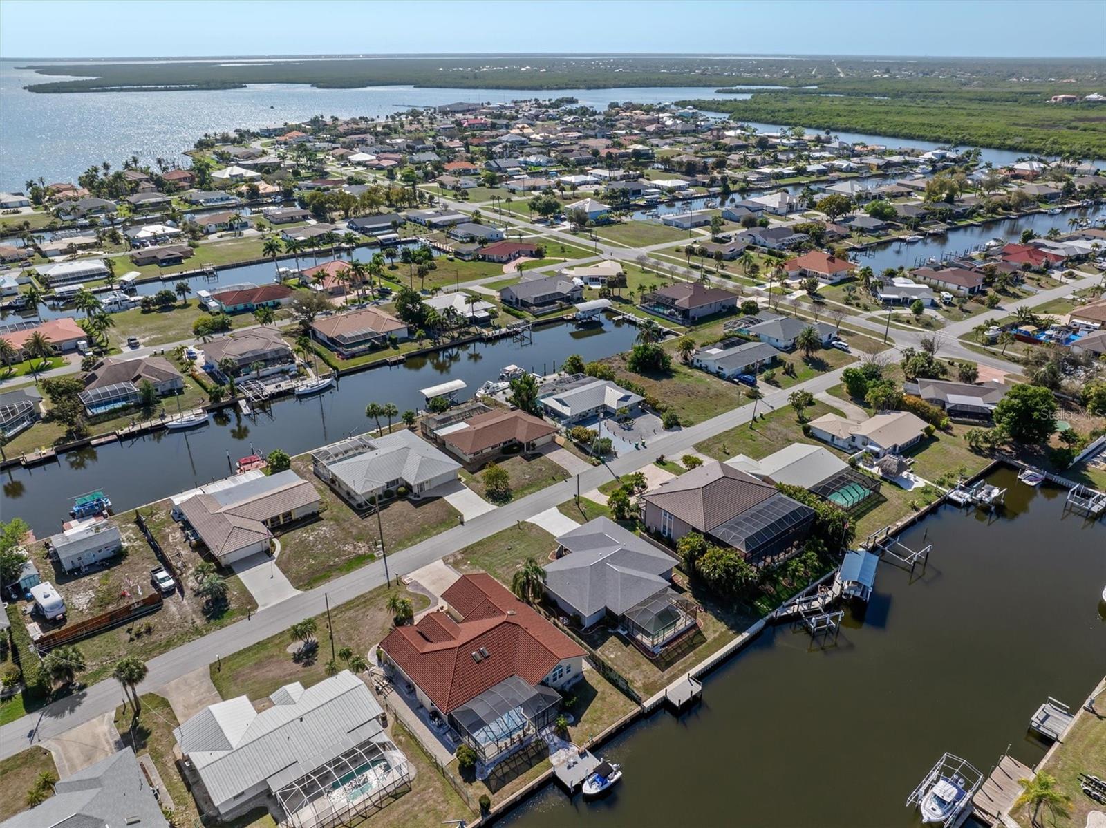 SAILBOAT ACCESS! TURNKEY! FULLY FURNISHED AND READY FOR YOU! Move right into this 3 bedroom, 2 bath, 2 car garage sailboat waterfront pool and spa home with 80 feet of concrete seawall, dock, and a new 10,000 LB covered boat lift. Located within walking distance to the Port Charlotte Beach Complex, this property offers the ultimate Florida waterfront lifestyle. If you enjoy boating, fishing, biking, kayaking, relaxing by the pool and spa, and hosting cookouts, this home delivers it all. The location truly stands out with immediate access to Charlotte Harbor and the Gulf of Mexico, making it easy to get out on the water anytime you want. Important updates bring peace of mind and modern comfort. The home features a NEW Rheem A/C (3 years), NEW roof (3 years), and NEW hot water heater (3 years). The kitchen includes a NEW refrigerator with a picture door display (3 years). The washer is 4 years old and the dryer is NEW. The pool system has a newer $3,000 pump, and the lanai and screening have also been updated. Hurricane protection is in place with impact windows in the front and hurricane shutters throughout the home. Inside, the floor plan offers plenty of room to spread out and enjoy daily life. The kitchen opens directly to the living room and family room, with a dining area located right off the kitchen for easy meals and gatherings. A large granite wrap-around breakfast bar creates the perfect spot for casual dining and entertaining. The kitchen features wood cabinetry with crown molding, granite countertops, and a matching granite backsplash that adds a clean and polished look. Attention to detail is found throughout the home. Crown molding runs through the entire house, including the bathrooms, and chair molding accents the main living areas. All bedrooms are spacious and offer great closet space with mirrored doors and ceiling fans for comfort. The main bedroom includes an additional linen closet along with the main closet for extra storage. Both bathrooms have been nicely updated with granite counters, wood cabinets, tiled walls, and modern glass doors. The main bathroom features a walk-in shower and also serves as a convenient pool bath with direct access to the pool and spa. The guest bath includes a tub and shower combination. Step outside and enjoy the huge covered brick paver lanai and pool patio measuring 12 x 49. The lanai covering is brand new and provides a large shaded area for relaxing, grilling, and enjoying the Florida sunshine. With sailboat water access, a private dock, pool, spa, and beautiful outdoor living space, this waterfront home truly has everything needed to enjoy sunny Florida living all year long!