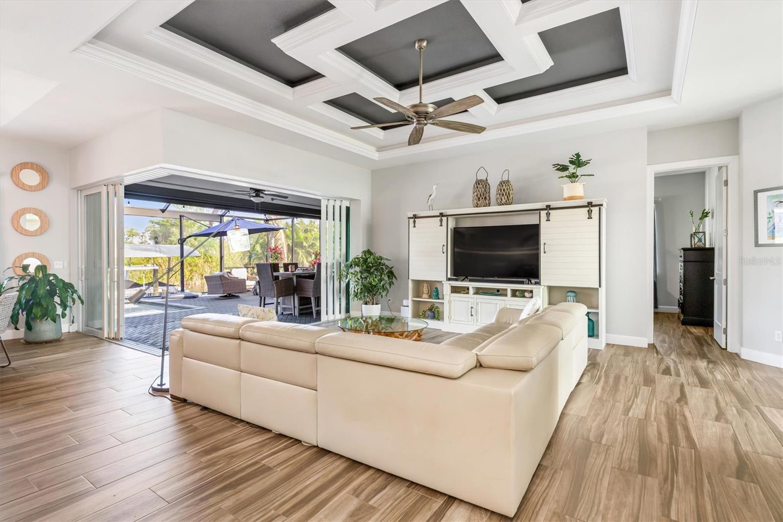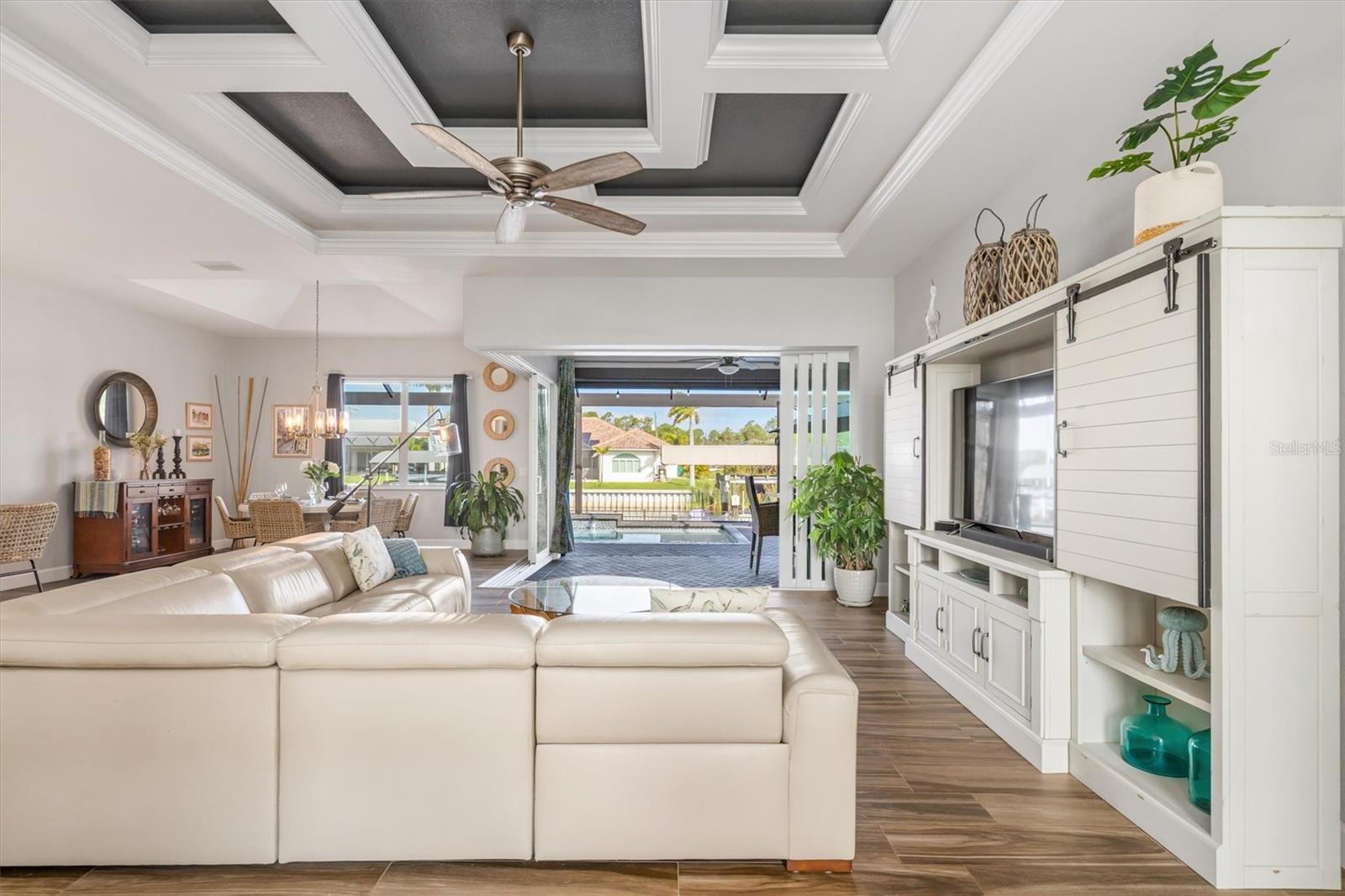 SIZE DOES MATTER! Get ready to fall in love with this amazing 2,443 SF waterfront home in the highly sought-after South Gulf Cove boating community, featuring 3 large bedrooms, 2 full bathrooms and office. A metal roof, Bahama shutters and automatic roll down shutters will give you convenience and peace of mind year-round. The kitchen is equipped with quartz countertops, double-stack cabinetry, a huge hidden pantry, and SS appliances. The open concept living area features a beautiful, coffered ceiling and zero-degree pocket sliders. The spacious owner’s suite has direct lanai access and split walk-in closets. The master bath features a spa-like wet room design with a 3-head shower and freestanding tub enclosed behind sleek glass barn doors. Each of the large guest rooms has a walk-in closet. The full guest bath also acts as a convenient pool bath when entertaining. The laundry room is thoughtfully designed with a storage closet, utility sink, and additional cabinetry. The heated saltwater pool is surrounded by a generous paver lanai. There is a built-in outdoor kitchen and plenty of room for seating. Beyond the lanai is an irrigated and fully fenced St Augustine back yard that leads to the canal. There you will find a 30' dock, a 10K LB boat lift with canopy, newly wrapped pilings, an 80 ft. concrete seawall, and electric and water lines. The oversized three-car garage gives you plenty of space for vehicles, tools, toys, and storage. The garage also includes overhead storage, and the home is equipped with 50-amp power for generators. Beautifully maintained and full of sunny Florida charm, this move-in-ready home is also close to pristine beaches, world-class fishing, championship golf courses, wonderful restaurants, and great shopping. This beauty won’t last long—call me today for a private showing!