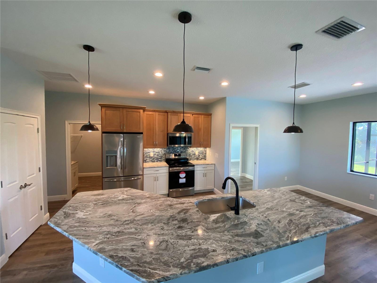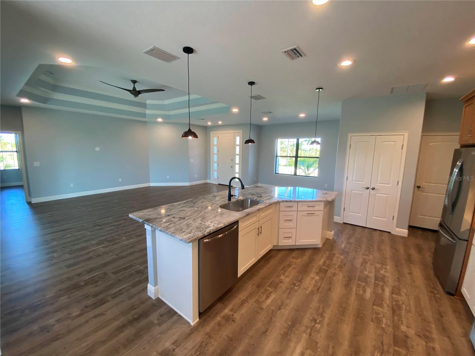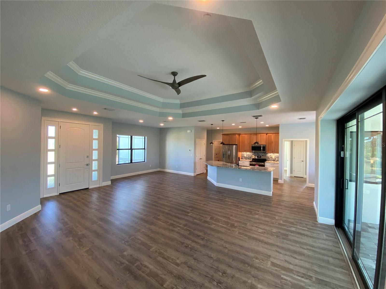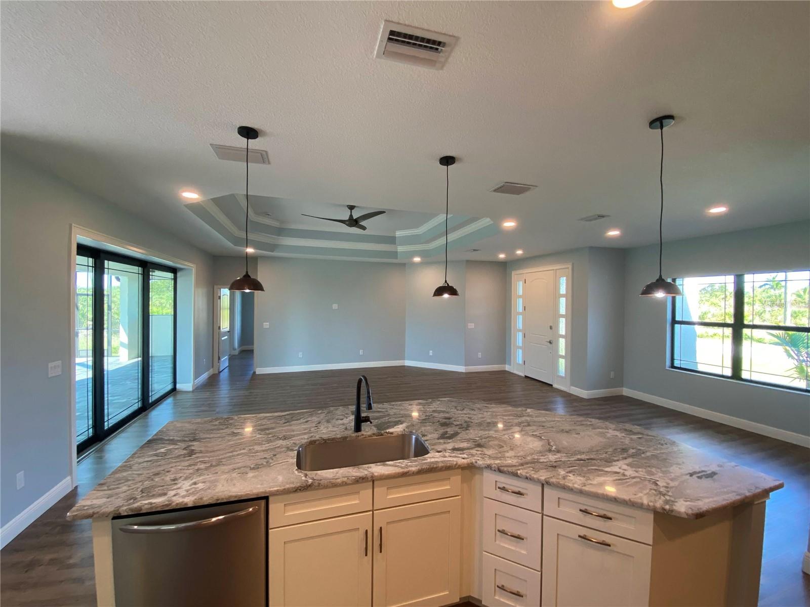 This NEW CONSTRUCTION custom home by Southwest Florida Dream Builders is ready to be yours. Situated on an oversized corner lot of almost 15,000 SQFT is a rare find of almost 50% bigger than a traditional 80x125 parcel. With so much extra yard space to utilize, the possibilities are endless. This home is PACKED with high end amenities such as beautiful granite countertops, maple wood cabinets, luxury vinyl plank floors, and prairie grid hurricane impact glass throughout the whole house. From the moment you walk in you are greeted with a STUNNING view to your deck area through 8ft tall disappearing sliders in this open floor plan design. An oversized island and breakfast bar provides the perfect space to prepare meals and entertain. The dining room is separate from the nook/sitting area; which is situated off the kitchen and framed by a large aquarium window to the pool area. The master bedroom features yet another way to access the lanai out of 8 ft tall french doors with internalized blinds. Dual sinks in the master bath and a large walk in shower. Enjoy the Florida lifestyle on your covered paver lanai with a grilling pass-through for optimum airflow or soak up the sun in a 12x28 saltwater pool which has a raised sun shelf, waterfall feature, all surrounded by a large paver deck. The yard has irrigation installed so keeping your grass in tip-top shape during the dry season is a breeze. The 3rd car garage is a must have for anyone needing additional storage space or an out of the way area for extra cars or recreational vehicles. South Gulf Cove is a highly sought after neighborhood with parks, boat ramps, kayak launches, fishing, and fitness/nature trails. Secure your piece of paradise today!