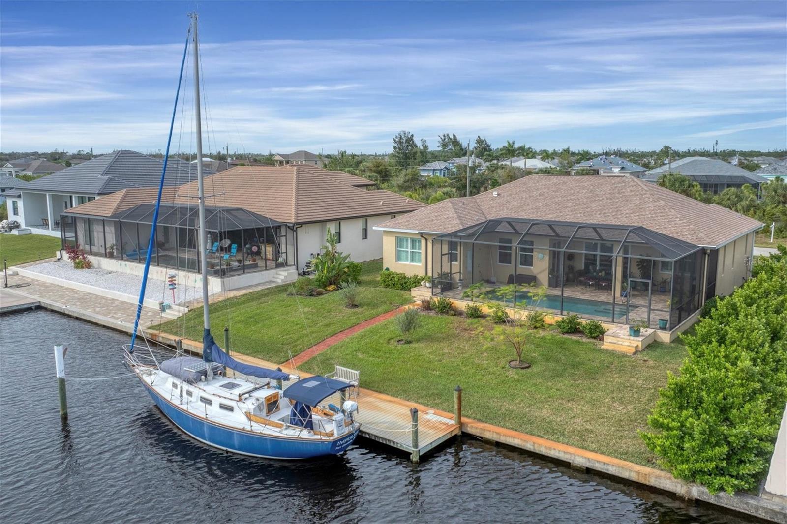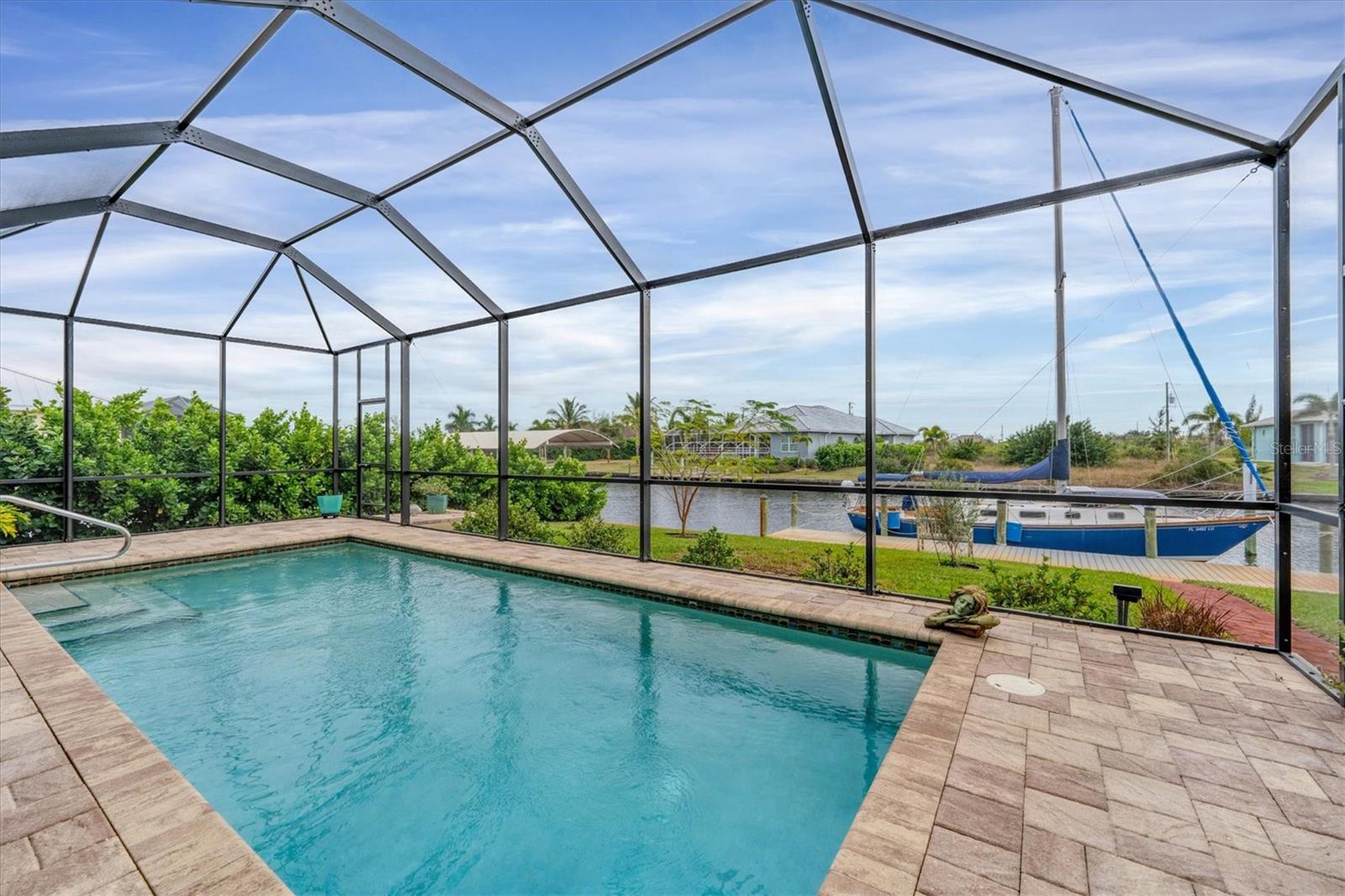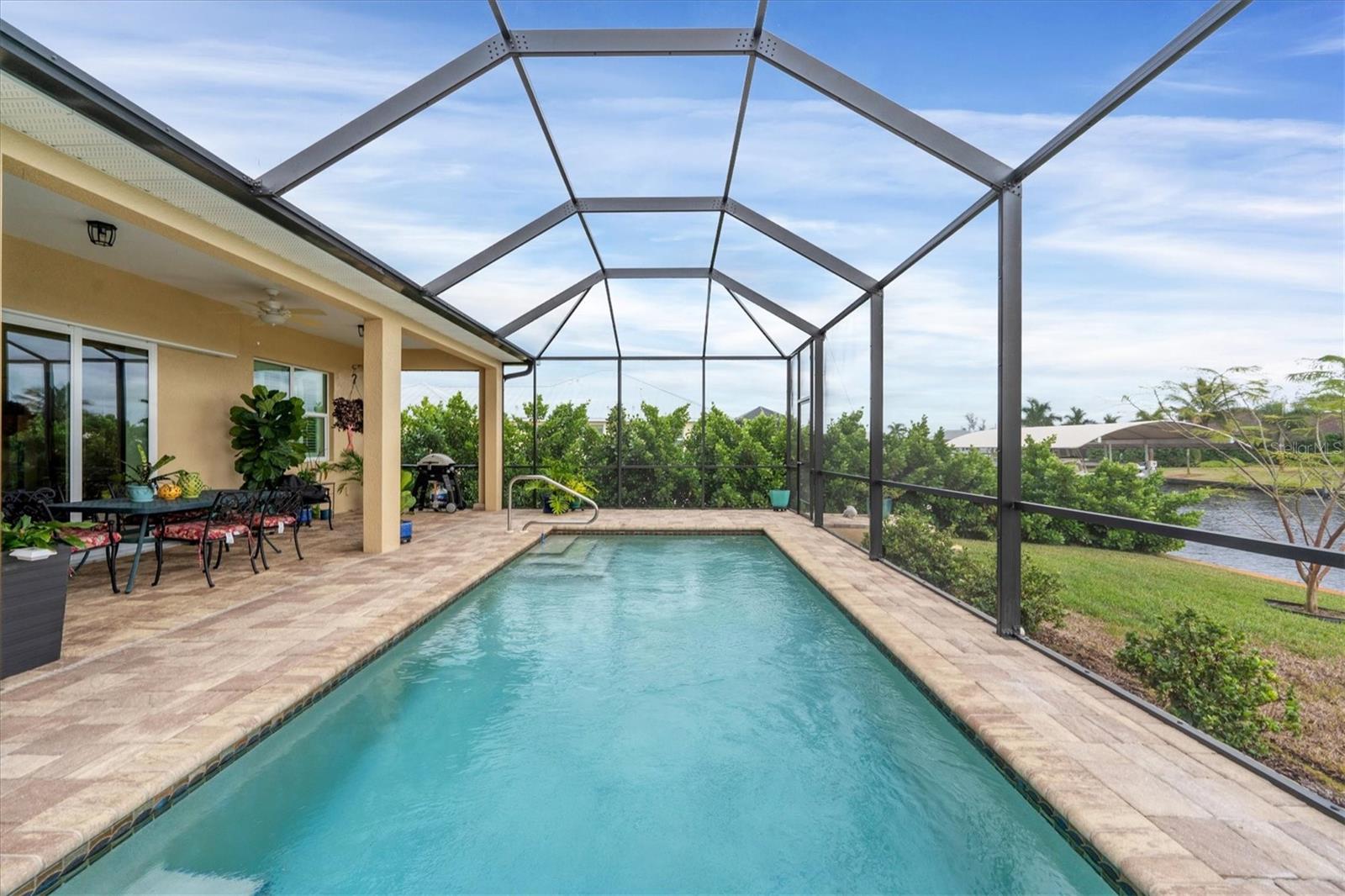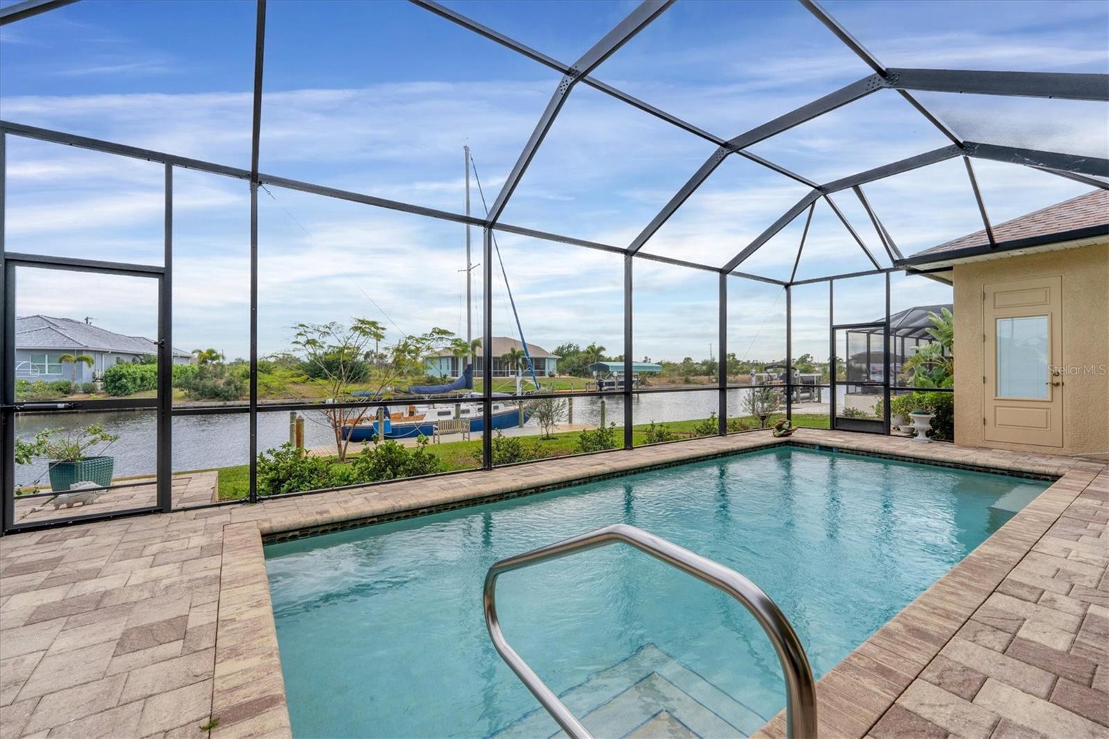 NEW PRICE ADJUSTMENT.... SAILBOAT WATER with a DOCK. Lovely and spacious 3 bedroom, 2 bath in ground pool home built on a canal with deep water and no fixed bridges to open water (Charlotte Harbor, ICW & Gulf of Mexico).This home features a large screened in lanai where you can relax by your pool overlooking the canal after a great day of sailing or fishing. Home is situated in the highly sought after section of South Gulf Cove located close to open water access with no bridges. The open floor plan & modern kitchen is perfect to entertain your guests. The oversized garage gives you plenty of room for storage. This custom-built home is located a short distance to several world class golf courses, beautiful beaches on the Gulf of Mexico and many excellent local neighborhood eateries. 3 major airports make travel to and from this location very convenient.