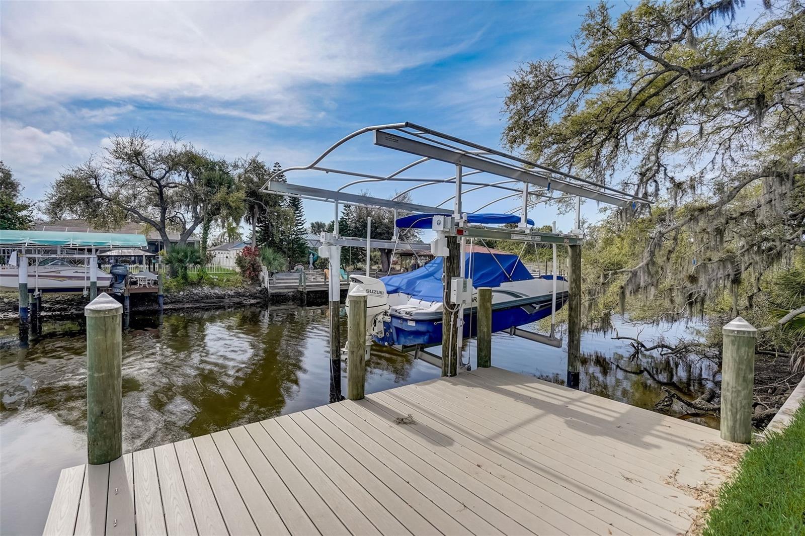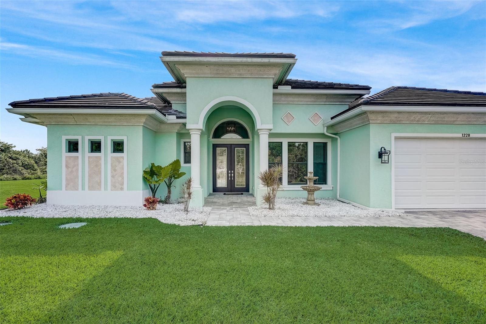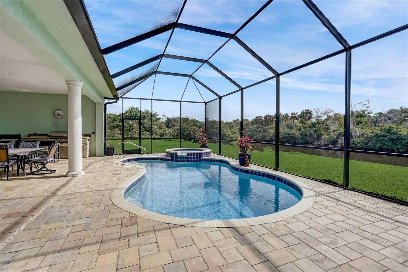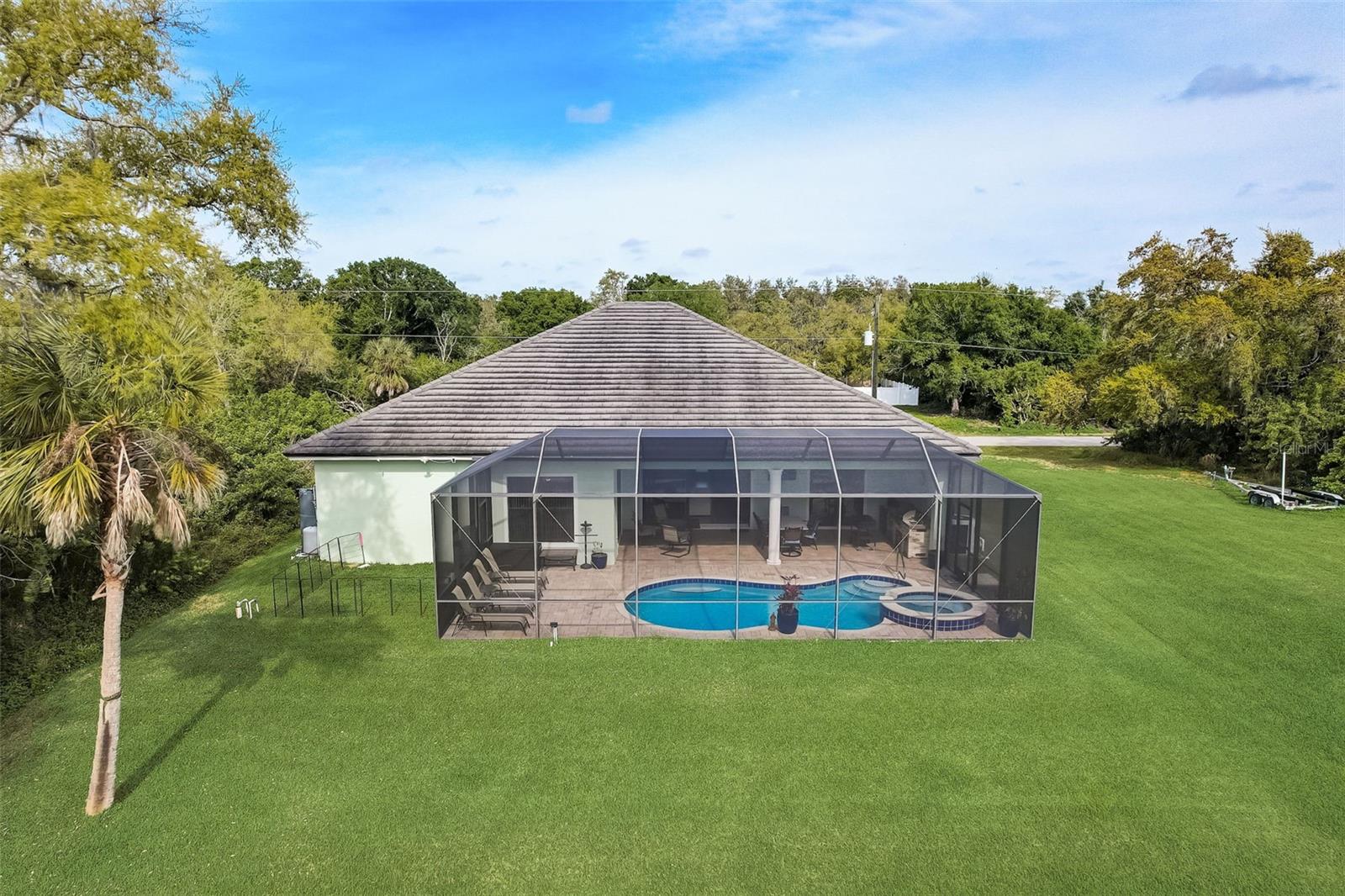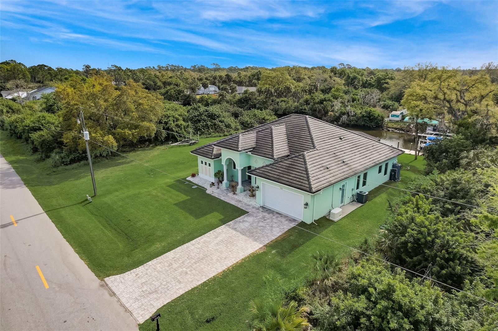 PICTURE PERFECT WATERFRONT POOL HOME ON DOUBLE LOT! 80' Seawall with composite dock & boatlift on The Jupiter Waterway. Enjoy a picturesque ride to the Myakka River, and continue onto Charlotte Harbor & The Gulf of Mexico. (only one bridge to go under) Custom Built Driftwood Model Home completed in 2017. Original owners with all documents and" BUILDERS SPECIFICATIONS" in the "ATTACHMENTS" along with the Model Floor plan with dimensions. This home exudes exceptional detail & craftsmanship through out, starting from the moment you drive up your brick paver driveway, pass under the grand portico, & walk in past the custom leaded designer double doors. Once inside you'll notice the soaring coffered ceilings, expansive view onto the lanai pool deck area, and the beautiful canal waterway. This open-concept floor plan show cases the gourmet chefs kitchen with center island, 42 inch staggered cabinets, pantry, 3 designer lighting pendants, granite counters, pot filler, drink/wine fridge, stainless appliances. Eat in breakfast bar, great room, dining room & flex space are easily accessible with this design. Throughout this home you'll notice the high end crown molding, recessed lighting, and ceiling fans. The primary bedroom retreat has an impressive tray ceiling, crown molding, ceiling fan, and double slider onto the lanai. Dual walk in closets featuring ventilated wood shelving and bonus shelf granting more storage. A spa like en-suite with roman shower with dual heads, custom tile, dual split vanities with granite tops, separate water closet, and extra large linen closet. The flex/study room is currently being used as a home office, tray ceiling, crown molding, ceiling fan & wood plank style flooring. Split floor plan with 2 guest bedrooms, designed tastefully with privacy & comfort, along with a well appointed bathroom. The dining room is currently being used as an entertainment area for pool & ping pong. Leave this up to your imagination with the amazing views to the outside lanai / pool deck. The expansive outdoor living space is designed for relaxation & entertaining. Boasting over 400 Square Feet of covered brick paver area (14'x31') featuring the custom stone stacked chefs outdoor kitchen, it comes fully equipped with a stainless steel "BULL" BBQ grill/rotisserie, refrigerator, sink, concealed propane tanks and prep area. Spacious brick paver lanai oasis, welcoming you into the heated salt water pool /spa with a tranquil waterfall feature, along with soft evening lighting. This entire pool cage is upgraded with No see um screening. The laundry room/utility area is upgraded with 42 inch cabinets, sink with granite counter, frontload washer & dryer. Epoxy coating garage floor, overhead storage, tank less hot water heater, Viega Manabloc plumbing, whole house surge protector. All windows & doors PGT WinGuard impact resistant tinted glass. Impressive whole house 22K "GENERAC" Generator, with a 500 gallon propane tank underground, regularly maintained and serviced. Whole house "KINETICO" reverse osmosis system with a 300 gallon tank. TEAXX pest defense tubes in the walls provided by Hometeam Pest Defense. Irrigation system with timer & rain sensor. Roof material is "cement tile" impressively resistant to weather, pest, and fire. Roof deck area spray foam insulation, rain gutters, home is wired for security system, wired for surround sound 5.1 underground utilities. Perfect location to the Best Beaches & Recreation!!