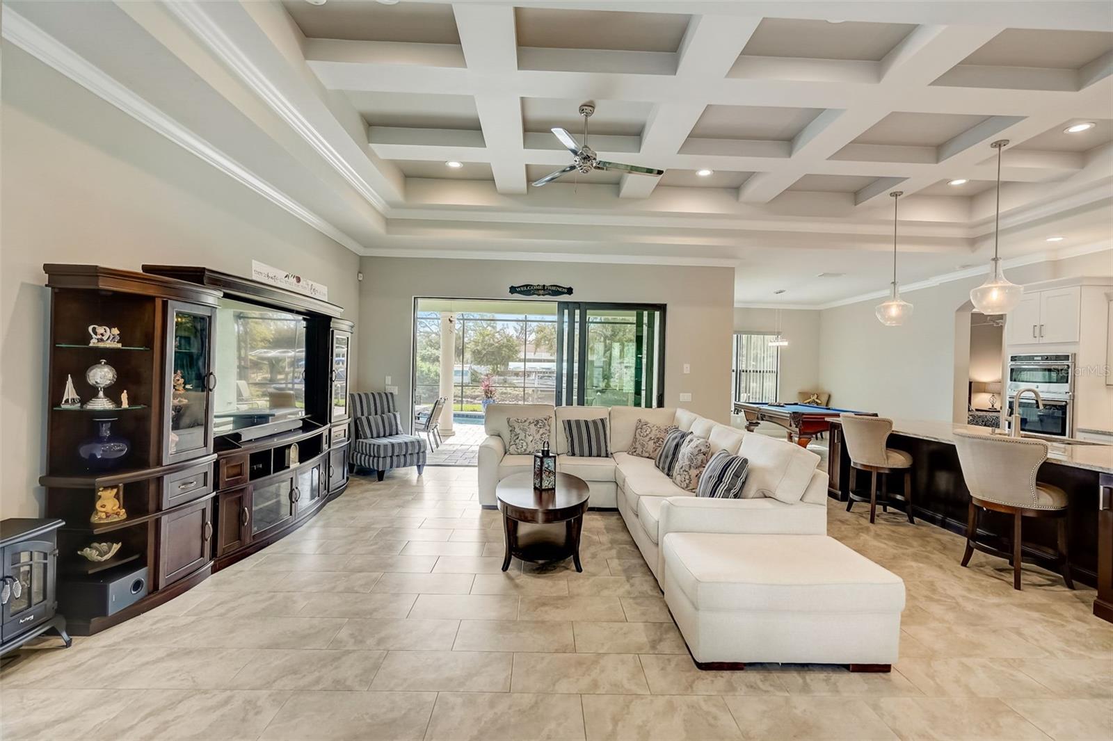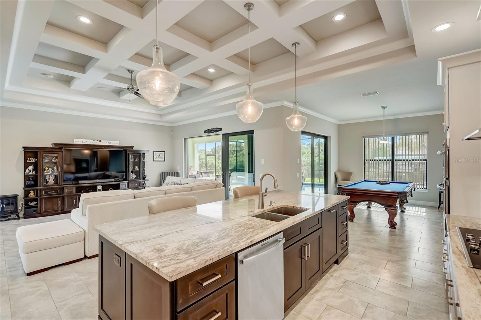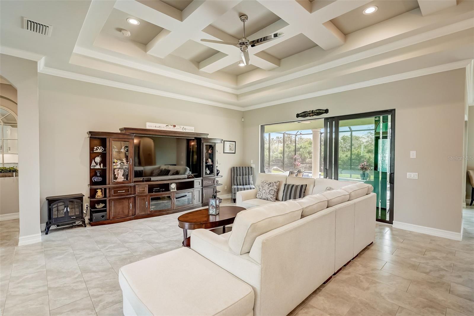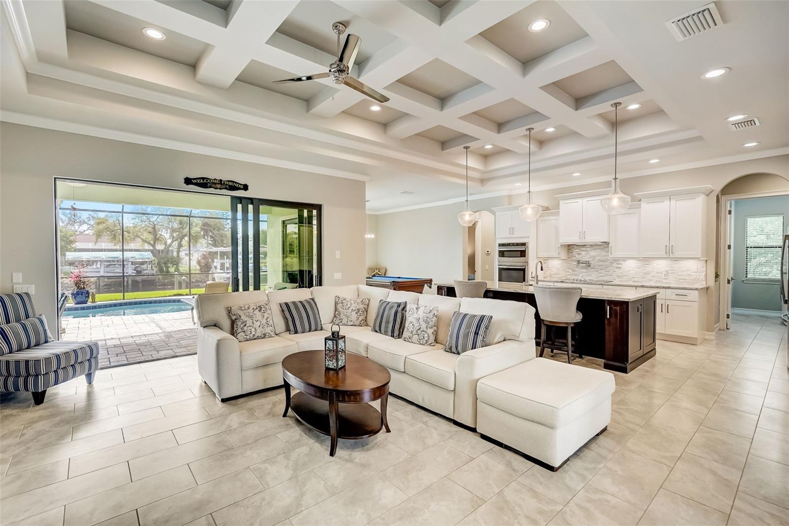 PICTURE PERFECT WATERFRONT POOL HOME ON DOUBLE LOT! 80' Seawall with composite dock & boatlift on The Jupiter Waterway. Enjoy a picturesque ride to the Myakka River, and continue onto Charlotte Harbor & The Gulf of Mexico. (only one bridge to go under) Custom Built Driftwood Model Home completed in 2017. Original owners with all documents and" BUILDERS SPECIFICATIONS" in the "ATTACHMENTS" along with the Model Floor plan with dimensions. This home exudes exceptional detail & craftsmanship through out, starting from the moment you drive up your brick paver driveway, pass under the grand portico, & walk in past the custom leaded designer double doors. Once inside you'll notice the soaring coffered ceilings, expansive view onto the lanai pool deck area, and the beautiful canal waterway. This open-concept floor plan show cases the gourmet chefs kitchen with center island, 42 inch staggered cabinets, pantry, 3 designer lighting pendants, granite counters, pot filler, drink/wine fridge, stainless appliances. Eat in breakfast bar, great room, dining room & flex space are easily accessible with this design. Throughout this home you'll notice the high end crown molding, recessed lighting, and ceiling fans. The primary bedroom retreat has an impressive tray ceiling, crown molding, ceiling fan, and double slider onto the lanai. Dual walk in closets featuring ventilated wood shelving and bonus shelf granting more storage. A spa like en-suite with roman shower with dual heads, custom tile, dual split vanities with granite tops, separate water closet, and extra large linen closet. The flex/study room is currently being used as a home office, tray ceiling, crown molding, ceiling fan & wood plank style flooring. Split floor plan with 2 guest bedrooms, designed tastefully with privacy & comfort, along with a well appointed bathroom. The dining room is currently being used as an entertainment area for pool & ping pong. Leave this up to your imagination with the amazing views to the outside lanai / pool deck. The expansive outdoor living space is designed for relaxation & entertaining. Boasting over 400 Square Feet of covered brick paver area (14'x31') featuring the custom stone stacked chefs outdoor kitchen, it comes fully equipped with a stainless steel "BULL" BBQ grill/rotisserie, refrigerator, sink, concealed propane tanks and prep area. Spacious brick paver lanai oasis, welcoming you into the heated salt water pool /spa with a tranquil waterfall feature, along with soft evening lighting. This entire pool cage is upgraded with No see um screening. The laundry room/utility area is upgraded with 42 inch cabinets, sink with granite counter, frontload washer & dryer. Epoxy coating garage floor, overhead storage, tank less hot water heater, Viega Manabloc plumbing, whole house surge protector. All windows & doors PGT WinGuard impact resistant tinted glass. Impressive whole house 22K "GENERAC" Generator, with a 500 gallon propane tank underground, regularly maintained and serviced. Whole house "KINETICO" reverse osmosis system with a 300 gallon tank. TEAXX pest defense tubes in the walls provided by Hometeam Pest Defense. Irrigation system with timer & rain sensor. Roof material is "cement tile" impressively resistant to weather, pest, and fire. Roof deck area spray foam insulation, rain gutters, home is wired for security system, wired for surround sound 5.1 underground utilities. Perfect location to the Best Beaches & Recreation!!
