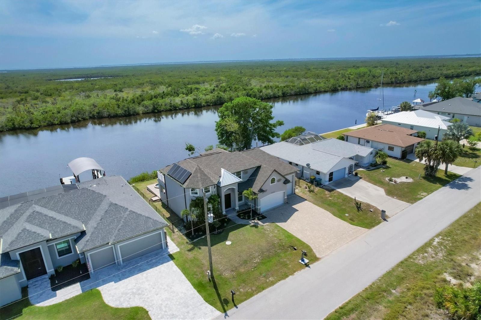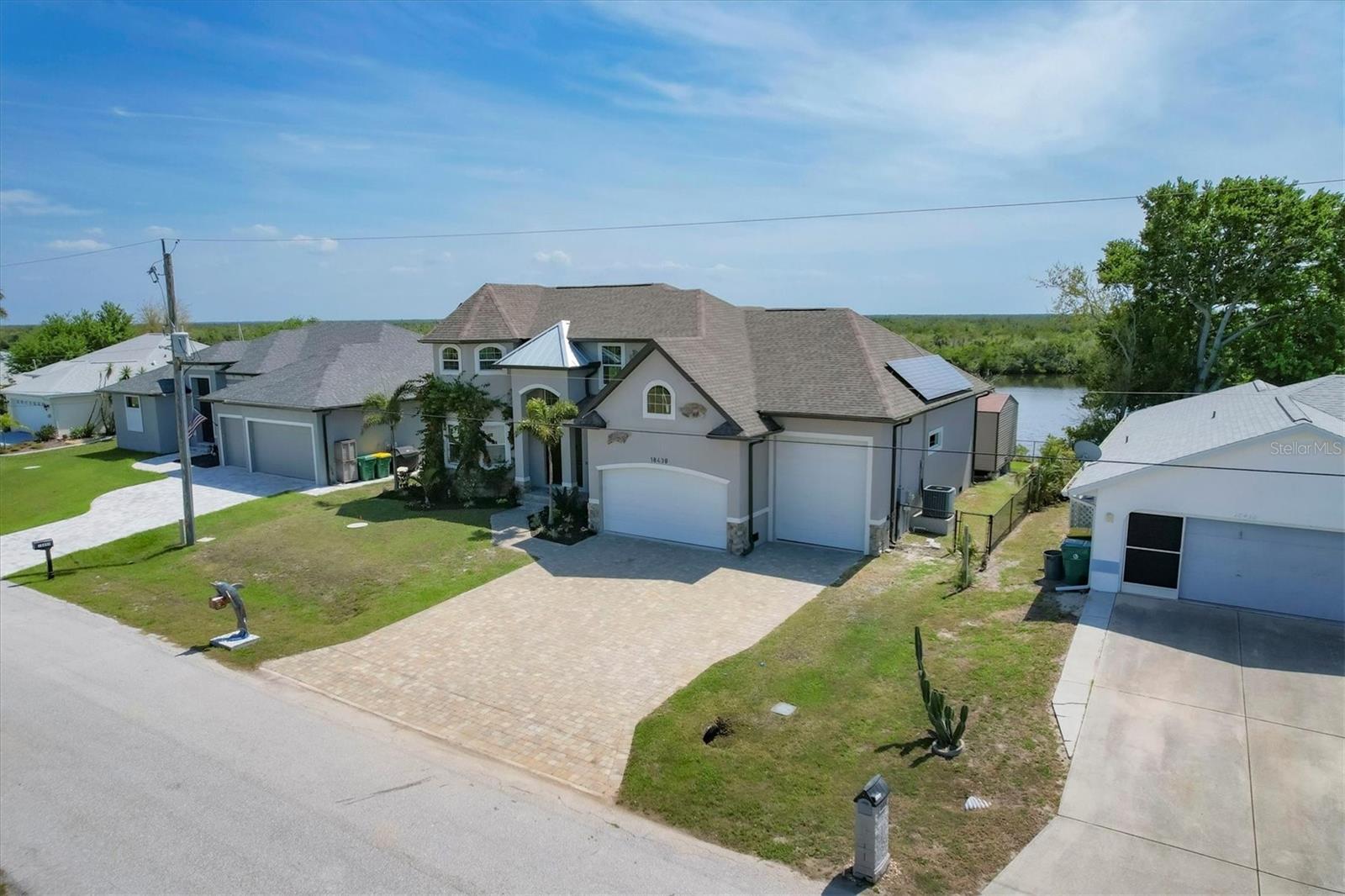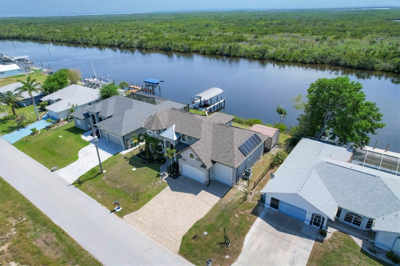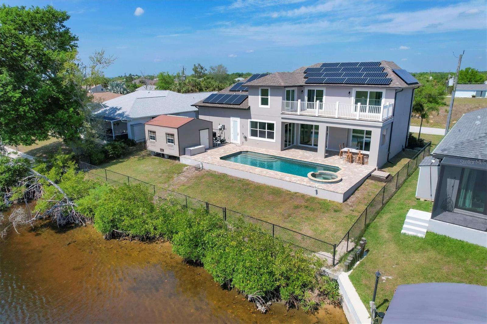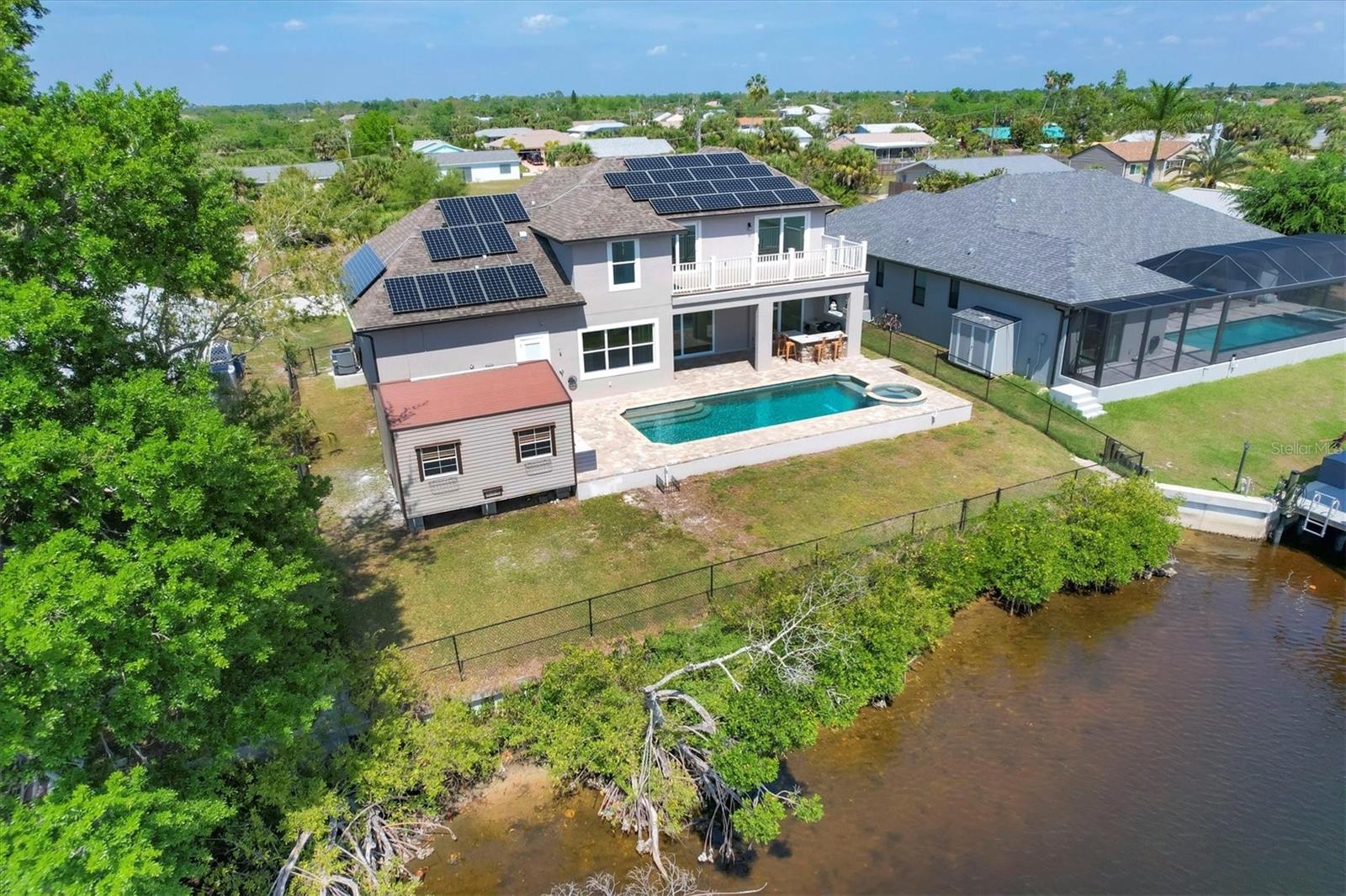 Welcome to waterfront luxury living at its finest! This custom 5-bedroom, 3-1/2-bathroom haven boasts 80 feet of frontage on the serene Manchester Waterway, offering breathtaking wide water views and coveted southern rear exposure. Sailboat access to Charlotte Harbor ensures endless opportunities for aquatic adventures right from your doorstep. Impeccably renovated after Hurricane Ian, this home exudes modern elegance and comfort. A 2023 roof, new drywall, porcelain tile, all new gorgeous lighting and fans and carpet throughout set the stage for a fresh, inviting ambiance. Step into the heart of the home, where a brand-new kitchen awaits with sleek granite counters, a stunning glass tile backsplash, and black stainless-steel appliances including two ovens, one of which is convection. The large island with breakfast bar, walk-in closet pantry, and exquisite details like pot filler for the stove showcase the meticulous attention to detail. The living room offers an electric fireplace with built-in space for a 75" TV and amazing views over the pool and beyond to the canal. The first floor features bedrooms sharing a convenient Jack and Jill bathroom, while a beautiful open staircase leads to the master suite and additional bedrooms. The expansive master suite is a sanctuary unto itself, boasting a large balcony, two walk-in closets, and a spa-like master bath with an extraordinary master shower featuring dual control shower heads with an additional rain head and double glass sinks. Other bedrooms share a spacious guest bath with tub/shower combo and access to a sizable storage area. Entertain in style outdoors on the brick paver lanai, where a heated saltwater pool and spa beckon for relaxation. An outdoor kitchen and shower add convenience and luxury to your al fresco gatherings. Plus, a 13 x 15 insulated shed with A/C offers versatile bonus space for hobbies or storage. This home is not just beautiful—it's built to withstand the elements with hurricane impact windows and 14.8kw solar system for energy efficiency. With an attached two-car garage and an additional RV garage with a 12-foot door, there's ample space for all your vehicles and toys. The fenced backyard ensures privacy and security in your own slice of paradise. Don't miss your chance to experience waterfront living at its finest in this meticulously crafted retreat!