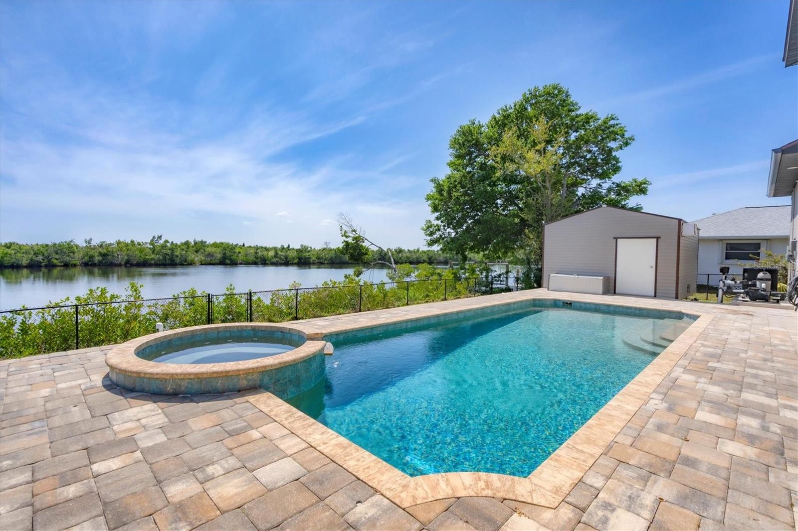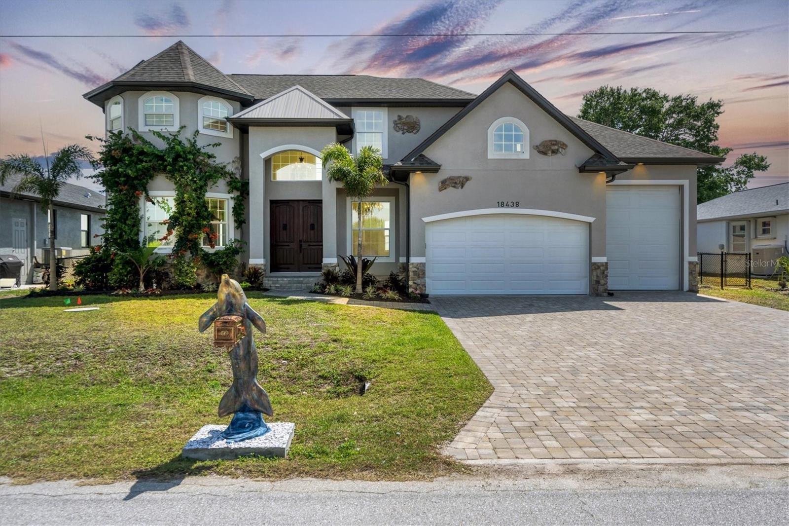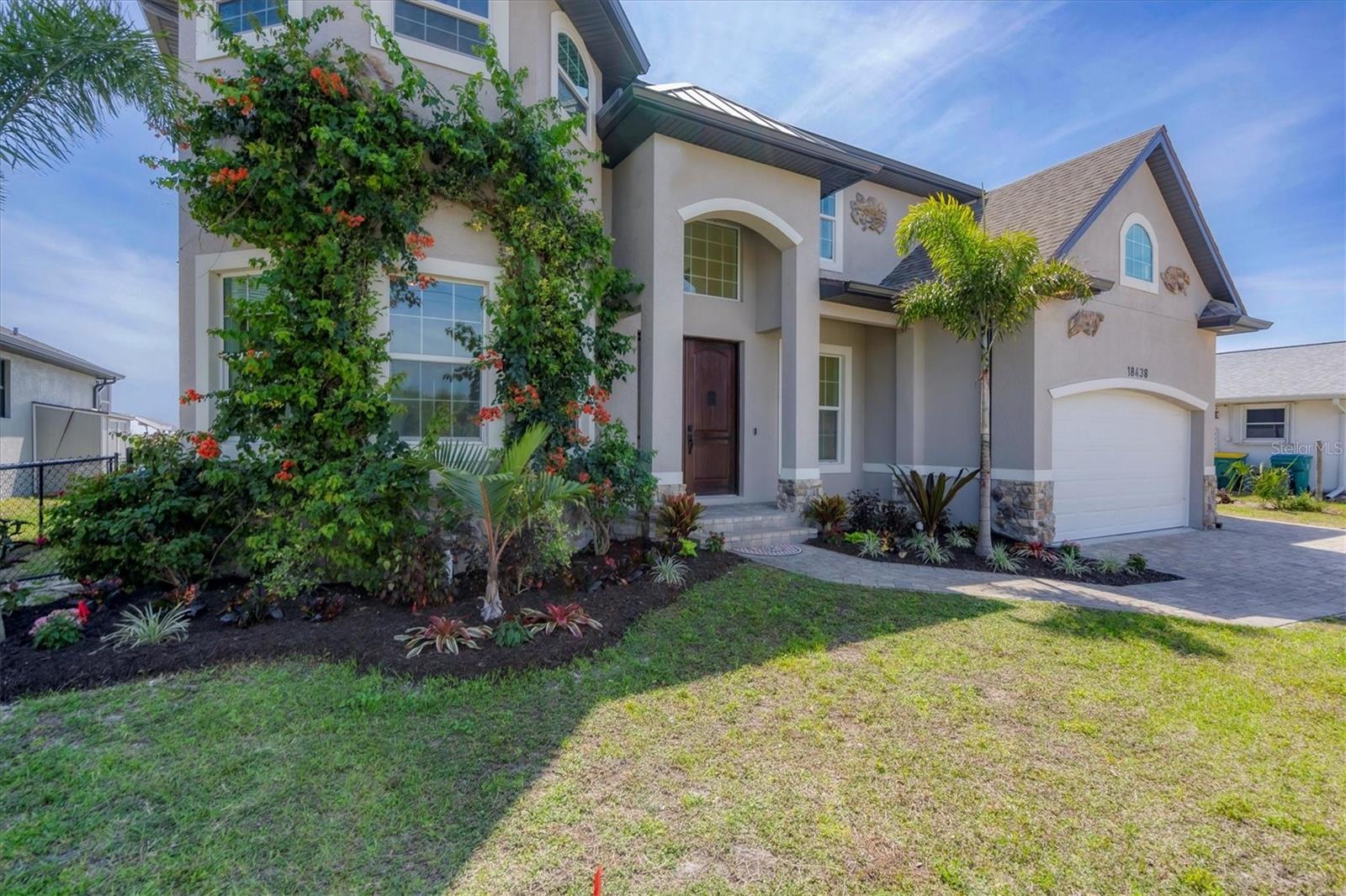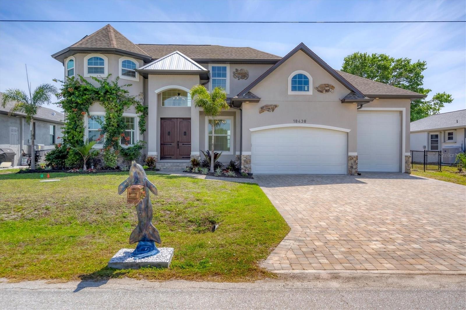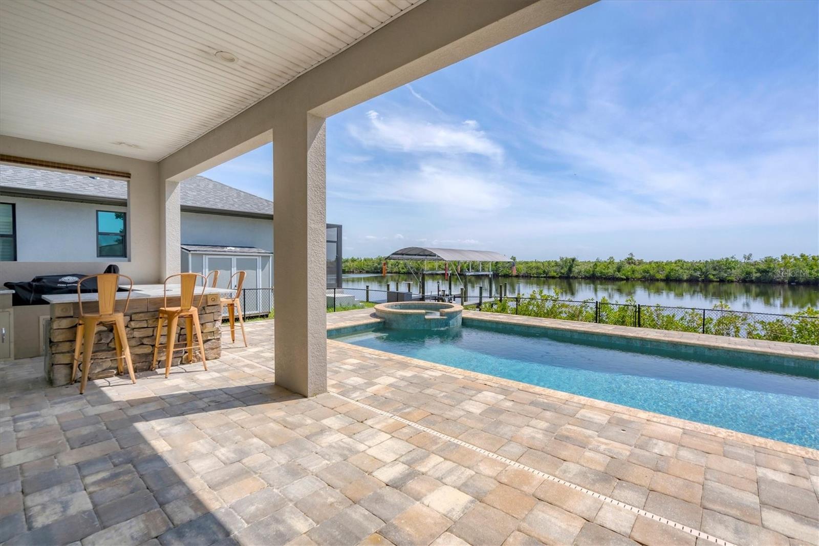 Welcome to waterfront luxury living at its finest! This custom 5-bedroom, 3-1/2-bathroom haven boasts 80 feet of frontage on the serene Manchester Waterway, offering breathtaking wide water views and coveted southern rear exposure. Sailboat access to Charlotte Harbor ensures endless opportunities for aquatic adventures right from your doorstep. Impeccably renovated after Hurricane Ian, this home exudes modern elegance and comfort. A 2023 roof, new drywall, porcelain tile, all new gorgeous lighting and fans and carpet throughout set the stage for a fresh, inviting ambiance. Step into the heart of the home, where a brand-new kitchen awaits with sleek granite counters, a stunning glass tile backsplash, and black stainless-steel appliances including two ovens, one of which is convection. The large island with breakfast bar, walk-in closet pantry, and exquisite details like pot filler for the stove showcase the meticulous attention to detail. The living room offers an electric fireplace with built-in space for a 75" TV and amazing views over the pool and beyond to the canal. The first floor features bedrooms sharing a convenient Jack and Jill bathroom, while a beautiful open staircase leads to the master suite and additional bedrooms. The expansive master suite is a sanctuary unto itself, boasting a large balcony, two walk-in closets, and a spa-like master bath with an extraordinary master shower featuring dual control shower heads with an additional rain head and double glass sinks. Other bedrooms share a spacious guest bath with tub/shower combo and access to a sizable storage area. Entertain in style outdoors on the brick paver lanai, where a heated saltwater pool and spa beckon for relaxation. An outdoor kitchen and shower add convenience and luxury to your al fresco gatherings. Plus, a 13 x 15 insulated shed with A/C offers versatile bonus space for hobbies or storage. This home is not just beautiful—it's built to withstand the elements with hurricane impact windows and 14.8kw solar system for energy efficiency. With an attached two-car garage and an additional RV garage with a 12-foot door, there's ample space for all your vehicles and toys. The fenced backyard ensures privacy and security in your own slice of paradise. Don't miss your chance to experience waterfront living at its finest in this meticulously crafted retreat!