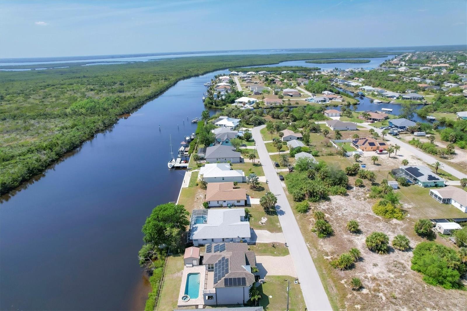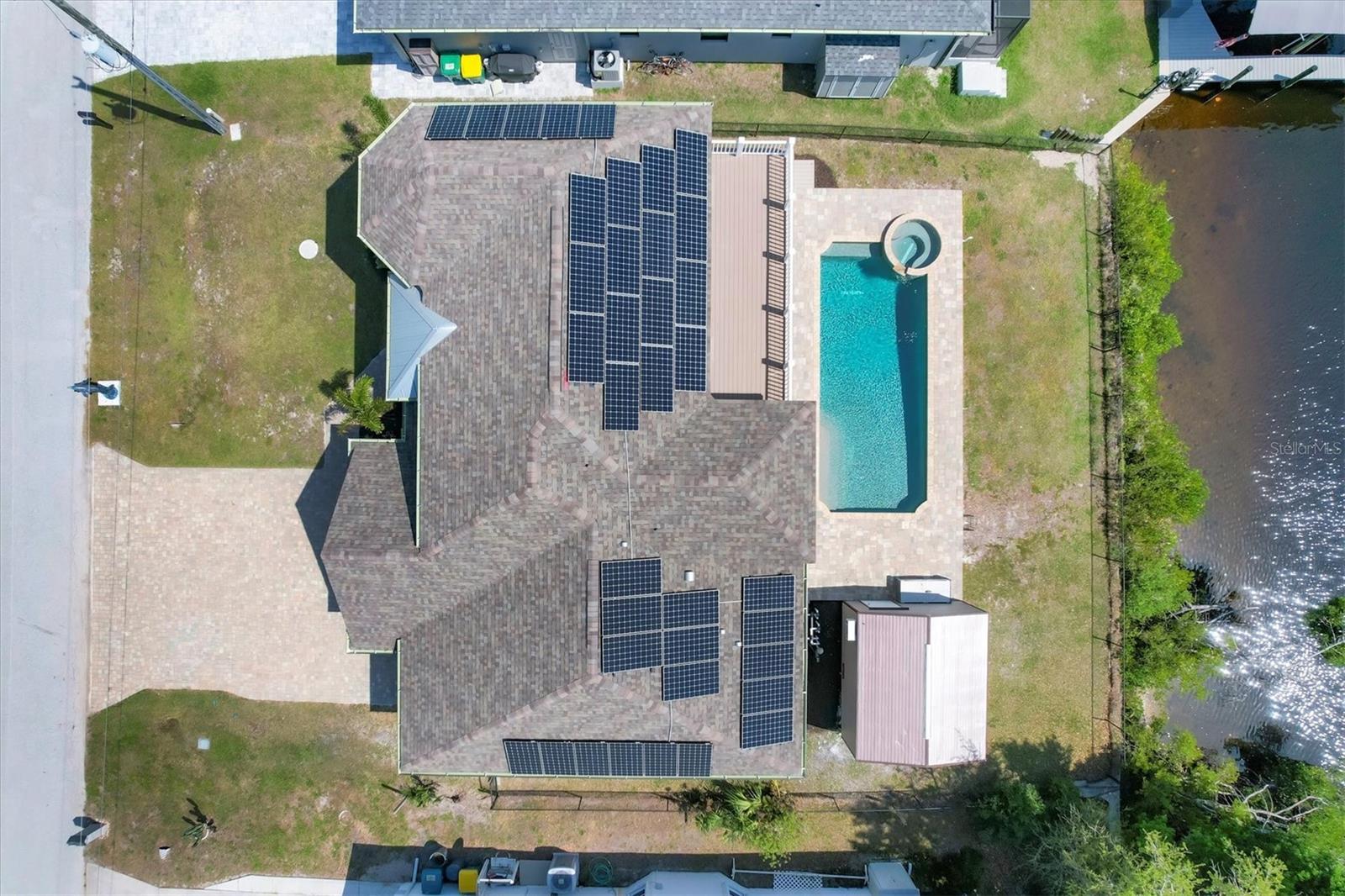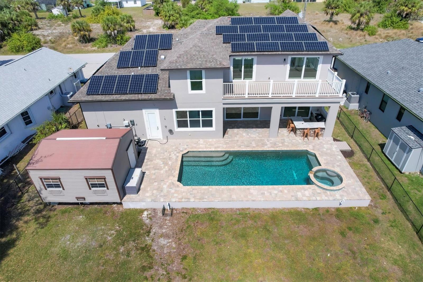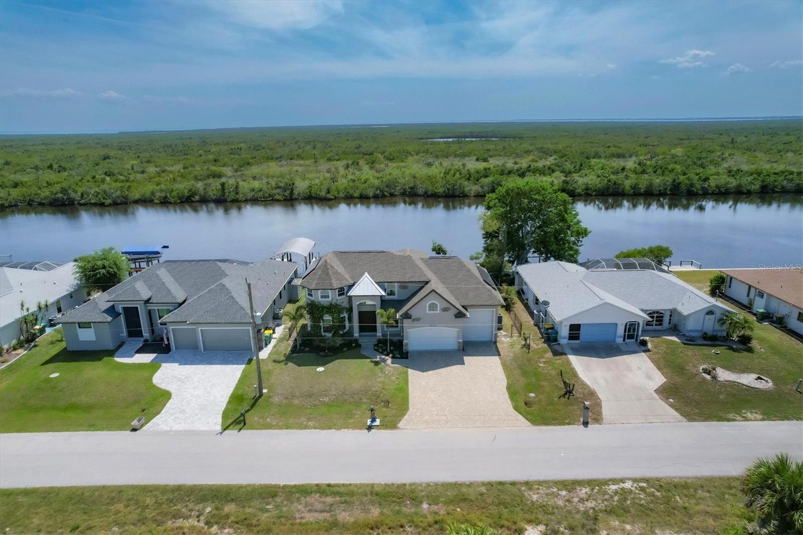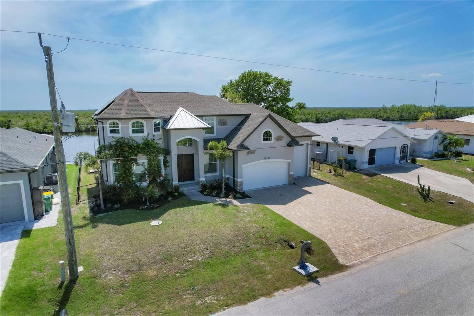Welcome to waterfront luxury living at its finest! This custom 5-bedroom, 3-1/2-bathroom haven boasts 80 feet of frontage on the serene Manchester Waterway, offering breathtaking wide water views and coveted southern rear exposure. Sailboat access to Charlotte Harbor ensures endless opportunities for aquatic adventures right from your doorstep. Impeccably renovated after Hurricane Ian, this home exudes modern elegance and comfort. A 2023 roof, new drywall, porcelain tile, all new gorgeous lighting and fans and carpet throughout set the stage for a fresh, inviting ambiance. Step into the heart of the home, where a brand-new kitchen awaits with sleek granite counters, a stunning glass tile backsplash, and black stainless-steel appliances including two ovens, one of which is convection. The large island with breakfast bar, walk-in closet pantry, and exquisite details like pot filler for the stove showcase the meticulous attention to detail. The living room offers an electric fireplace with built-in space for a 75" TV and amazing views over the pool and beyond to the canal. The first floor features bedrooms sharing a convenient Jack and Jill bathroom, while a beautiful open staircase leads to the master suite and additional bedrooms. The expansive master suite is a sanctuary unto itself, boasting a large balcony, two walk-in closets, and a spa-like master bath with an extraordinary master shower featuring dual control shower heads with an additional rain head and double glass sinks. Other bedrooms share a spacious guest bath with tub/shower combo and access to a sizable storage area. Entertain in style outdoors on the brick paver lanai, where a heated saltwater pool and spa beckon for relaxation. An outdoor kitchen and shower add convenience and luxury to your al fresco gatherings. Plus, a 13 x 15 insulated shed with A/C offers versatile bonus space for hobbies or storage. This home is not just beautiful—it's built to withstand the elements with hurricane impact windows and 14.8kw solar system for energy efficiency. With an attached two-car garage and an additional RV garage with a 12-foot door, there's ample space for all your vehicles and toys. The fenced backyard ensures privacy and security in your own slice of paradise. Don't miss your chance to experience waterfront living at its finest in this meticulously crafted retreat!