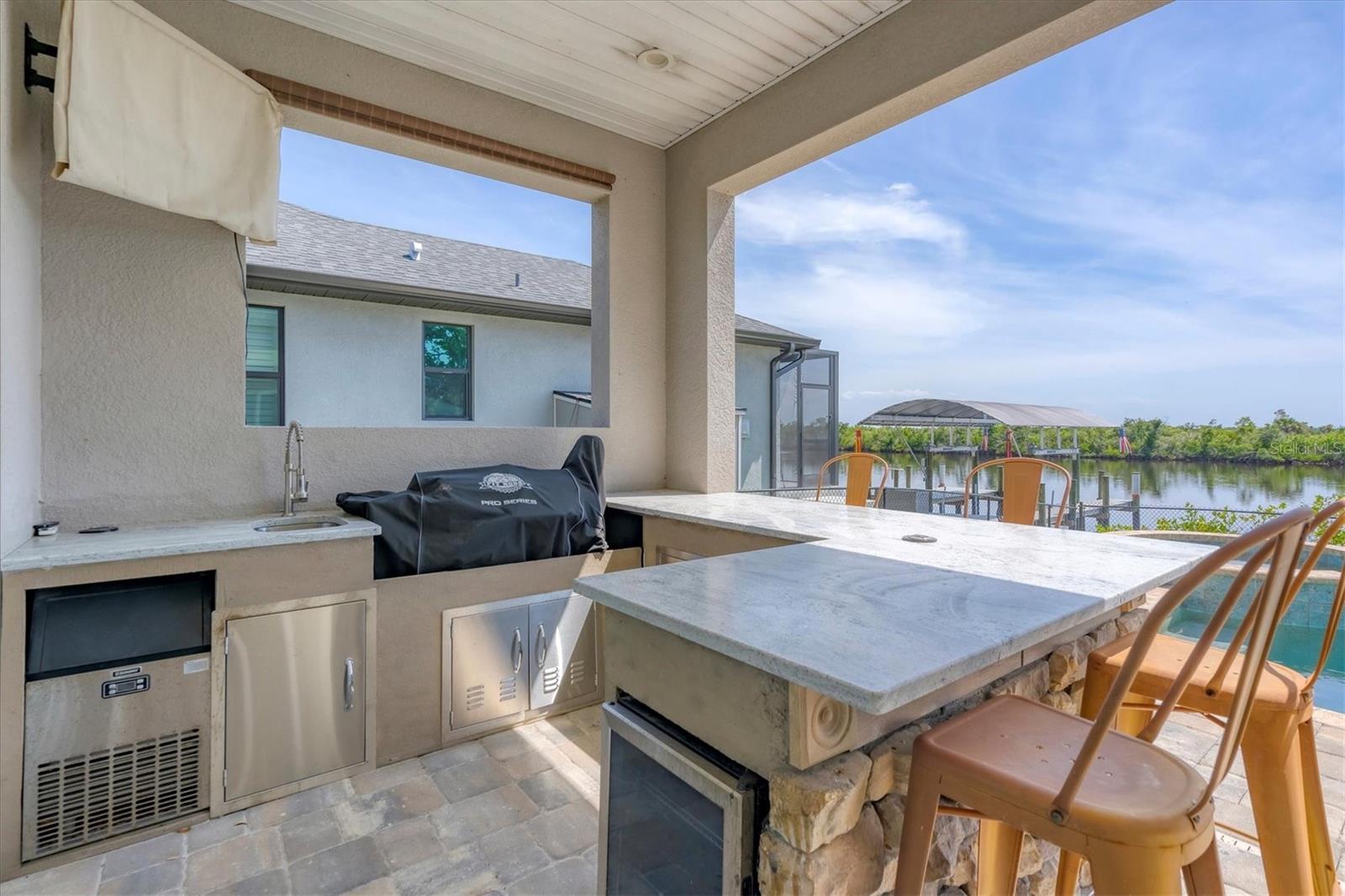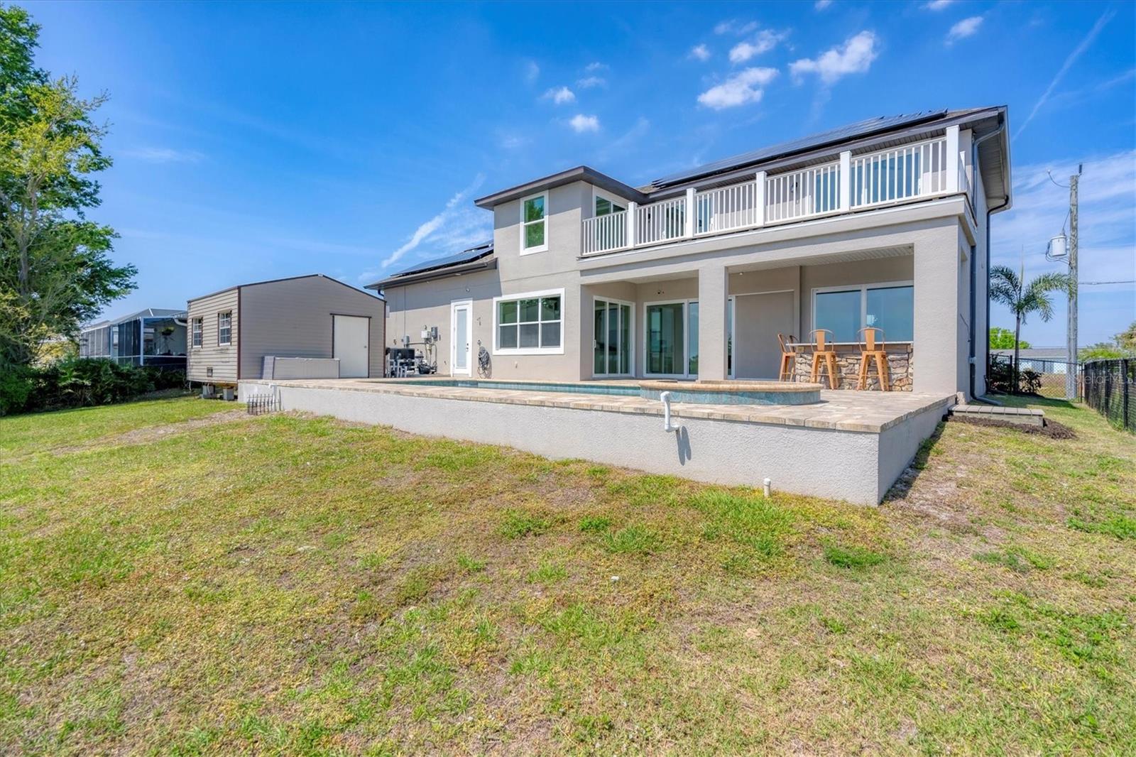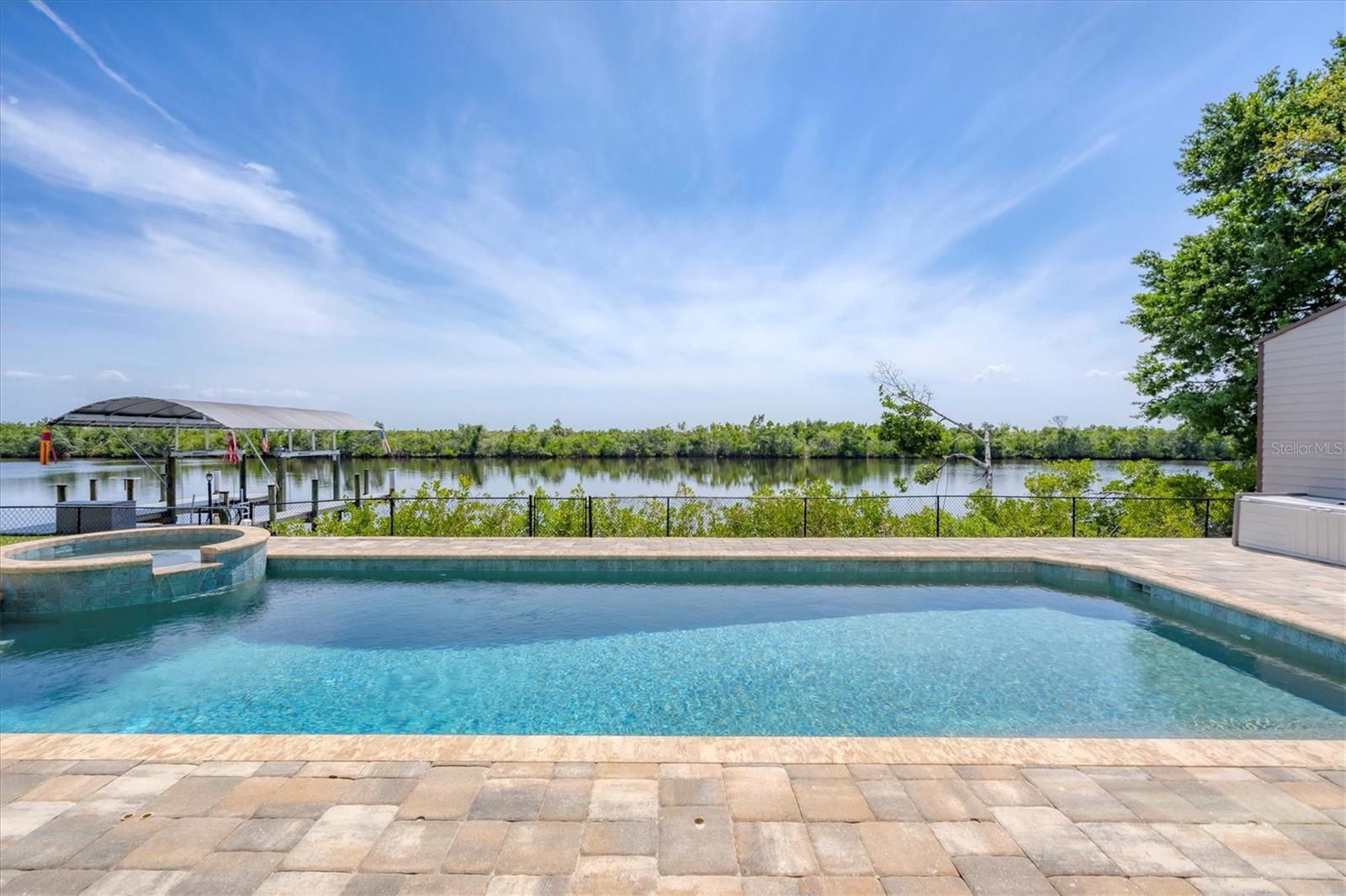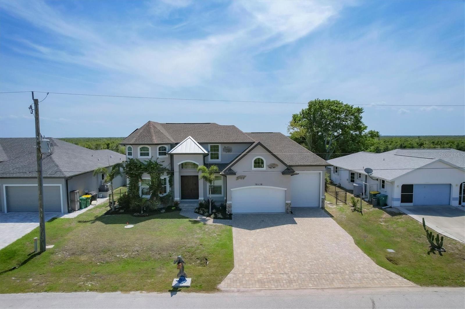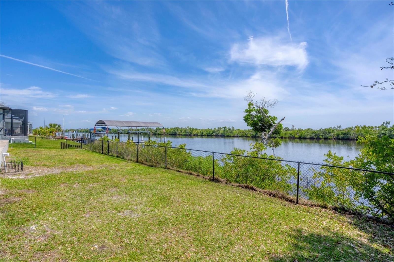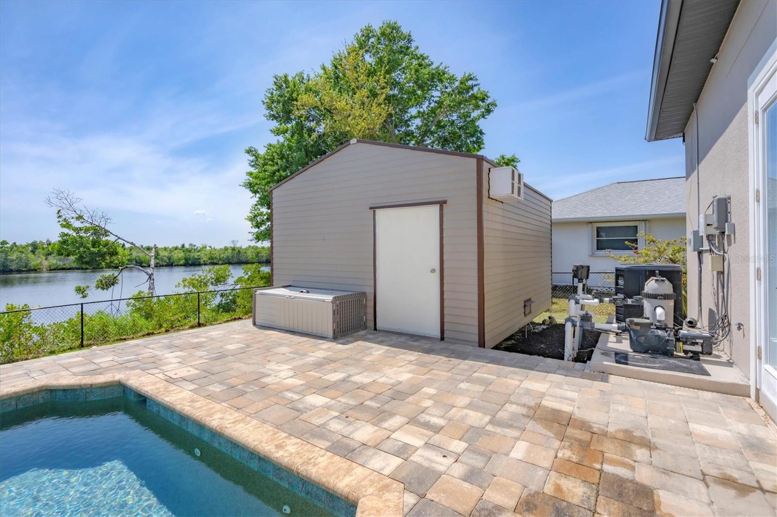 Welcome to waterfront luxury living at its finest! This custom 5-bedroom, 3-1/2-bathroom haven boasts 80 feet of frontage on the serene Manchester Waterway, offering breathtaking wide water views and coveted southern rear exposure. Sailboat access to Charlotte Harbor ensures endless opportunities for aquatic adventures right from your doorstep. Impeccably renovated after Hurricane Ian, this home exudes modern elegance and comfort. A 2023 roof, new drywall, porcelain tile, all new gorgeous lighting and fans and carpet throughout set the stage for a fresh, inviting ambiance. Step into the heart of the home, where a brand-new kitchen awaits with sleek granite counters, a stunning glass tile backsplash, and black stainless-steel appliances including two ovens, one of which is convection. The large island with breakfast bar, walk-in closet pantry, and exquisite details like pot filler for the stove showcase the meticulous attention to detail. The living room offers an electric fireplace with built-in space for a 75" TV and amazing views over the pool and beyond to the canal. The first floor features bedrooms sharing a convenient Jack and Jill bathroom, while a beautiful open staircase leads to the master suite and additional bedrooms. The expansive master suite is a sanctuary unto itself, boasting a large balcony, two walk-in closets, and a spa-like master bath with an extraordinary master shower featuring dual control shower heads with an additional rain head and double glass sinks. Other bedrooms share a spacious guest bath with tub/shower combo and access to a sizable storage area. Entertain in style outdoors on the brick paver lanai, where a heated saltwater pool and spa beckon for relaxation. An outdoor kitchen and shower add convenience and luxury to your al fresco gatherings. Plus, a 13 x 15 insulated shed with A/C offers versatile bonus space for hobbies or storage. This home is not just beautiful—it's built to withstand the elements with hurricane impact windows and 14.8kw solar system for energy efficiency. With an attached two-car garage and an additional RV garage with a 12-foot door, there's ample space for all your vehicles and toys. The fenced backyard ensures privacy and security in your own slice of paradise. Don't miss your chance to experience waterfront living at its finest in this meticulously crafted retreat!