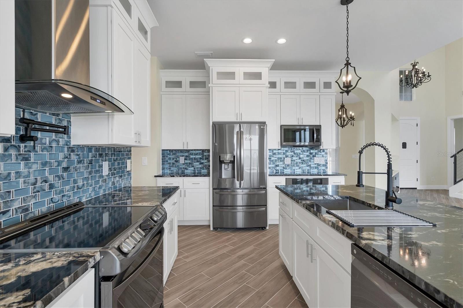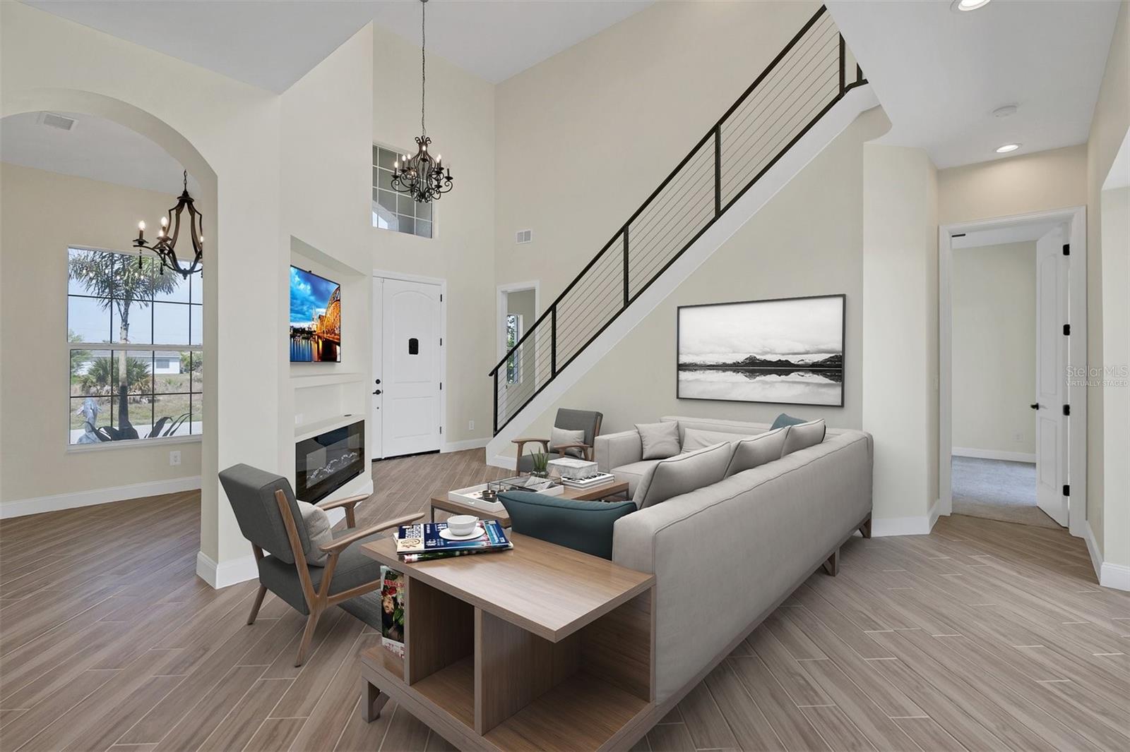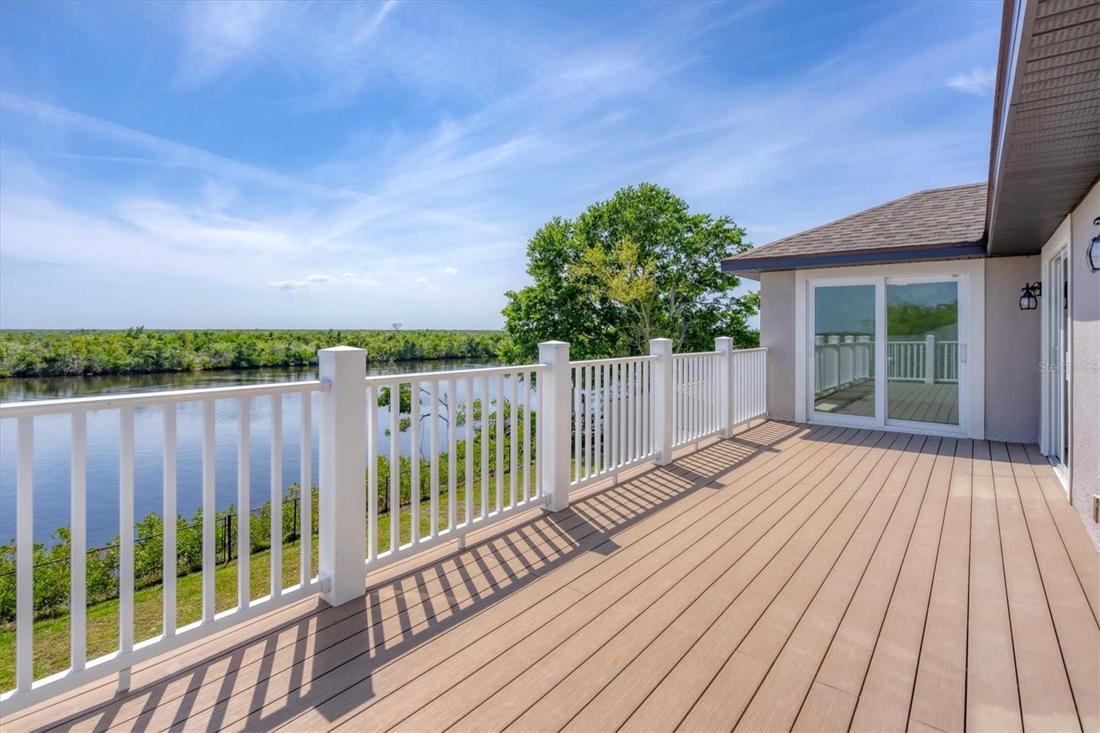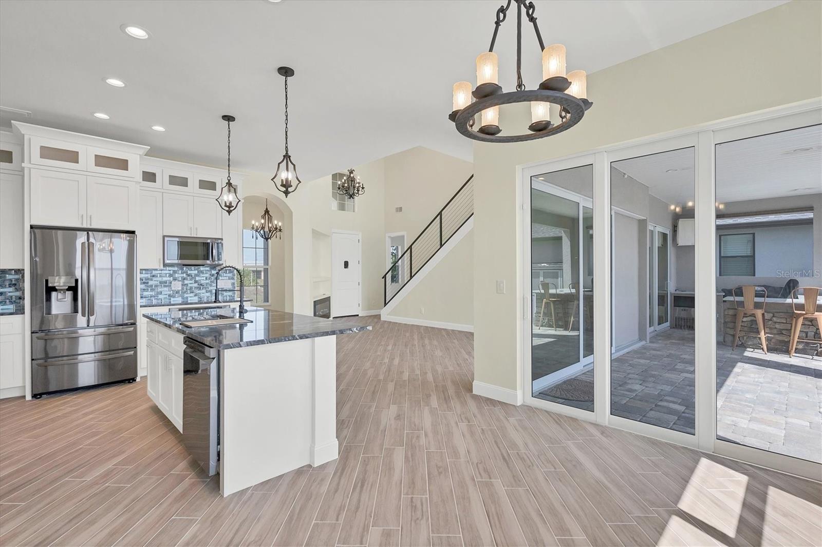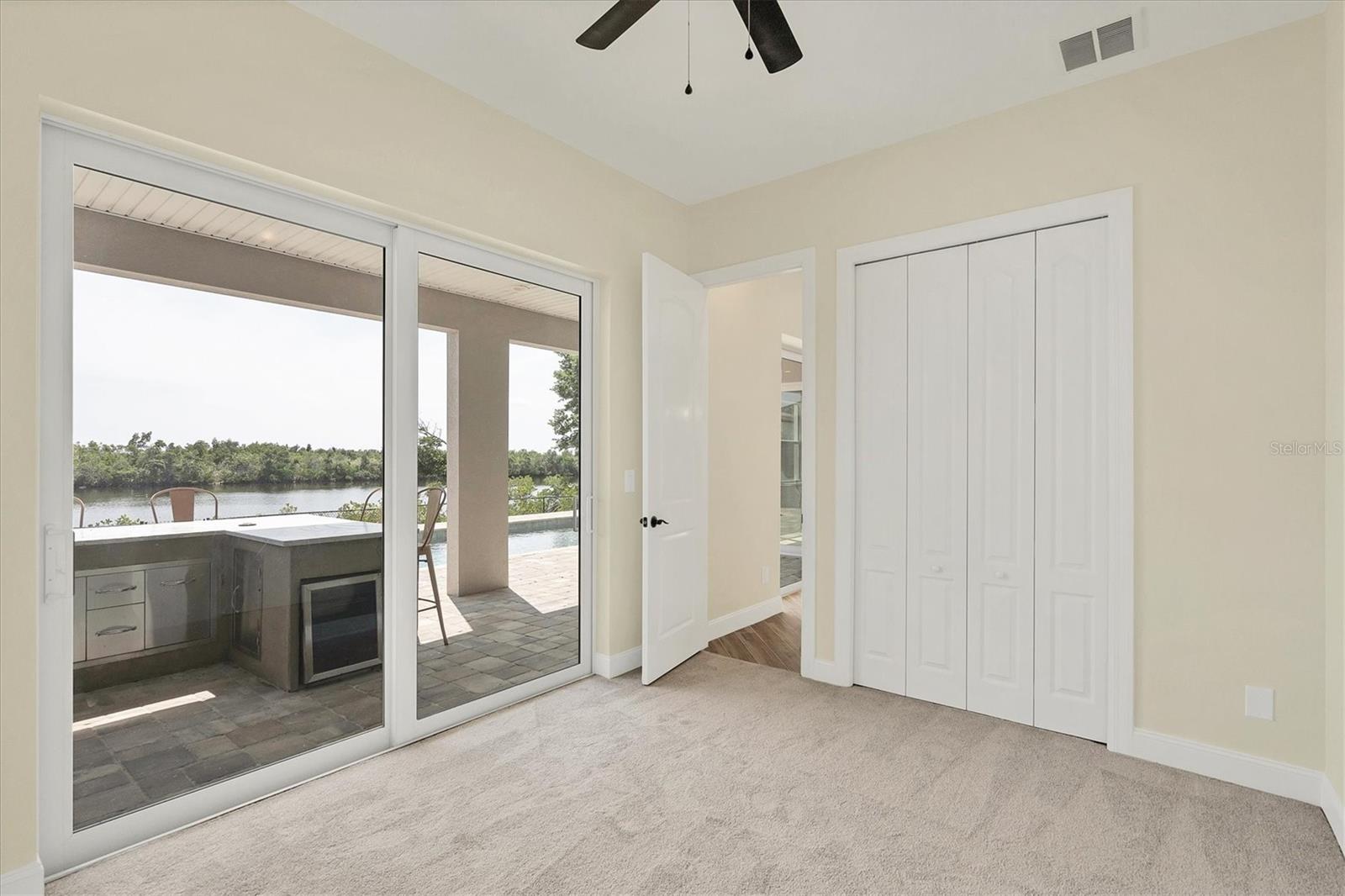 Welcome to waterfront luxury living at its finest! This custom 5-bedroom, 3-1/2-bathroom haven boasts 80 feet of frontage on the serene Manchester Waterway, offering breathtaking wide water views and coveted southern rear exposure. Sailboat access to Charlotte Harbor ensures endless opportunities for aquatic adventures right from your doorstep. Impeccably renovated after Hurricane Ian, this home exudes modern elegance and comfort. A 2023 roof, new drywall, porcelain tile, all new gorgeous lighting and fans and carpet throughout set the stage for a fresh, inviting ambiance. Step into the heart of the home, where a brand-new kitchen awaits with sleek granite counters, a stunning glass tile backsplash, and black stainless-steel appliances including two ovens, one of which is convection. The large island with breakfast bar, walk-in closet pantry, and exquisite details like pot filler for the stove showcase the meticulous attention to detail. The living room offers an electric fireplace with built-in space for a 75" TV and amazing views over the pool and beyond to the canal. The first floor features bedrooms sharing a convenient Jack and Jill bathroom, while a beautiful open staircase leads to the master suite and additional bedrooms. The expansive master suite is a sanctuary unto itself, boasting a large balcony, two walk-in closets, and a spa-like master bath with an extraordinary master shower featuring dual control shower heads with an additional rain head and double glass sinks. Other bedrooms share a spacious guest bath with tub/shower combo and access to a sizable storage area. Entertain in style outdoors on the brick paver lanai, where a heated saltwater pool and spa beckon for relaxation. An outdoor kitchen and shower add convenience and luxury to your al fresco gatherings. Plus, a 13 x 15 insulated shed with A/C offers versatile bonus space for hobbies or storage. This home is not just beautiful—it's built to withstand the elements with hurricane impact windows and 14.8kw solar system for energy efficiency. With an attached two-car garage and an additional RV garage with a 12-foot door, there's ample space for all your vehicles and toys. The fenced backyard ensures privacy and security in your own slice of paradise. Don't miss your chance to experience waterfront living at its finest in this meticulously crafted retreat!