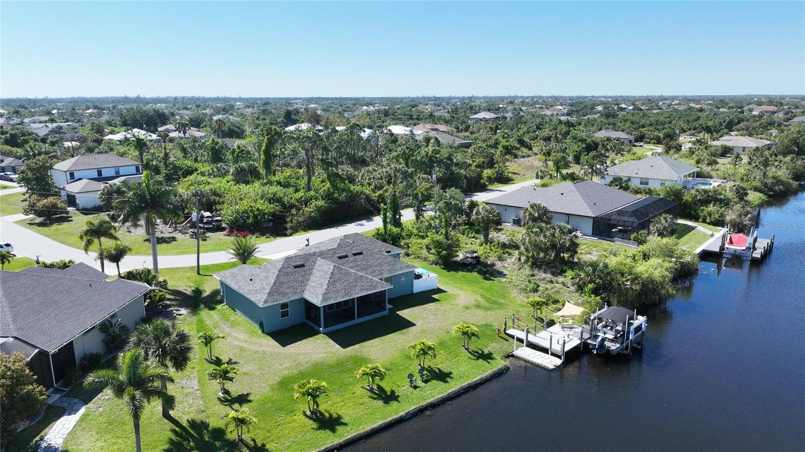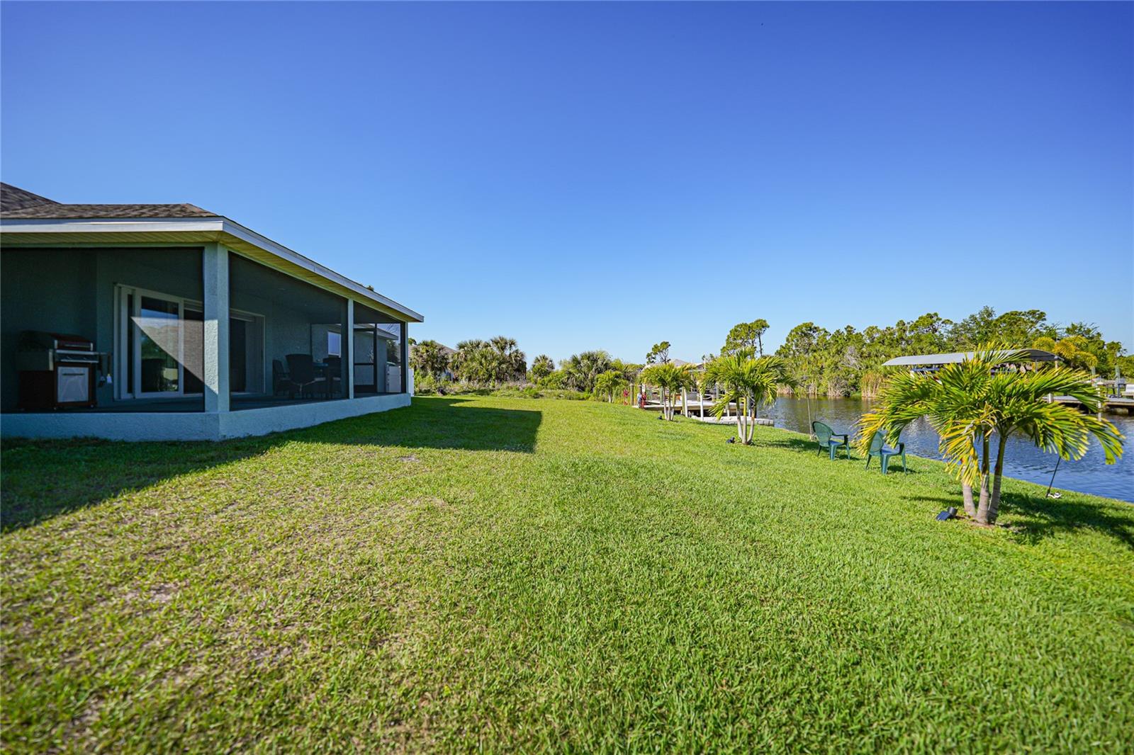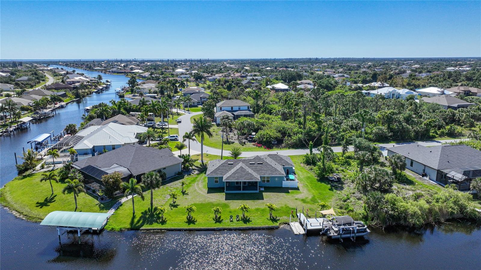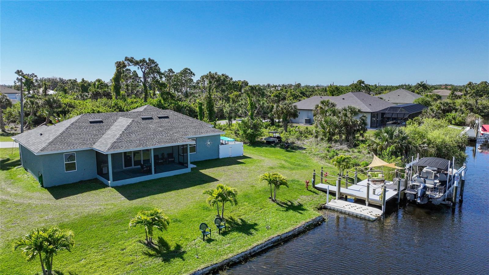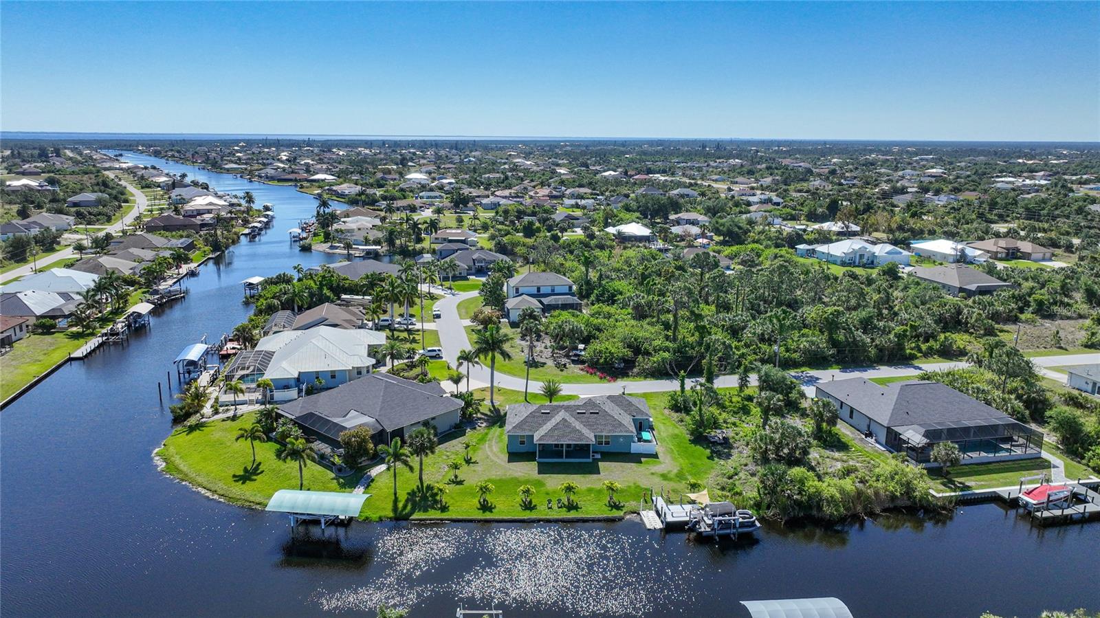 $20k PRICE REDUCTION!! Welcome to this recently constructed home from 2022 situated on a SPACIOUS SEMI-TIP LOT boasting a remarkable 135 FEET OF WATERFRONT VIEWS where the IMPALA and ZEPHYR WATERWAYS intersect in the highly desirable South Gulf Cove Community! Featuring 3 bedrooms, 2 bathrooms and a THREE CAR GARAGE, BOAT LIFT and TREX DOCK this home impresses with it's lofty cathedral ceilings, an airy open layout with sleek ceramic plank tile in the main living spaces, an indoor laundry area and a spacious covered and screened lanai where you can relish STUNNING SUNSETS with a northwestern facing exposure! <br> <br> Step inside this elegantly adorned home to discover a contemporary atmosphere accentuated by stylish kitchen cupboards and cabinets in a charming slate hue, ample granite countertop space, stainless steel appliances and a generously sized breakfast bar perfect for hosting gatherings. Additionally, a newly constructed pantry/buffet and coffee bar provide additional storage and convenience. The primary suite exudes space and luxury with plush upgraded carpeting, a tray ceiling, a sizable walk-in closet and a private en-suite bathroom matching the kitchen's elegance, complete with a garden tub/shower combination. The remaining two bedrooms have ample space, built-in closets and updated quality carpeting. Other notable interior features are elegant wooden blinds, an electric shade for the 9 foot glass pocket slider leading to the lanai, 4" baseboards, recessed lighting and a state of the art GENERAC FULL HOUSE GENERATOR! Also a MINI SPLIT AC was just added to the 700 sq ft GARAGE for added convenience!! <br> <br> Outside, the living space becomes an enchanting retreat with a recently installed expansive TREX DOCK equipped with electricity and water, an 8000 LB BOAT LIFT and a durable riprap seawall. The exterior also boasts motion sensor lights, landscape lighting, front and back rain gutters, and ample space for a potential pool! The owner has meticulously adjusted the culvert at the left side of the house to ensure proper rainwater drainage. Furthermore, the garage is extended an additional 6 feet in depth to accommodate larger vehicles! <br> <br> So bring your boat, kayaks and fishing gear so you can enjoy all the fresh catches of snapper, tarpon, redfish and snook right from your backyard or take your boat just a short 10 minutes to the lagoon (one bridge) and head out to the harbor or into the Gulf of Mexico! This home is on city water/sewer and in an OPTIONAL HOA for $120/year. The community offers a park, playground, a private boat ramp, clubhouse and all major roads have multi-use path sidewalks for peace of mind. Plenty of things to do here such as enjoying the PRISTINE BEACHES of Boca Grande or Englewood or if golfing is your thing, there are several golf courses nearby. Historic downtown Punta Gorda or Dearborn Street are both worth a visit for their charming shops, eateries and Farmer's Markets. Also the recently opened Sunseeker Resort is another destination with endless entertainment, refreshing pools and day spa! This area has a small town feel but if you need a dose of big city life, Ft Myers and Sarasota are not far. Close proximity to regional and international airports! Make your appointment today....this home won't disappoint!