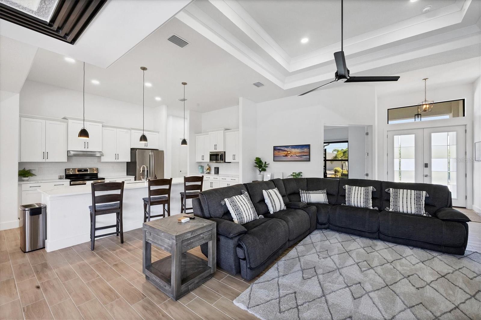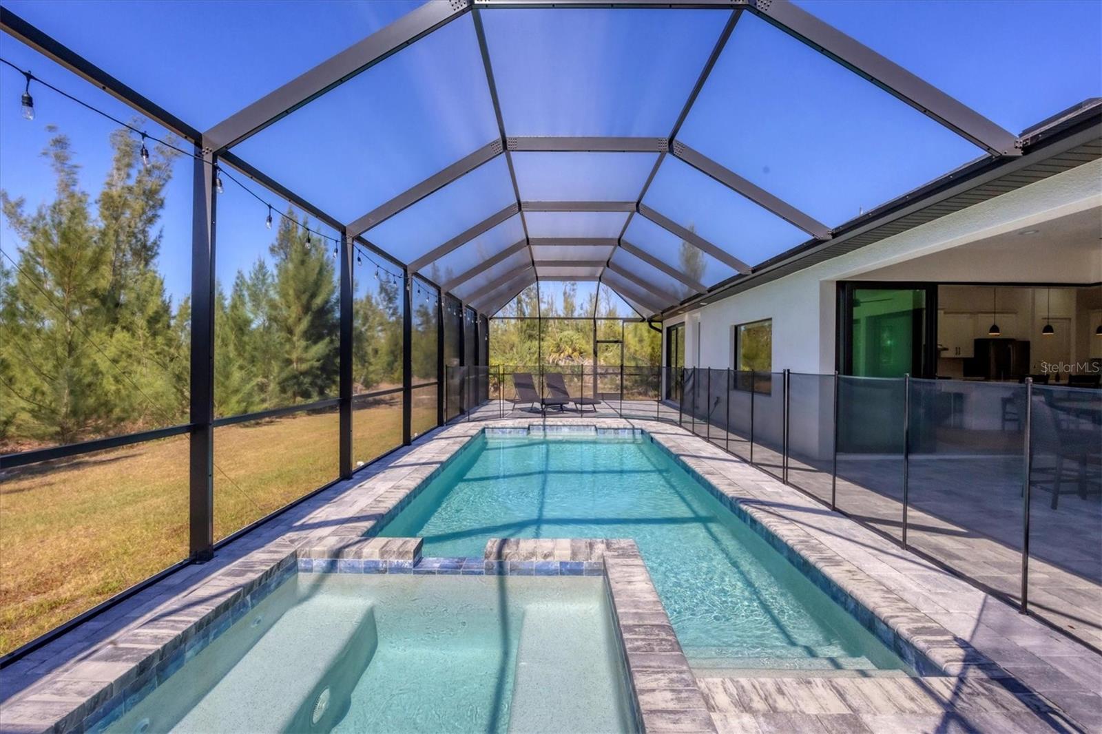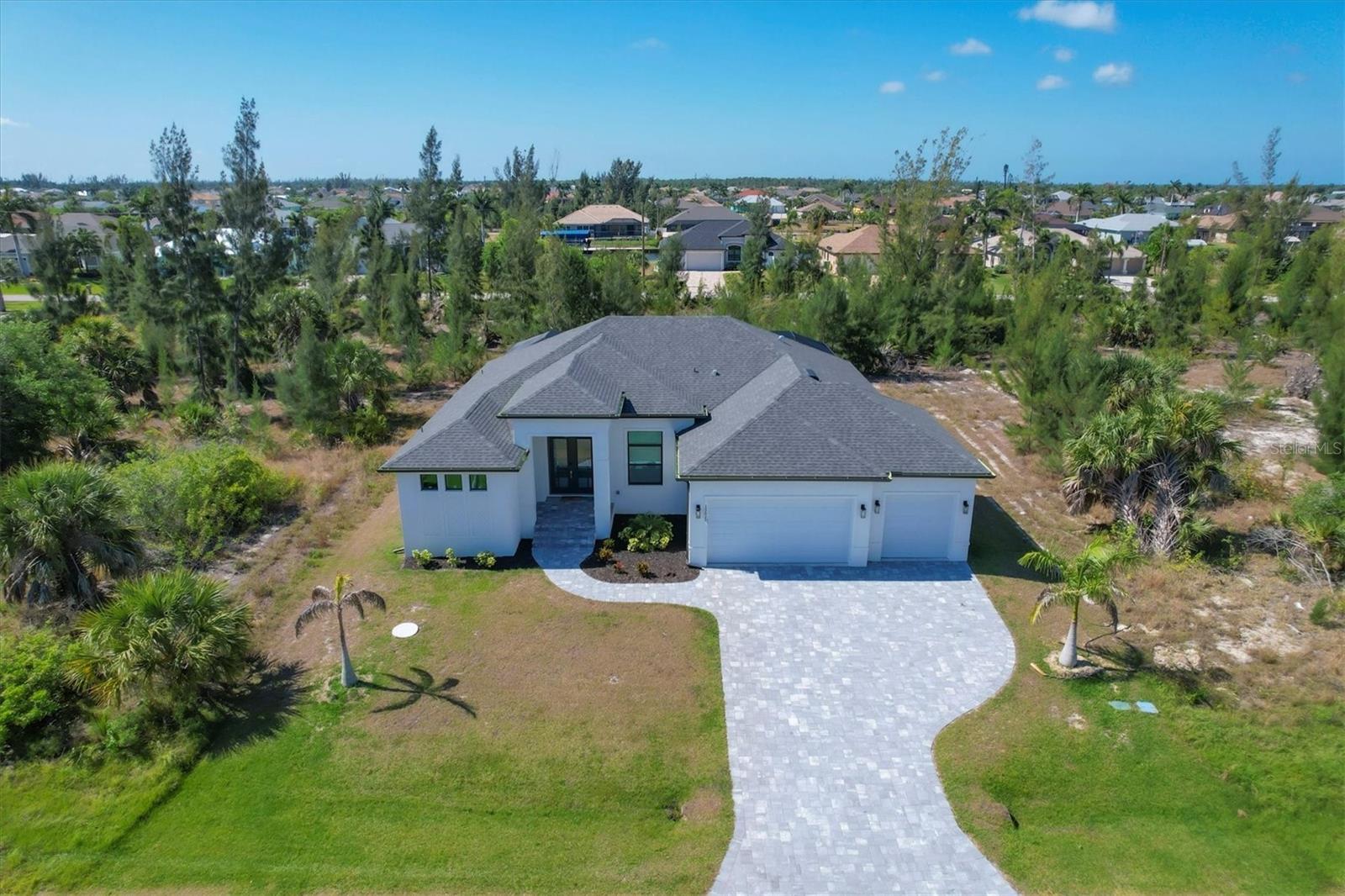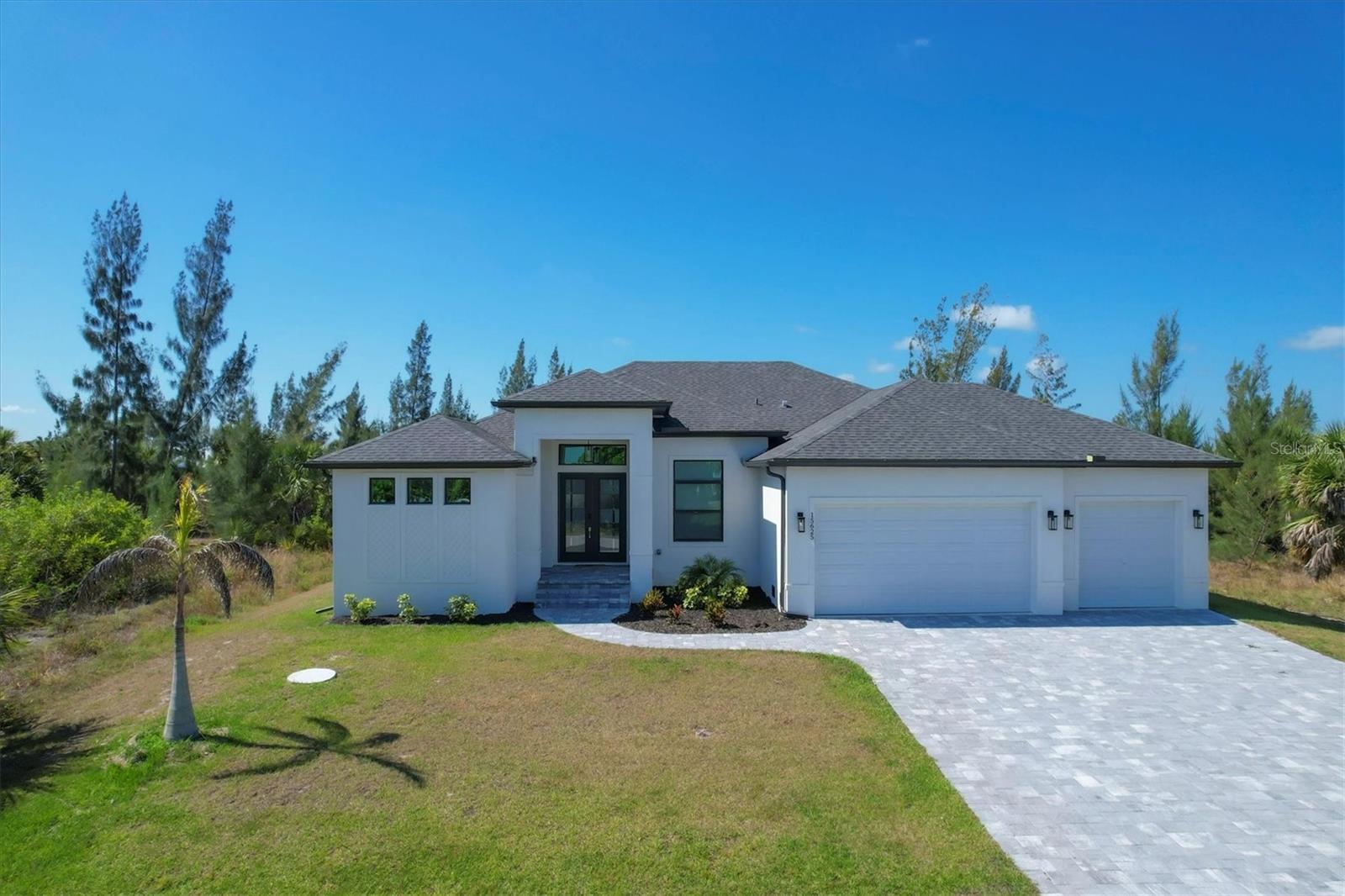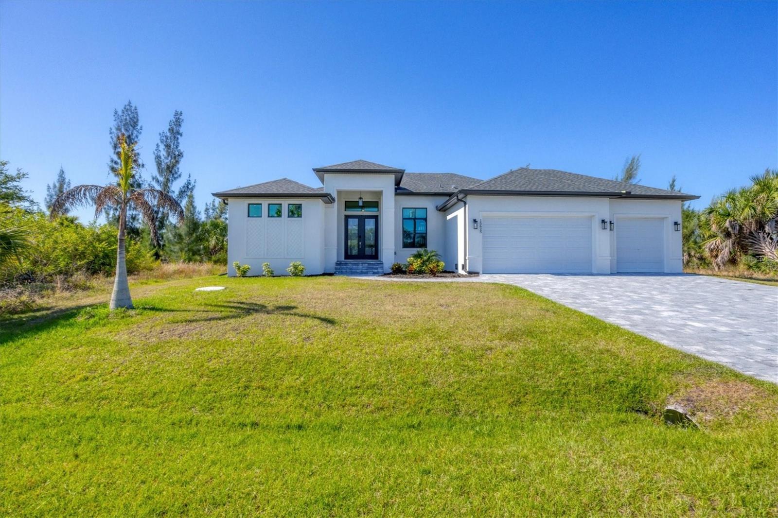 DREAMS DO COME TRUE! Almost new, this well-appointed residence is a 2023 custom built Tradewinds Luxury Home. Meticulously maintained and designed, this 3-bedroom with den, 2-bathroom home spans 2116 square feet of living space, where comfort and style unite seamlessly, and the 3-car garage allows ample room for your vehicles and storage needs! This location is unparallel and is in the sought-after waterfront community of South Gulf Cove! Just bring your toothbrush; FURNITURE AND FURNISHINGS ARE NEGOIABLE! With stunning curb appeal, the paver drive and walkway lead to the stylish double doors that welcome you to your dream of Florida living! Once inside, you are immediately taken in by the sheer volume of the room and the abundance of natural light pouring in! This open, great room concept is further enhanced by the double tray ceiling and a wall of 8 ft glass sliders, which integrate indoor and outdoor living and offer waterfront views from almost every room. The porcelain tile throughout brings together all the designer elements with style and uniformity and the neutral palette allows you to easily personalize this home to make it yours. The kitchen is no exception and will leave you wanting to indulge in your culinary delights! Not only is it beautiful, but it’s practical, from the quartz countertops and subway tile backsplash to the abundancy of cabinetry and finally to the stainless appliances. The massive 9 ft quartz island is the star of the show making it a pleasurable and convenient spot for engaging with all family and friends! Or if work is on your mind, there is a dedicated den/office (currently utilized as another bedroom) with a large window to close yourself off behind glass French doors. The primary suite in this split plan has a volume tray ceiling and 8ft sliding glass doors making the room even more spacious and able to accommodate the largest furniture. The ensuite is equally impressive with dual vanities, walk through porcelain tile shower and 2 ample walk-in closets. The two guest bedrooms are generously sized and are privately located along with a full bathroom on the opposite side of this home. The guest bathroom is conveniently located with access to the lanai and pool area, giving family and friends the ability to utilize it without disturbing the rest of the household. Outdoor living is nothing short of spectacular and this tropical area is sure to impress! This sizable outdoor space is another great spot where family and friends can spread out and visit in luxury! So, sit back, relax, and dine, all while being shielded from the hot Florida rays!But if sun is what you prefer, the paver pool deck offers ample space for sunbathing and the sparkling pool is the perfect place to cool off or arm up in the heated spa on those cool winter days! There is additional plumbing and electric in place where you can easily add a summer kitchen of your own design! Also in place is a large, screened window which is great for capturing breezes on those hot Florida days! Additionally, all doors and windows are IMPACT glass, all counter tops are quartz, and all cabinet doors and drawers are soft close. We invite you to view the pictures and attached video. Reserve your showing today!