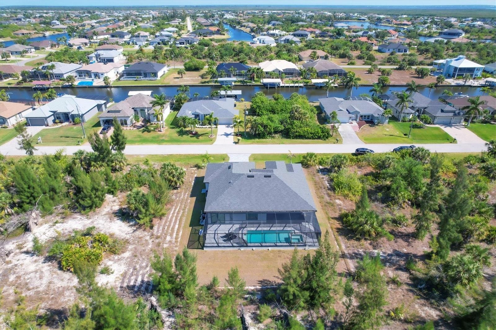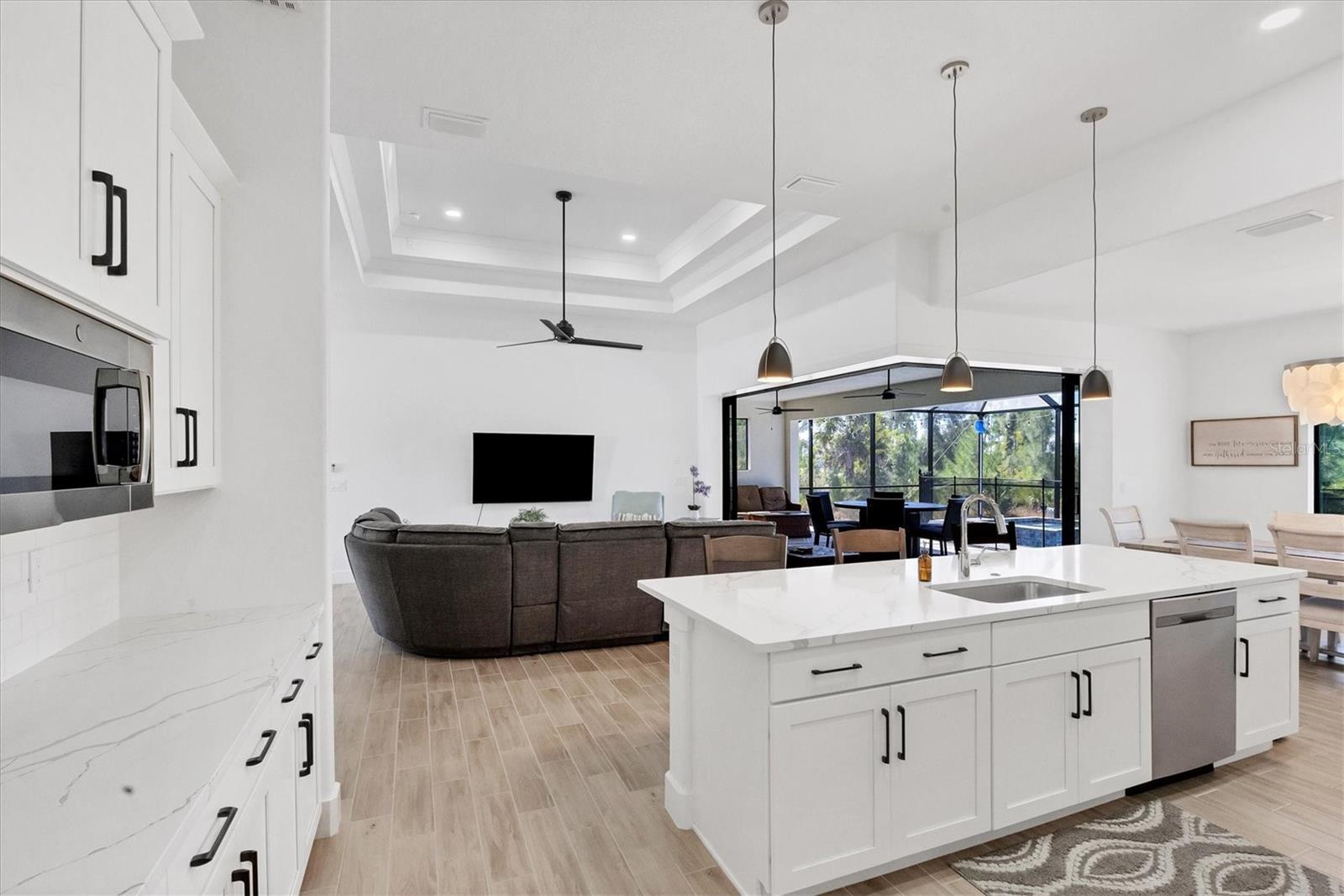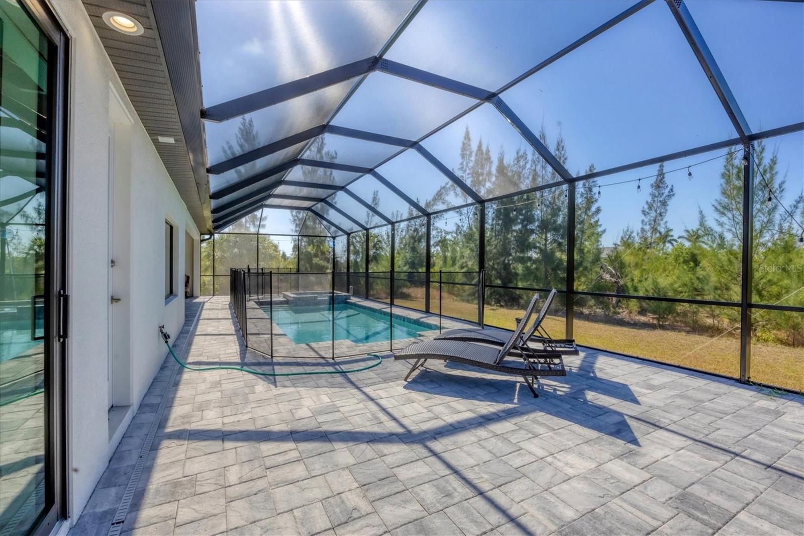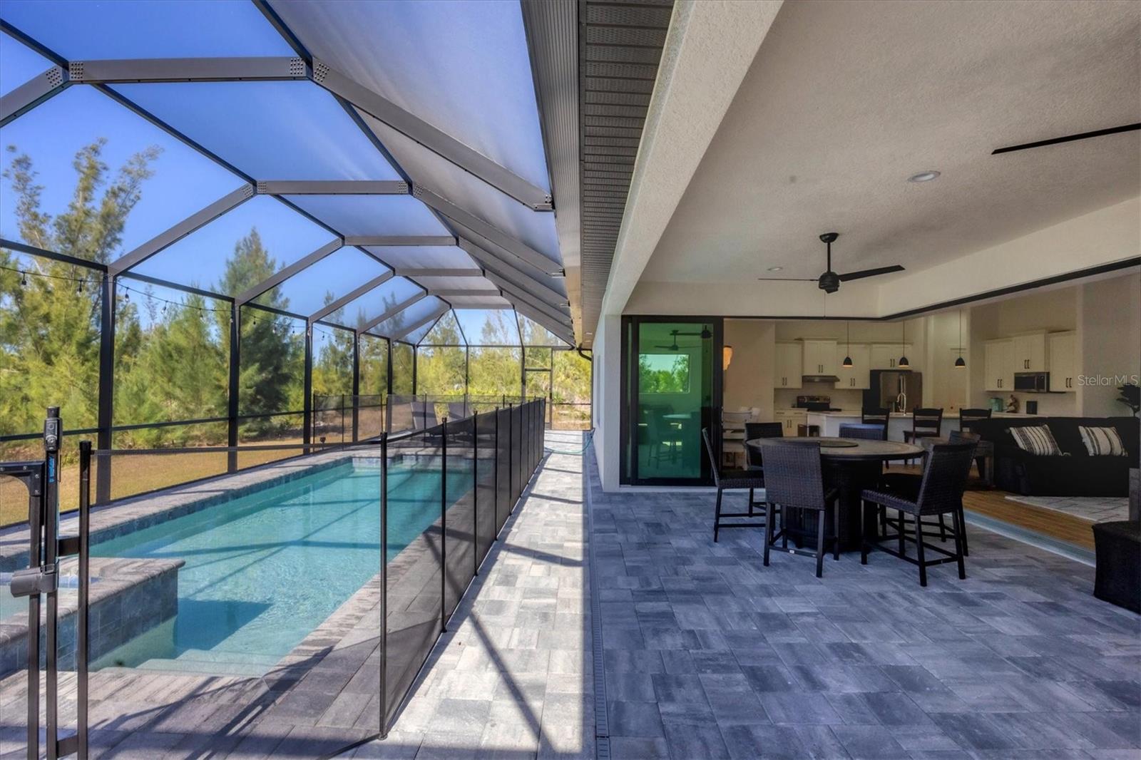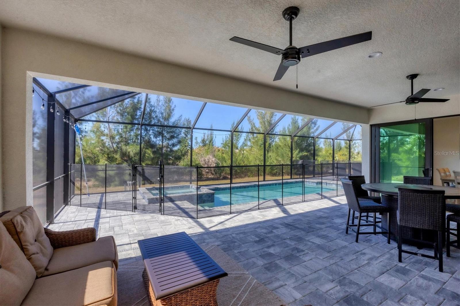 DREAMS DO COME TRUE! Almost new, this well-appointed residence is a 2023 custom built Tradewinds Luxury Home. Meticulously maintained and designed, this 3-bedroom with den, 2-bathroom home spans 2116 square feet of living space, where comfort and style unite seamlessly, and the 3-car garage allows ample room for your vehicles and storage needs! This location is unparallel and is in the sought-after waterfront community of South Gulf Cove! Just bring your toothbrush; FURNITURE AND FURNISHINGS ARE NEGOIABLE! With stunning curb appeal, the paver drive and walkway lead to the stylish double doors that welcome you to your dream of Florida living! Once inside, you are immediately taken in by the sheer volume of the room and the abundance of natural light pouring in! This open, great room concept is further enhanced by the double tray ceiling and a wall of 8 ft glass sliders, which integrate indoor and outdoor living and offer waterfront views from almost every room. The porcelain tile throughout brings together all the designer elements with style and uniformity and the neutral palette allows you to easily personalize this home to make it yours. The kitchen is no exception and will leave you wanting to indulge in your culinary delights! Not only is it beautiful, but it’s practical, from the quartz countertops and subway tile backsplash to the abundancy of cabinetry and finally to the stainless appliances. The massive 9 ft quartz island is the star of the show making it a pleasurable and convenient spot for engaging with all family and friends! Or if work is on your mind, there is a dedicated den/office (currently utilized as another bedroom) with a large window to close yourself off behind glass French doors. The primary suite in this split plan has a volume tray ceiling and 8ft sliding glass doors making the room even more spacious and able to accommodate the largest furniture. The ensuite is equally impressive with dual vanities, walk through porcelain tile shower and 2 ample walk-in closets. The two guest bedrooms are generously sized and are privately located along with a full bathroom on the opposite side of this home. The guest bathroom is conveniently located with access to the lanai and pool area, giving family and friends the ability to utilize it without disturbing the rest of the household. Outdoor living is nothing short of spectacular and this tropical area is sure to impress! This sizable outdoor space is another great spot where family and friends can spread out and visit in luxury! So, sit back, relax, and dine, all while being shielded from the hot Florida rays!But if sun is what you prefer, the paver pool deck offers ample space for sunbathing and the sparkling pool is the perfect place to cool off or arm up in the heated spa on those cool winter days! There is additional plumbing and electric in place where you can easily add a summer kitchen of your own design! Also in place is a large, screened window which is great for capturing breezes on those hot Florida days! Additionally, all doors and windows are IMPACT glass, all counter tops are quartz, and all cabinet doors and drawers are soft close. We invite you to view the pictures and attached video. Reserve your showing today!