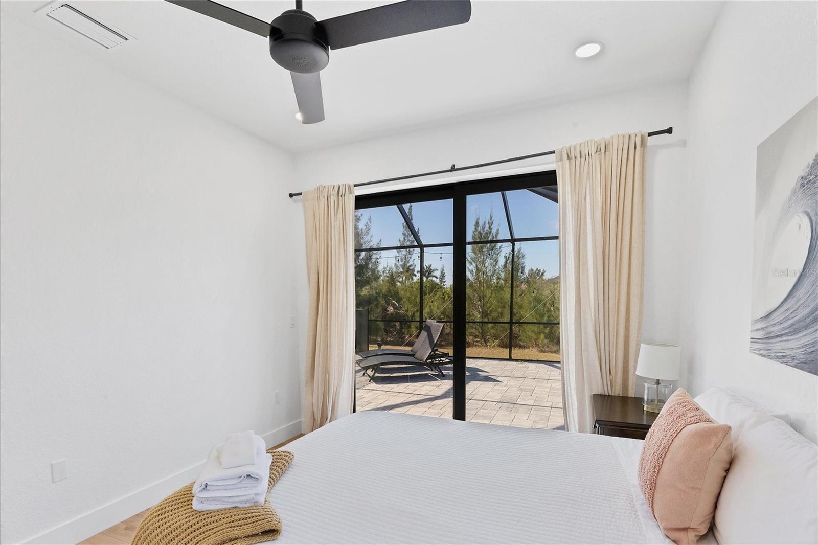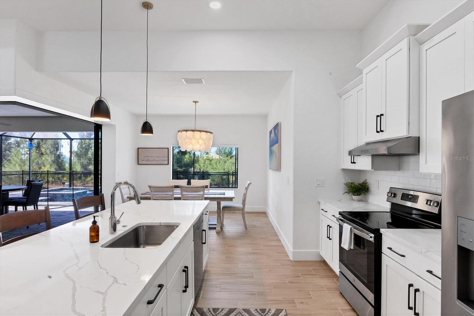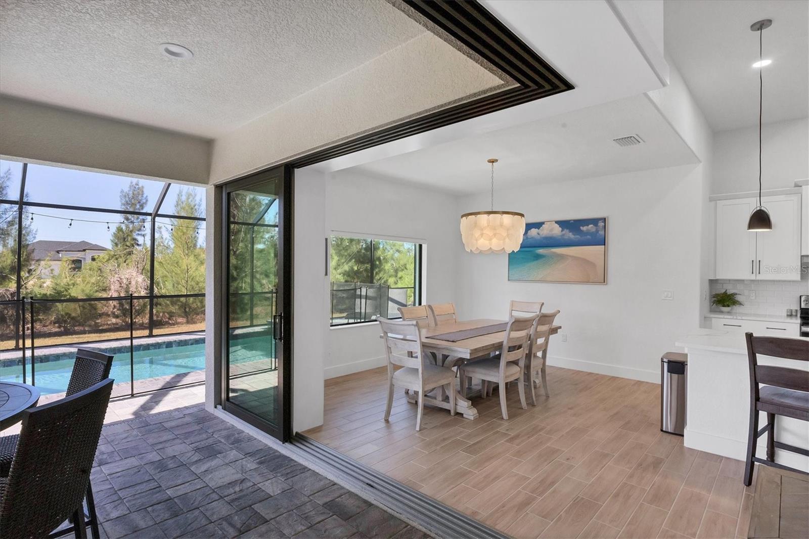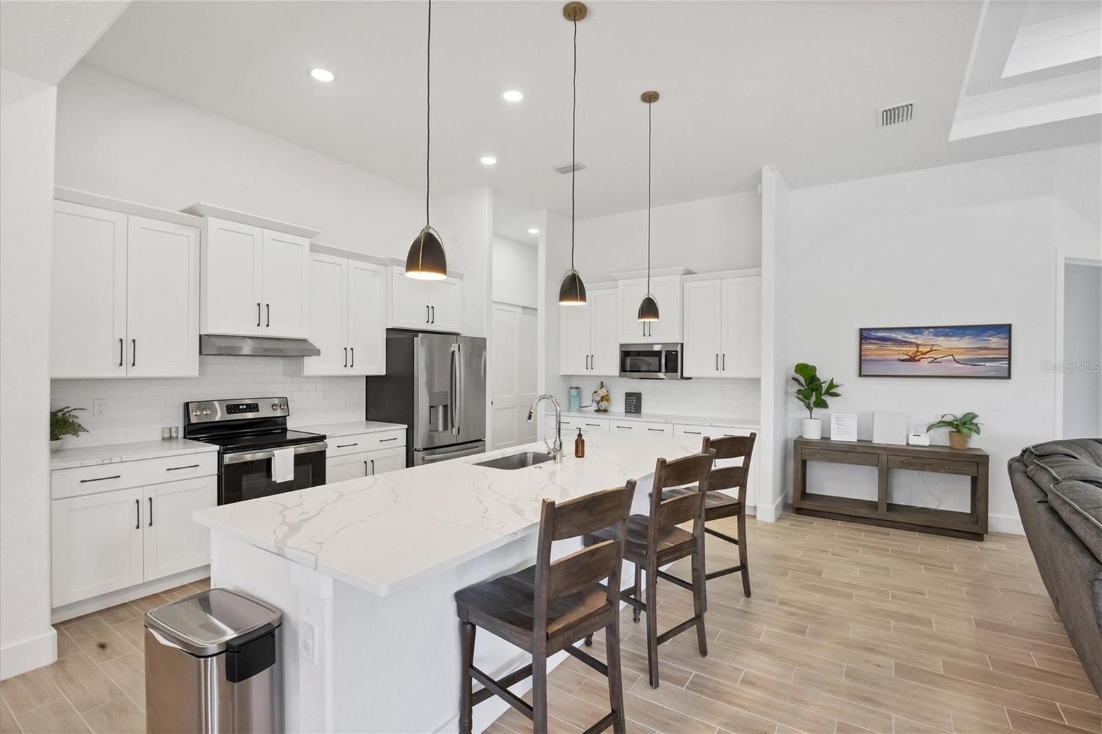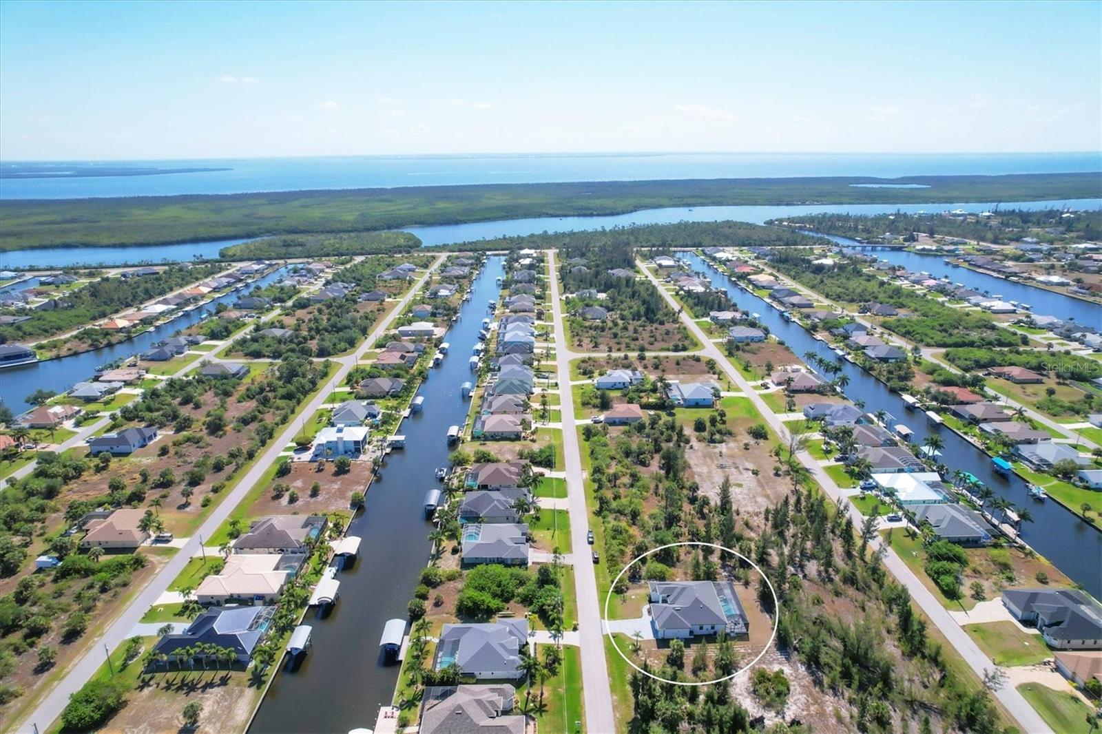 DREAMS DO COME TRUE! Almost new, this well-appointed residence is a 2023 custom built Tradewinds Luxury Home. Meticulously maintained and designed, this 3-bedroom with den, 2-bathroom home spans 2116 square feet of living space, where comfort and style unite seamlessly, and the 3-car garage allows ample room for your vehicles and storage needs! This location is unparallel and is in the sought-after waterfront community of South Gulf Cove! Just bring your toothbrush; FURNITURE AND FURNISHINGS ARE NEGOIABLE! With stunning curb appeal, the paver drive and walkway lead to the stylish double doors that welcome you to your dream of Florida living! Once inside, you are immediately taken in by the sheer volume of the room and the abundance of natural light pouring in! This open, great room concept is further enhanced by the double tray ceiling and a wall of 8 ft glass sliders, which integrate indoor and outdoor living and offer waterfront views from almost every room. The porcelain tile throughout brings together all the designer elements with style and uniformity and the neutral palette allows you to easily personalize this home to make it yours. The kitchen is no exception and will leave you wanting to indulge in your culinary delights! Not only is it beautiful, but it’s practical, from the quartz countertops and subway tile backsplash to the abundancy of cabinetry and finally to the stainless appliances. The massive 9 ft quartz island is the star of the show making it a pleasurable and convenient spot for engaging with all family and friends! Or if work is on your mind, there is a dedicated den/office (currently utilized as another bedroom) with a large window to close yourself off behind glass French doors. The primary suite in this split plan has a volume tray ceiling and 8ft sliding glass doors making the room even more spacious and able to accommodate the largest furniture. The ensuite is equally impressive with dual vanities, walk through porcelain tile shower and 2 ample walk-in closets. The two guest bedrooms are generously sized and are privately located along with a full bathroom on the opposite side of this home. The guest bathroom is conveniently located with access to the lanai and pool area, giving family and friends the ability to utilize it without disturbing the rest of the household. Outdoor living is nothing short of spectacular and this tropical area is sure to impress! This sizable outdoor space is another great spot where family and friends can spread out and visit in luxury! So, sit back, relax, and dine, all while being shielded from the hot Florida rays!But if sun is what you prefer, the paver pool deck offers ample space for sunbathing and the sparkling pool is the perfect place to cool off or arm up in the heated spa on those cool winter days! There is additional plumbing and electric in place where you can easily add a summer kitchen of your own design! Also in place is a large, screened window which is great for capturing breezes on those hot Florida days! Additionally, all doors and windows are IMPACT glass, all counter tops are quartz, and all cabinet doors and drawers are soft close. We invite you to view the pictures and attached video. Reserve your showing today!