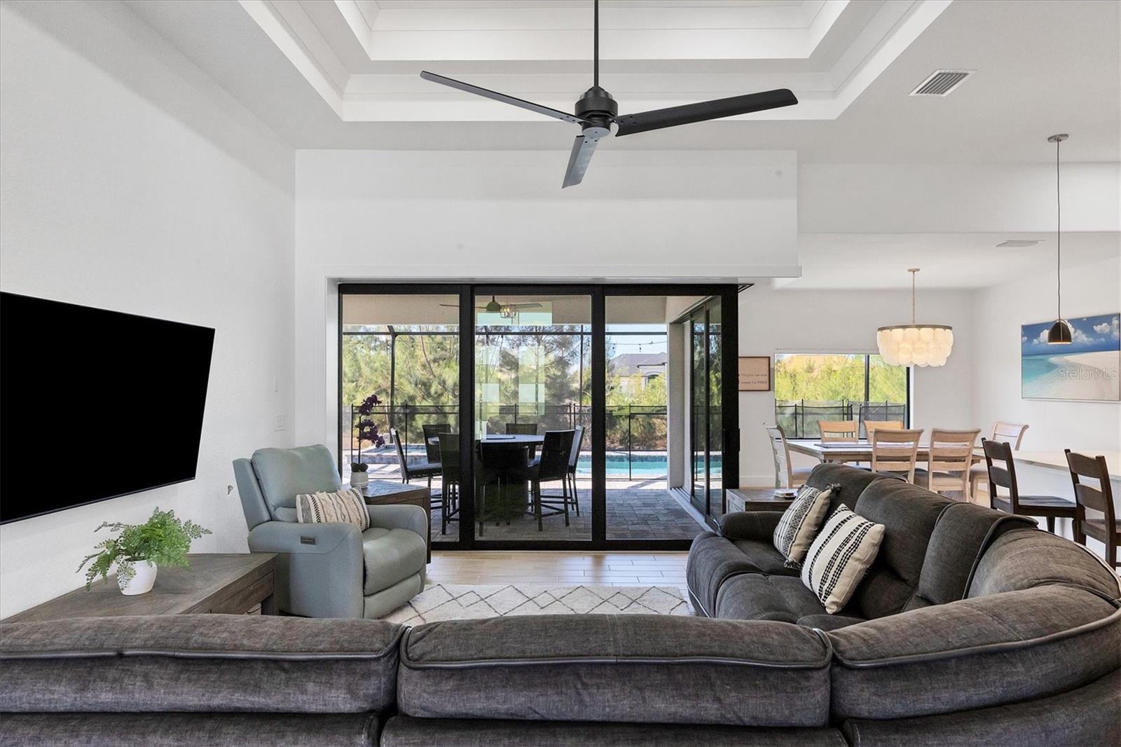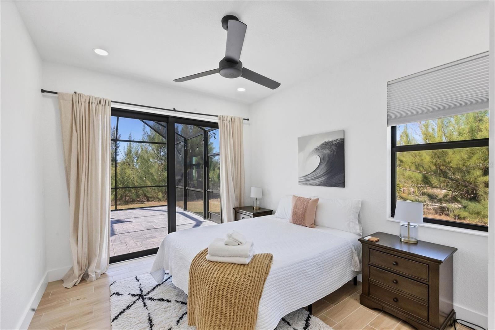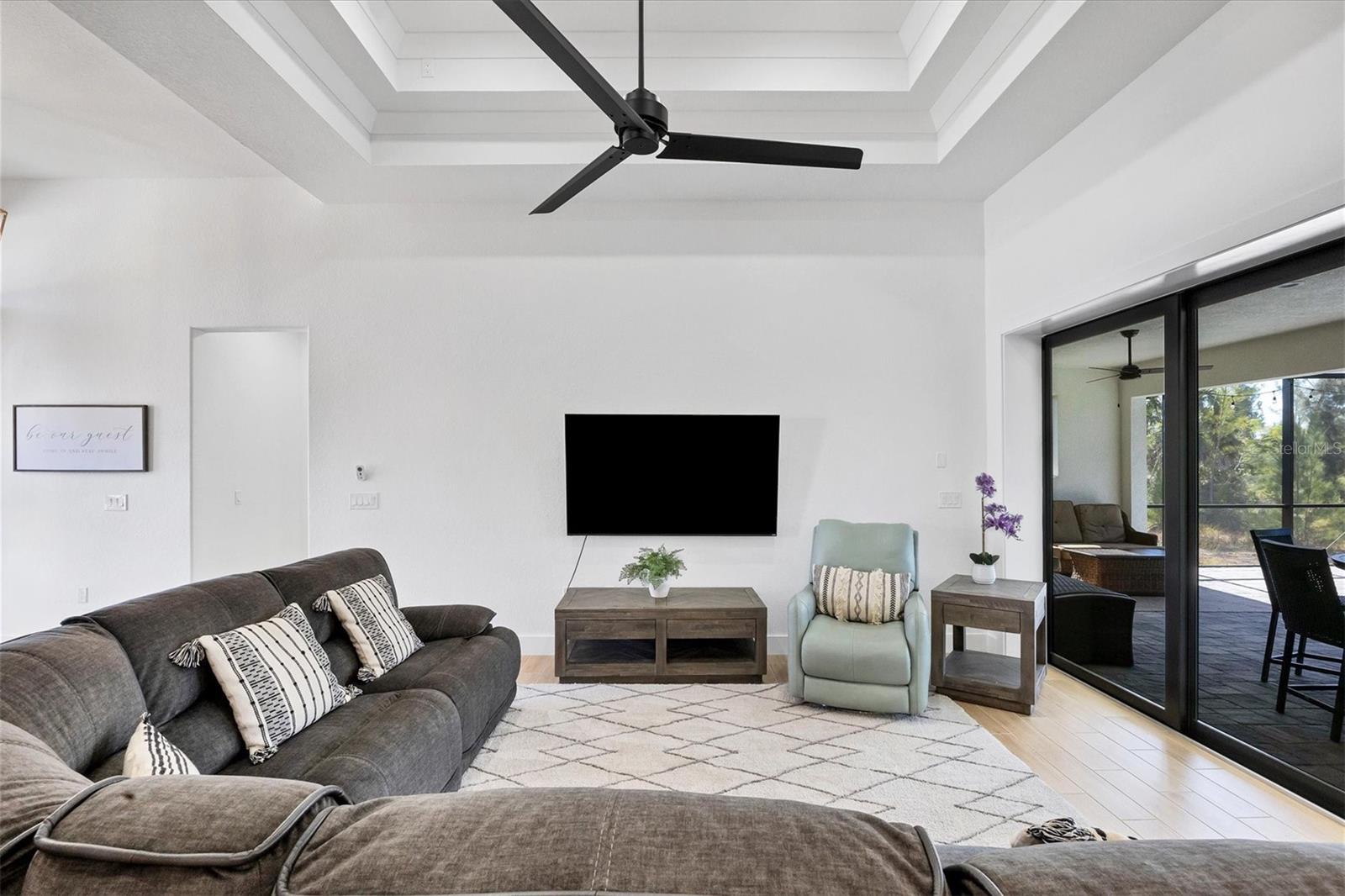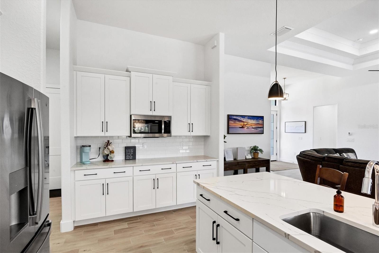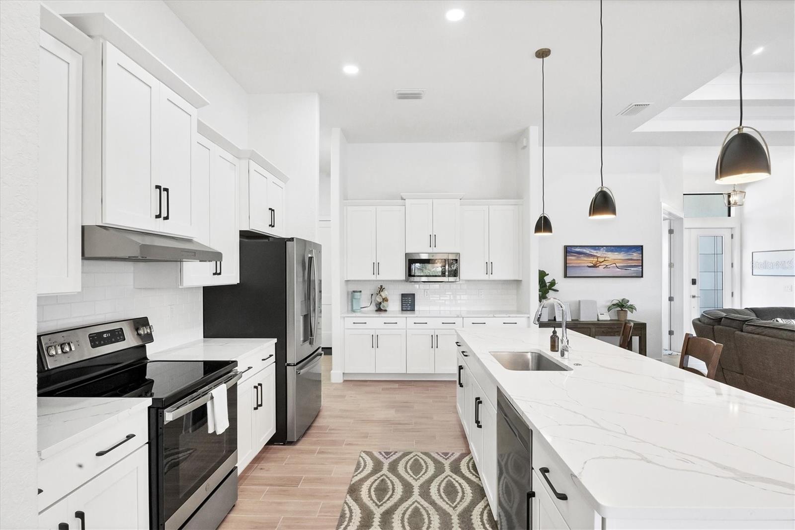 DREAMS DO COME TRUE! Almost new, this well-appointed residence is a 2023 custom built Tradewinds Luxury Home. Meticulously maintained and designed, this 3-bedroom with den, 2-bathroom home spans 2116 square feet of living space, where comfort and style unite seamlessly, and the 3-car garage allows ample room for your vehicles and storage needs! This location is unparallel and is in the sought-after waterfront community of South Gulf Cove! Just bring your toothbrush; FURNITURE AND FURNISHINGS ARE NEGOIABLE! With stunning curb appeal, the paver drive and walkway lead to the stylish double doors that welcome you to your dream of Florida living! Once inside, you are immediately taken in by the sheer volume of the room and the abundance of natural light pouring in! This open, great room concept is further enhanced by the double tray ceiling and a wall of 8 ft glass sliders, which integrate indoor and outdoor living and offer waterfront views from almost every room. The porcelain tile throughout brings together all the designer elements with style and uniformity and the neutral palette allows you to easily personalize this home to make it yours. The kitchen is no exception and will leave you wanting to indulge in your culinary delights! Not only is it beautiful, but it’s practical, from the quartz countertops and subway tile backsplash to the abundancy of cabinetry and finally to the stainless appliances. The massive 9 ft quartz island is the star of the show making it a pleasurable and convenient spot for engaging with all family and friends! Or if work is on your mind, there is a dedicated den/office (currently utilized as another bedroom) with a large window to close yourself off behind glass French doors. The primary suite in this split plan has a volume tray ceiling and 8ft sliding glass doors making the room even more spacious and able to accommodate the largest furniture. The ensuite is equally impressive with dual vanities, walk through porcelain tile shower and 2 ample walk-in closets. The two guest bedrooms are generously sized and are privately located along with a full bathroom on the opposite side of this home. The guest bathroom is conveniently located with access to the lanai and pool area, giving family and friends the ability to utilize it without disturbing the rest of the household. Outdoor living is nothing short of spectacular and this tropical area is sure to impress! This sizable outdoor space is another great spot where family and friends can spread out and visit in luxury! So, sit back, relax, and dine, all while being shielded from the hot Florida rays!But if sun is what you prefer, the paver pool deck offers ample space for sunbathing and the sparkling pool is the perfect place to cool off or arm up in the heated spa on those cool winter days! There is additional plumbing and electric in place where you can easily add a summer kitchen of your own design! Also in place is a large, screened window which is great for capturing breezes on those hot Florida days! Additionally, all doors and windows are IMPACT glass, all counter tops are quartz, and all cabinet doors and drawers are soft close. We invite you to view the pictures and attached video. Reserve your showing today!