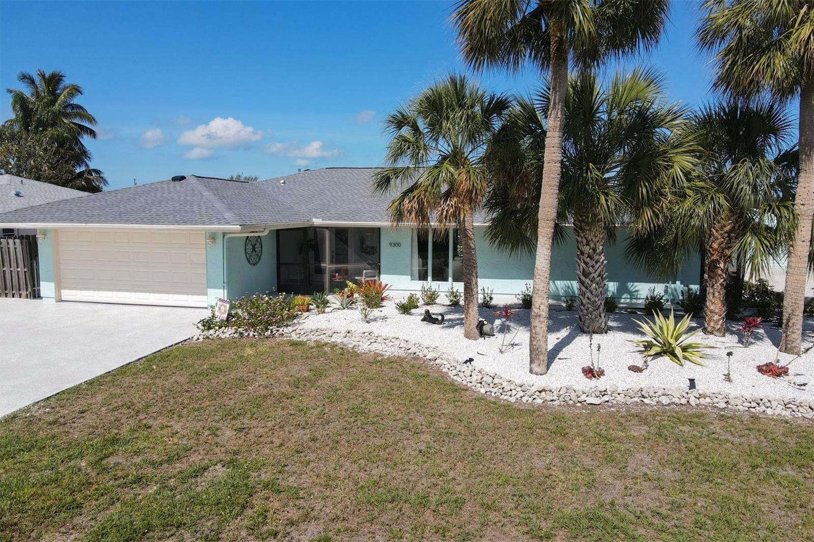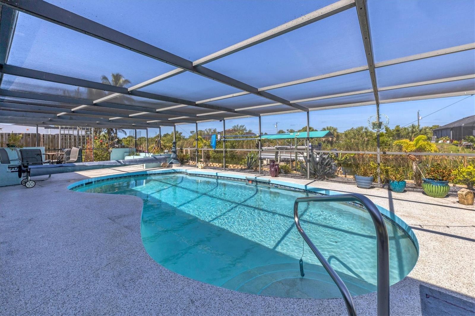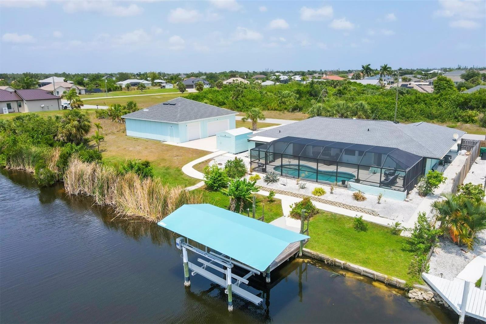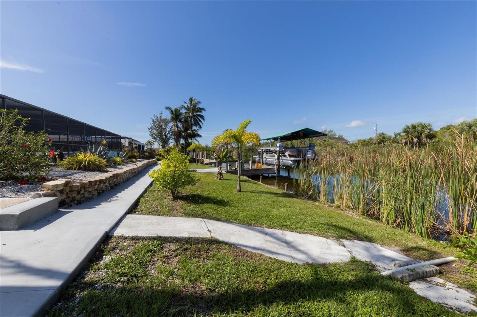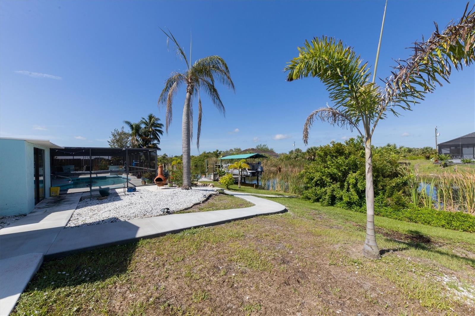 It's time to call this slice of Paradise in the beautiful Waterfront Community of South Gulf Cove your own. This amazing property has it all. This 3/2 waterfront home sits on a double lot with 160 ft. of water frontage with a cement walk way down to your dock and covered boat lift, and boasts a huge 40 x 40 detached garage for that car enthusiast, toy collector, woodworker etc. The possibilities are endless. Enjoy the mature landscaping of your tropical oasis. Walking through the updated decorative etched double front door (hurricane rated) you will notice the natural lighting through out the rooms. The spacious living room is enhanced by the large window and sliders that go out to the lanai/pool area. The beautifully renovated kitchen has been upgraded with gorgeous granite countertops, new tile backsplash, soft close cabinets with pull out shelves, hot water dispenser faucet and soap dispenser and newer stainless steel appliances. The natural light to the kitchen comes from the 3 large windows in the breakfast nook that overlook the pool/lanai area. The popular Florida split floor plan takes you into two nice size guest bedrooms on one side of the home that share the newly renovated oversized bath with a gorgeous tiled walk in shower and tiled bench that is accessible from the pool lanai. The oversized main bedroom is located on the opposite side of the home and features two sliders that take you out to the pool/lanai area. Off the main bedroom you walk into your newly remodeled main bath featuring a newly tiled walk in shower with a tiled bench. The laundry area is located down the hall from the Main Bedroom. If you are looking for an outdoor oasis, possibilities are endless with this property both in the lanai and outside of the lanai. The oversized lanai features a 14 x 28 size pool with an upgraded high efficiency pool heater. There is plenty of entertaining space to envision an outdoor bar area, outdoor kitchen, outside tiki bar area etc. There is plenty of parking with the added cement driveway for the detached garage, and additional storage in the 120 sq.ft. pre-built shed. Some of the additional upgrades to this property are: New roof (3/22), replaced AC (2017), Hurricane sliding doors (2019), New cement sidewalks across and behind the house, garage & Dock (2022), whole house repiped with PVC PEX tubing and fittings (2021), Garage and House painted (2020), Hot water heater (2019) This property has a lot to offer, make your appointment today.