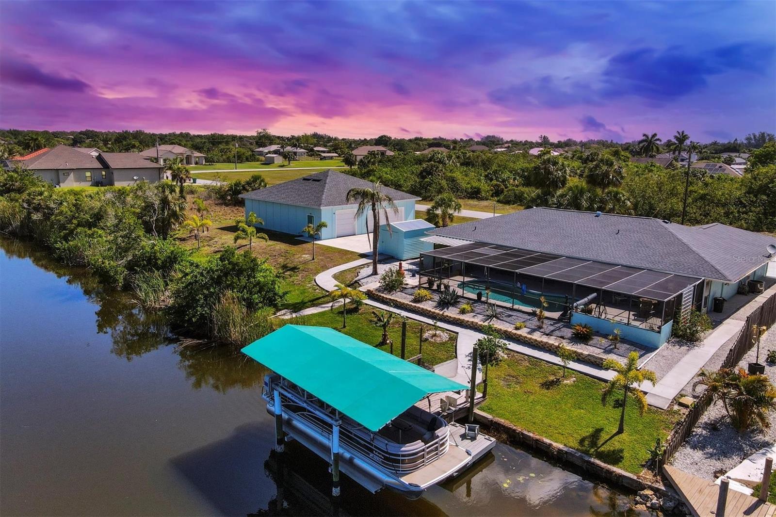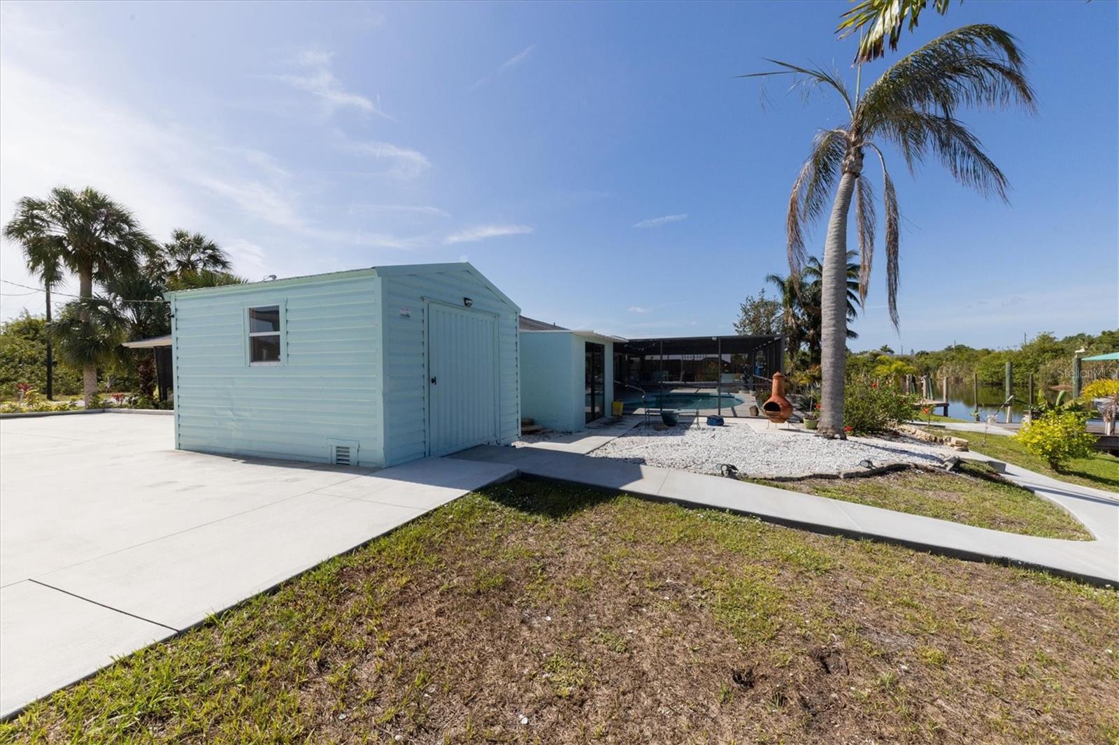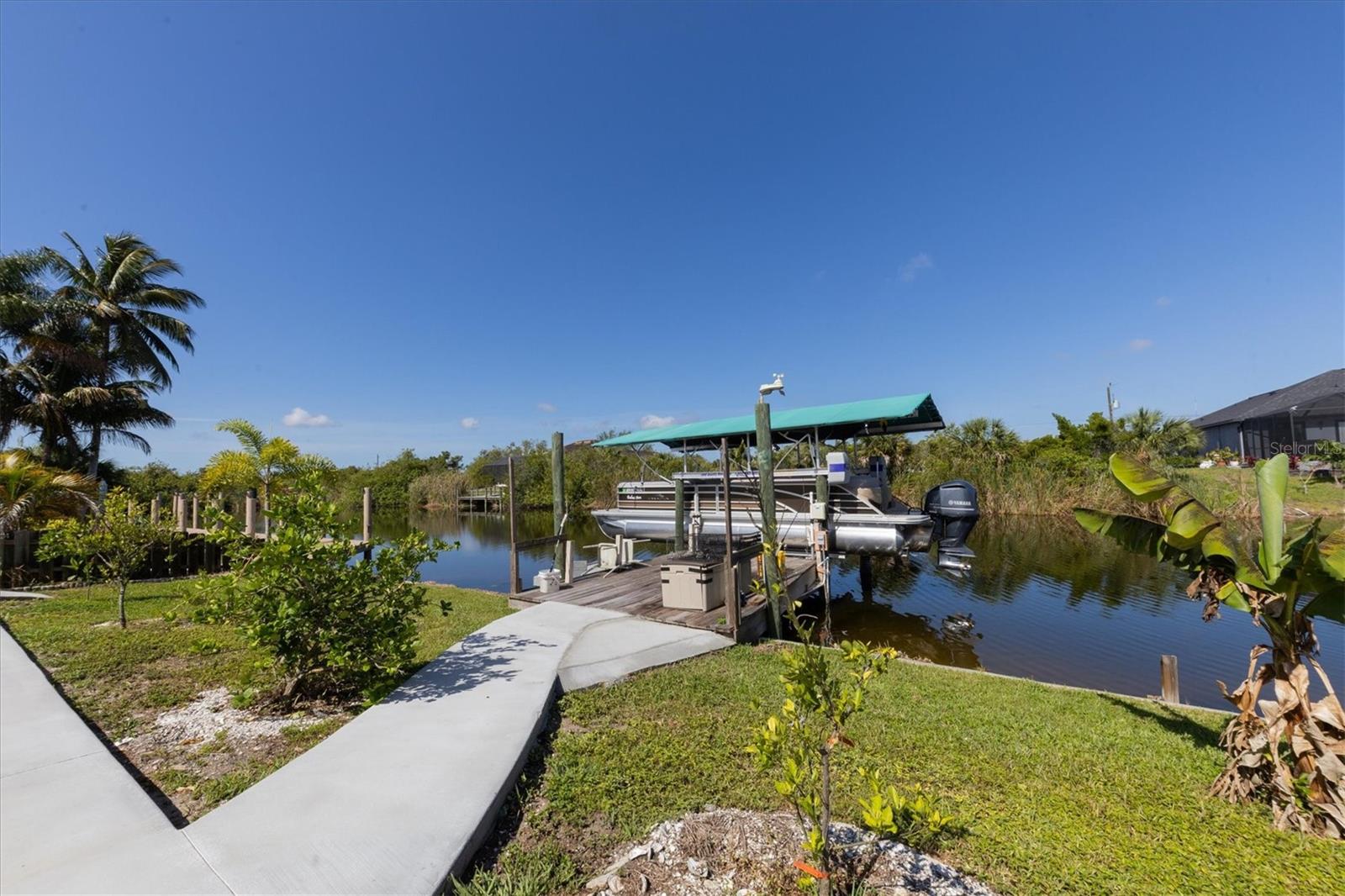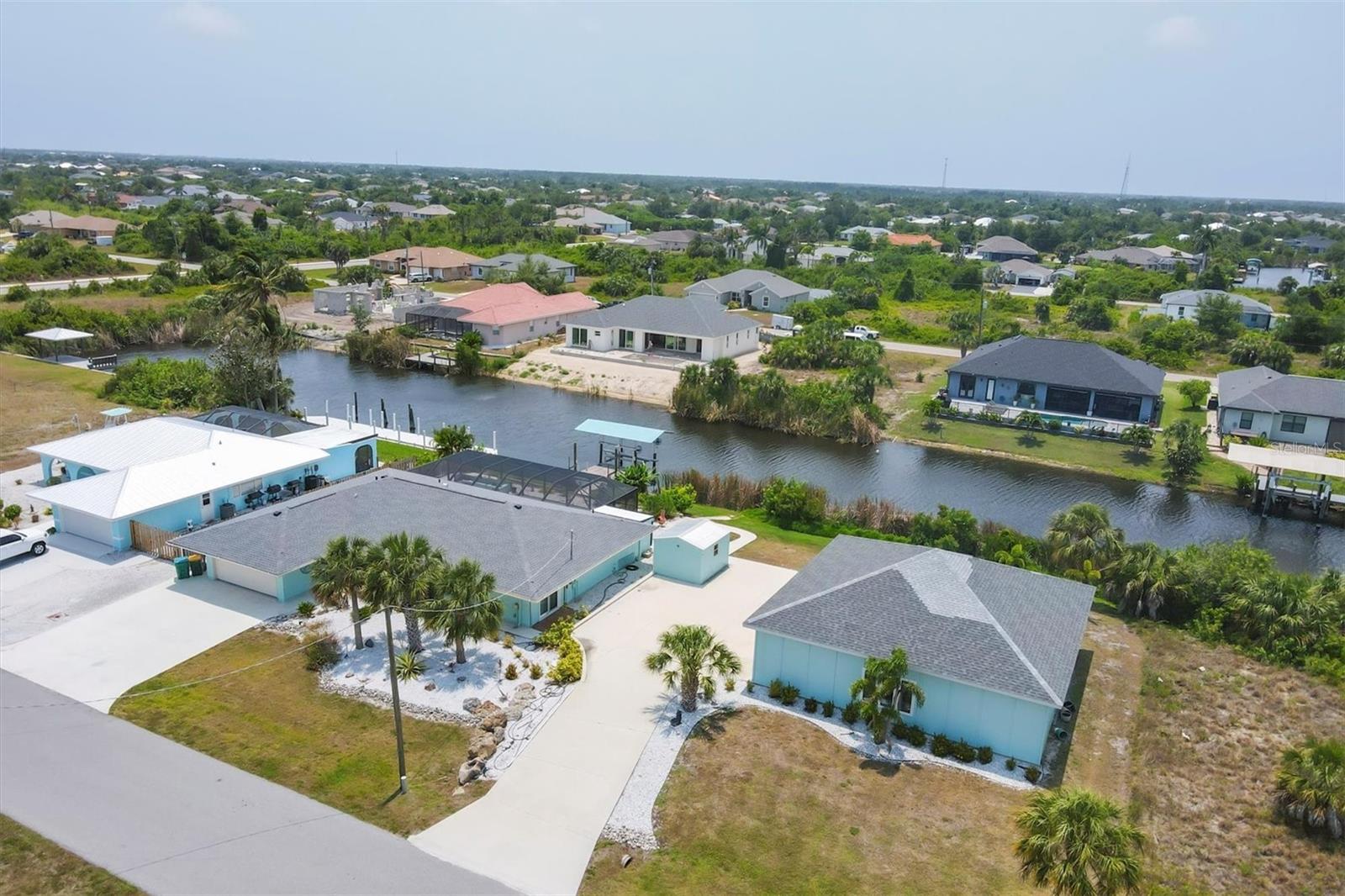 It's time to call this slice of Paradise in the beautiful Waterfront Community of South Gulf Cove your own. This amazing property has it all. This 3/2 waterfront home sits on a double lot with 160 ft. of water frontage with a cement walk way down to your dock and covered boat lift, and boasts a huge 40 x 40 detached garage for that car enthusiast, toy collector, woodworker etc. The possibilities are endless. Enjoy the mature landscaping of your tropical oasis. Walking through the updated decorative etched double front door (hurricane rated) you will notice the natural lighting through out the rooms. The spacious living room is enhanced by the large window and sliders that go out to the lanai/pool area. The beautifully renovated kitchen has been upgraded with gorgeous granite countertops, new tile backsplash, soft close cabinets with pull out shelves, hot water dispenser faucet and soap dispenser and newer stainless steel appliances. The natural light to the kitchen comes from the 3 large windows in the breakfast nook that overlook the pool/lanai area. The popular Florida split floor plan takes you into two nice size guest bedrooms on one side of the home that share the newly renovated oversized bath with a gorgeous tiled walk in shower and tiled bench that is accessible from the pool lanai. The oversized main bedroom is located on the opposite side of the home and features two sliders that take you out to the pool/lanai area. Off the main bedroom you walk into your newly remodeled main bath featuring a newly tiled walk in shower with a tiled bench. The laundry area is located down the hall from the Main Bedroom. If you are looking for an outdoor oasis, possibilities are endless with this property both in the lanai and outside of the lanai. The oversized lanai features a 14 x 28 size pool with an upgraded high efficiency pool heater. There is plenty of entertaining space to envision an outdoor bar area, outdoor kitchen, outside tiki bar area etc. There is plenty of parking with the added cement driveway for the detached garage, and additional storage in the 120 sq.ft. pre-built shed. Some of the additional upgrades to this property are: New roof (3/22), replaced AC (2017), Hurricane sliding doors (2019), New cement sidewalks across and behind the house, garage & Dock (2022), whole house repiped with PVC PEX tubing and fittings (2021), Garage and House painted (2020), Hot water heater (2019) This property has a lot to offer, make your appointment today.
