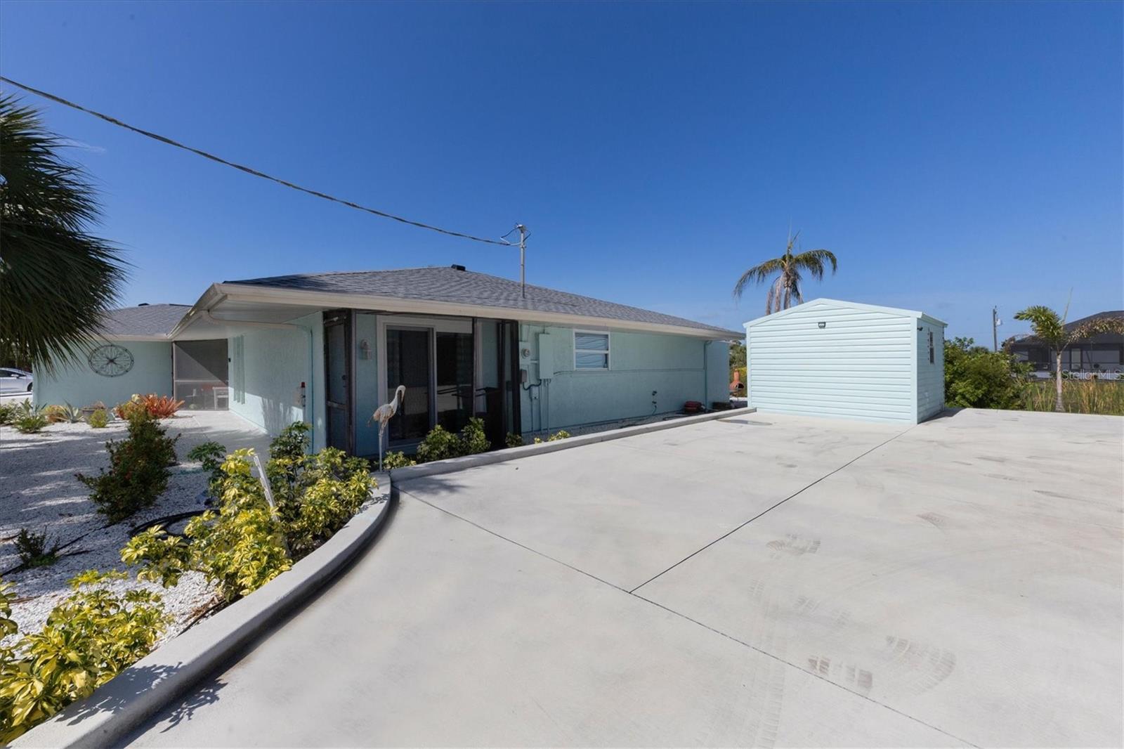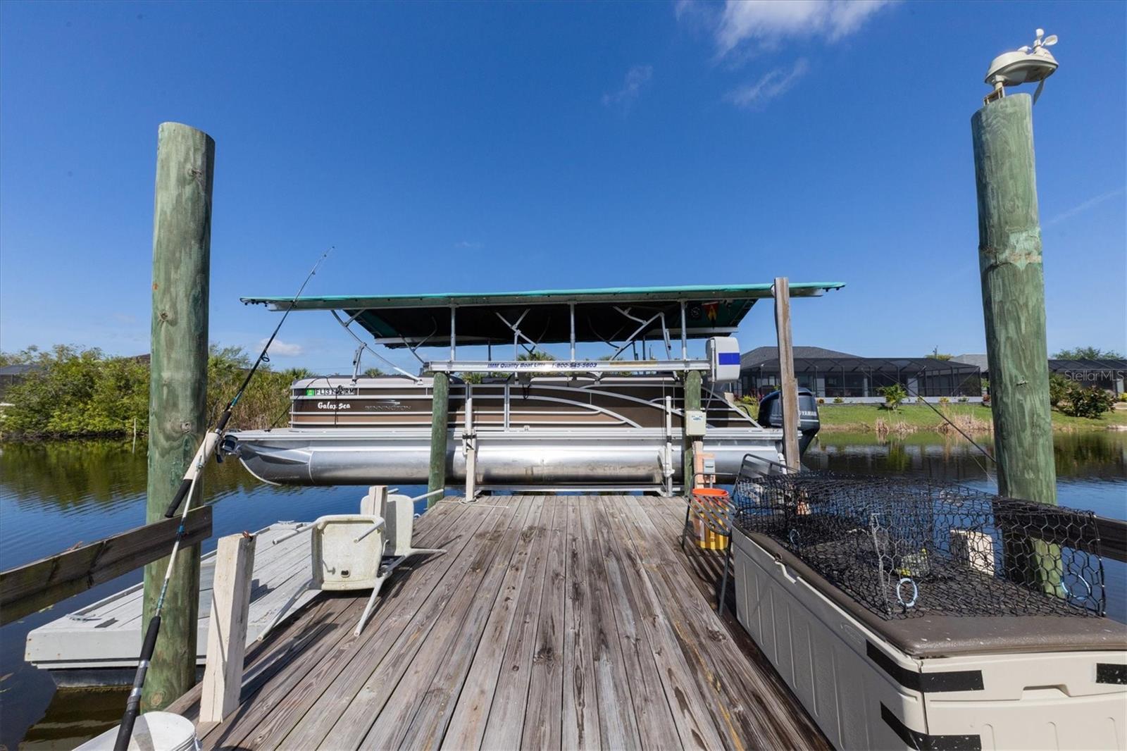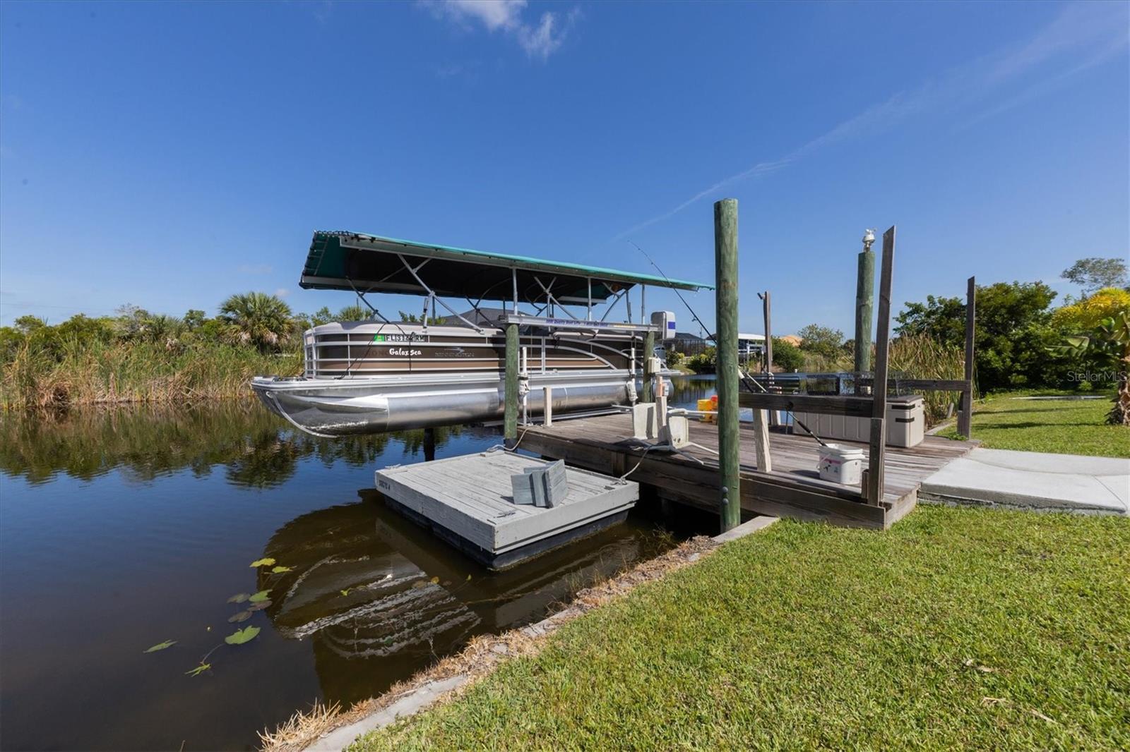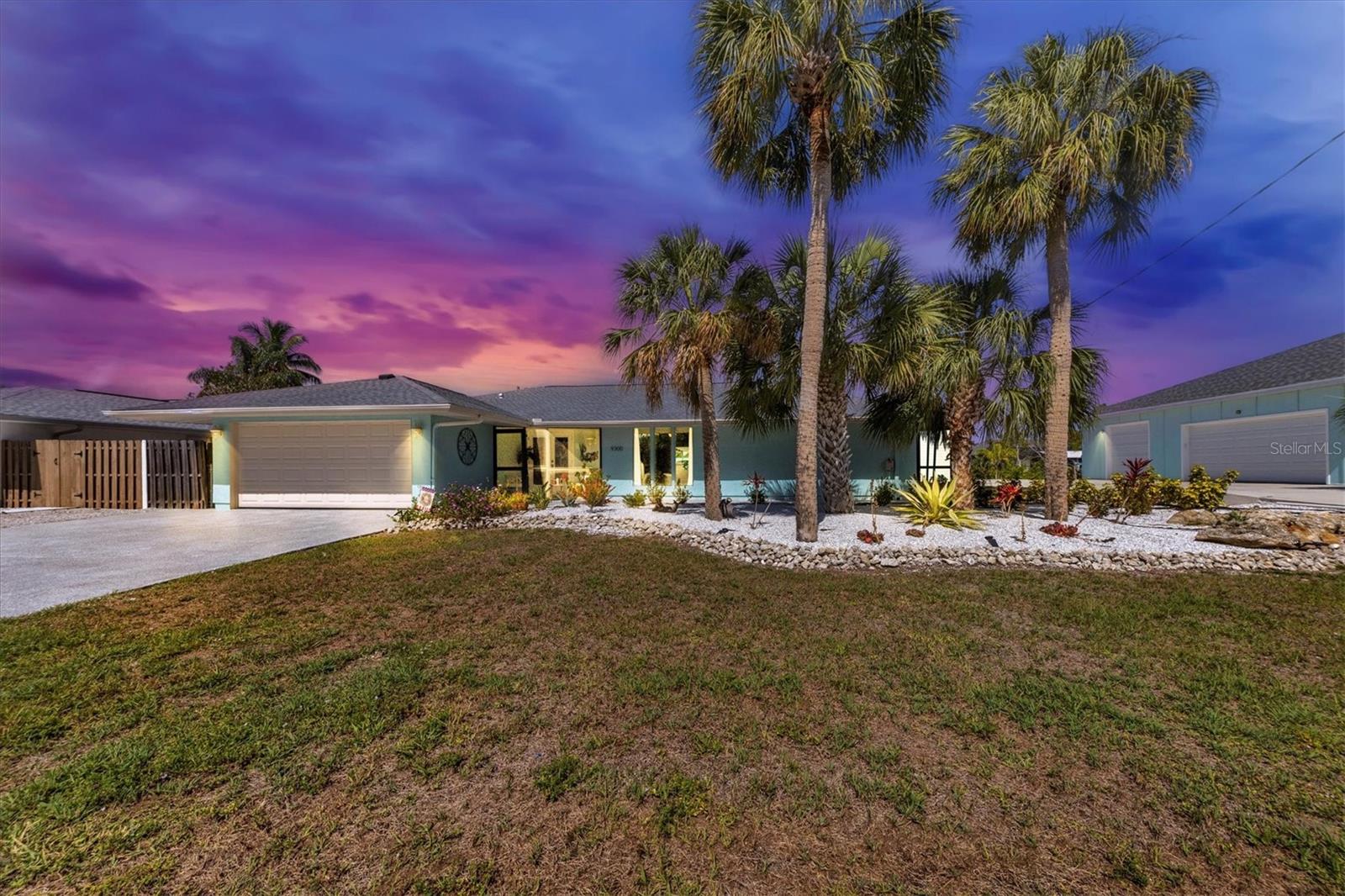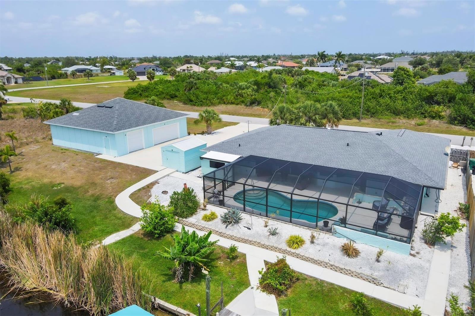 It's time to call this slice of Paradise in the beautiful Waterfront Community of South Gulf Cove your own. This amazing property has it all. This 3/2 waterfront home sits on a double lot with 160 ft. of water frontage with a cement walk way down to your dock and covered boat lift, and boasts a huge 40 x 40 detached garage for that car enthusiast, toy collector, woodworker etc. The possibilities are endless. Enjoy the mature landscaping of your tropical oasis. Walking through the updated decorative etched double front door (hurricane rated) you will notice the natural lighting through out the rooms. The spacious living room is enhanced by the large window and sliders that go out to the lanai/pool area. The beautifully renovated kitchen has been upgraded with gorgeous granite countertops, new tile backsplash, soft close cabinets with pull out shelves, hot water dispenser faucet and soap dispenser and newer stainless steel appliances. The natural light to the kitchen comes from the 3 large windows in the breakfast nook that overlook the pool/lanai area. The popular Florida split floor plan takes you into two nice size guest bedrooms on one side of the home that share the newly renovated oversized bath with a gorgeous tiled walk in shower and tiled bench that is accessible from the pool lanai. The oversized main bedroom is located on the opposite side of the home and features two sliders that take you out to the pool/lanai area. Off the main bedroom you walk into your newly remodeled main bath featuring a newly tiled walk in shower with a tiled bench. The laundry area is located down the hall from the Main Bedroom. If you are looking for an outdoor oasis, possibilities are endless with this property both in the lanai and outside of the lanai. The oversized lanai features a 14 x 28 size pool with an upgraded high efficiency pool heater. There is plenty of entertaining space to envision an outdoor bar area, outdoor kitchen, outside tiki bar area etc. There is plenty of parking with the added cement driveway for the detached garage, and additional storage in the 120 sq.ft. pre-built shed. Some of the additional upgrades to this property are: New roof (3/22), replaced AC (2017), Hurricane sliding doors (2019), New cement sidewalks across and behind the house, garage & Dock (2022), whole house repiped with PVC PEX tubing and fittings (2021), Garage and House painted (2020), Hot water heater (2019) This property has a lot to offer, make your appointment today.