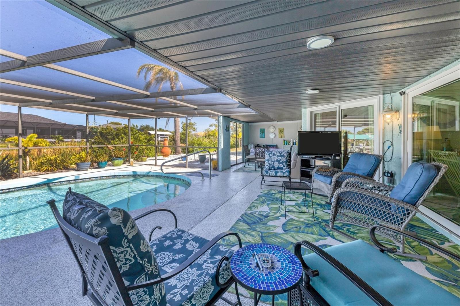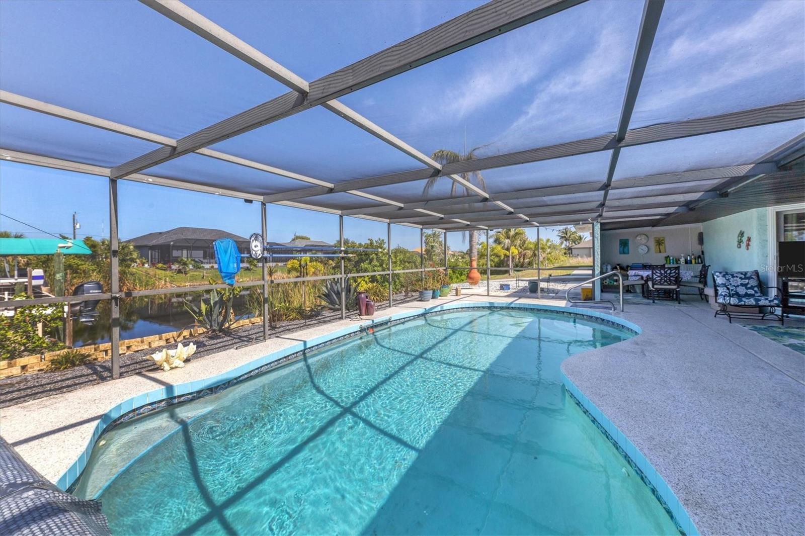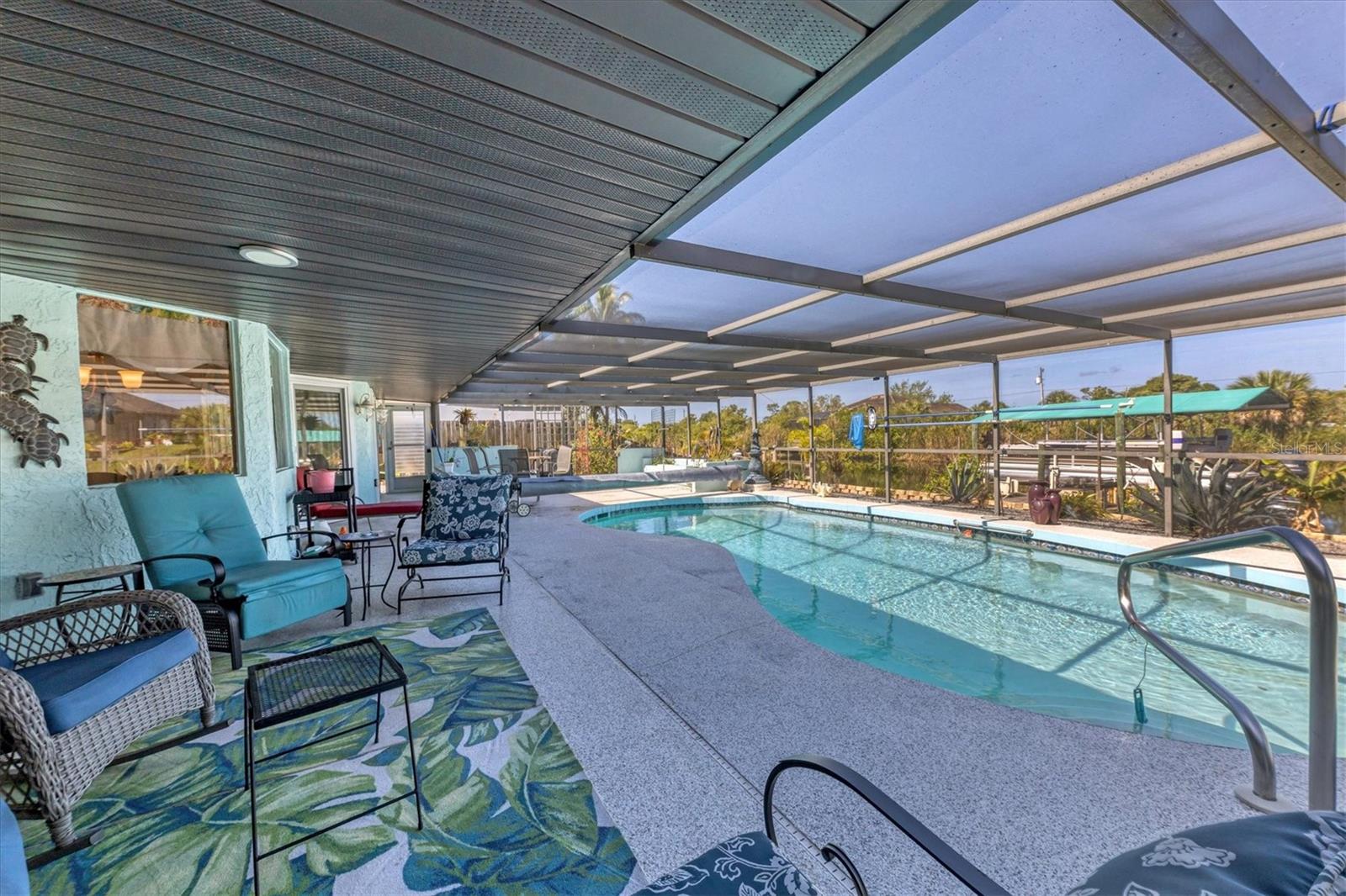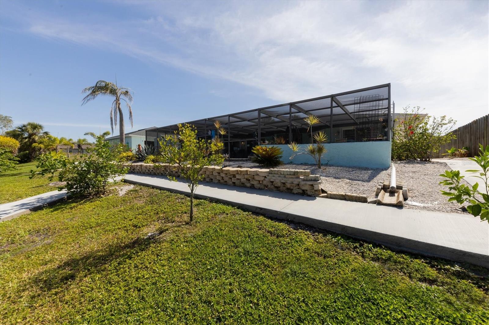 It's time to call this slice of Paradise in the beautiful Waterfront Community of South Gulf Cove your own. This amazing property has it all. This 3/2 waterfront home sits on a double lot with 160 ft. of water frontage with a cement walk way down to your dock and covered boat lift, and boasts a huge 40 x 40 detached garage for that car enthusiast, toy collector, woodworker etc. The possibilities are endless. Enjoy the mature landscaping of your tropical oasis. Walking through the updated decorative etched double front door (hurricane rated) you will notice the natural lighting through out the rooms. The spacious living room is enhanced by the large window and sliders that go out to the lanai/pool area. The beautifully renovated kitchen has been upgraded with gorgeous granite countertops, new tile backsplash, soft close cabinets with pull out shelves, hot water dispenser faucet and soap dispenser and newer stainless steel appliances. The natural light to the kitchen comes from the 3 large windows in the breakfast nook that overlook the pool/lanai area. The popular Florida split floor plan takes you into two nice size guest bedrooms on one side of the home that share the newly renovated oversized bath with a gorgeous tiled walk in shower and tiled bench that is accessible from the pool lanai. The oversized main bedroom is located on the opposite side of the home and features two sliders that take you out to the pool/lanai area. Off the main bedroom you walk into your newly remodeled main bath featuring a newly tiled walk in shower with a tiled bench. The laundry area is located down the hall from the Main Bedroom. If you are looking for an outdoor oasis, possibilities are endless with this property both in the lanai and outside of the lanai. The oversized lanai features a 14 x 28 size pool with an upgraded high efficiency pool heater. There is plenty of entertaining space to envision an outdoor bar area, outdoor kitchen, outside tiki bar area etc. There is plenty of parking with the added cement driveway for the detached garage, and additional storage in the 120 sq.ft. pre-built shed. Some of the additional upgrades to this property are: New roof (3/22), replaced AC (2017), Hurricane sliding doors (2019), New cement sidewalks across and behind the house, garage & Dock (2022), whole house repiped with PVC PEX tubing and fittings (2021), Garage and House painted (2020), Hot water heater (2019) This property has a lot to offer, make your appointment today.