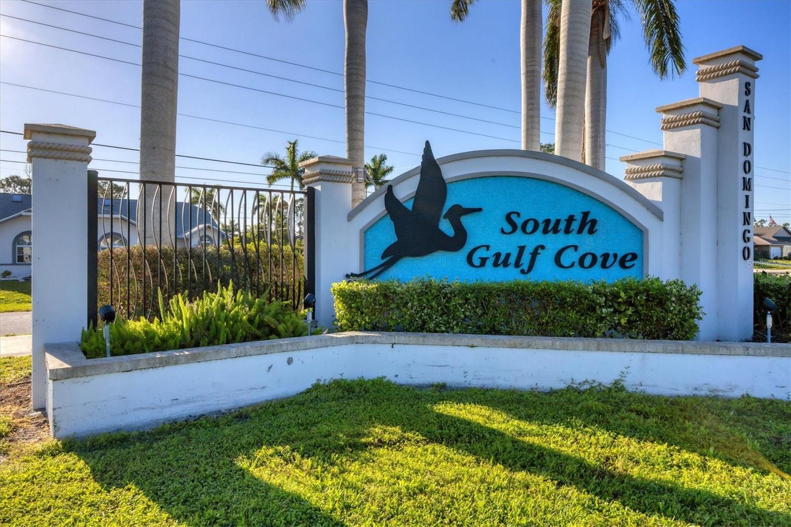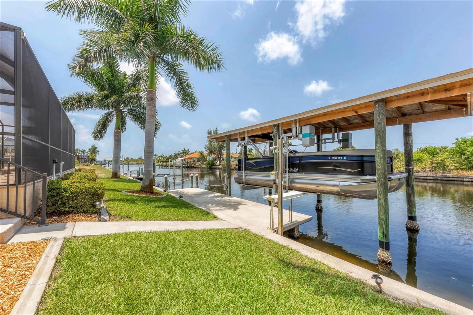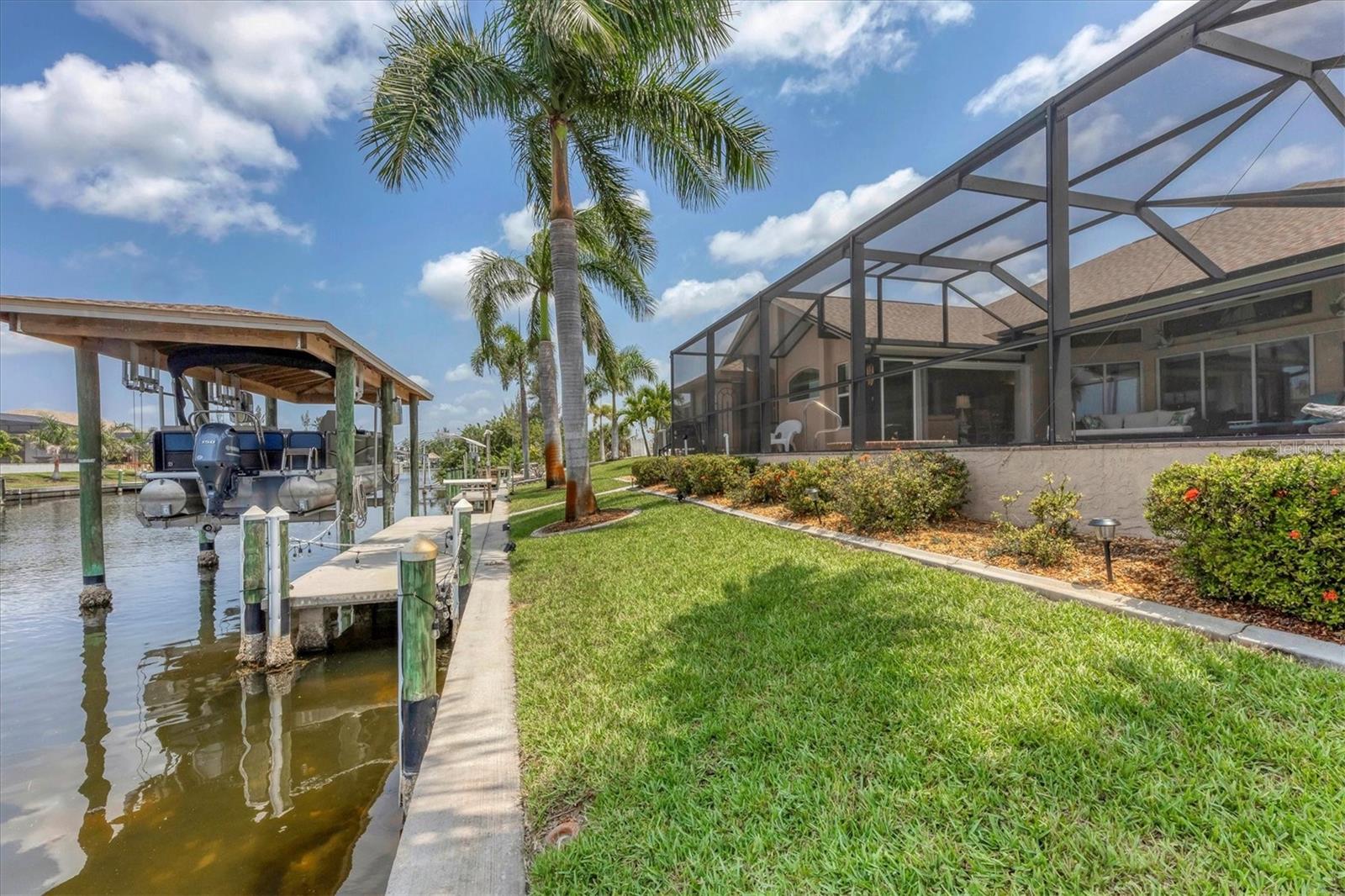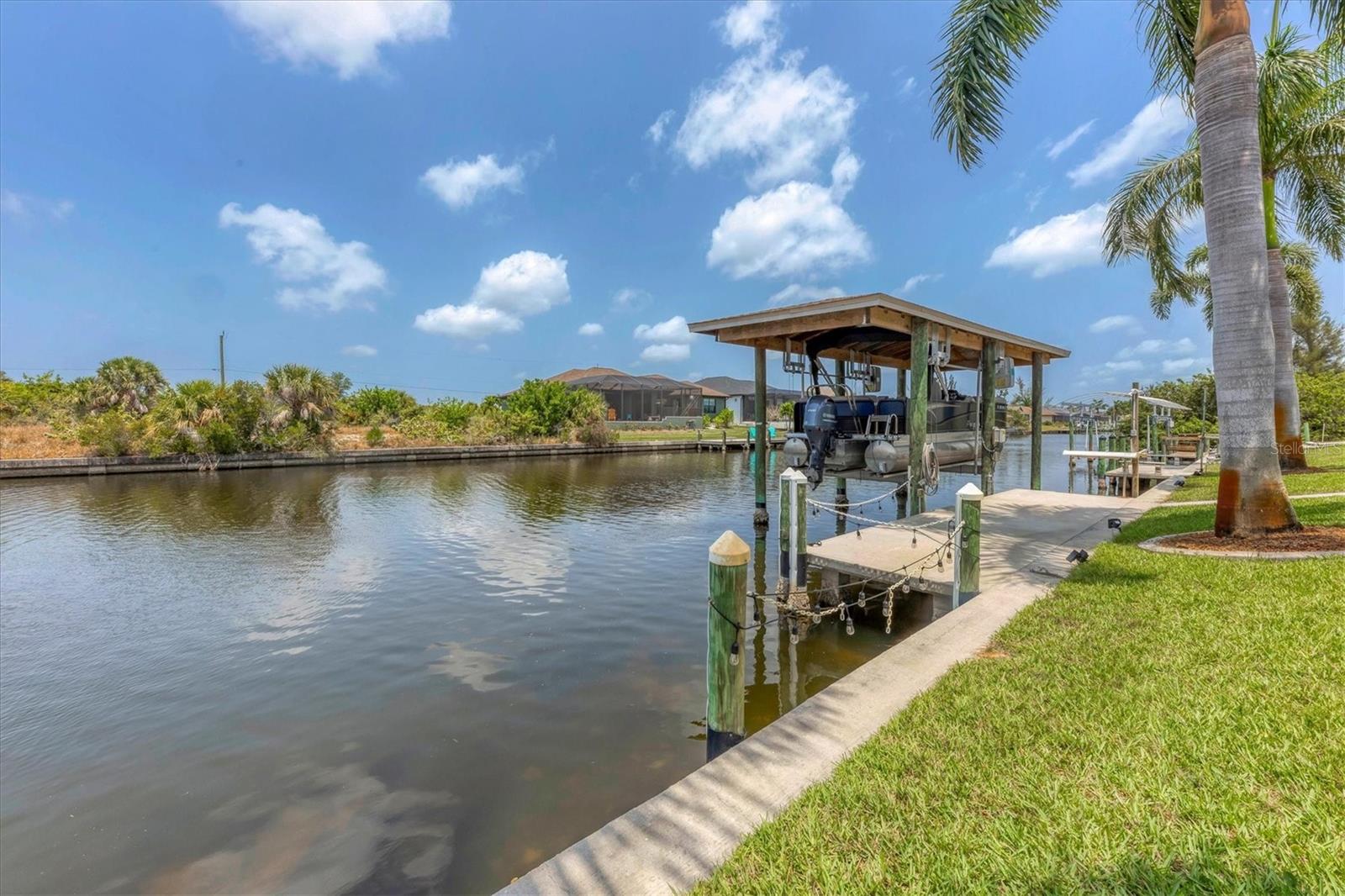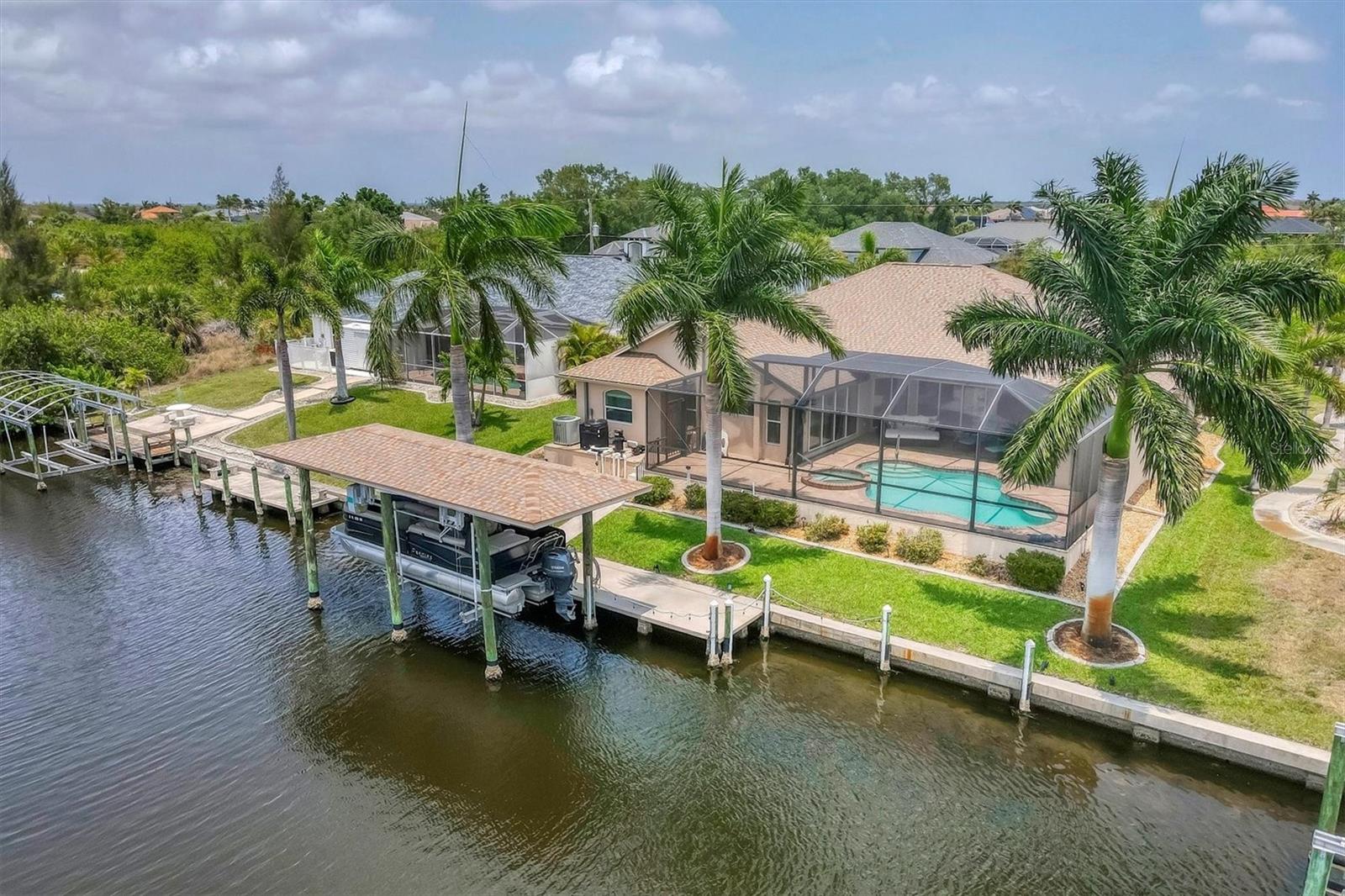 This luxurious home in the quiet neighborhood of South Gulf Cove has everything you need to experience waterfront living at its finest. This property features a seawall, concrete dock with fish cleaning station, water and electric, and the custom built covered 15,000 lb. boat lift roof matches the home roof and both were replaced in 2022. At first glance, this home welcomes you with its beautiful mature landscaping surrounding the home with a stamped concrete driveway and walkway. As you walk through the double entry doors the natural light that engulfs this home will highlight the spacious open concept with exquisite polished tile flooring. There is plenty of room for entertaining friends and family utilizing the two living room areas, formal dining area and breakfast nook all surrounded by the magnificent waterfront views and detailed Architecture. The kitchen is a culinary dream and is sure to impress featuring a kitchen bar, granite counter tops, wood cabinets, under cabinet lighting, built in wine rack, wine refrigerator, double ovens, an island Bosch cooktop with down draft, matching Bosch appliances and central vac system. The popular Florida split floor plan features the privacy of the main bedroom being separated from the guest bedrooms. The oversized main bedroom features a tray ceiling, a walk in closet and reach in closet with sliders that go out to the lanai. The main bathroom highlights dual vanities with granite countertops, private water closet, a glass enclosed walk in shower and relaxing garden soaking tub to unwind after a long day. The guest bedrooms both have reach in closets and share the guest bathroom which features a large walk in tiled shower and granite counters. The laundry room can be accessed both by the kitchen and through the garage which is perfect when working outside and includes a cabinet with sink and granite top, and shelving. The oversized double garage features an epoxy floor, cobalt metal cabinets, built in work area and extra space needed to store your toys. When the work is done and you are ready to mellow down and get some sun, your outdoor lanai space is where it's at. Float in your saltwater heated pool with upgraded wifi pool controls or relax those tired muscles in the attached saltwater hot tub. Sit under the cover of your lanai to read a book, or just watch your favorite tv show. It's your own slice of paradise including an outdoor shower, separate pool bath and pool storage room. You are located near some of the most beautiful beaches, Boca Grande, golf courses and you have access to some of the best fishing in Charlotte Harbor and the Gulf of Mexico.