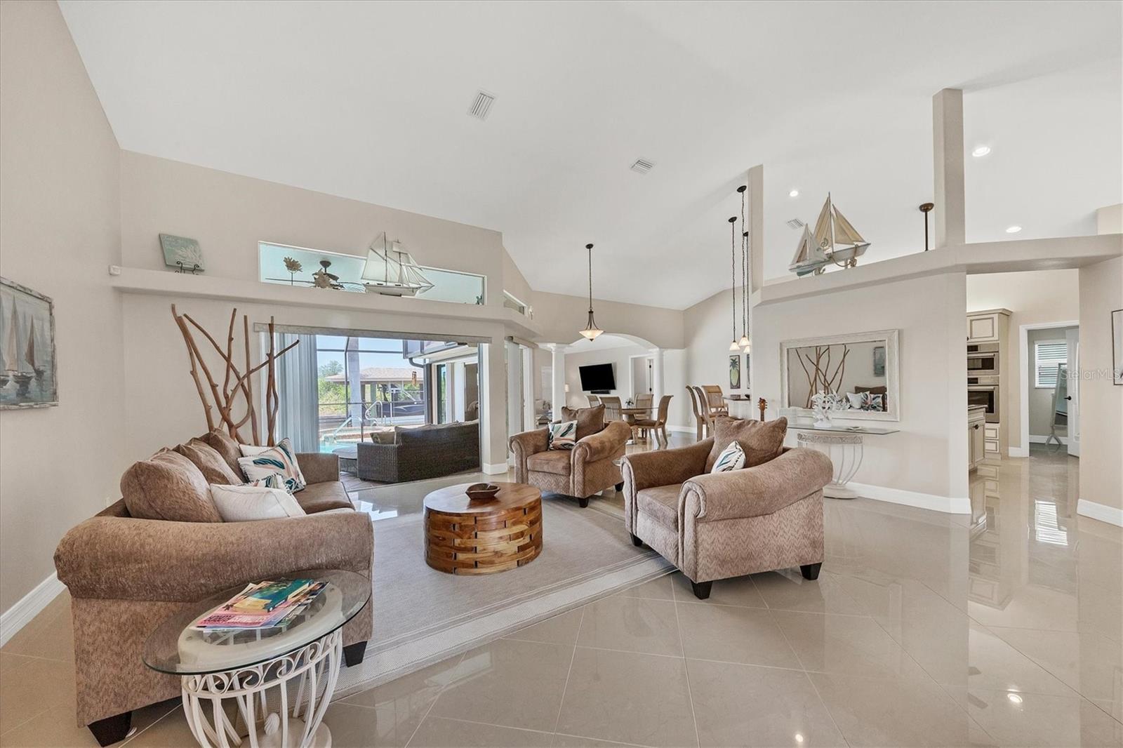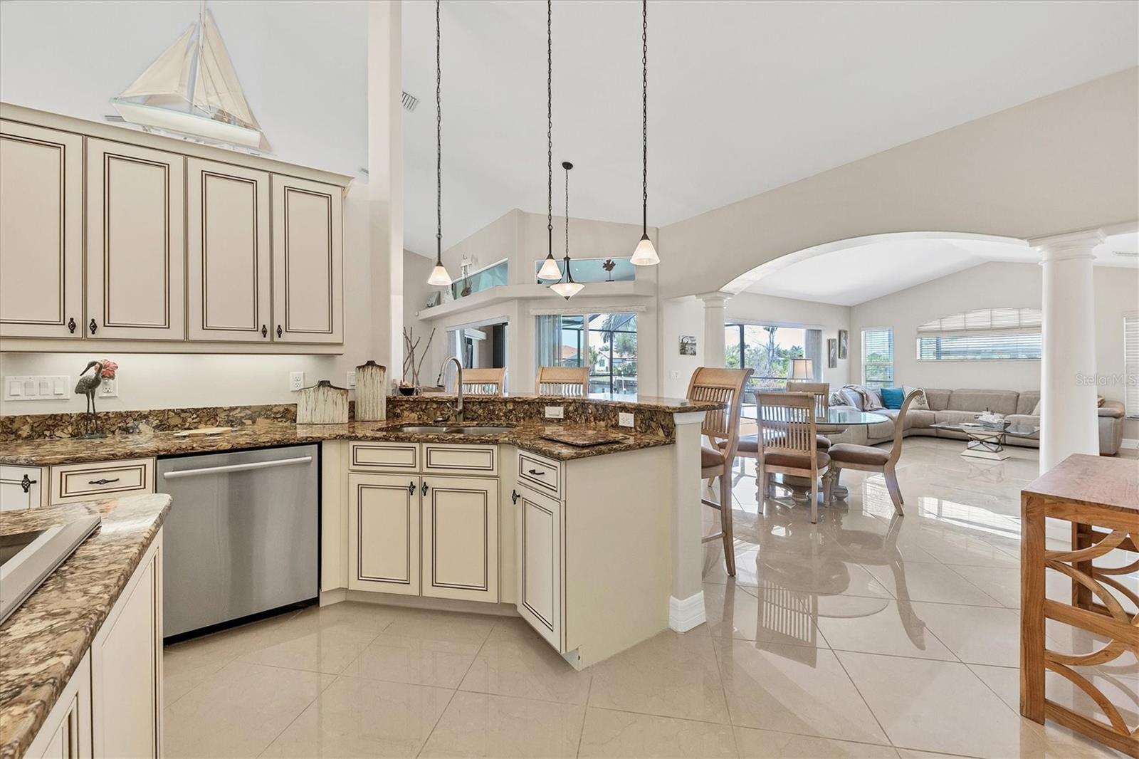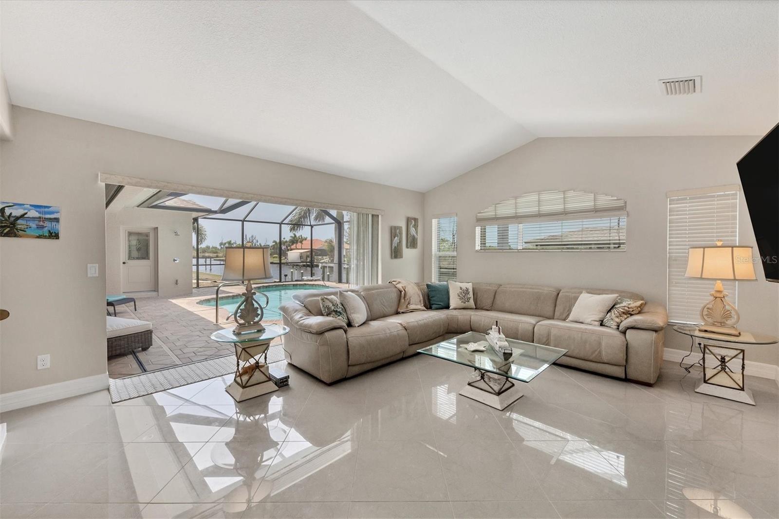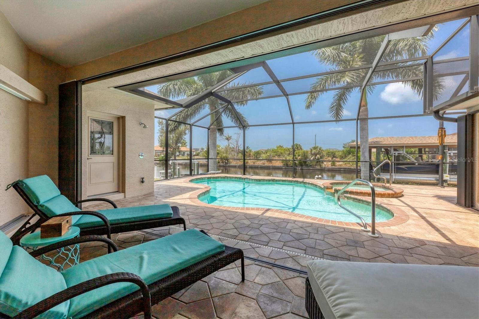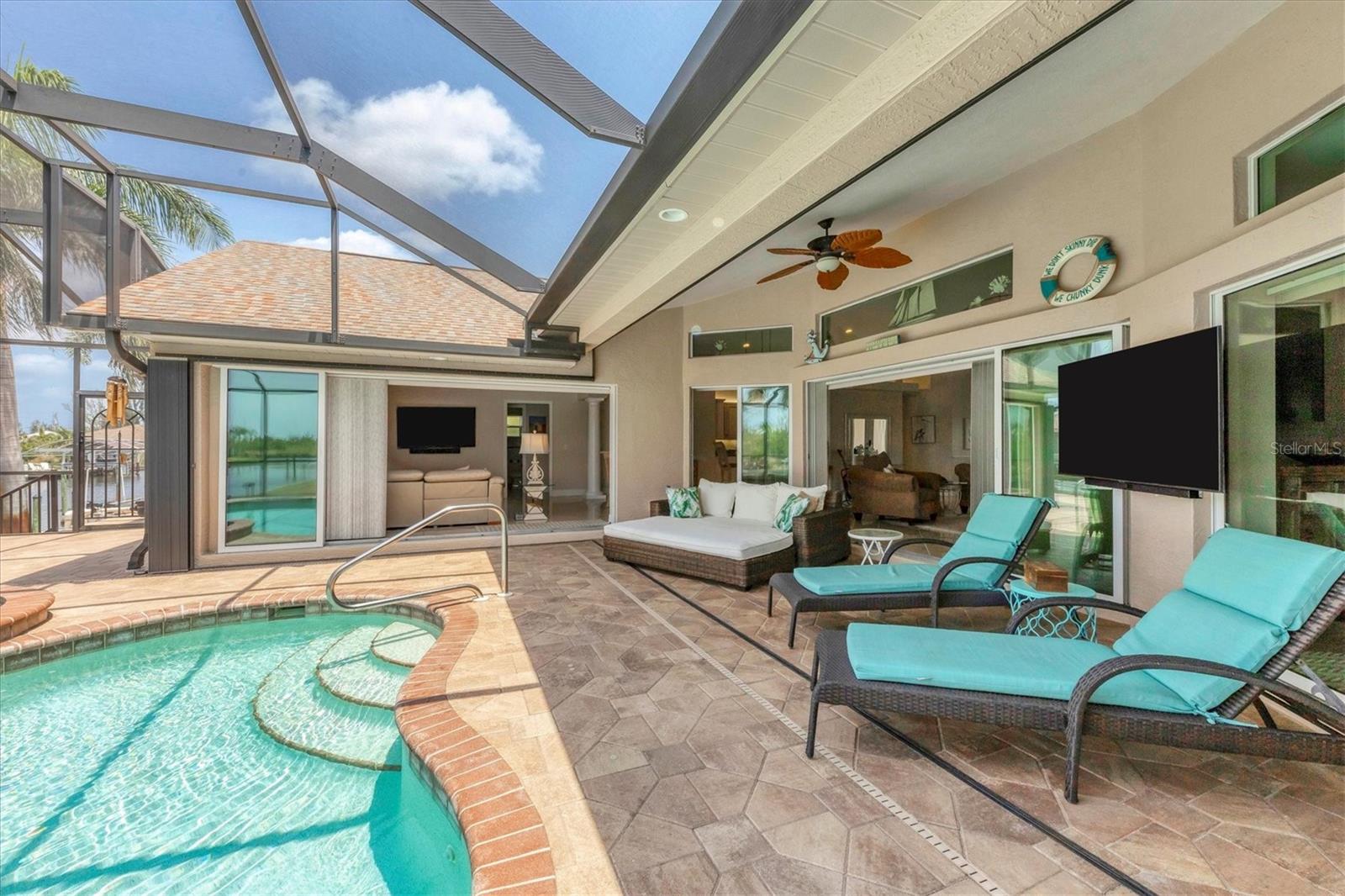 This luxurious home in the quiet neighborhood of South Gulf Cove has everything you need to experience waterfront living at its finest. This property features a seawall, concrete dock with fish cleaning station, water and electric, and the custom built covered 15,000 lb. boat lift roof matches the home roof and both were replaced in 2022. At first glance, this home welcomes you with its beautiful mature landscaping surrounding the home with a stamped concrete driveway and walkway. As you walk through the double entry doors the natural light that engulfs this home will highlight the spacious open concept with exquisite polished tile flooring. There is plenty of room for entertaining friends and family utilizing the two living room areas, formal dining area and breakfast nook all surrounded by the magnificent waterfront views and detailed Architecture. The kitchen is a culinary dream and is sure to impress featuring a kitchen bar, granite counter tops, wood cabinets, under cabinet lighting, built in wine rack, wine refrigerator, double ovens, an island Bosch cooktop with down draft, matching Bosch appliances and central vac system. The popular Florida split floor plan features the privacy of the main bedroom being separated from the guest bedrooms. The oversized main bedroom features a tray ceiling, a walk in closet and reach in closet with sliders that go out to the lanai. The main bathroom highlights dual vanities with granite countertops, private water closet, a glass enclosed walk in shower and relaxing garden soaking tub to unwind after a long day. The guest bedrooms both have reach in closets and share the guest bathroom which features a large walk in tiled shower and granite counters. The laundry room can be accessed both by the kitchen and through the garage which is perfect when working outside and includes a cabinet with sink and granite top, and shelving. The oversized double garage features an epoxy floor, cobalt metal cabinets, built in work area and extra space needed to store your toys. When the work is done and you are ready to mellow down and get some sun, your outdoor lanai space is where it's at. Float in your saltwater heated pool with upgraded wifi pool controls or relax those tired muscles in the attached saltwater hot tub. Sit under the cover of your lanai to read a book, or just watch your favorite tv show. It's your own slice of paradise including an outdoor shower, separate pool bath and pool storage room. You are located near some of the most beautiful beaches, Boca Grande, golf courses and you have access to some of the best fishing in Charlotte Harbor and the Gulf of Mexico.