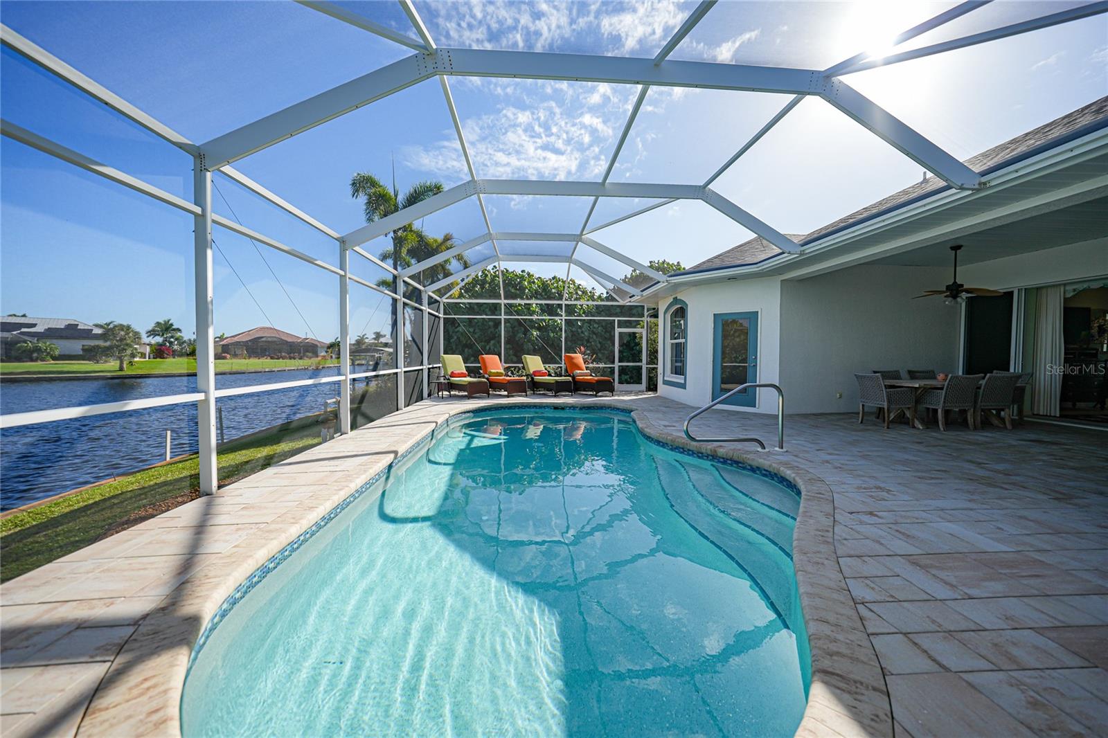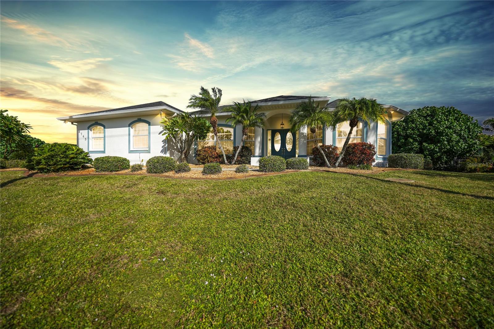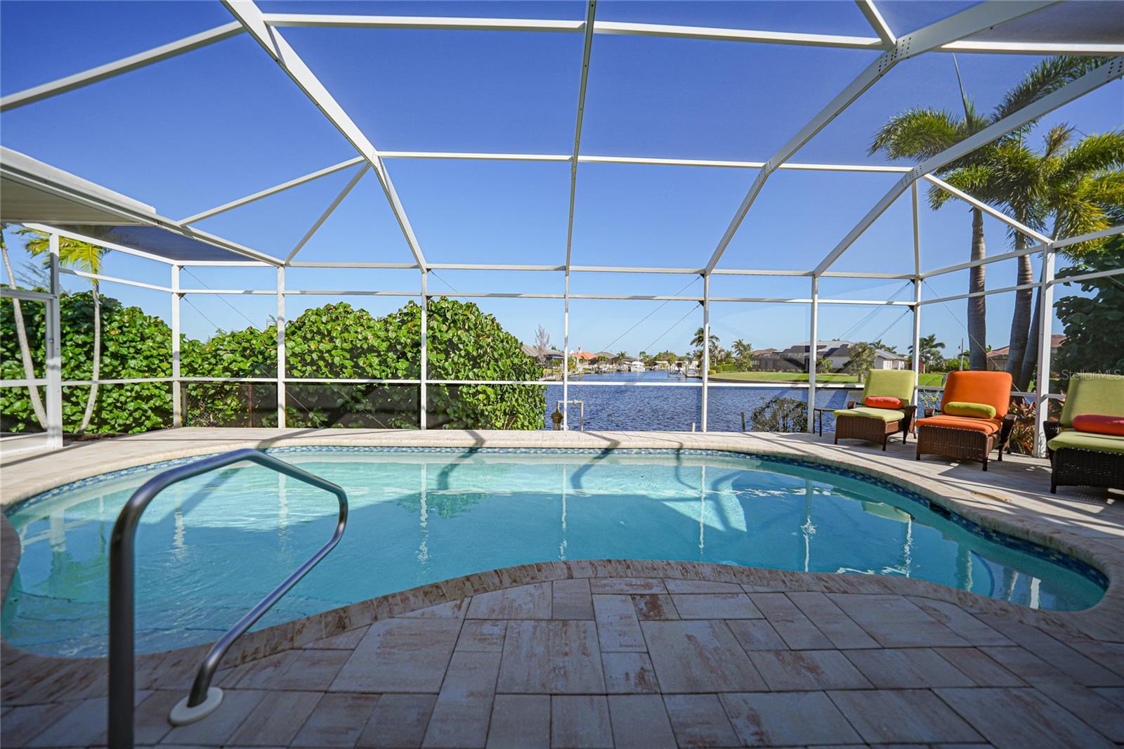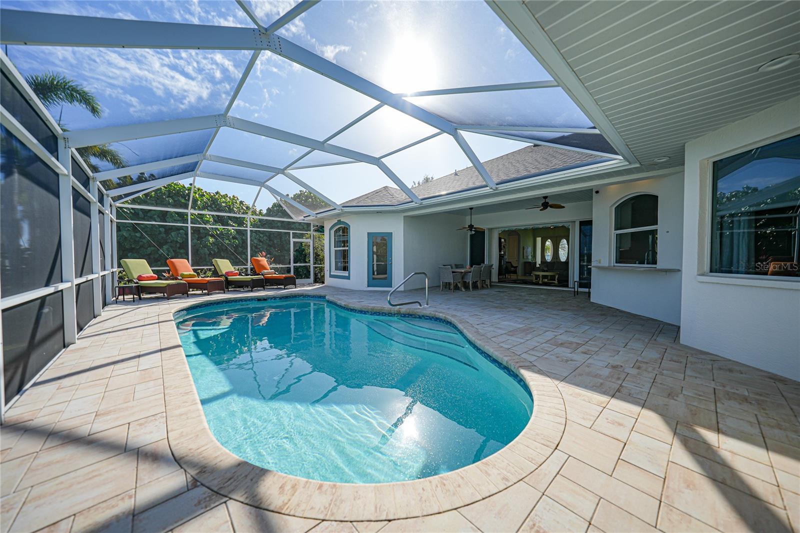 SAILBOAT WATER on DOUBLE LOT on over 1/2 an acre with 2628 heated living sq ft and a total sq ft of 3580. Enjoy the views down the canal. This heated swimming pool home features 3 bedrooms + OFFICE/4th bedroom or In-Law Suite and 2 1/2 bathrooms. The kitchen has a walk-in pantry and a pass-through window overlooking lanai-pool and canal. The kitchen also has a large center island, granite counters and glass backsplash, new french door refrigerator, glass top range and convection oven never used. Living room has 9 ft ceilings with a wall of windows that show off the lanai, pool and canal views. The primary suite is located on one side of the home with a private entrance/exit to the pool/lanai/canal. The primary suite also includes TWO walk-in closets, views of the waterway in the front of the home and canal in the back of the home. The primary ensuite offers large walk-in shower with dual shower heads, built-in dressing table, dual vanities and private toilet area. The bonus/flex room is a great office/workout room utilizing the private entrance. The additional 2 bedrooms are on the opposite side of the home along with 2nd full bathroom. The amazing screened in lanai and pool area have a 1/2 bath, newer paved deck and refurbished pool with glass tile. This double lot also has a shed for additional storage. A 30x60 fenced yard great for the little ones or dogs and even has a separate door office area. (2023) New Roof, new A/C, On-Demand hot water heater, pool cage new screens, (2022) pool heat pump, paddle fans through home. Additional assets all toilets are 1 piece, sprinkler system by well for irrigation. South Gulf Cove offers several parks, community center and more. Located about 12 miles to Englewood Beach, about 6 miles to 5 public golf courses and several restaurants, shops and more all within 10 miles.