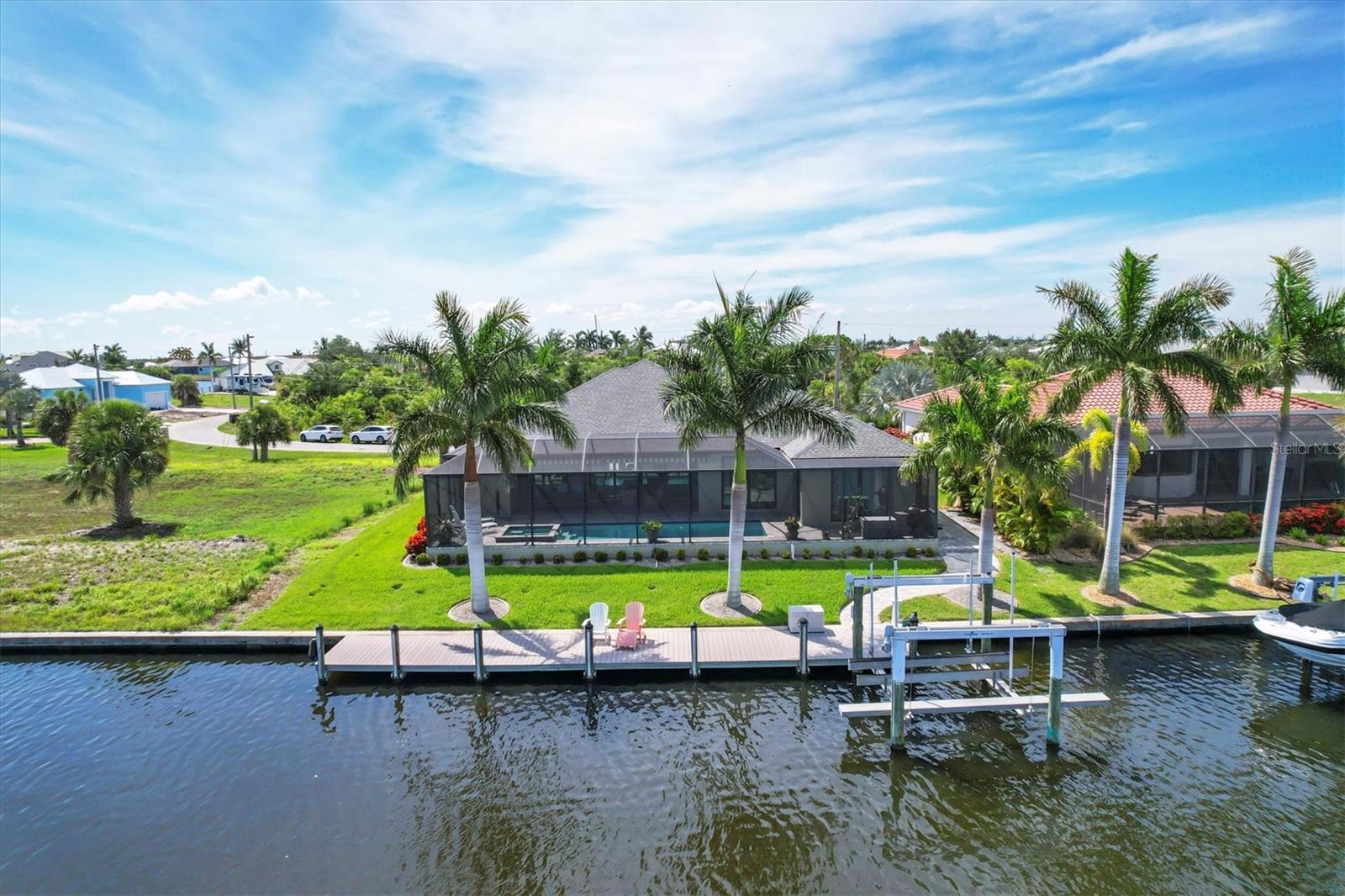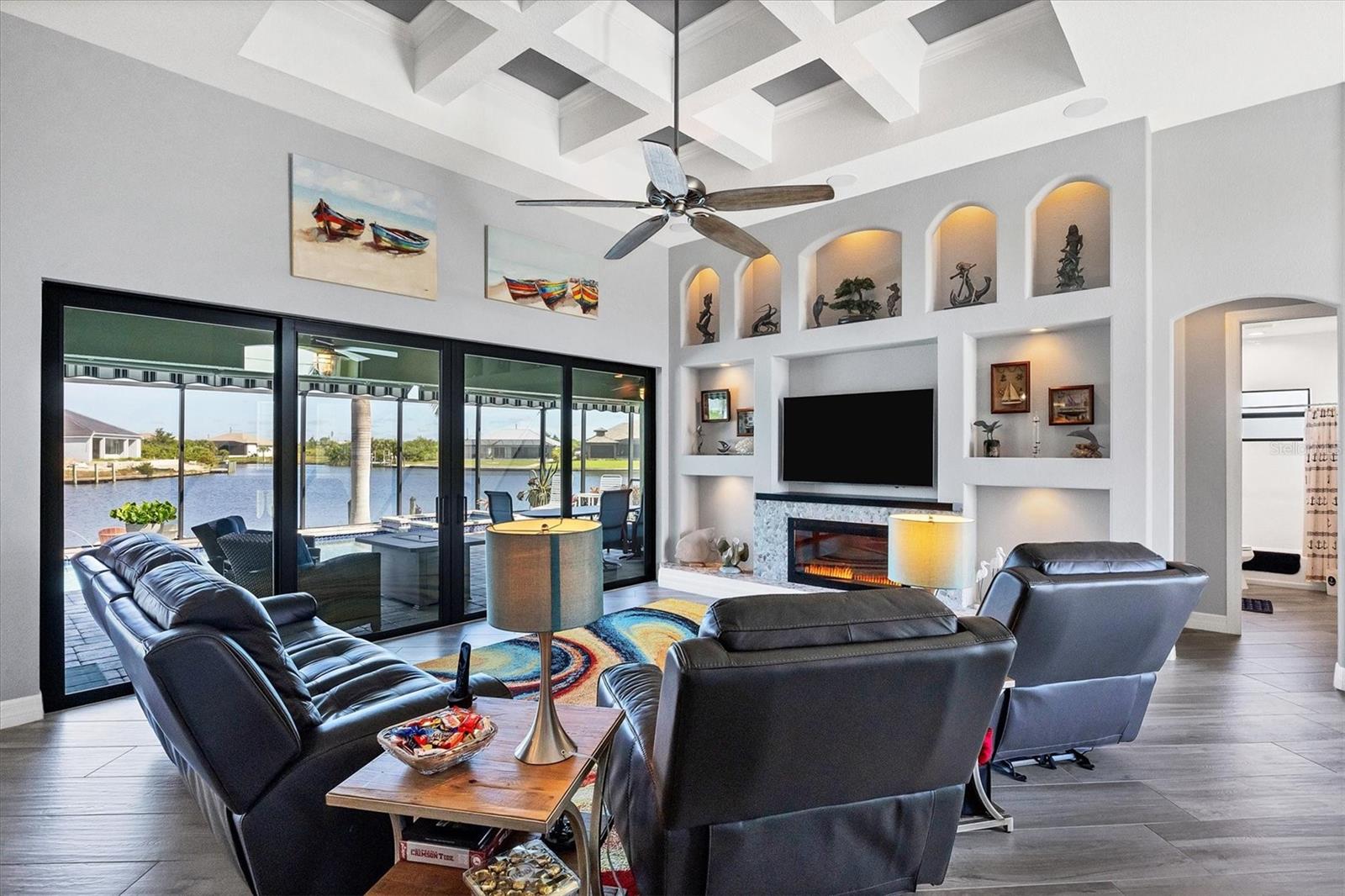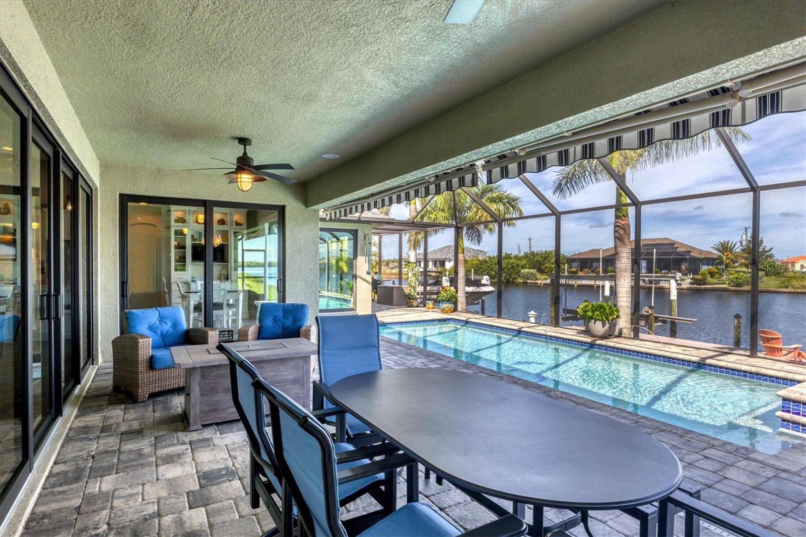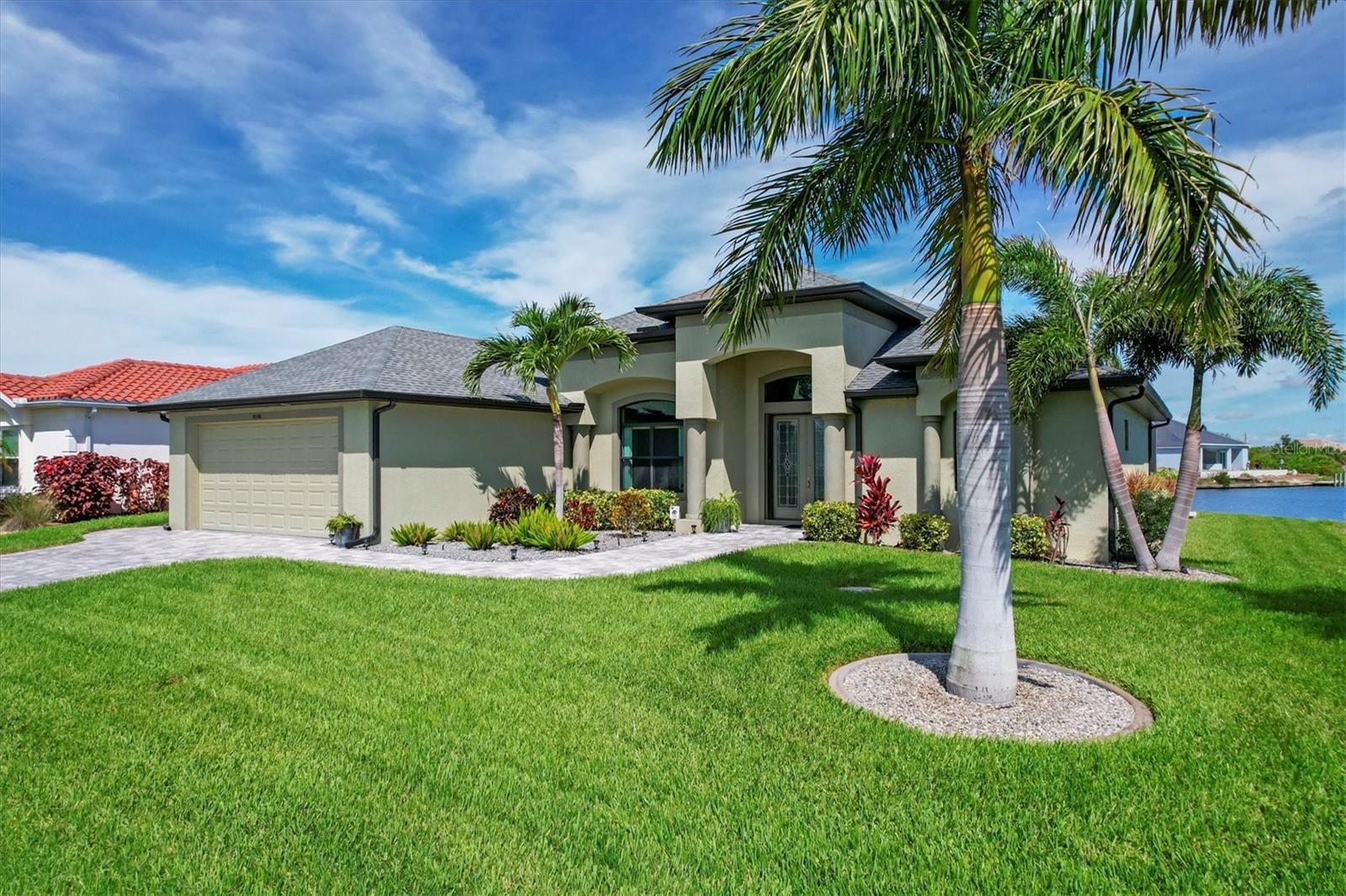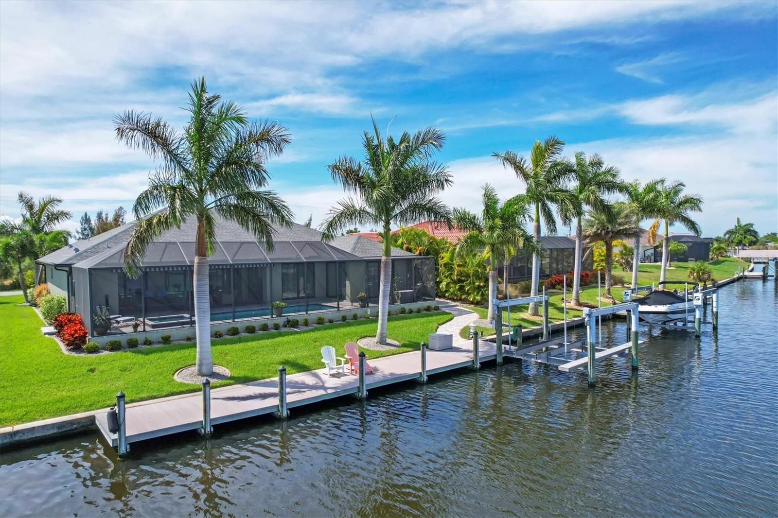 Welcome to paradise in this stunning executive home nestled in a prime Gulf access location with coveted western exposure and intersecting canal views! Sailboat water enthusiasts will delight in the 3-bedroom, 2.5-bath retreat featuring a luxurious pool and spa, complemented by plank tile floors throughout. Step inside to discover a family room adorned with a coffered ceiling, custom built-ins, and a cozy fireplace, all illuminated by an expansive 8-foot zero-degree slider. The gourmet kitchen boasts custom cabinetry, quartz counters and an island, a propane range, a walk-in pantry, and a stylish subway tile backsplash. The primary bedroom is a sanctuary with its tray ceiling, shiplap accent wall, and dual sets of sliding glass doors leading outdoors. The ensuite bath features quartz counters, a walk-in shower, a bidet, upgraded tiles, and a colossal (12x10) custom walk-in closet. Two sizable guest suites offer comfort and privacy, with the guest bathroom showcasing quartz counters. A private den is thoughtfully equipped with a 2-built-in desk and cabinets, perfect for remote work or study. Outside, the lanai beckons with its paver deck, heated pool, and spa. Remote Sunseeker awnings offer extra sun protection and a convenient pool bath for all guests. A 54-foot composite dock along the seawall includes water and electric service, complemented by a 16k boat lift. Additional features abound, including impact glass throughout, roof 2023, spray foam insulation over the house and garage for energy efficiency, surround sound, Ring doorbell and 6 cameras, central vacuum system, irrigation, a mini-split AC in the garage with an 18-foot-wide door for ample space, two outdoor storage sheds, and a generator hookup. This exceptional property blends luxury with functionality, offering the quintessential Florida lifestyle with every imaginable amenity for discerning homeowners. Discover waterfront living at its finest in this meticulously crafted residence. Schedule your private tour today and envision life in this coastal dream home.