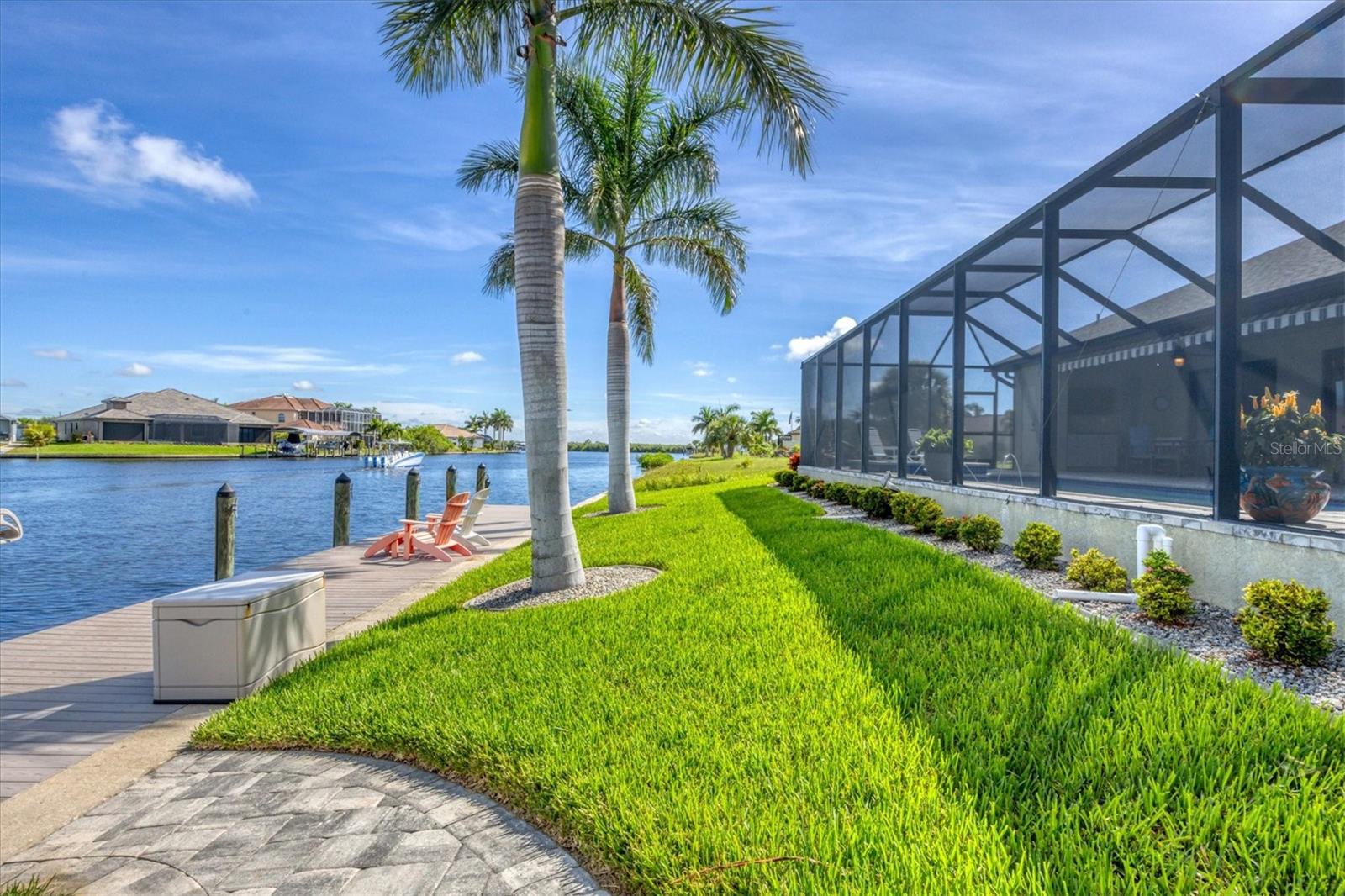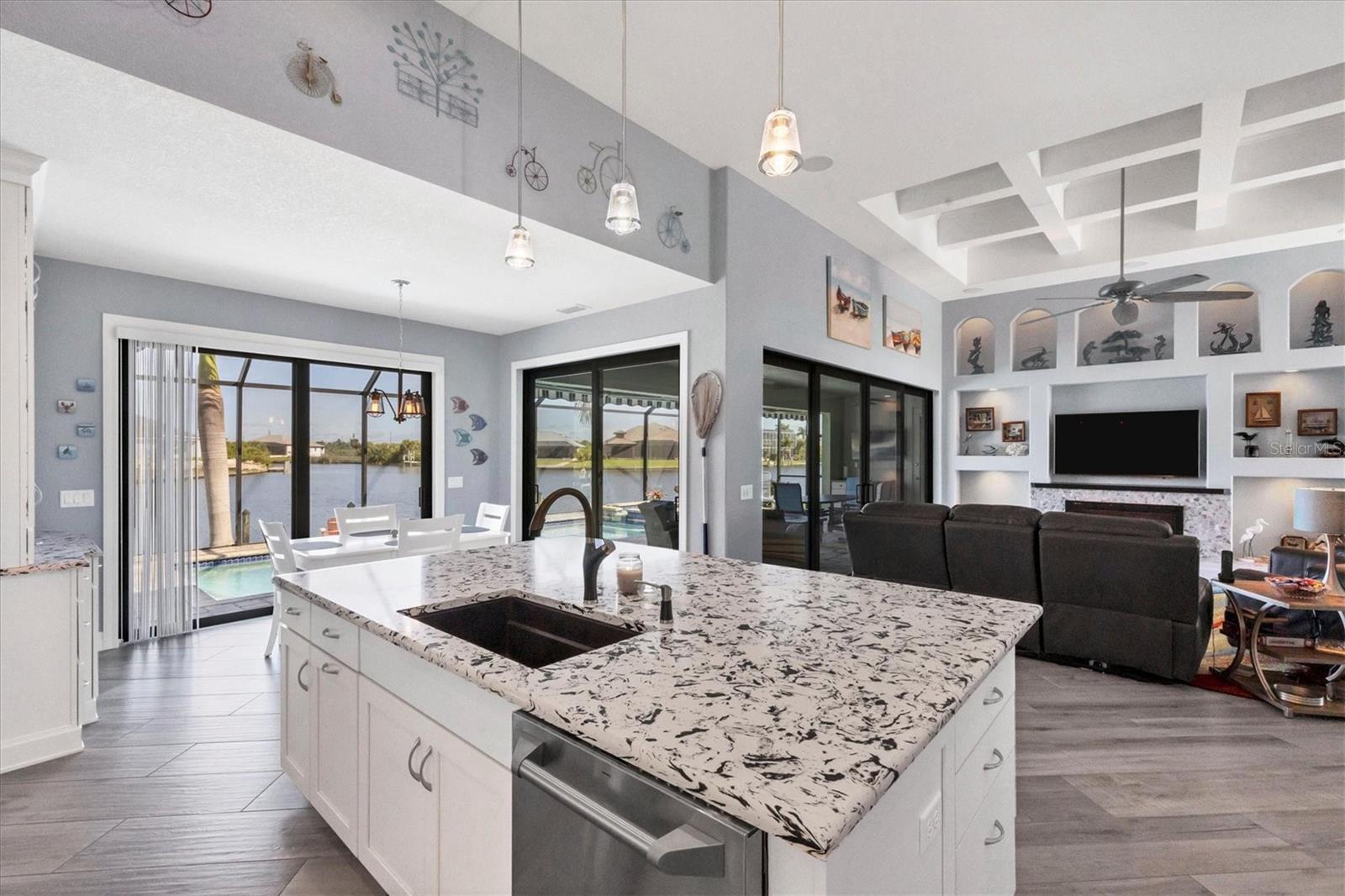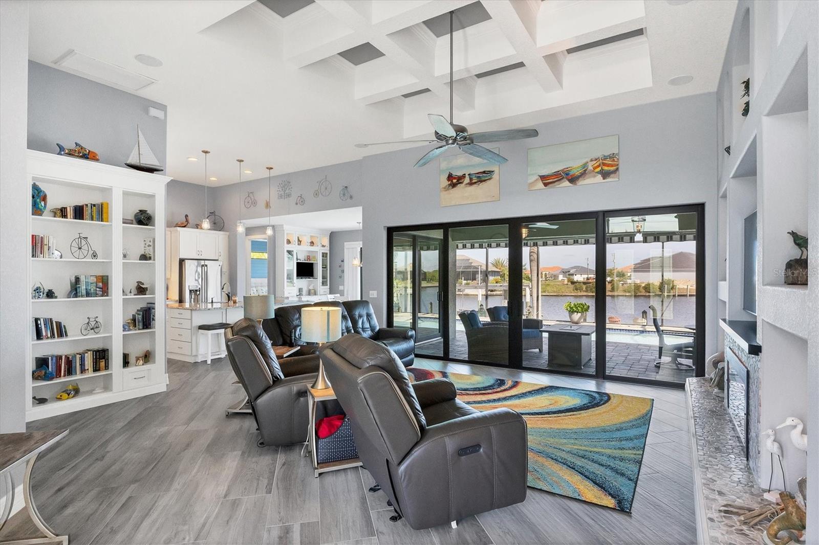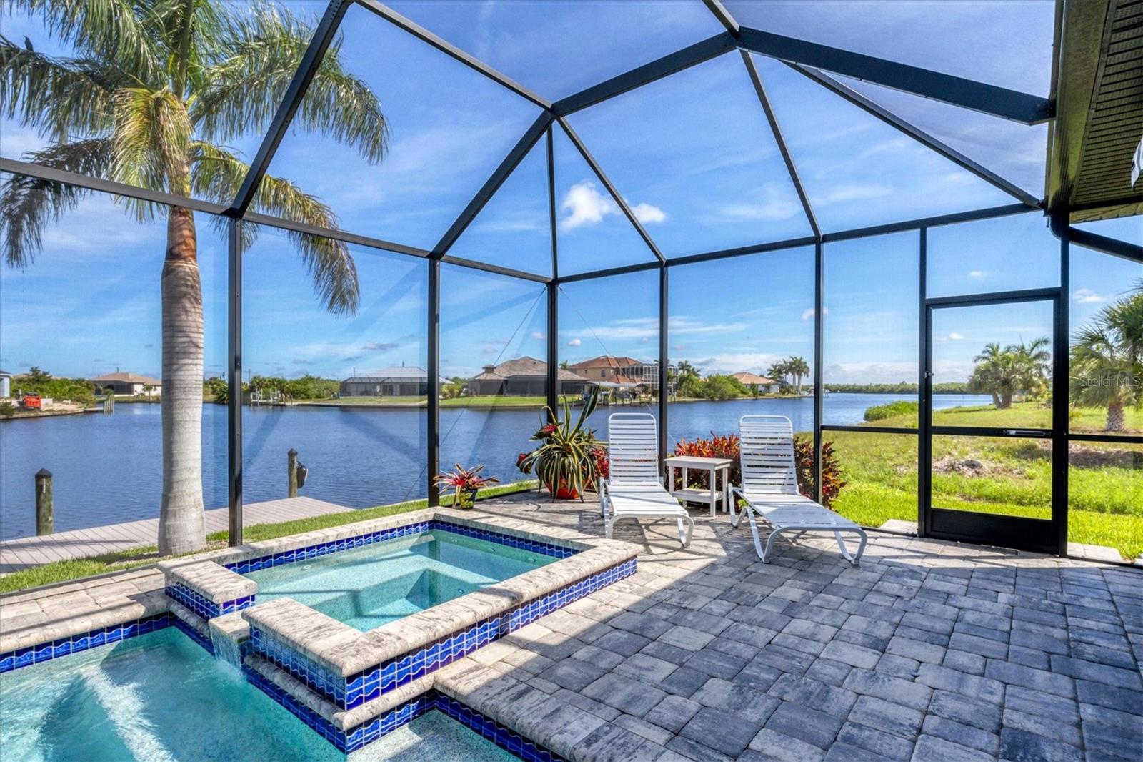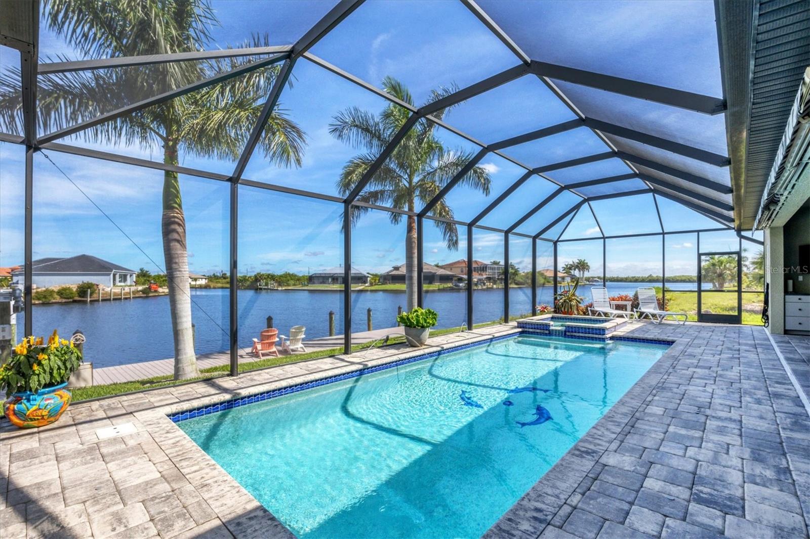 Welcome to paradise in this stunning executive home nestled in a prime Gulf access location with coveted western exposure and intersecting canal views! Sailboat water enthusiasts will delight in the 3-bedroom, 2.5-bath retreat featuring a luxurious pool and spa, complemented by plank tile floors throughout. Step inside to discover a family room adorned with a coffered ceiling, custom built-ins, and a cozy fireplace, all illuminated by an expansive 8-foot zero-degree slider. The gourmet kitchen boasts custom cabinetry, quartz counters and an island, a propane range, a walk-in pantry, and a stylish subway tile backsplash. The primary bedroom is a sanctuary with its tray ceiling, shiplap accent wall, and dual sets of sliding glass doors leading outdoors. The ensuite bath features quartz counters, a walk-in shower, a bidet, upgraded tiles, and a colossal (12x10) custom walk-in closet. Two sizable guest suites offer comfort and privacy, with the guest bathroom showcasing quartz counters. A private den is thoughtfully equipped with a 2-built-in desk and cabinets, perfect for remote work or study. Outside, the lanai beckons with its paver deck, heated pool, and spa. Remote Sunseeker awnings offer extra sun protection and a convenient pool bath for all guests. A 54-foot composite dock along the seawall includes water and electric service, complemented by a 16k boat lift. Additional features abound, including impact glass throughout, roof 2023, spray foam insulation over the house and garage for energy efficiency, surround sound, Ring doorbell and 6 cameras, central vacuum system, irrigation, a mini-split AC in the garage with an 18-foot-wide door for ample space, two outdoor storage sheds, and a generator hookup. This exceptional property blends luxury with functionality, offering the quintessential Florida lifestyle with every imaginable amenity for discerning homeowners. Discover waterfront living at its finest in this meticulously crafted residence. Schedule your private tour today and envision life in this coastal dream home.