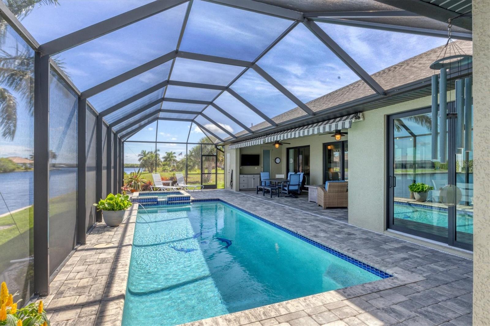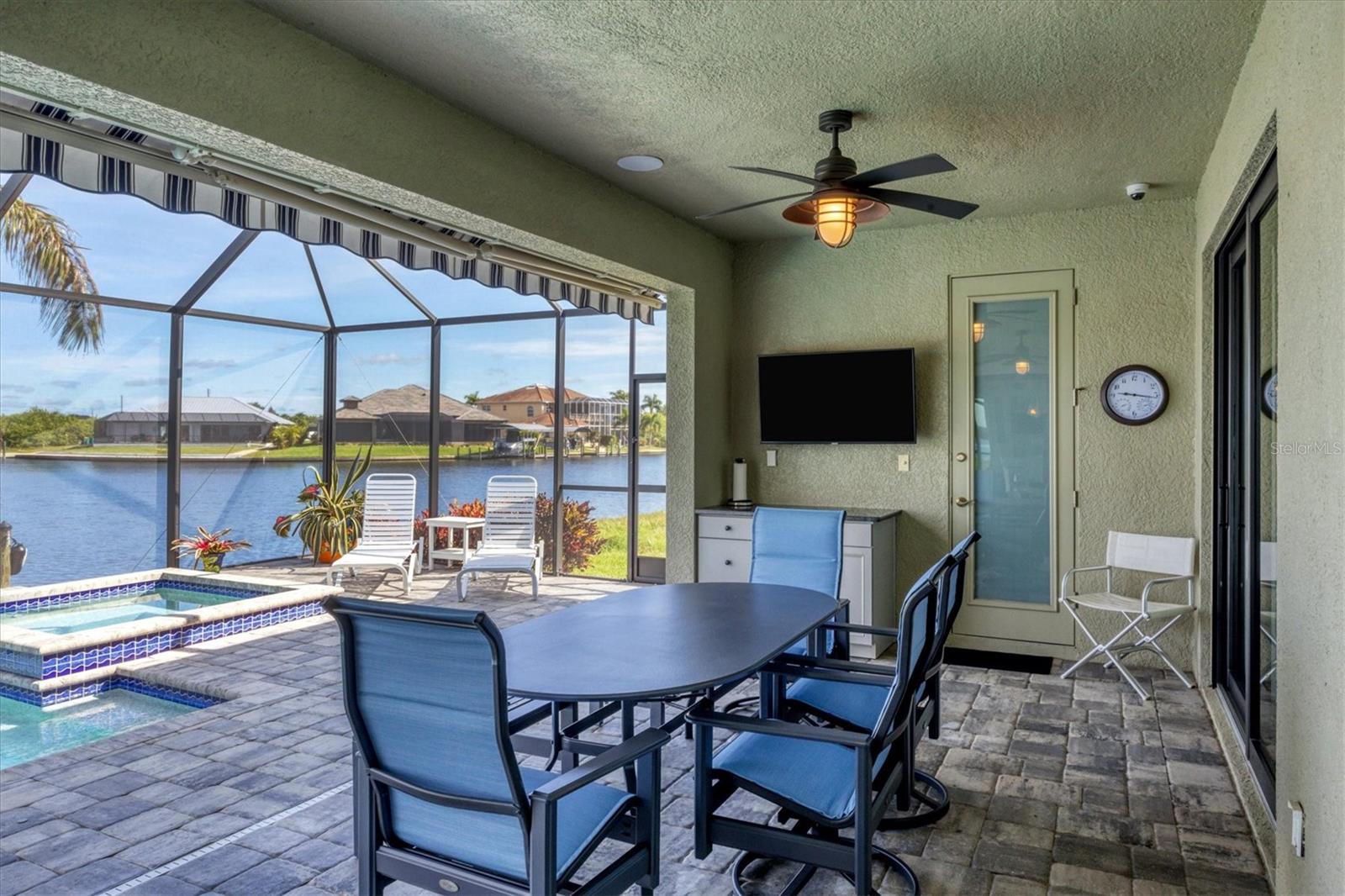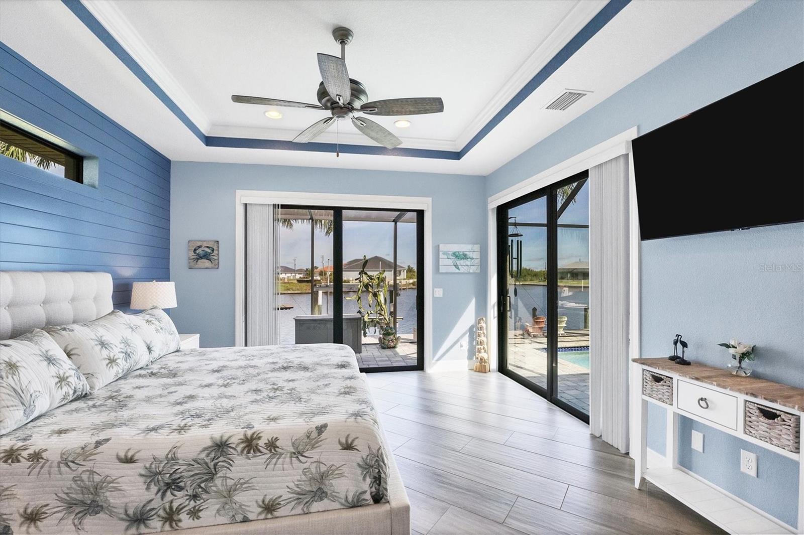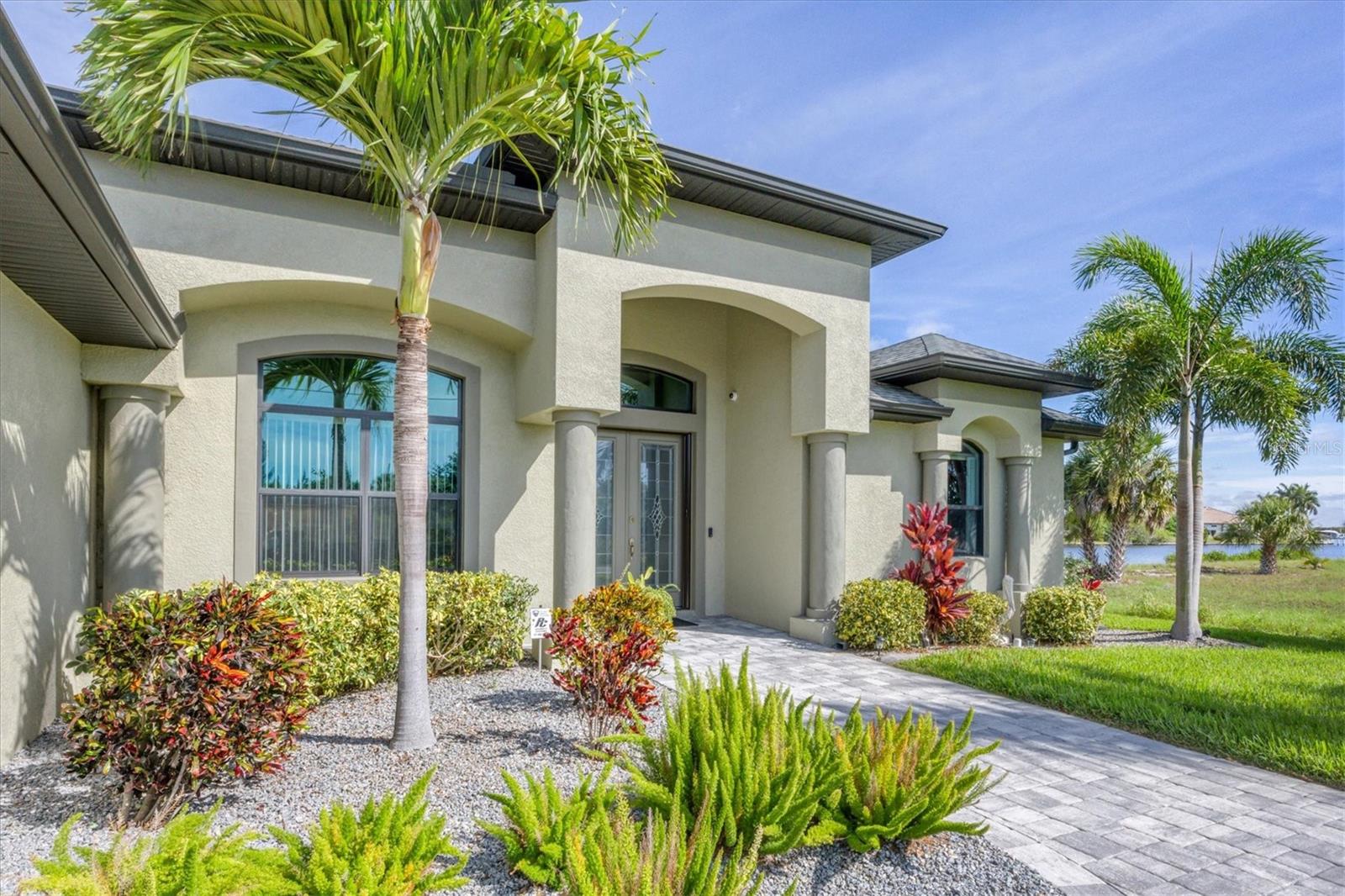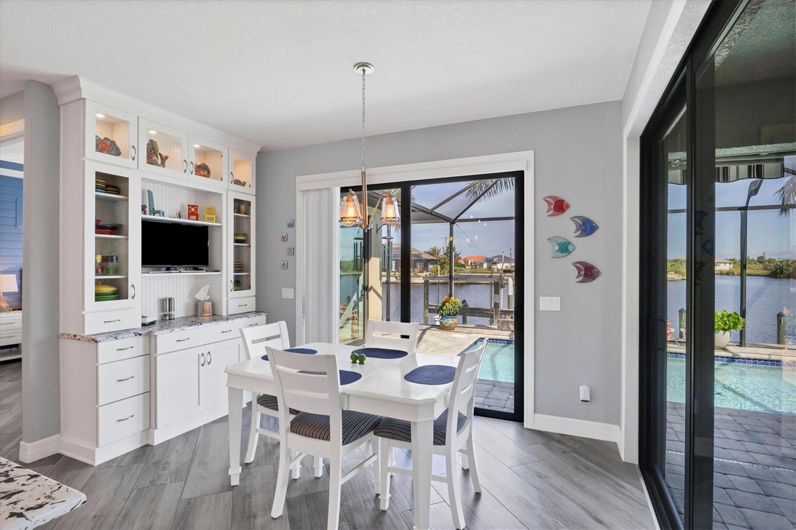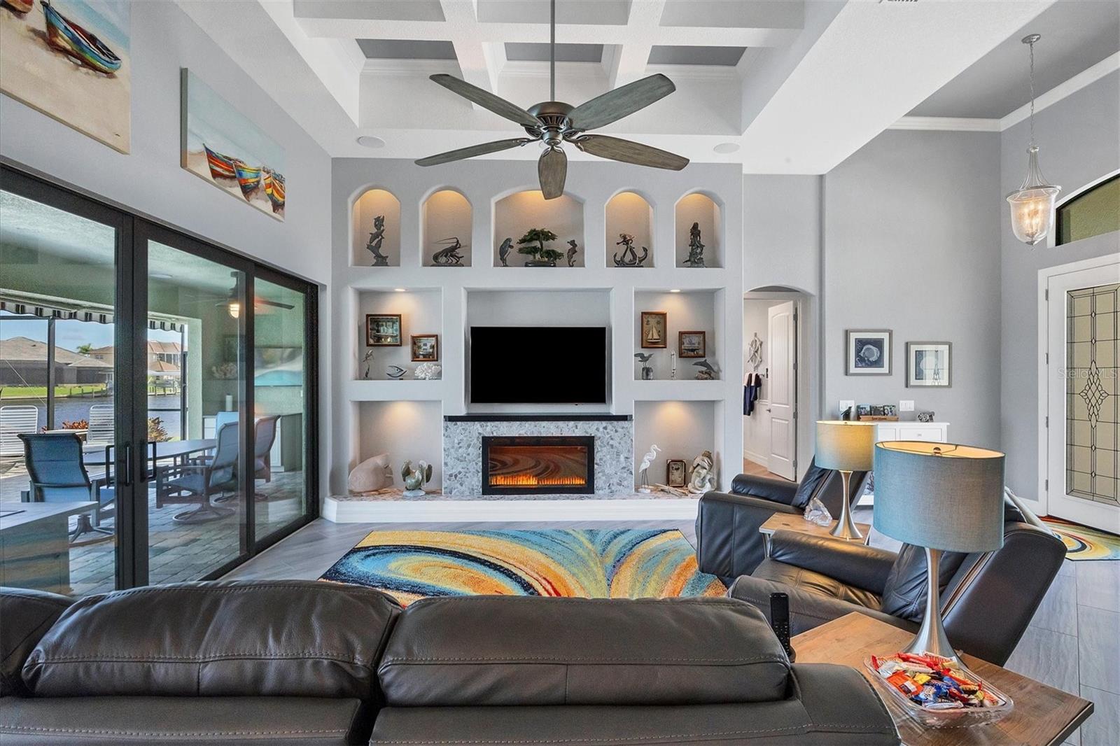 Welcome to paradise in this stunning executive home nestled in a prime Gulf access location with coveted western exposure and intersecting canal views! Sailboat water enthusiasts will delight in the 3-bedroom, 2.5-bath retreat featuring a luxurious pool and spa, complemented by plank tile floors throughout. Step inside to discover a family room adorned with a coffered ceiling, custom built-ins, and a cozy fireplace, all illuminated by an expansive 8-foot zero-degree slider. The gourmet kitchen boasts custom cabinetry, quartz counters and an island, a propane range, a walk-in pantry, and a stylish subway tile backsplash. The primary bedroom is a sanctuary with its tray ceiling, shiplap accent wall, and dual sets of sliding glass doors leading outdoors. The ensuite bath features quartz counters, a walk-in shower, a bidet, upgraded tiles, and a colossal (12x10) custom walk-in closet. Two sizable guest suites offer comfort and privacy, with the guest bathroom showcasing quartz counters. A private den is thoughtfully equipped with a 2-built-in desk and cabinets, perfect for remote work or study. Outside, the lanai beckons with its paver deck, heated pool, and spa. Remote Sunseeker awnings offer extra sun protection and a convenient pool bath for all guests. A 54-foot composite dock along the seawall includes water and electric service, complemented by a 16k boat lift. Additional features abound, including impact glass throughout, roof 2023, spray foam insulation over the house and garage for energy efficiency, surround sound, Ring doorbell and 6 cameras, central vacuum system, irrigation, a mini-split AC in the garage with an 18-foot-wide door for ample space, two outdoor storage sheds, and a generator hookup. This exceptional property blends luxury with functionality, offering the quintessential Florida lifestyle with every imaginable amenity for discerning homeowners. Discover waterfront living at its finest in this meticulously crafted residence. Schedule your private tour today and envision life in this coastal dream home.