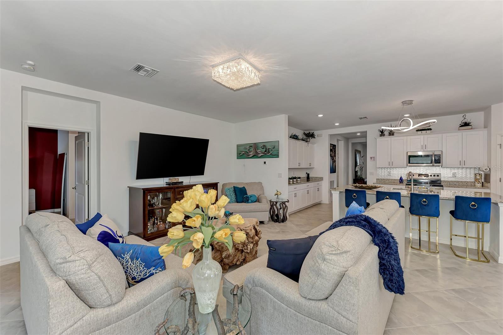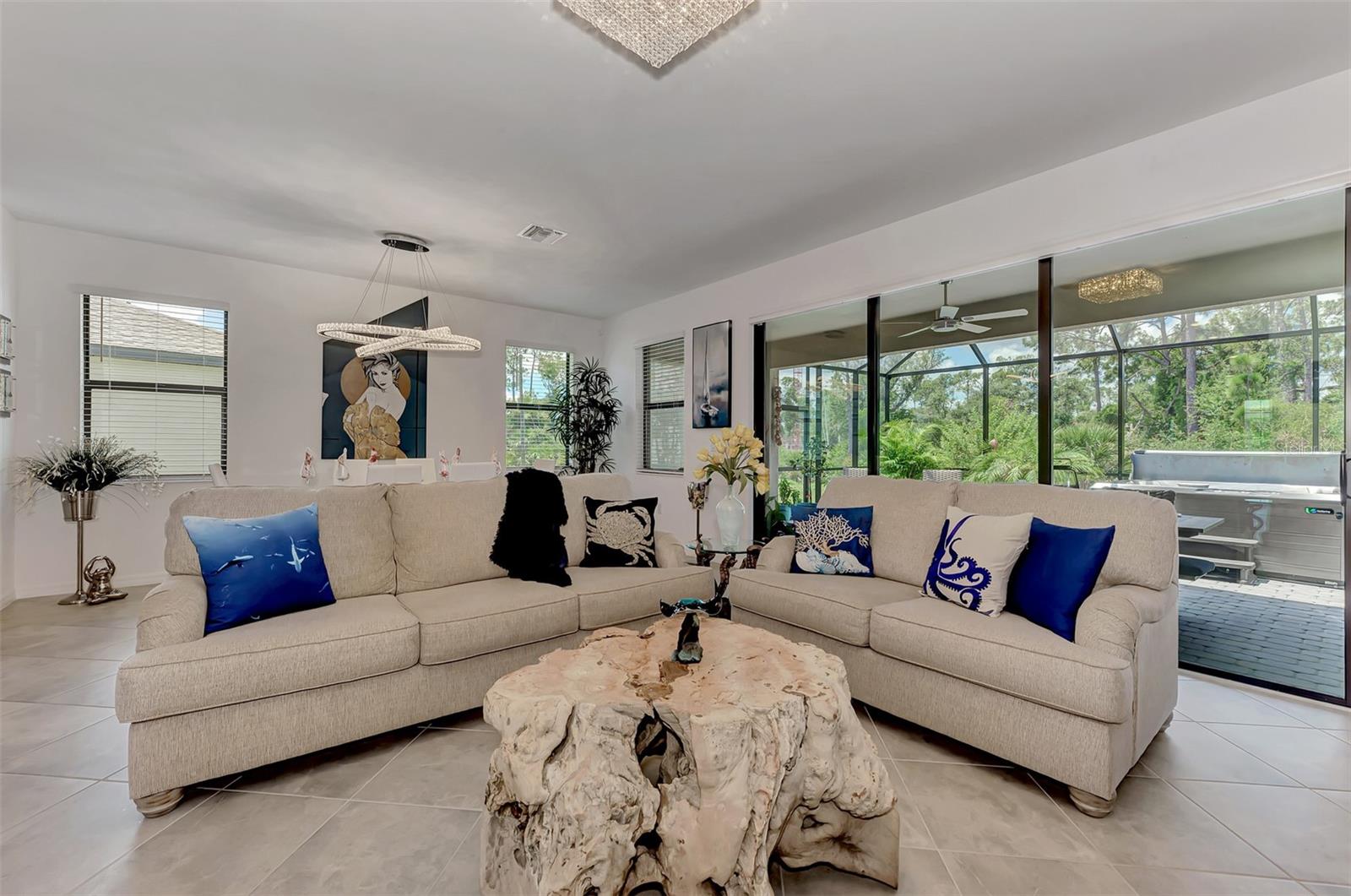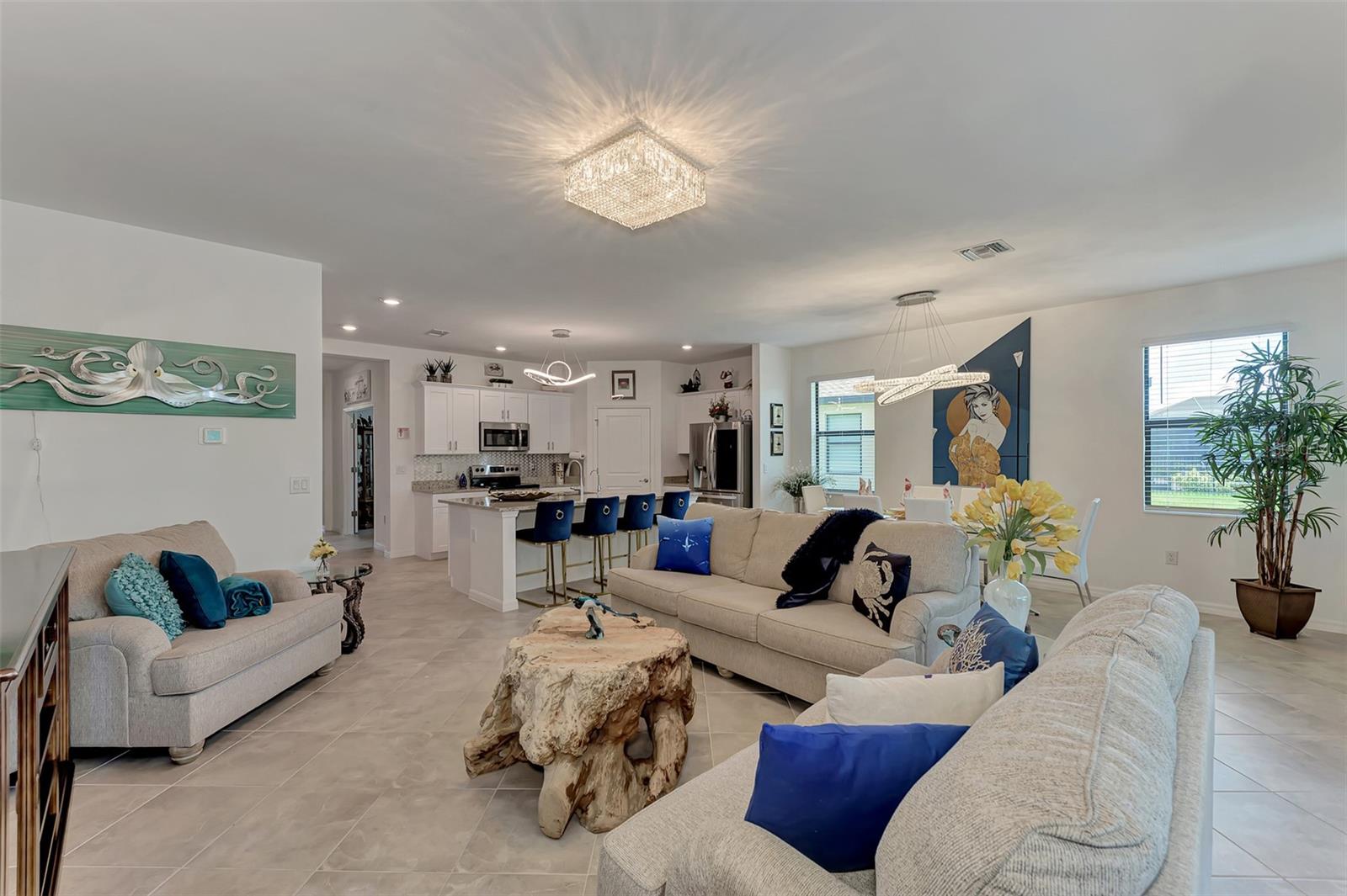 Welcome Home to your Executive Home in the Isles Neighborhood of West Port! This Marsala Floor Plan offers 3 Bedrooms, 3 Baths, plus a Den/Office that can serve as a 4th Bedroom. The owners spared no expense on upgrades in this home. The Outdoor Features a Large lanai with a 6-person spa, dog run, and large potted plants, giving this space an atmosphere of relaxation and privacy. The Interior Features an open floor plan, with large kitchen and upgraded refrigerator with an expansive island that accommodates extra seating. Exquisite, upgraded chandelier-style lights throughout. Custom electric curtains in the living room, master bedroom, and master bathroom. Washer and dryer included. There is an Express RO faucet in the kitchen for great-tasting water. This home offers an elegant and private environment, perfect for both relaxation and entertaining. NO FLOOD INSURANCE required. Within the Westport community, you’ll find a brand-new recreation center with a pool, playground, and multi-use ball fields for year-round outdoor enjoyment. Just outside the community, you’ll discover the new Sunseekers Resort, Rays spring training facility, the Atlanta Braves spring training facility, fishing, trails, kayaking, and canoeing. Some of Florida’s most beautiful beaches are less than 30 minutes away!