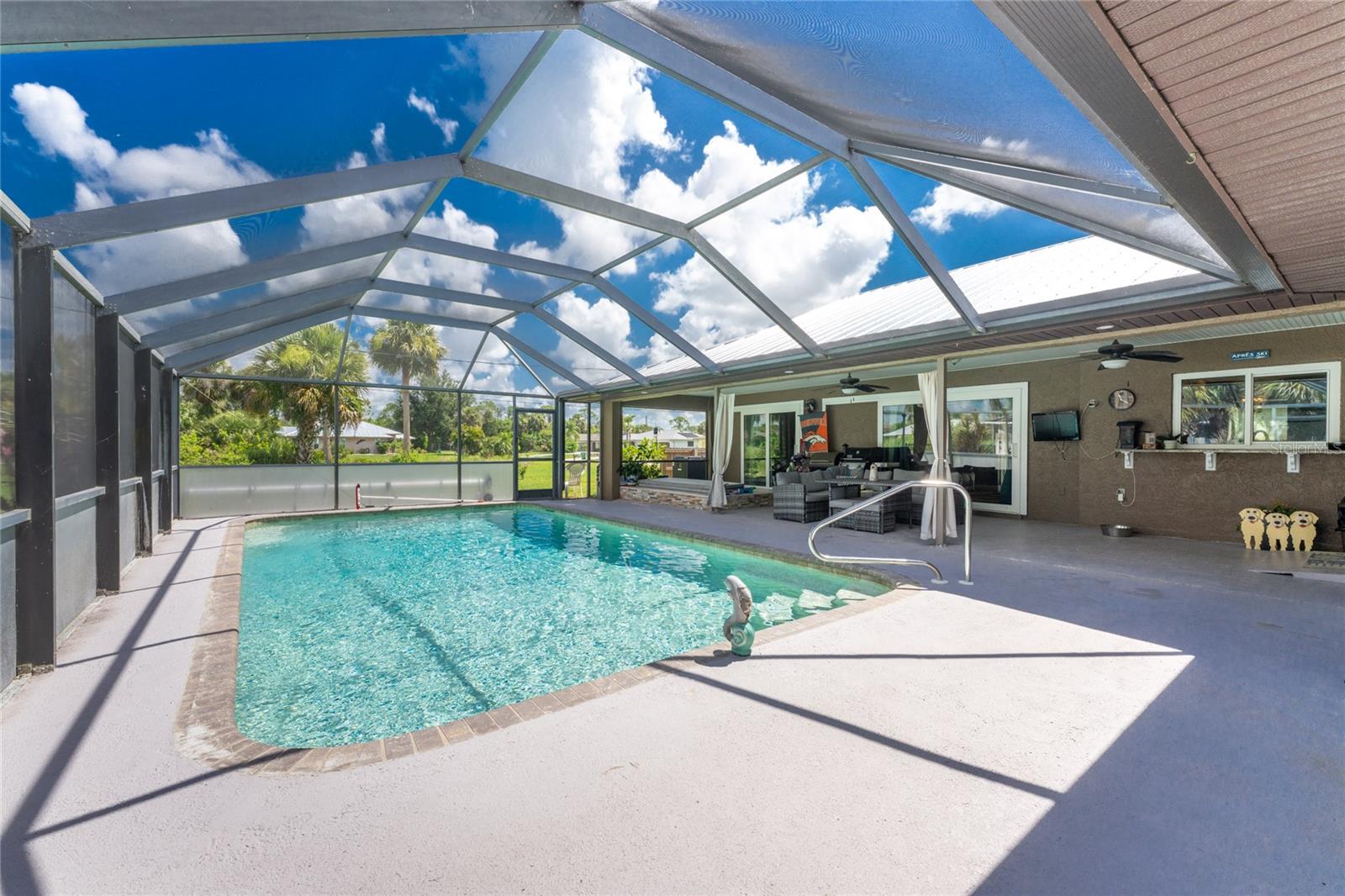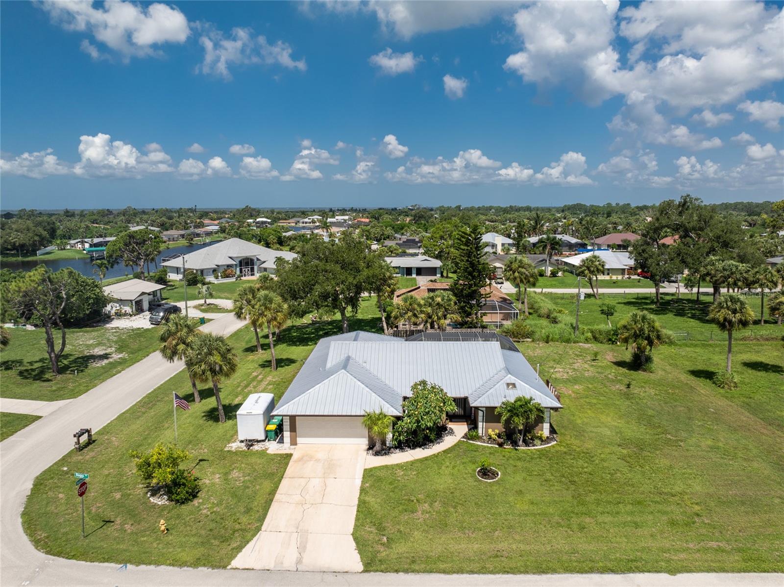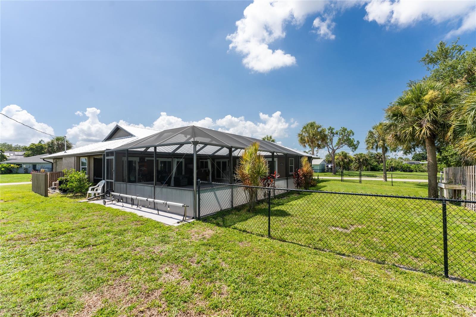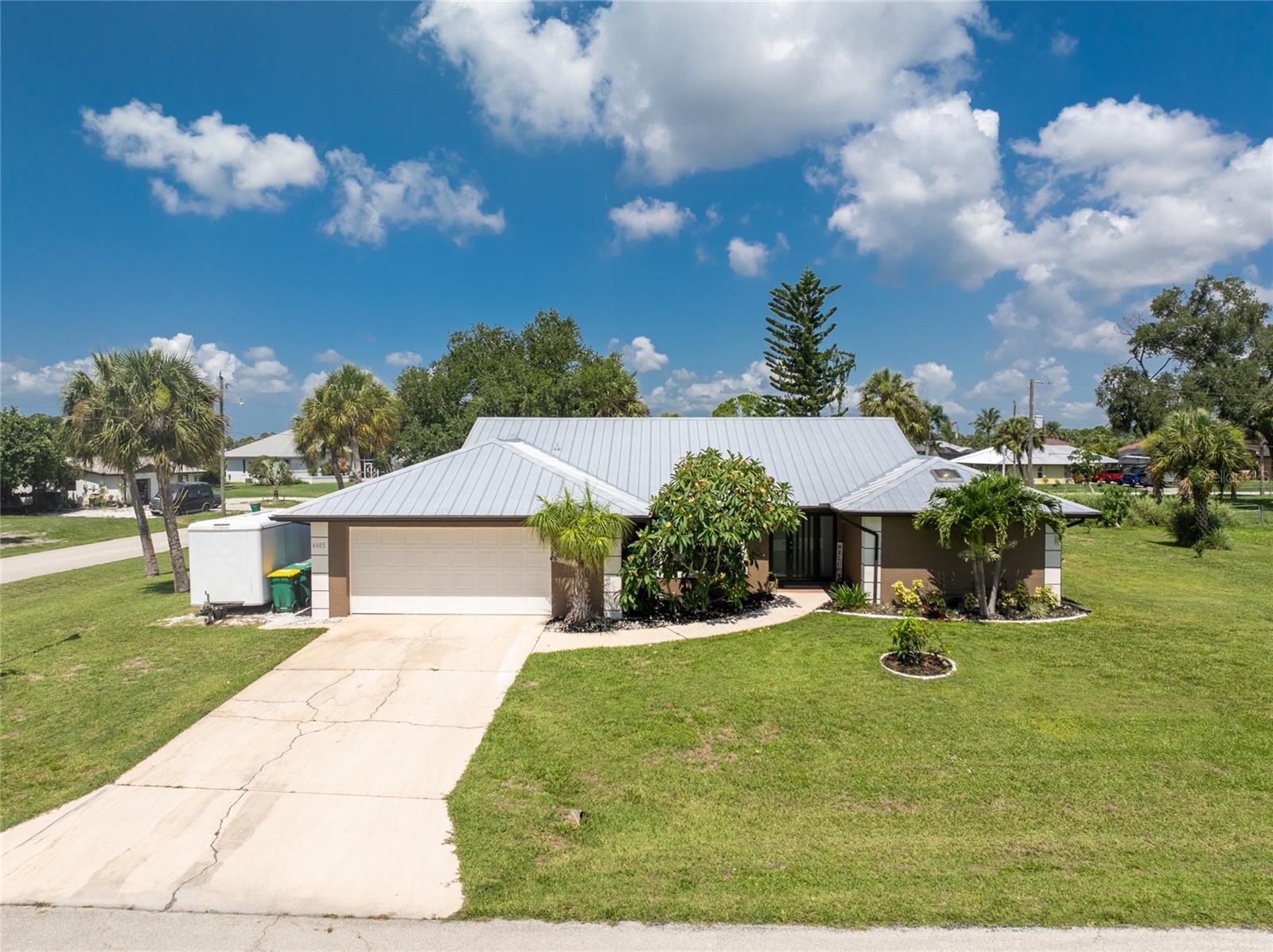 NO STORM DAMAGE WHATSOEVER! Discover the epitome of Florida living in this captivating 3-bedroom, 2-bathroom home complete with a refreshing pool and in-ground hot tub/spa. Sitting on a generously oversized corner lot, this property combines a fantastic location with ample space for all your recreational gear. Upon arrival, you're greeted by lush, mature landscaping and a recently upgraded kitchen that sets the tone for modern elegance throughout. The primary bedroom and bathroom feature stylish updates with contemporary fixtures, offering a serene retreat. For those who love to entertain, the home's layout is ideal. A spacious living room flows seamlessly into a combined kitchen and family room, complete with a built-in bar and wine fridge—a perfect setup for hosting gatherings. The kitchen dazzles with real travertine floors, granite countertops, and high-end appliances, including a double oven and convection microwave. Vaulted ceilings and sliders leading to the lanai enhance the living room's spacious feel, while the second and third bedrooms, both with walk-in closets, provide comfort and privacy. The second bathroom conveniently opens to the pool deck, making it ideal for outdoor entertaining. The primary bedroom is a sanctuary unto itself, boasting views of the hot tub on the lanai, dual walk-in closets, and a beautifully updated en-suite bathroom with granite countertops and a luxurious tiled walk-in shower. Additional highlights include impact glass windows throughout (2021), a metal roof (2021), plumbing repipe (2015), HVAC (2017), and the imminent availability of fiber optic cable for enhanced connectivity. The laundry room, complete with a washer/dryer and utility sink, offers practical convenience. Outside, the oversized pool and built-in hot tub on the expansive lanai beckon for relaxation and social gatherings. A fenced backyard and privacy wall ensure privacy, while the generous 130' x 125' corner lot provides ample space for outdoor activities and storage of recreational vehicles. Conveniently located minutes from dining, shopping, golfing, and a public boat ramp, this home offers easy access to everything Southwest Florida has to offer. With the region's stunning beaches just a short drive away, this property is perfectly positioned for year-round enjoyment or as a vacation retreat. Don't miss out on this rare opportunity to own a meticulously maintained, well-priced pool home in a desirable location. Schedule your showing today and envision yourself living the Florida lifestyle to the fullest!