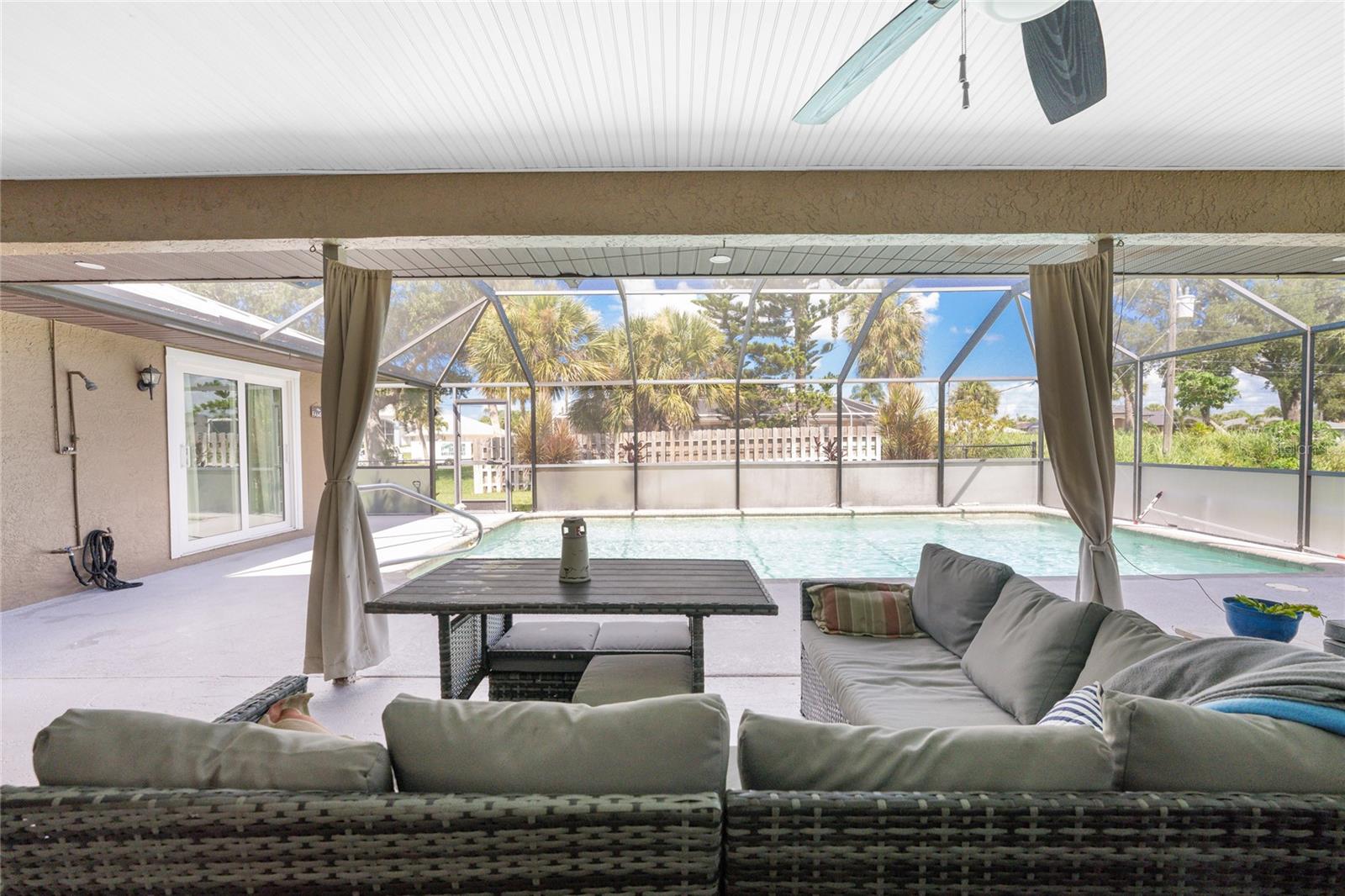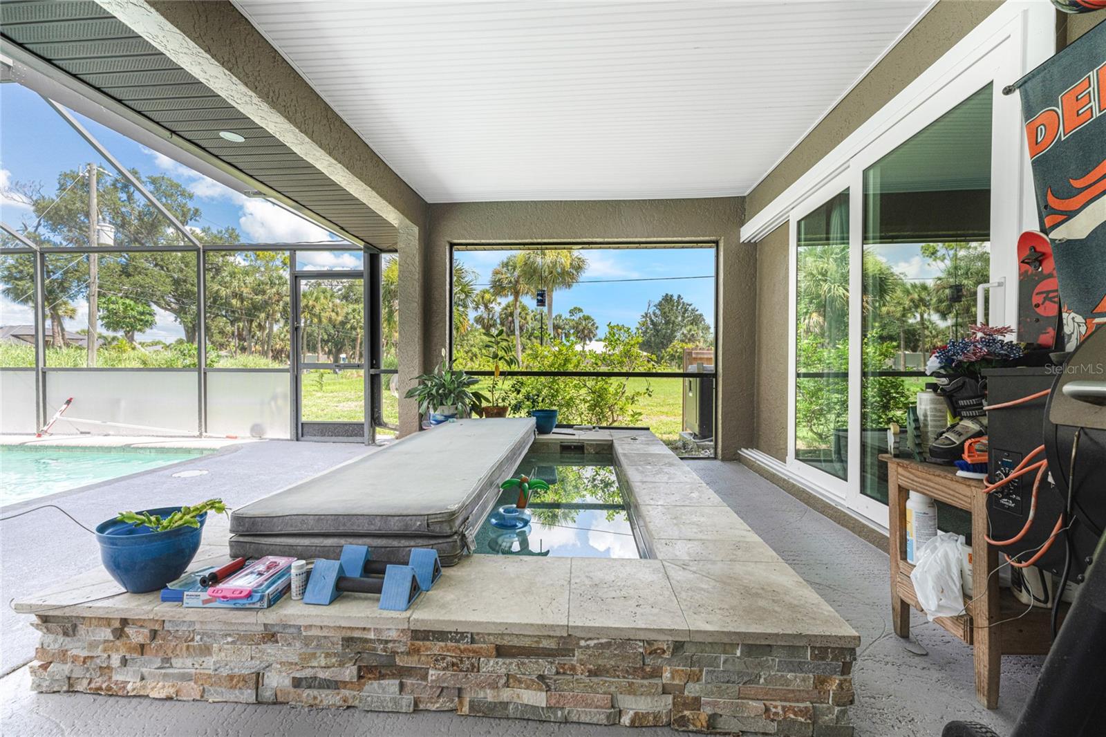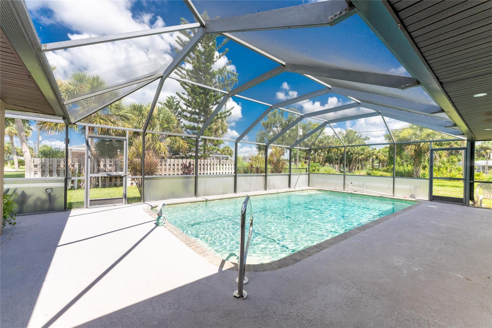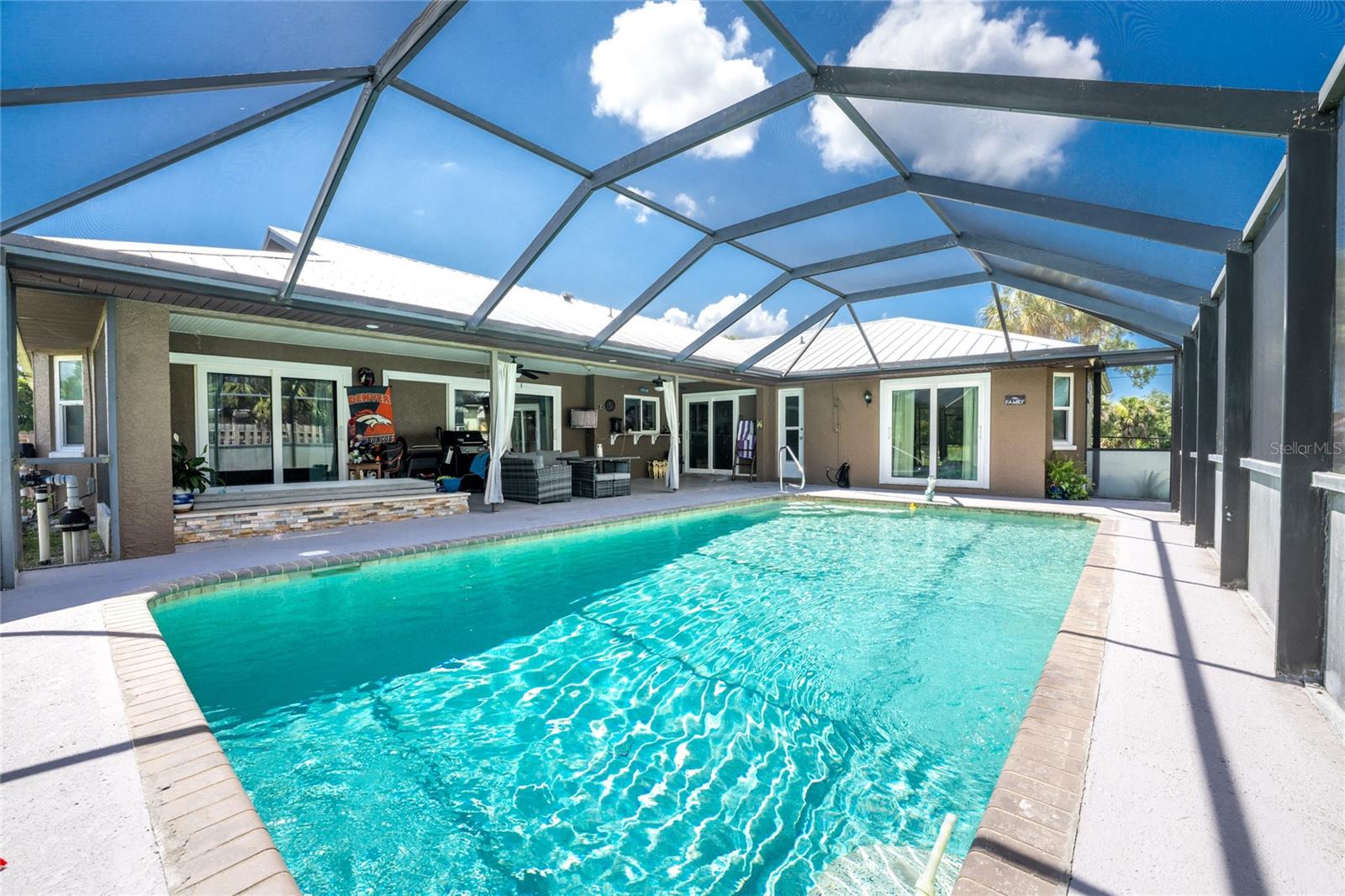 NO STORM DAMAGE WHATSOEVER! Discover the epitome of Florida living in this captivating 3-bedroom, 2-bathroom home complete with a refreshing pool and in-ground hot tub/spa. Sitting on a generously oversized corner lot, this property combines a fantastic location with ample space for all your recreational gear. Upon arrival, you're greeted by lush, mature landscaping and a recently upgraded kitchen that sets the tone for modern elegance throughout. The primary bedroom and bathroom feature stylish updates with contemporary fixtures, offering a serene retreat. For those who love to entertain, the home's layout is ideal. A spacious living room flows seamlessly into a combined kitchen and family room, complete with a built-in bar and wine fridge—a perfect setup for hosting gatherings. The kitchen dazzles with real travertine floors, granite countertops, and high-end appliances, including a double oven and convection microwave. Vaulted ceilings and sliders leading to the lanai enhance the living room's spacious feel, while the second and third bedrooms, both with walk-in closets, provide comfort and privacy. The second bathroom conveniently opens to the pool deck, making it ideal for outdoor entertaining. The primary bedroom is a sanctuary unto itself, boasting views of the hot tub on the lanai, dual walk-in closets, and a beautifully updated en-suite bathroom with granite countertops and a luxurious tiled walk-in shower. Additional highlights include impact glass windows throughout (2021), a metal roof (2021), plumbing repipe (2015), HVAC (2017), and the imminent availability of fiber optic cable for enhanced connectivity. The laundry room, complete with a washer/dryer and utility sink, offers practical convenience. Outside, the oversized pool and built-in hot tub on the expansive lanai beckon for relaxation and social gatherings. A fenced backyard and privacy wall ensure privacy, while the generous 130' x 125' corner lot provides ample space for outdoor activities and storage of recreational vehicles. Conveniently located minutes from dining, shopping, golfing, and a public boat ramp, this home offers easy access to everything Southwest Florida has to offer. With the region's stunning beaches just a short drive away, this property is perfectly positioned for year-round enjoyment or as a vacation retreat. Don't miss out on this rare opportunity to own a meticulously maintained, well-priced pool home in a desirable location. Schedule your showing today and envision yourself living the Florida lifestyle to the fullest!