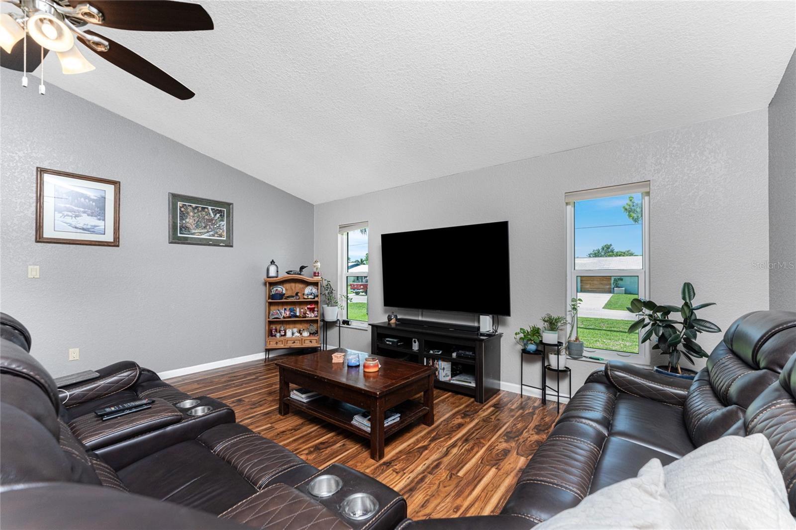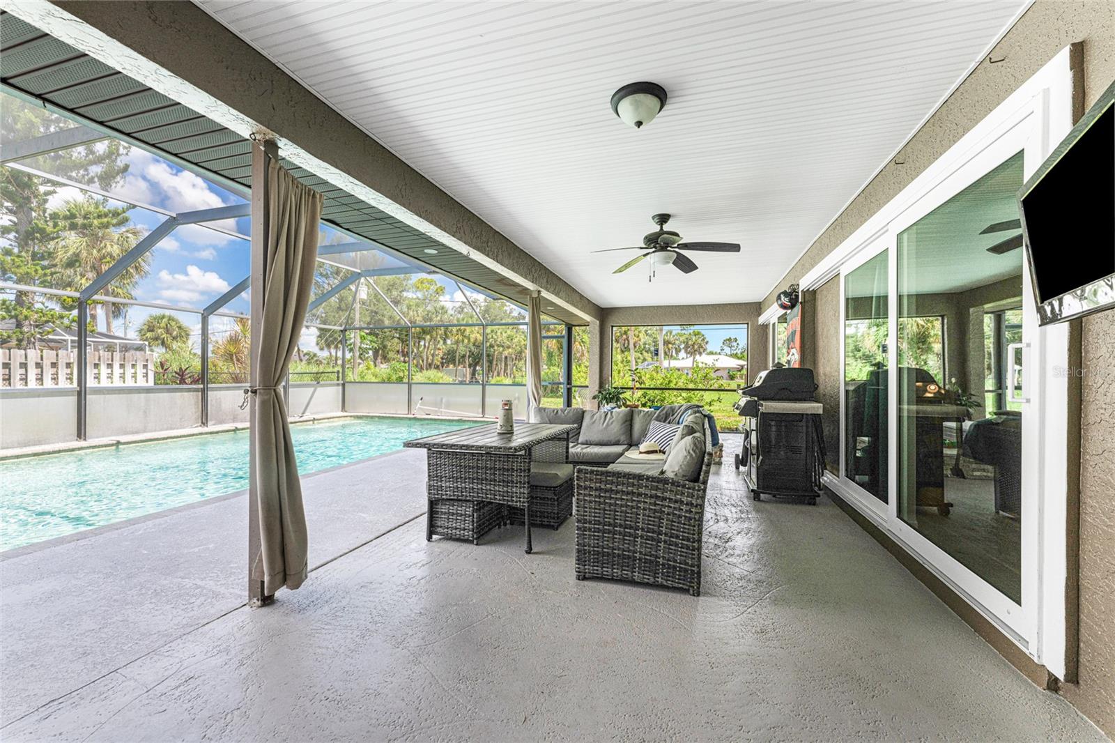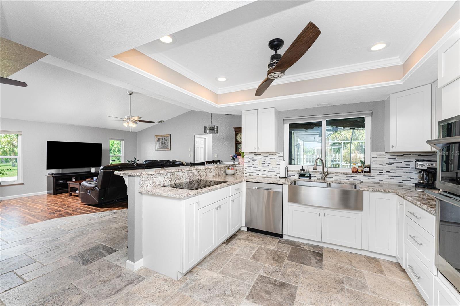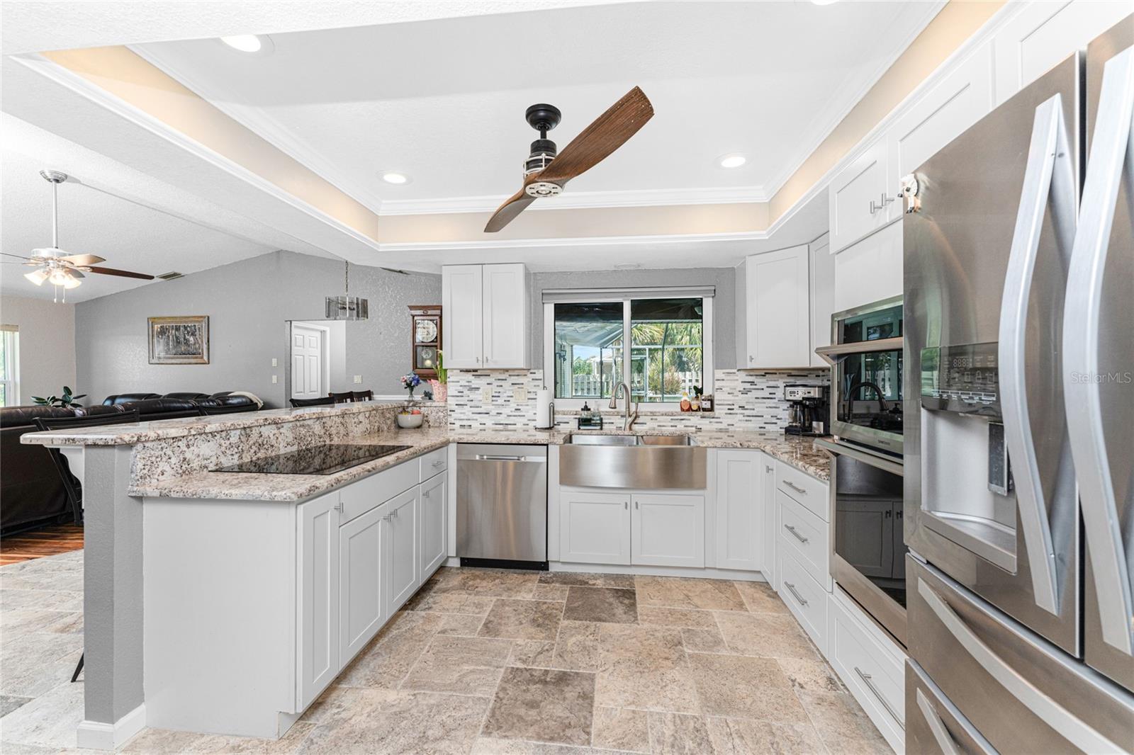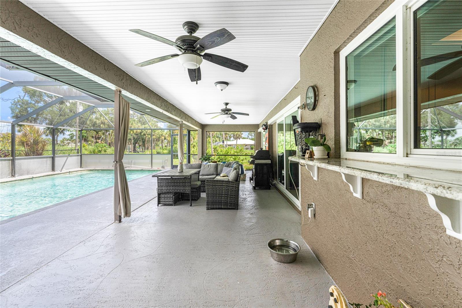 NO STORM DAMAGE WHATSOEVER! Discover the epitome of Florida living in this captivating 3-bedroom, 2-bathroom home complete with a refreshing pool and in-ground hot tub/spa. Sitting on a generously oversized corner lot, this property combines a fantastic location with ample space for all your recreational gear. Upon arrival, you're greeted by lush, mature landscaping and a recently upgraded kitchen that sets the tone for modern elegance throughout. The primary bedroom and bathroom feature stylish updates with contemporary fixtures, offering a serene retreat. For those who love to entertain, the home's layout is ideal. A spacious living room flows seamlessly into a combined kitchen and family room, complete with a built-in bar and wine fridge—a perfect setup for hosting gatherings. The kitchen dazzles with real travertine floors, granite countertops, and high-end appliances, including a double oven and convection microwave. Vaulted ceilings and sliders leading to the lanai enhance the living room's spacious feel, while the second and third bedrooms, both with walk-in closets, provide comfort and privacy. The second bathroom conveniently opens to the pool deck, making it ideal for outdoor entertaining. The primary bedroom is a sanctuary unto itself, boasting views of the hot tub on the lanai, dual walk-in closets, and a beautifully updated en-suite bathroom with granite countertops and a luxurious tiled walk-in shower. Additional highlights include impact glass windows throughout (2021), a metal roof (2021), plumbing repipe (2015), HVAC (2017), and the imminent availability of fiber optic cable for enhanced connectivity. The laundry room, complete with a washer/dryer and utility sink, offers practical convenience. Outside, the oversized pool and built-in hot tub on the expansive lanai beckon for relaxation and social gatherings. A fenced backyard and privacy wall ensure privacy, while the generous 130' x 125' corner lot provides ample space for outdoor activities and storage of recreational vehicles. Conveniently located minutes from dining, shopping, golfing, and a public boat ramp, this home offers easy access to everything Southwest Florida has to offer. With the region's stunning beaches just a short drive away, this property is perfectly positioned for year-round enjoyment or as a vacation retreat. Don't miss out on this rare opportunity to own a meticulously maintained, well-priced pool home in a desirable location. Schedule your showing today and envision yourself living the Florida lifestyle to the fullest!
